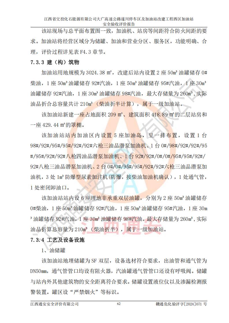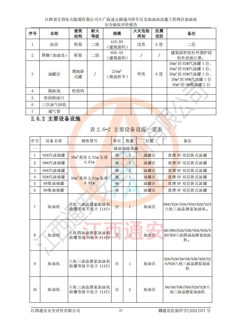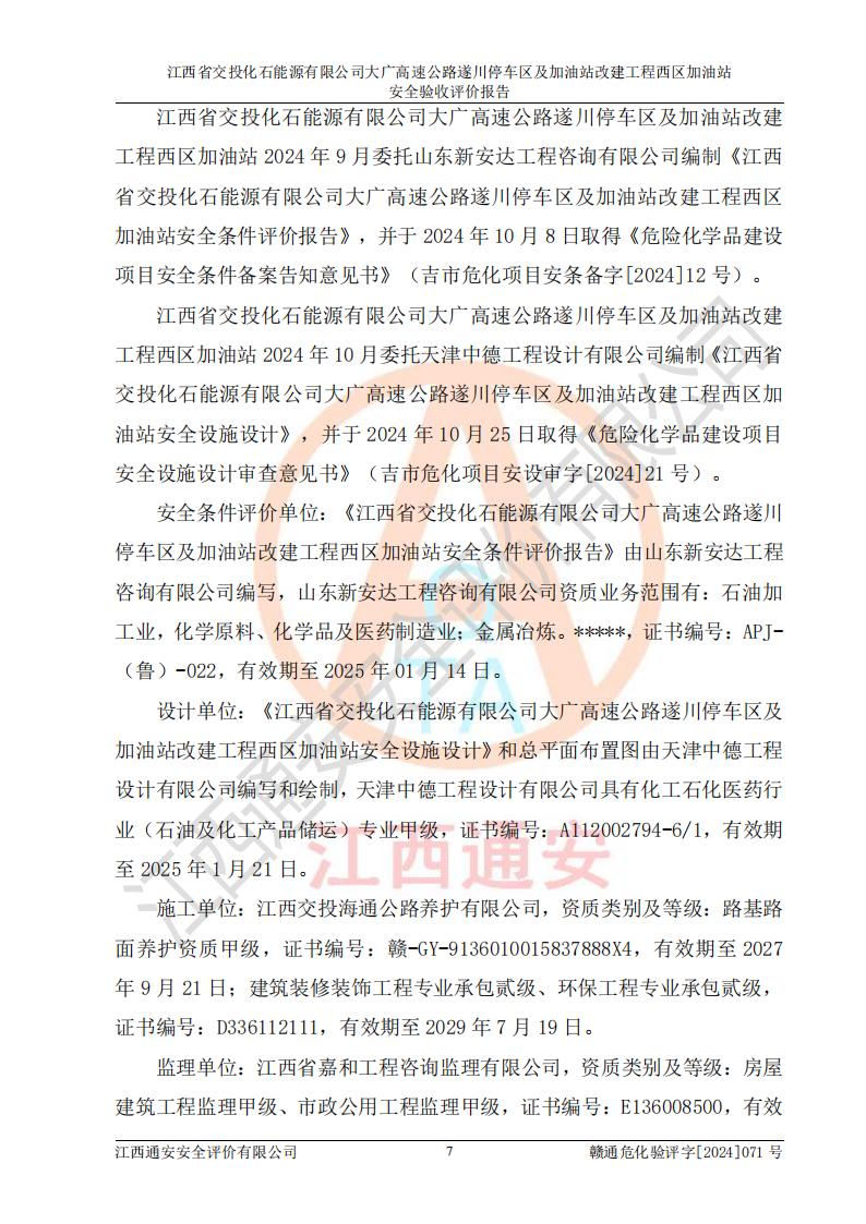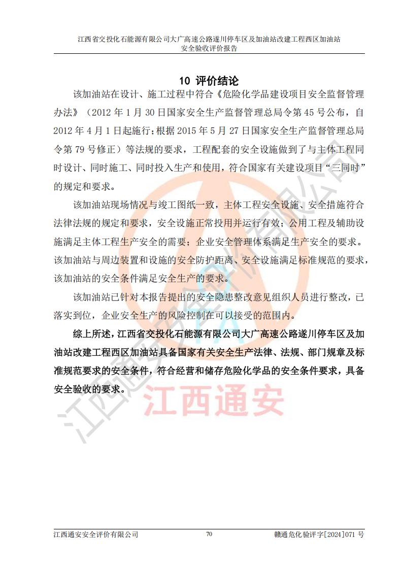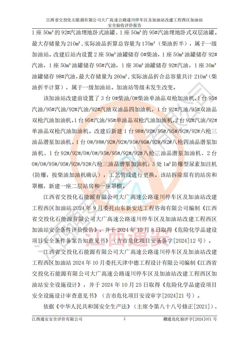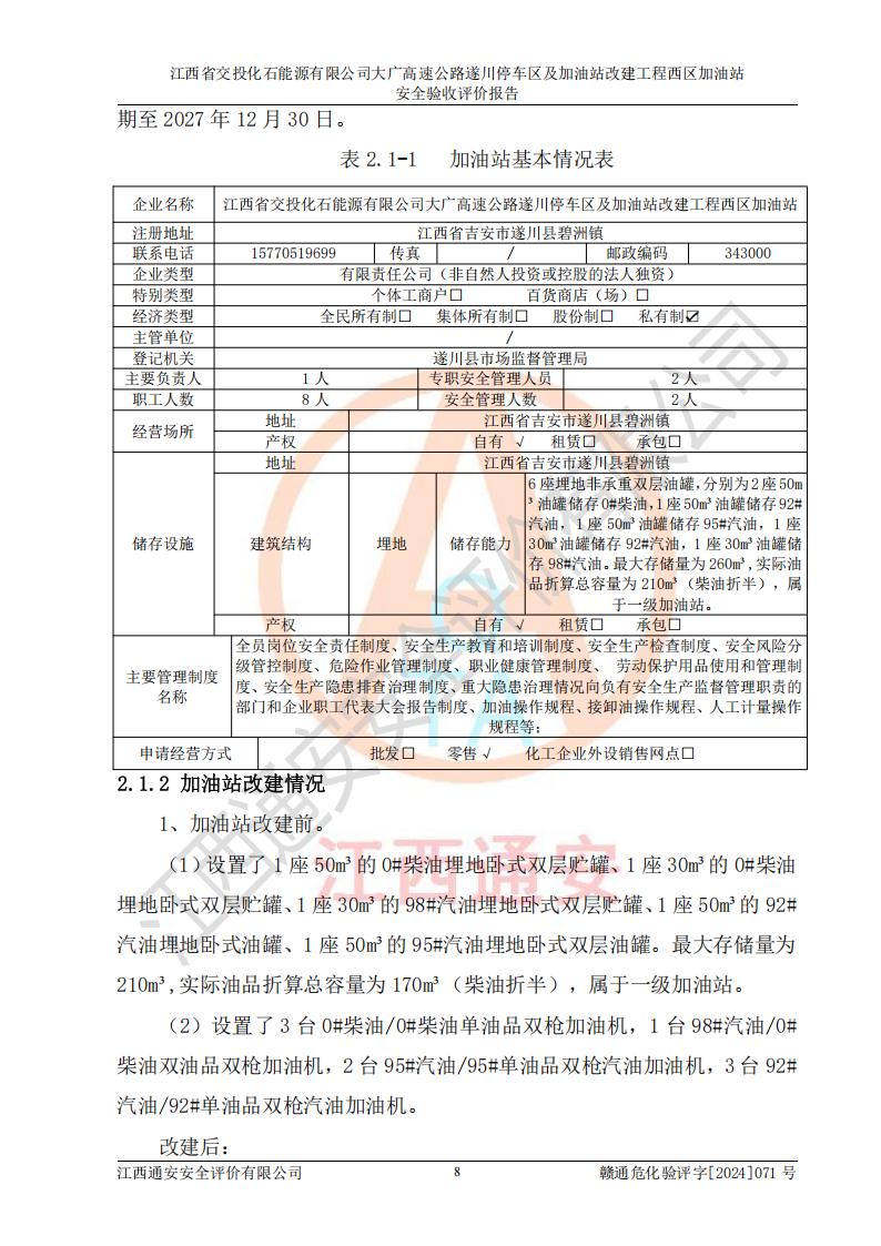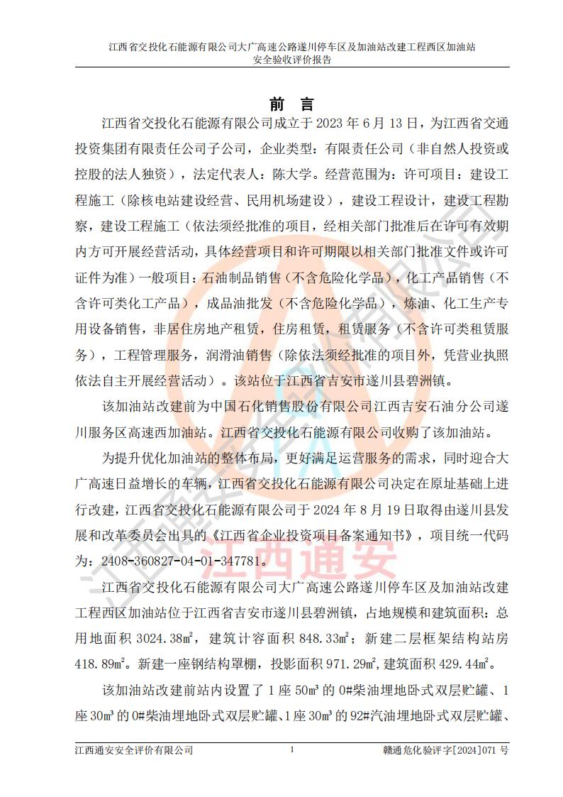 評(píng)價(jià)報(bào)告名稱 | 江西省交投化石能源有限公司大廣高速公路遂川停車區(qū)及加油站改建工程西區(qū)加油站安全驗(yàn)收評(píng)價(jià)報(bào)告 | |||
