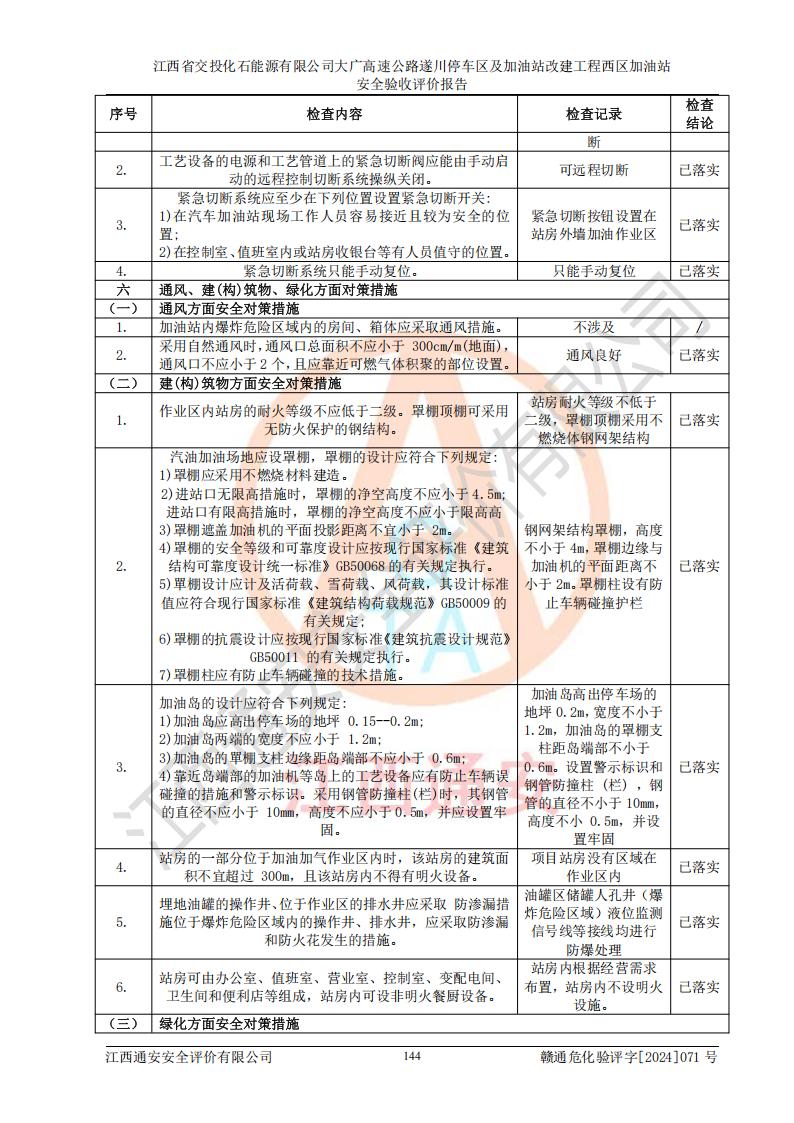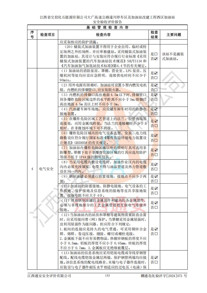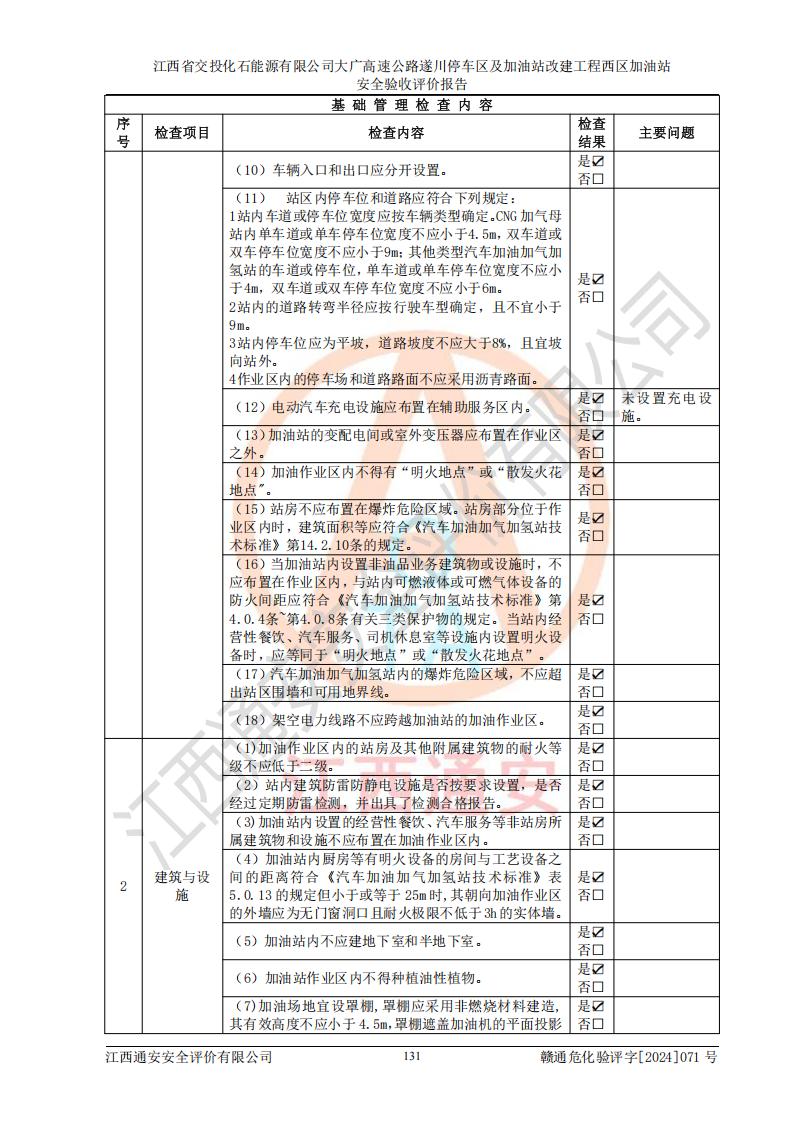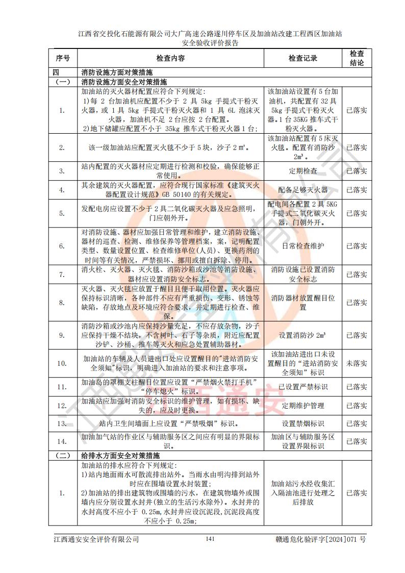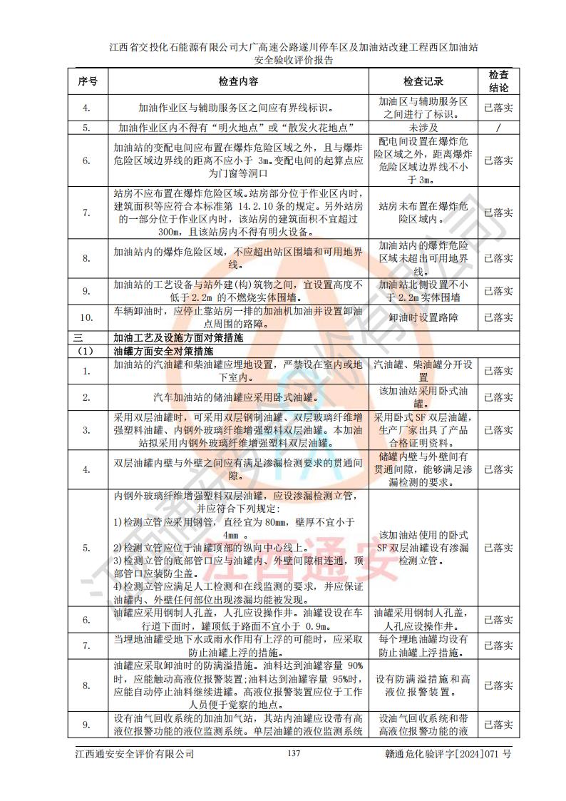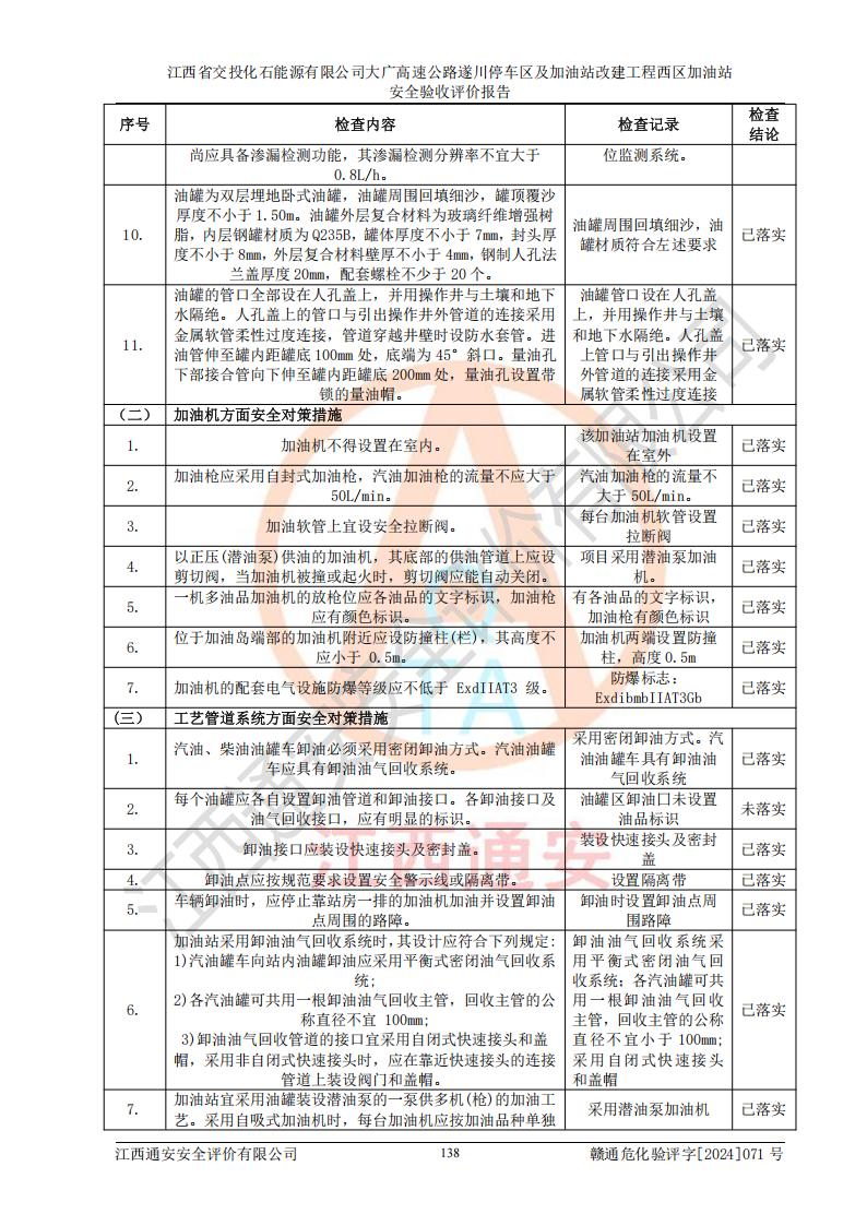 評(píng)價(jià)結(jié)論 | 該加油站在設(shè)計(jì)、施工過程中符合《危險(xiǎn)化學(xué)品建設(shè)項(xiàng)目安全監(jiān)督管理辦法》(2012年1月30日**安全生產(chǎn)監(jiān)督管理總局令第45號(hào)公布,自2012年4月1日起施行;根據(jù)2015年5月27日**安全生產(chǎn)監(jiān)督管理總局令第79號(hào)修正)等法規(guī)的要求,工程配套的安全設(shè)施做到了與主體工程同時(shí)設(shè)計(jì)、同時(shí)施工、同時(shí)投入生產(chǎn)和使用,符合**有關(guān)建設(shè)項(xiàng)目“三同時(shí)”的規(guī)定和要求。 該加油站現(xiàn)場情況與竣工圖紙一致,主體工程安全設(shè)施、安全措施符合法律法規(guī)的規(guī)定和要求,安全設(shè)施正常投用并運(yùn)行**;公用工程及輔助設(shè)施滿足主體工程生產(chǎn)安全的需要;企業(yè)安全管理體系滿足生產(chǎn)安全的要求。該加油站與周邊裝置和設(shè)施的安全防護(hù)距離、安全設(shè)施滿足標(biāo)準(zhǔn)規(guī)范的要求,該加油站的安全條件滿足安全生產(chǎn)的要求。 該加油站已針對本報(bào)告提出的安全隱患整改意見組織人員進(jìn)行整改,已落實(shí)到位,企業(yè)安全生產(chǎn)的風(fēng)險(xiǎn)控制在可以接受的范圍內(nèi)。 綜上所述,江西省交投化石能源有限公司大廣高速公路遂川停車區(qū)及加油站改建工程西區(qū)加油站具備**有關(guān)安全生產(chǎn)法律、法規(guī)、部門規(guī)章及標(biāo)準(zhǔn)規(guī)范要求的安全條件,符合經(jīng)營和儲(chǔ)存危險(xiǎn)化學(xué)品的安全條件要求,具備安全驗(yàn)收的要求。 | |||