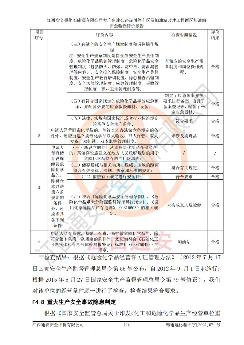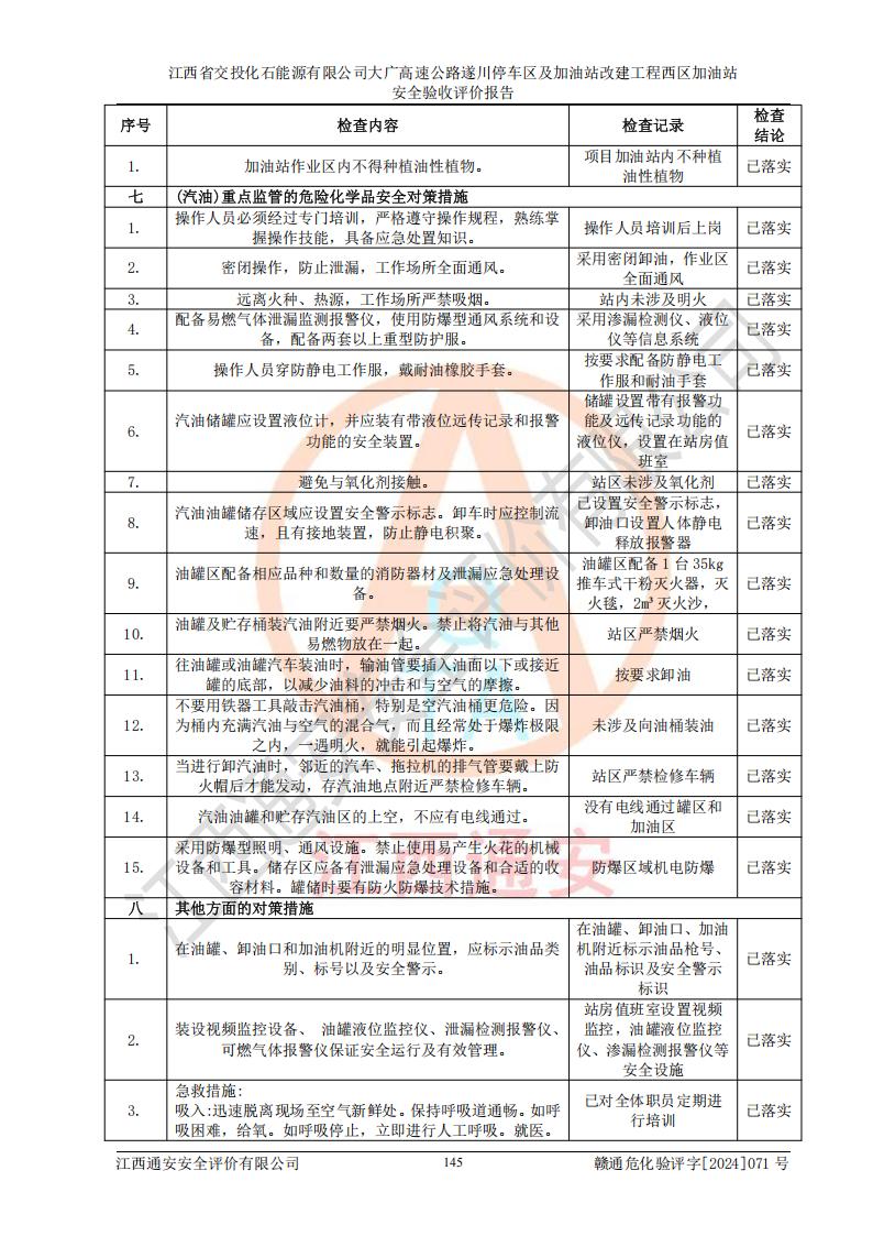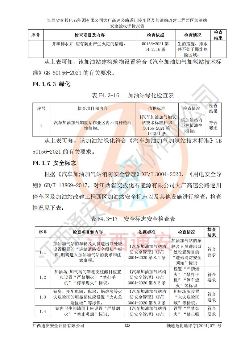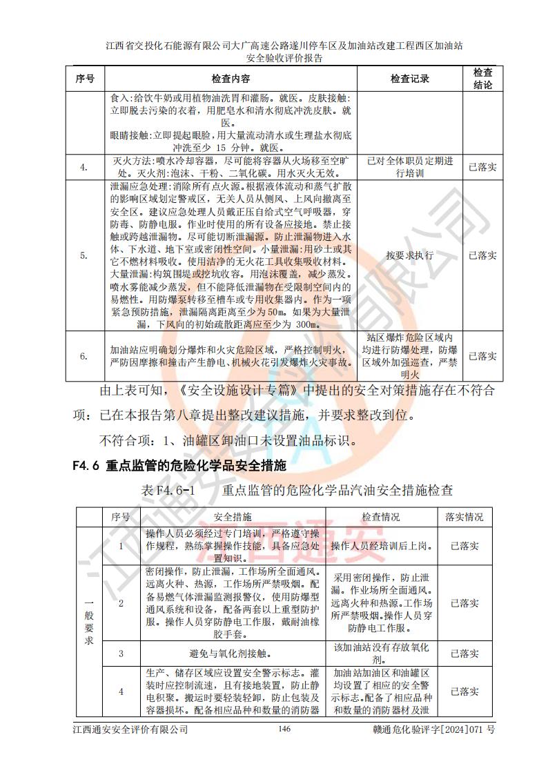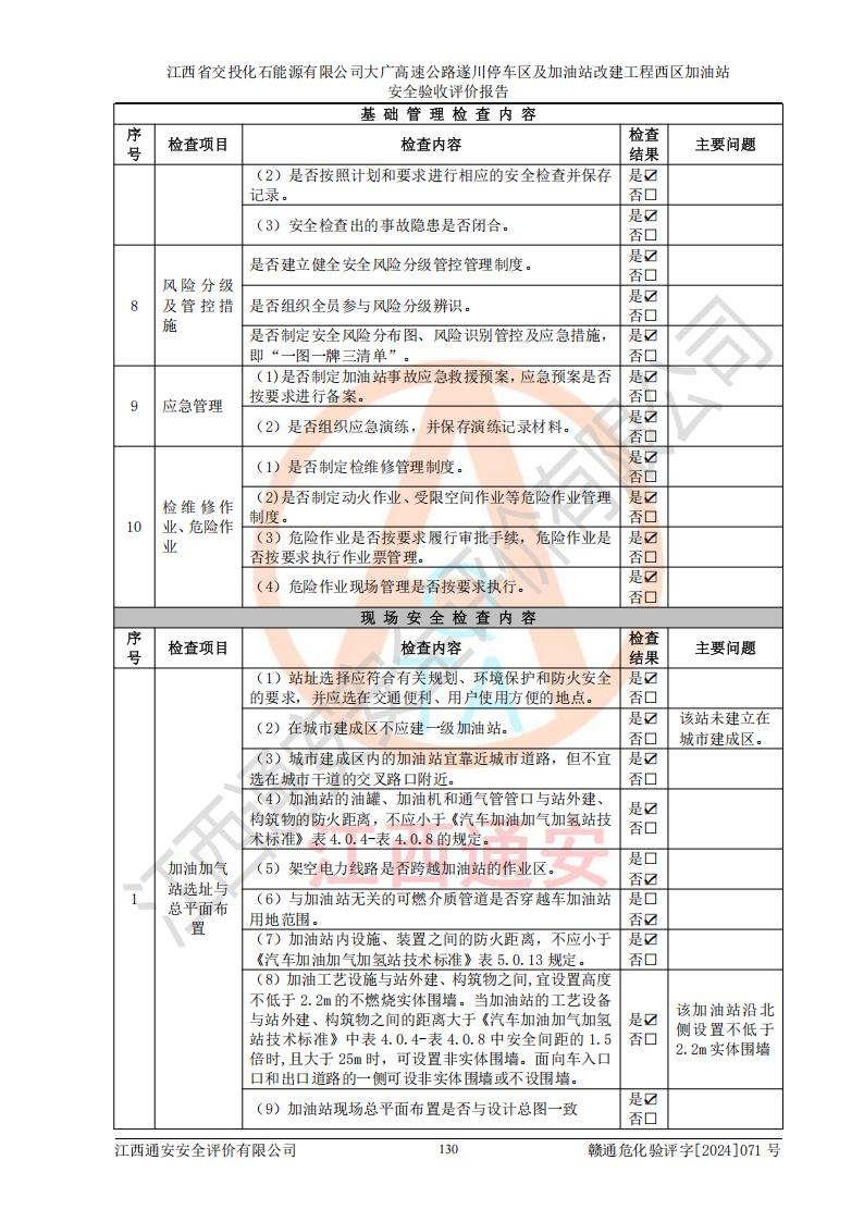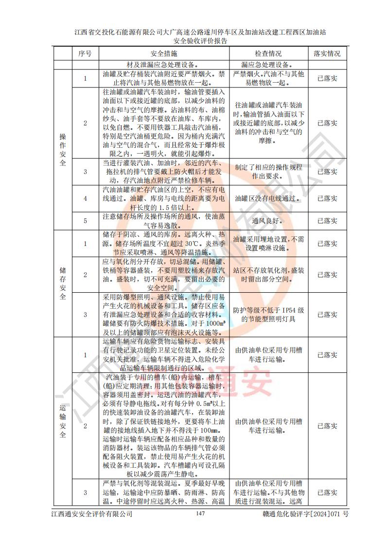 評(píng)價(jià)結(jié)論 | 該加油站在設(shè)計(jì)、施工過程中符合《危險(xiǎn)化學(xué)品建設(shè)項(xiàng)目安全監(jiān)督管理辦法》(2012年1月30日**安全生產(chǎn)監(jiān)督管理總局令第45號(hào)公布,自2012年4月1日起施行;根據(jù)2015年5月27日**安全生產(chǎn)監(jiān)督管理總局令第79號(hào)修正)等法規(guī)的要求,工程配套的安全設(shè)施做到了與主體工程同時(shí)設(shè)計(jì)、同時(shí)施工、同時(shí)投入生產(chǎn)和使用,符合**有關(guān)建設(shè)項(xiàng)目“三同時(shí)”的規(guī)定和要求。 該加油站現(xiàn)場情況與竣工圖紙一致,主體工程安全設(shè)施、安全措施符合法律法規(guī)的規(guī)定和要求,安全設(shè)施正常投用并運(yùn)行**;公用工程及輔助設(shè)施滿足主體工程生產(chǎn)安全的需要;企業(yè)安全管理體系滿足生產(chǎn)安全的要求。該加油站與周邊裝置和設(shè)施的安全防護(hù)距離、安全設(shè)施滿足標(biāo)準(zhǔn)規(guī)范的要求,該加油站的安全條件滿足安全生產(chǎn)的要求。 該加油站已針對本報(bào)告提出的安全隱患整改意見組織人員進(jìn)行整改,已落實(shí)到位,企業(yè)安全生產(chǎn)的風(fēng)險(xiǎn)控制在可以接受的范圍內(nèi)。 綜上所述,江西省交投化石能源有限公司大廣高速公路遂川停車區(qū)及加油站改建工程西區(qū)加油站具備**有關(guān)安全生產(chǎn)法律、法規(guī)、部門規(guī)章及標(biāo)準(zhǔn)規(guī)范要求的安全條件,符合經(jīng)營和儲(chǔ)存危險(xiǎn)化學(xué)品的安全條件要求,具備安全驗(yàn)收的要求。 | |||
