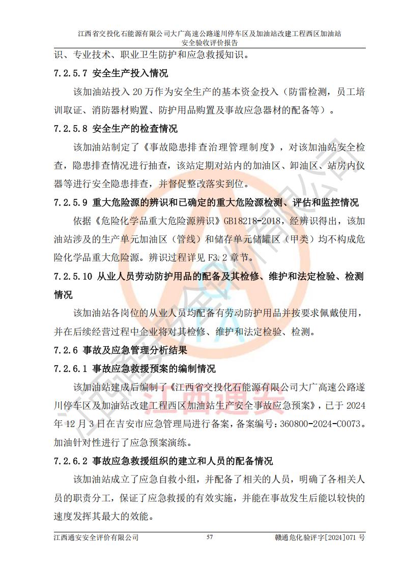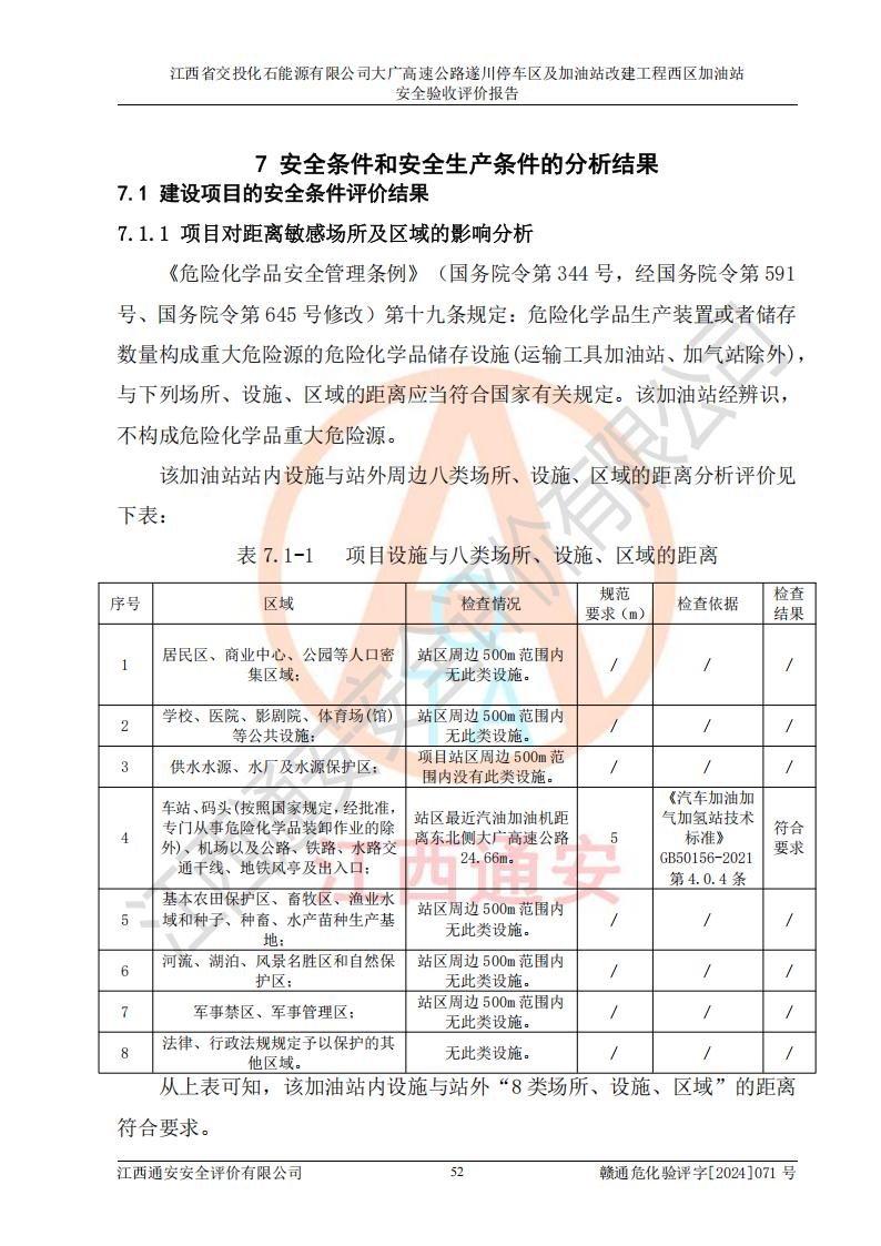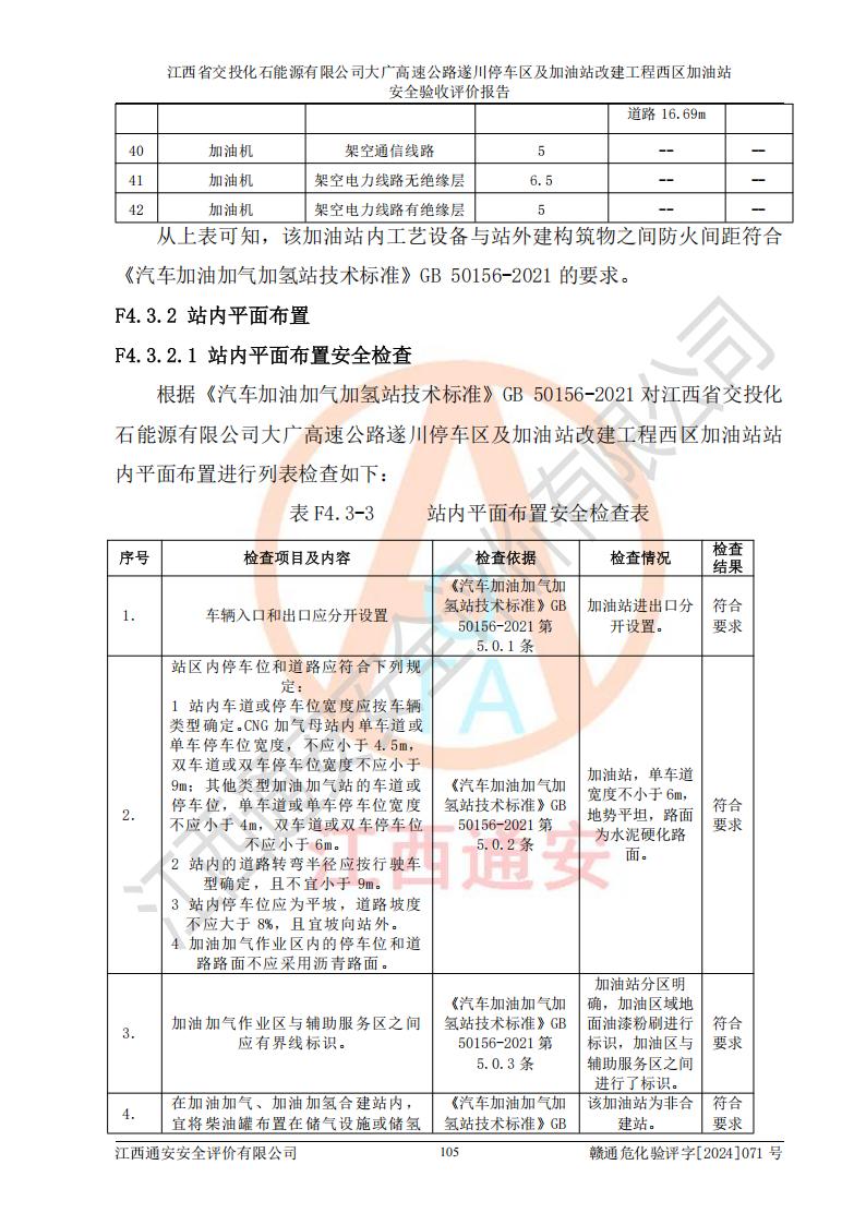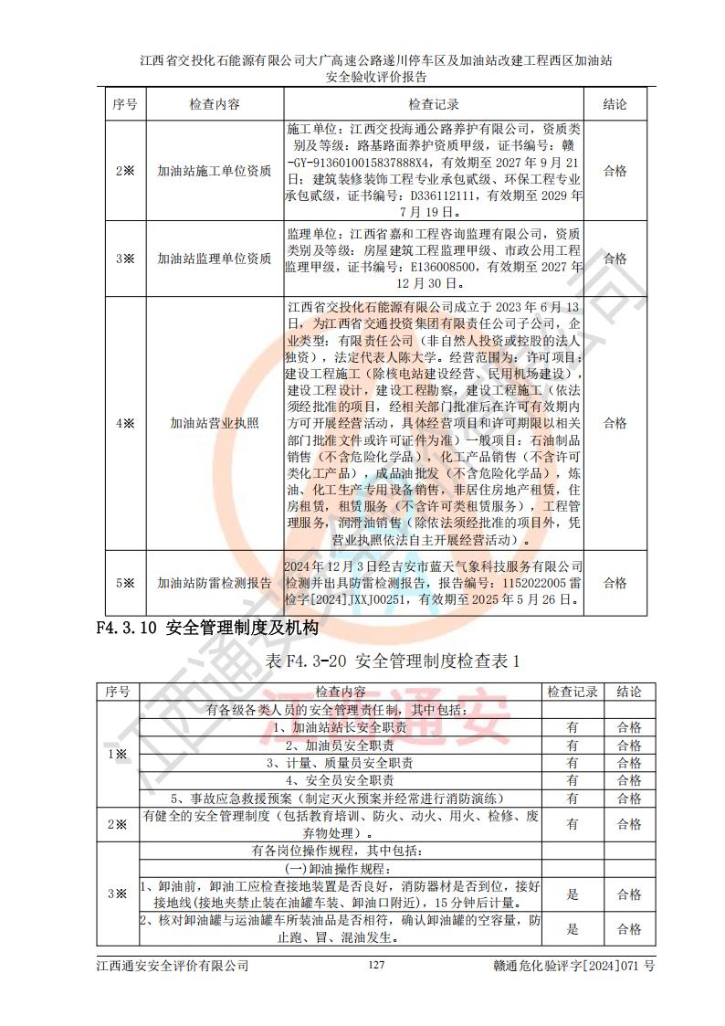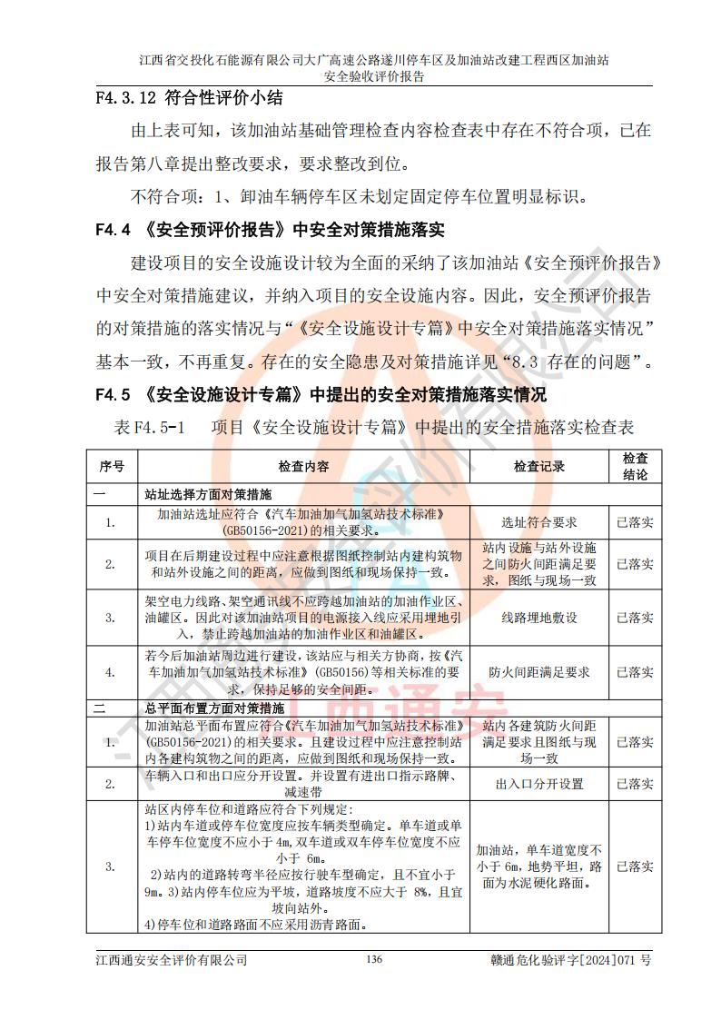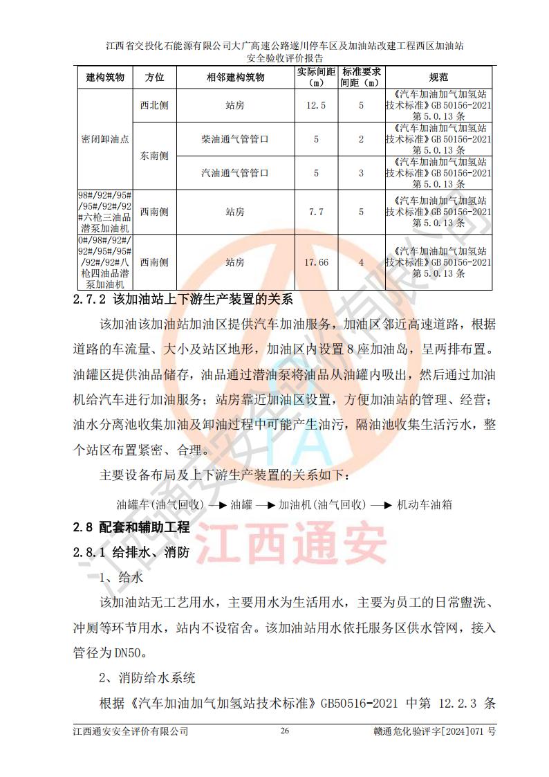 評(píng)價(jià)結(jié)論 | 該加油站在設(shè)計(jì)、施工過程中符合《危險(xiǎn)化學(xué)品建設(shè)項(xiàng)目安全監(jiān)督管理辦法》(2012年1月30日**安全生產(chǎn)監(jiān)督管理總局令第45號(hào)公布,自2012年4月1日起施行;根據(jù)2015年5月27日**安全生產(chǎn)監(jiān)督管理總局令第79號(hào)修正)等法規(guī)的要求,工程配套的安全設(shè)施做到了與主體工程同時(shí)設(shè)計(jì)、同時(shí)施工、同時(shí)投入生產(chǎn)和使用,符合**有關(guān)建設(shè)項(xiàng)目“三同時(shí)”的規(guī)定和要求。 該加油站現(xiàn)場情況與竣工圖紙一致,主體工程安全設(shè)施、安全措施符合法律法規(guī)的規(guī)定和要求,安全設(shè)施正常投用并運(yùn)行**;公用工程及輔助設(shè)施滿足主體工程生產(chǎn)安全的需要;企業(yè)安全管理體系滿足生產(chǎn)安全的要求。該加油站與周邊裝置和設(shè)施的安全防護(hù)距離、安全設(shè)施滿足標(biāo)準(zhǔn)規(guī)范的要求,該加油站的安全條件滿足安全生產(chǎn)的要求。 該加油站已針對本報(bào)告提出的安全隱患整改意見組織人員進(jìn)行整改,已落實(shí)到位,企業(yè)安全生產(chǎn)的風(fēng)險(xiǎn)控制在可以接受的范圍內(nèi)。 綜上所述,江西省交投化石能源有限公司大廣高速公路遂川停車區(qū)及加油站改建工程西區(qū)加油站具備**有關(guān)安全生產(chǎn)法律、法規(guī)、部門規(guī)章及標(biāo)準(zhǔn)規(guī)范要求的安全條件,符合經(jīng)營和儲(chǔ)存危險(xiǎn)化學(xué)品的安全條件要求,具備安全驗(yàn)收的要求。 | |||