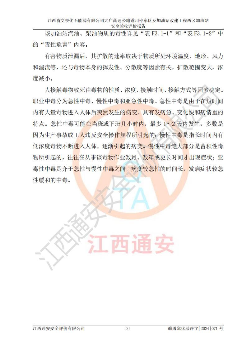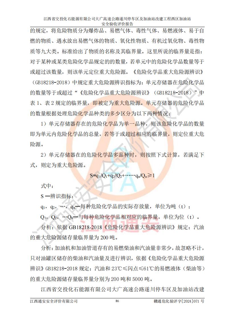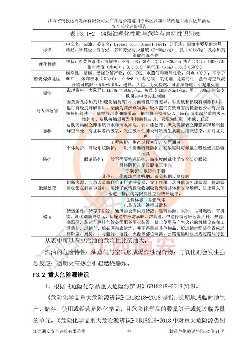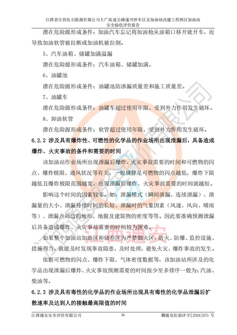 項(xiàng)目簡介 | 江西省交投化石能源有限公司成立于2023年6月13日,為江西省交通投資集團(tuán)有限責(zé)任公司子公司,企業(yè)類型:有限責(zé)任公司(非自然人投資或控股的法人獨(dú)資),法定**人:陳大學(xué)。經(jīng)營范圍為:許可項(xiàng)目:建設(shè)工程施工(除核電站建設(shè)經(jīng)營、民用機(jī)場建設(shè)),建設(shè)工程設(shè)計(jì),建設(shè)工程勘察,建設(shè)工程施工(依法須經(jīng)批準(zhǔn)的項(xiàng)目,經(jīng)相關(guān)部門批準(zhǔn)后在許可**期內(nèi)方可開展經(jīng)營活動(dòng),具體經(jīng)營項(xiàng)目和許可期限以相關(guān)部門批準(zhǔn)文件或許可證件為準(zhǔn))一般項(xiàng)目:石油制品銷售(不含危險(xiǎn)化學(xué)品),化工產(chǎn)品銷售(不含許可類化工產(chǎn)品),成品油批發(fā)(不含危險(xiǎn)化學(xué)品),煉油、化工生產(chǎn)**設(shè)備銷售,非居住房地產(chǎn)租賃,住房租賃,租賃服務(wù)(不含許可類租賃服務(wù)),工程管理服務(wù),潤滑油銷售(除依法須經(jīng)批準(zhǔn)的項(xiàng)目外,憑營業(yè)執(zhí)照依法自主開展經(jīng)營活動(dòng))。該站位于江西省吉安市遂川縣碧洲鎮(zhèn)。 該加油站改建前為中國石化銷售股份有限公司江西吉安石油分公司遂川服務(wù)區(qū)高速西加油站。江西省交投化石能源有限公司收購了該加油站。 江西省交投化石能源有限公司大廣高速公路遂川停車區(qū)及加油站改建工程西區(qū)加油站位于江西省吉安市遂川縣碧洲鎮(zhèn),占地規(guī)模和建筑面積:總用地面積3024.38m2,建筑計(jì)容面積848.33m2;新建二層框架結(jié)構(gòu)站房418.89m2。新建一座鋼結(jié)構(gòu)罩棚,投影面積971.29m2,建筑面積429.44m2。 該加油站改建前站內(nèi)設(shè)置了1座50m3的0#柴油埋地臥式雙層貯罐、1座30m3的0#柴油埋地臥式雙層貯罐、1座30m3的92#汽油埋地臥式雙層貯罐、1座50m3的92#汽油埋地臥式油罐、1座50m3的95#汽油埋地臥式雙層油罐。*大存儲(chǔ)量為210m3,實(shí)際油品折算總?cè)萘繛?70m3(柴油折半),屬于**加油站。改建后站內(nèi)設(shè)置2座50m3油罐儲(chǔ)存0#柴油,1座50m3油罐儲(chǔ)存92#汽油,1座50m3油罐儲(chǔ)存95#汽油,1座30m3油罐儲(chǔ)存92#汽油,1座30m3油罐儲(chǔ)存98#汽油,*大存儲(chǔ)量為260m3,實(shí)際油品折合總?cè)萘抗灿?jì)210m3(柴油折半計(jì)算),屬于**加油站。加油站等級(jí)未發(fā)生改變。 該加油站的主要化學(xué)品物質(zhì)是汽油和柴油。根據(jù)危險(xiǎn)化學(xué)品目錄[2015年版]》(**安監(jiān)總局等十部門[2015]第5號(hào))以及《應(yīng)急管理部辦公廳關(guān)于修改《危險(xiǎn)化學(xué)品目錄(2015版)實(shí)施指南(試行)》涉及柴油部分內(nèi)容的通知》(應(yīng)急廳函〔2022〕300號(hào))、應(yīng)急管理部 工業(yè)和信息化部 公安部 生態(tài)環(huán)境部 交通運(yùn)輸部 農(nóng)業(yè)農(nóng)村部 衛(wèi)生健康委 市場監(jiān)管總局 鐵路局 民航局公告2022年第8號(hào)決定調(diào)整《危險(xiǎn)化學(xué)品目錄(2015版)》,將“1674柴油[閉杯閃點(diǎn)≤60℃]”調(diào)整為“1674柴油”等文件進(jìn)行辨識(shí):該加油站經(jīng)營的汽油、柴油均屬于危險(xiǎn)化學(xué)品。 | |||