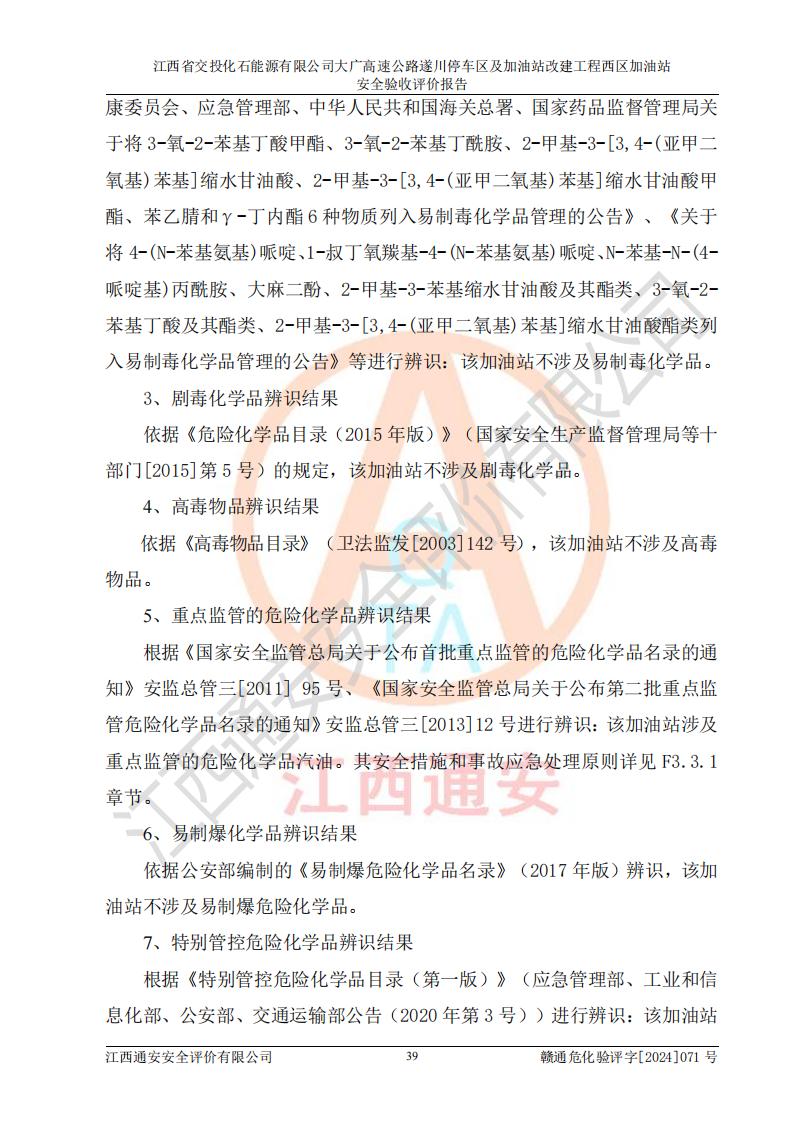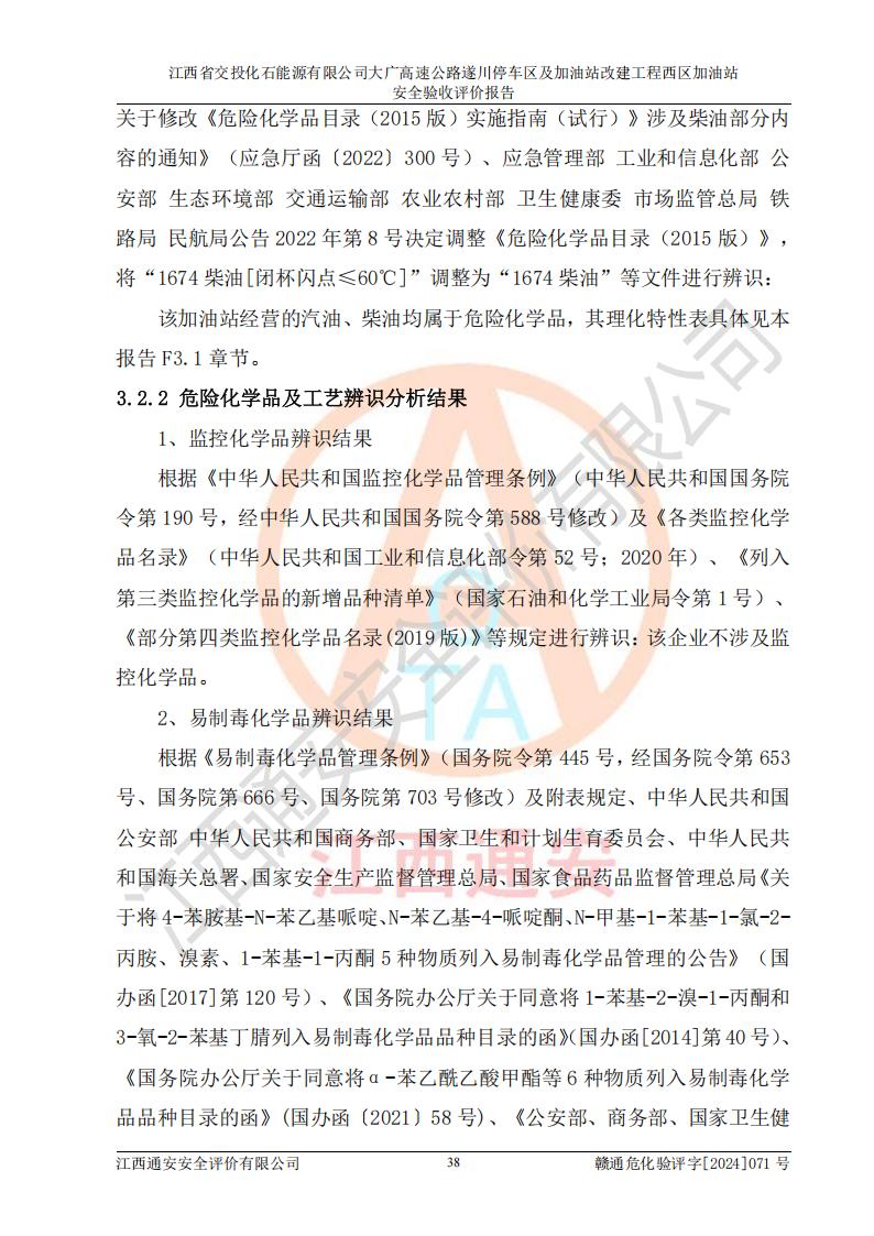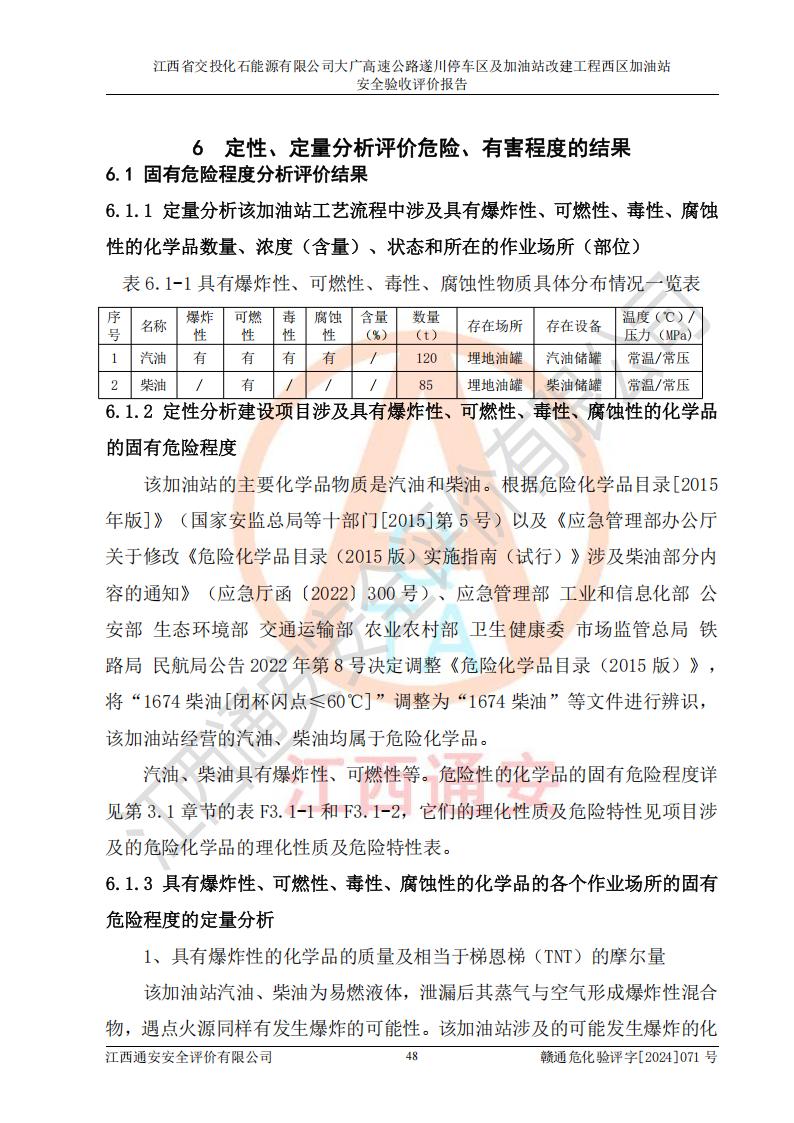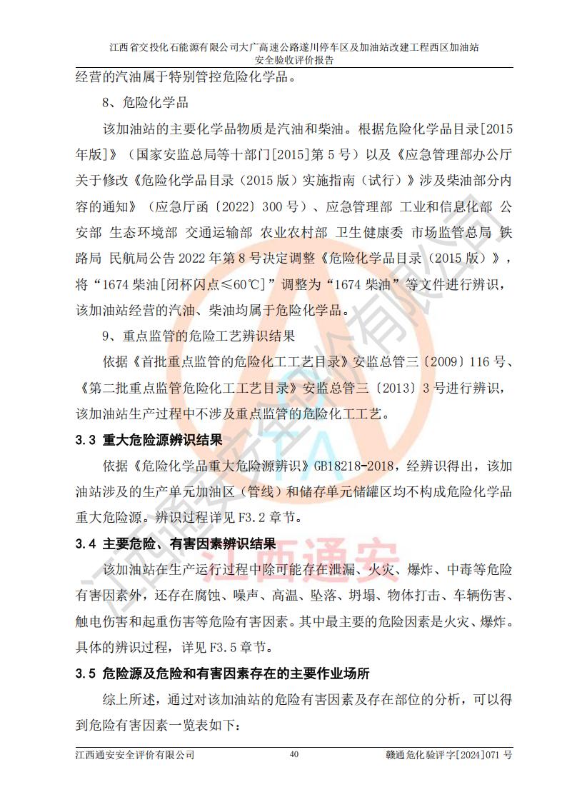 項(xiàng)目簡介 | 江西省交投化石能源有限公司成立于2023年6月13日,為江西省交通投資集團(tuán)有限責(zé)任公司子公司,企業(yè)類型:有限責(zé)任公司(非自然人投資或控股的法人獨(dú)資),法定**人:陳大學(xué)。經(jīng)營范圍為:許可項(xiàng)目:建設(shè)工程施工(除核電站建設(shè)經(jīng)營、民用機(jī)場建設(shè)),建設(shè)工程設(shè)計(jì),建設(shè)工程勘察,建設(shè)工程施工(依法須經(jīng)批準(zhǔn)的項(xiàng)目,經(jīng)相關(guān)部門批準(zhǔn)后在許可**期內(nèi)方可開展經(jīng)營活動(dòng),具體經(jīng)營項(xiàng)目和許可期限以相關(guān)部門批準(zhǔn)文件或許可證件為準(zhǔn))一般項(xiàng)目:石油制品銷售(不含危險(xiǎn)化學(xué)品),化工產(chǎn)品銷售(不含許可類化工產(chǎn)品),成品油批發(fā)(不含危險(xiǎn)化學(xué)品),煉油、化工生產(chǎn)**設(shè)備銷售,非居住房地產(chǎn)租賃,住房租賃,租賃服務(wù)(不含許可類租賃服務(wù)),工程管理服務(wù),潤滑油銷售(除依法須經(jīng)批準(zhǔn)的項(xiàng)目外,憑營業(yè)執(zhí)照依法自主開展經(jīng)營活動(dòng))。該站位于江西省吉安市遂川縣碧洲鎮(zhèn)。 該加油站改建前為中國石化銷售股份有限公司江西吉安石油分公司遂川服務(wù)區(qū)高速西加油站。江西省交投化石能源有限公司收購了該加油站。 江西省交投化石能源有限公司大廣高速公路遂川停車區(qū)及加油站改建工程西區(qū)加油站位于江西省吉安市遂川縣碧洲鎮(zhèn),占地規(guī)模和建筑面積:總用地面積3024.38m2,建筑計(jì)容面積848.33m2;新建二層框架結(jié)構(gòu)站房418.89m2。新建一座鋼結(jié)構(gòu)罩棚,投影面積971.29m2,建筑面積429.44m2。 該加油站改建前站內(nèi)設(shè)置了1座50m3的0#柴油埋地臥式雙層貯罐、1座30m3的0#柴油埋地臥式雙層貯罐、1座30m3的92#汽油埋地臥式雙層貯罐、1座50m3的92#汽油埋地臥式油罐、1座50m3的95#汽油埋地臥式雙層油罐。*大存儲(chǔ)量為210m3,實(shí)際油品折算總?cè)萘繛?70m3(柴油折半),屬于**加油站。改建后站內(nèi)設(shè)置2座50m3油罐儲(chǔ)存0#柴油,1座50m3油罐儲(chǔ)存92#汽油,1座50m3油罐儲(chǔ)存95#汽油,1座30m3油罐儲(chǔ)存92#汽油,1座30m3油罐儲(chǔ)存98#汽油,*大存儲(chǔ)量為260m3,實(shí)際油品折合總?cè)萘抗灿?jì)210m3(柴油折半計(jì)算),屬于**加油站。加油站等級(jí)未發(fā)生改變。 該加油站的主要化學(xué)品物質(zhì)是汽油和柴油。根據(jù)危險(xiǎn)化學(xué)品目錄[2015年版]》(**安監(jiān)總局等十部門[2015]第5號(hào))以及《應(yīng)急管理部辦公廳關(guān)于修改《危險(xiǎn)化學(xué)品目錄(2015版)實(shí)施指南(試行)》涉及柴油部分內(nèi)容的通知》(應(yīng)急廳函〔2022〕300號(hào))、應(yīng)急管理部 工業(yè)和信息化部 公安部 生態(tài)環(huán)境部 交通運(yùn)輸部 農(nóng)業(yè)農(nóng)村部 衛(wèi)生健康委 市場監(jiān)管總局 鐵路局 民航局公告2022年第8號(hào)決定調(diào)整《危險(xiǎn)化學(xué)品目錄(2015版)》,將“1674柴油[閉杯閃點(diǎn)≤60℃]”調(diào)整為“1674柴油”等文件進(jìn)行辨識(shí):該加油站經(jīng)營的汽油、柴油均屬于危險(xiǎn)化學(xué)品。 | |||