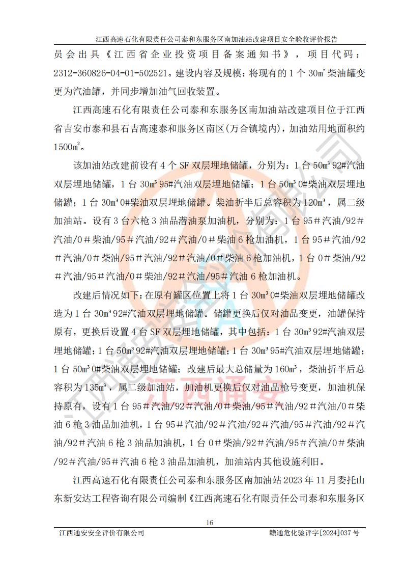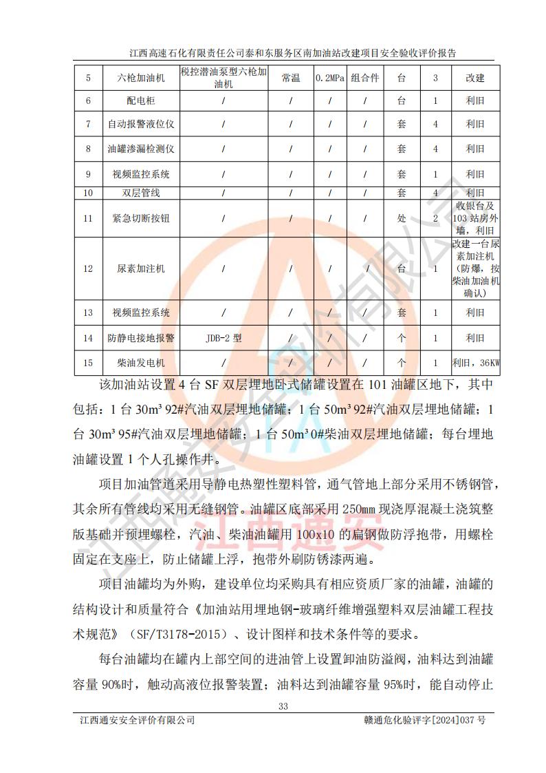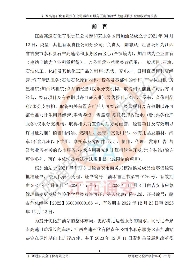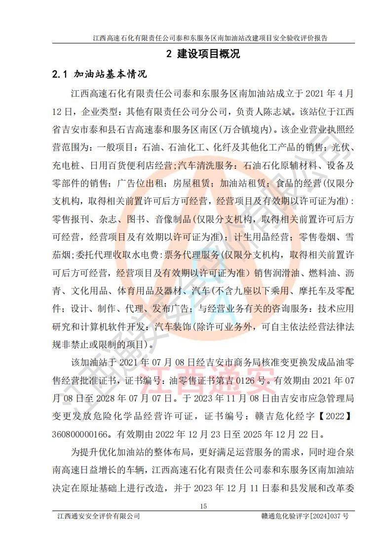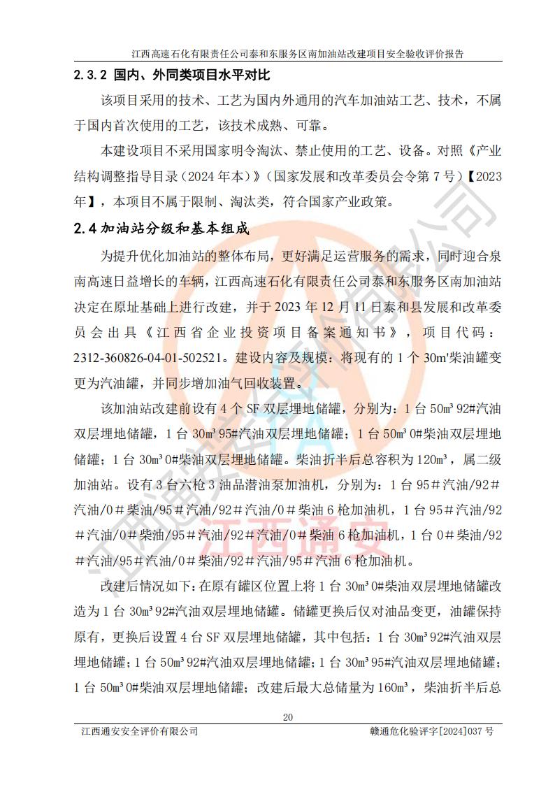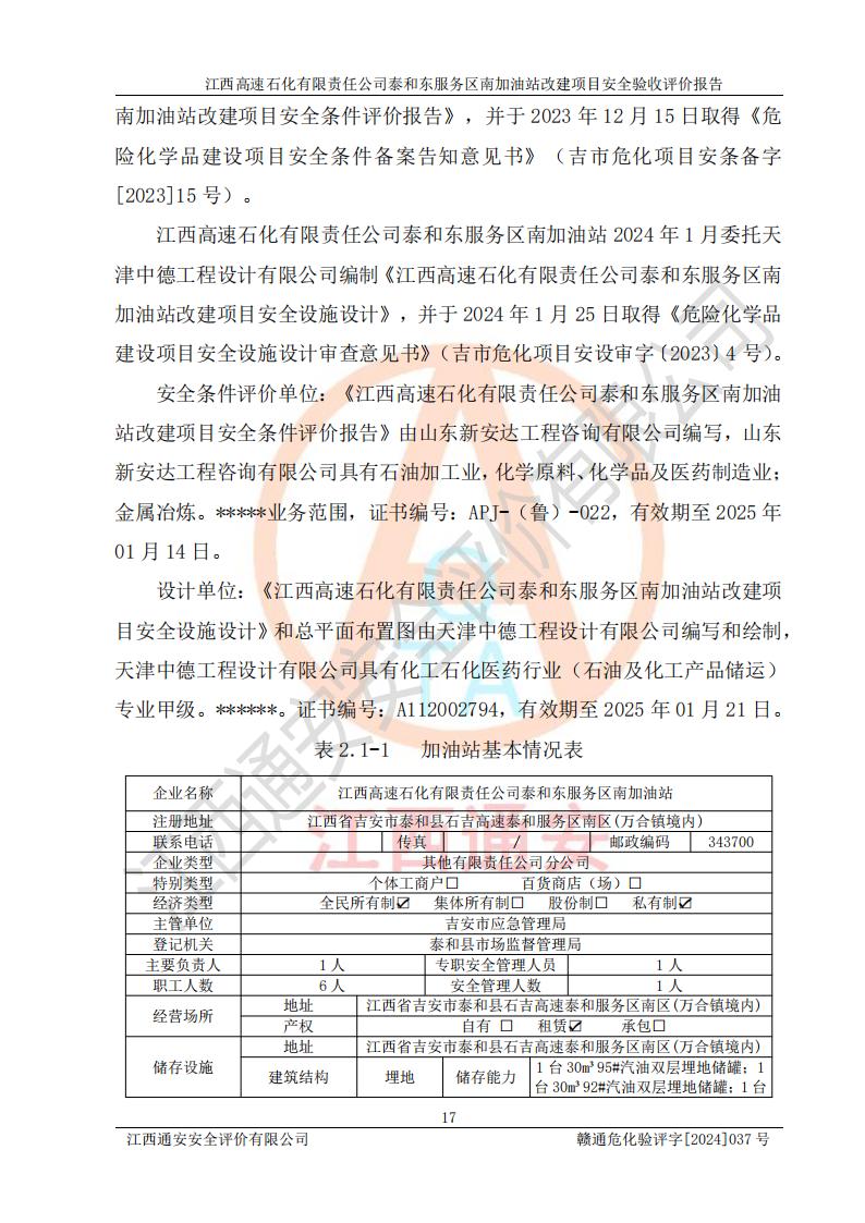 項目名稱 | 江西高速石化有限責(zé)任公司泰和東服務(wù)區(qū)南加油站改建項目安全驗收評價報告 | ||||
