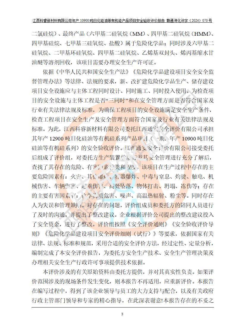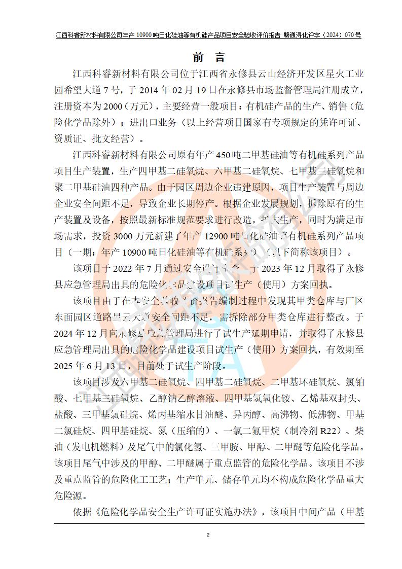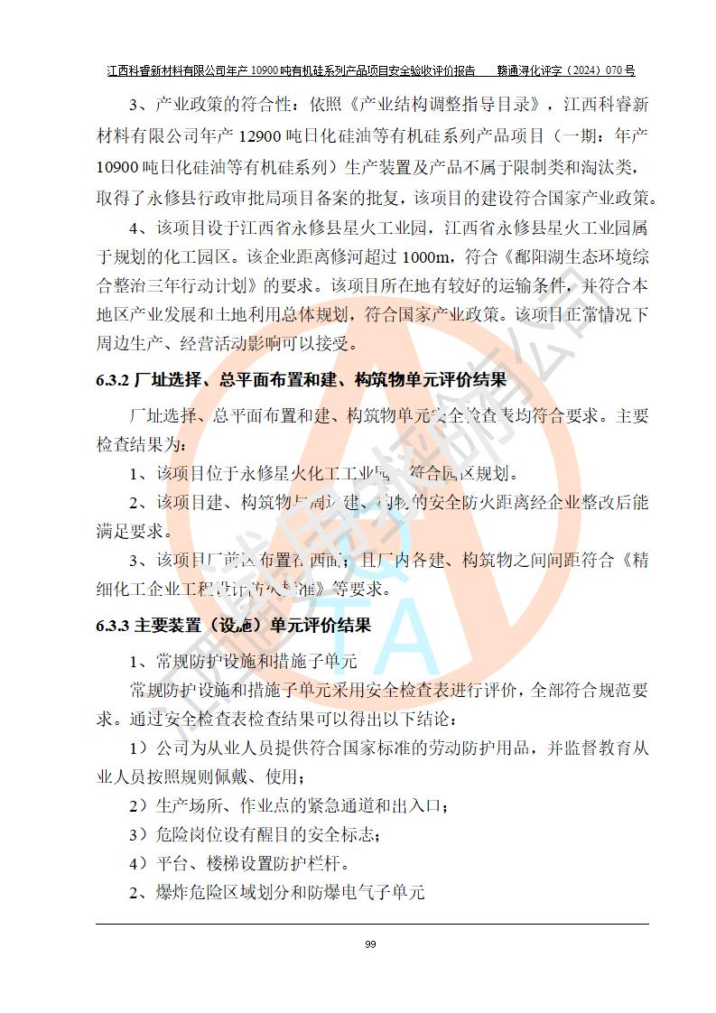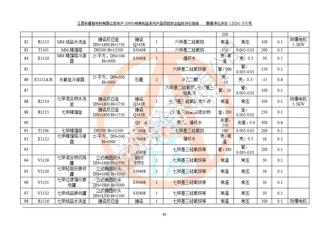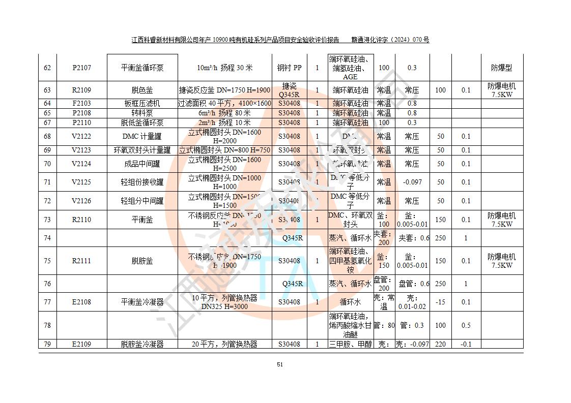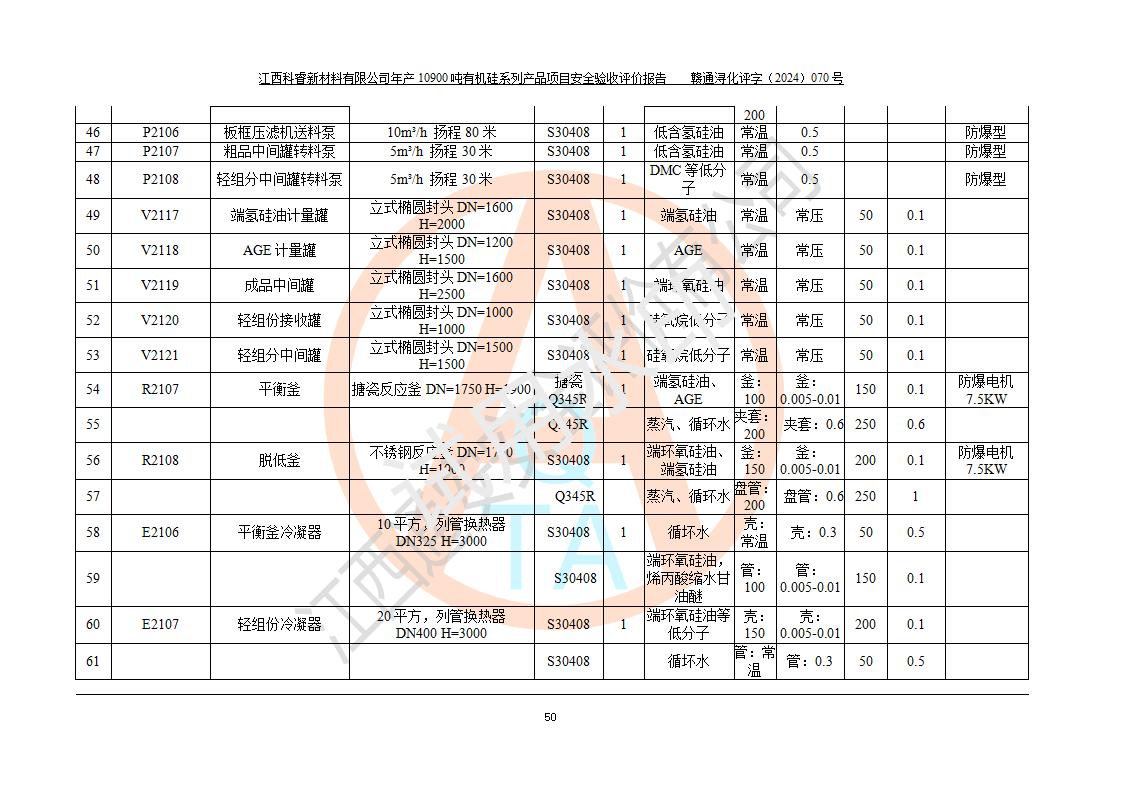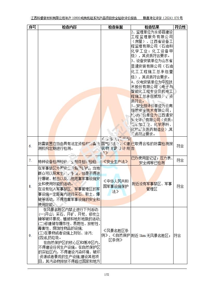 評價報告名稱 | 江西科睿新材料有限公司年產(chǎn)12900噸日化硅油等有機(jī)硅系列產(chǎn)品項(xiàng)目 (一期:年產(chǎn)10900噸日化硅油等有機(jī)硅系列)安全驗(yàn)收評價 | |||||