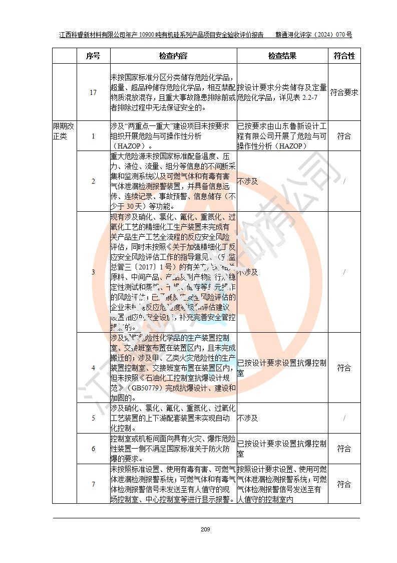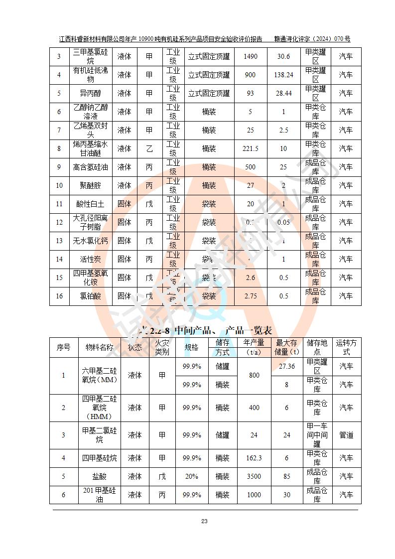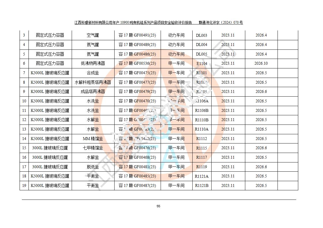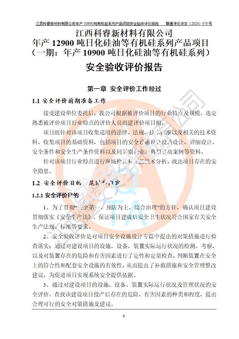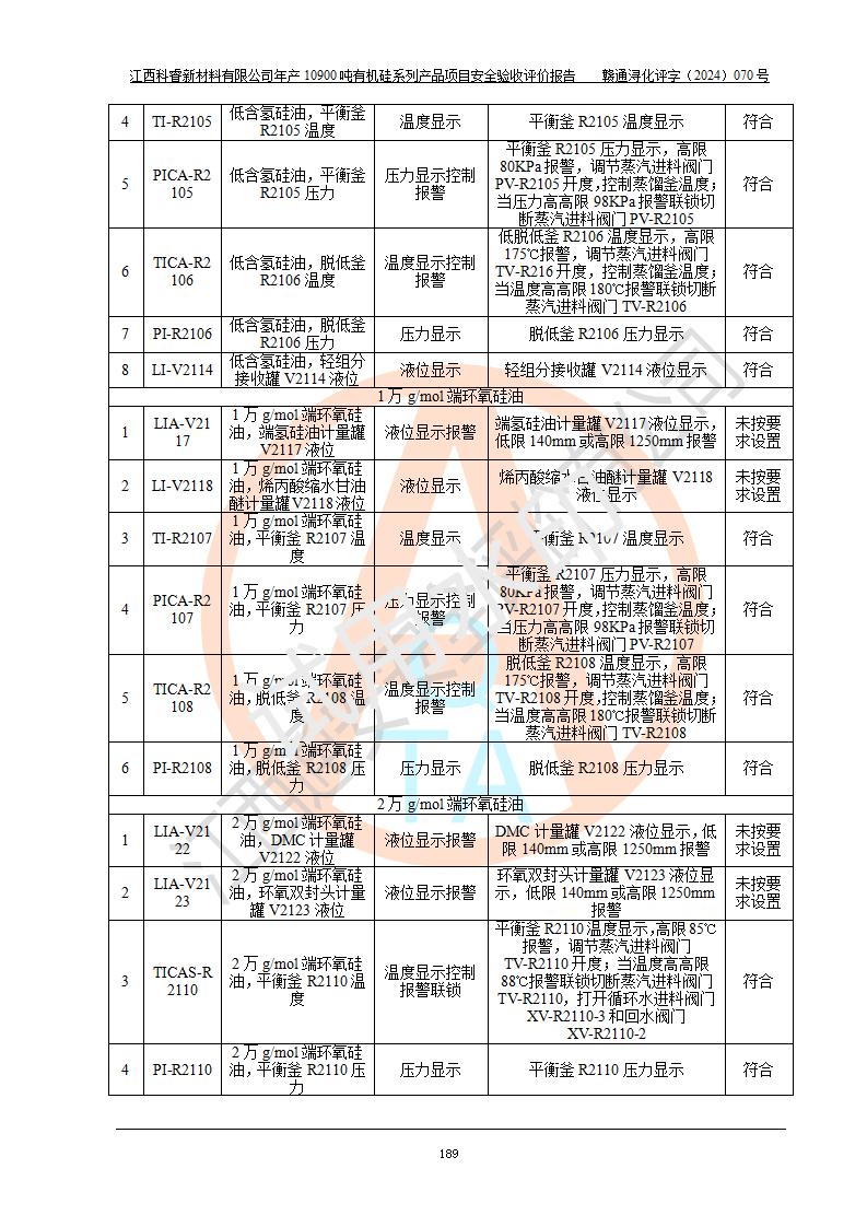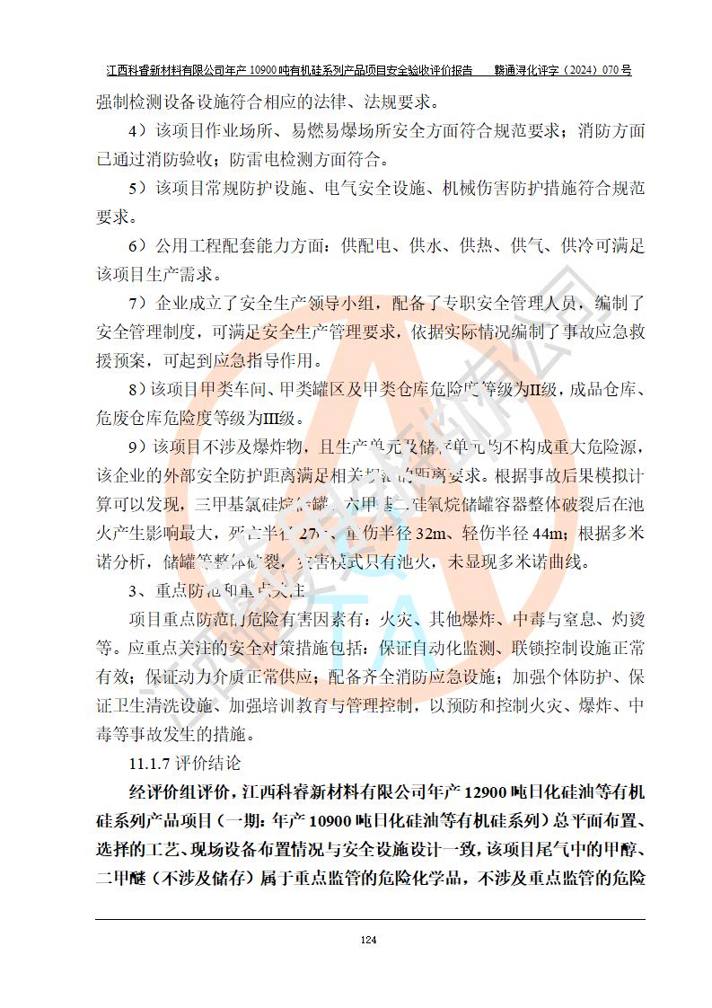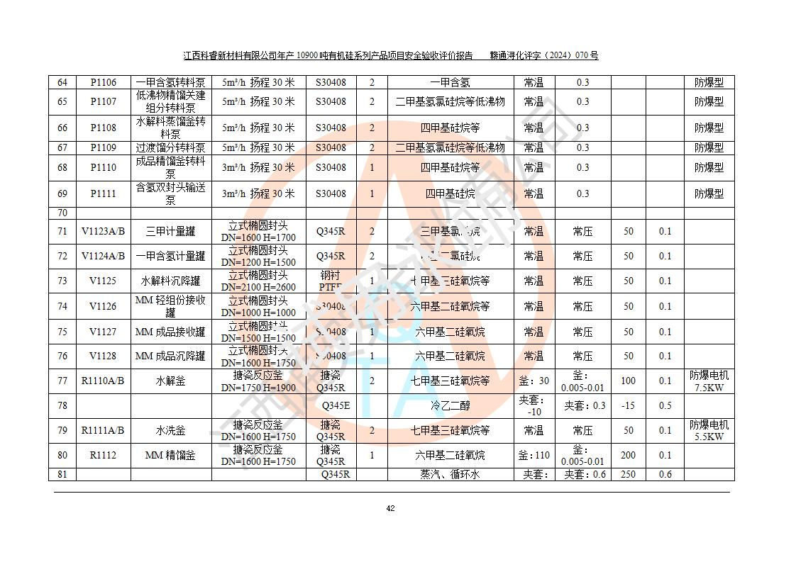 評價報告名稱 | 江西科睿新材料有限公司年產(chǎn)12900噸日化硅油等有機(jī)硅系列產(chǎn)品項(xiàng)目 (一期:年產(chǎn)10900噸日化硅油等有機(jī)硅系列)安全驗(yàn)收評價 | |||||