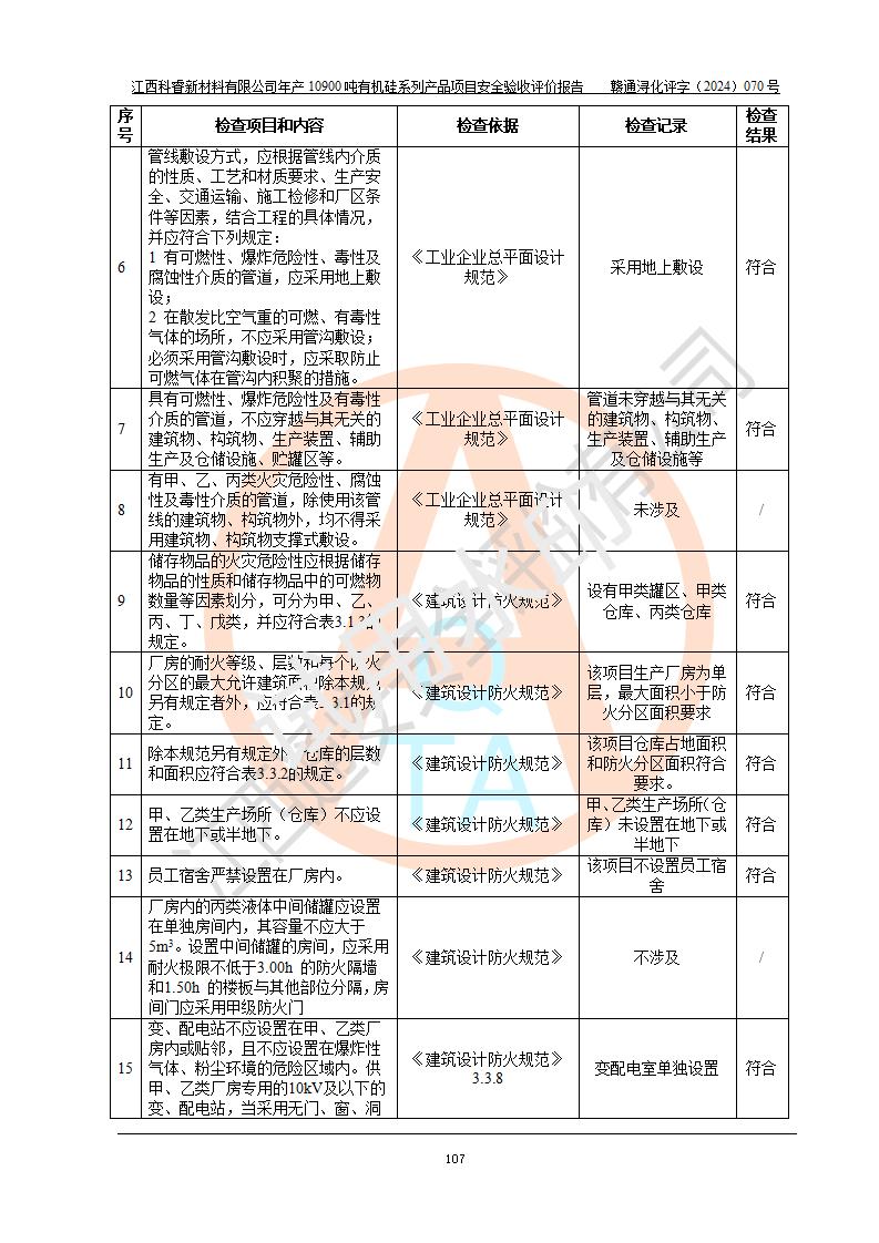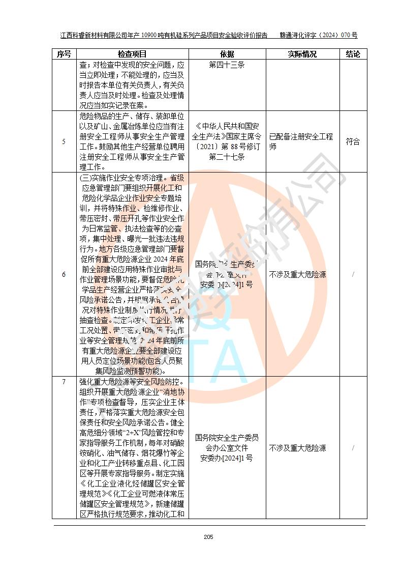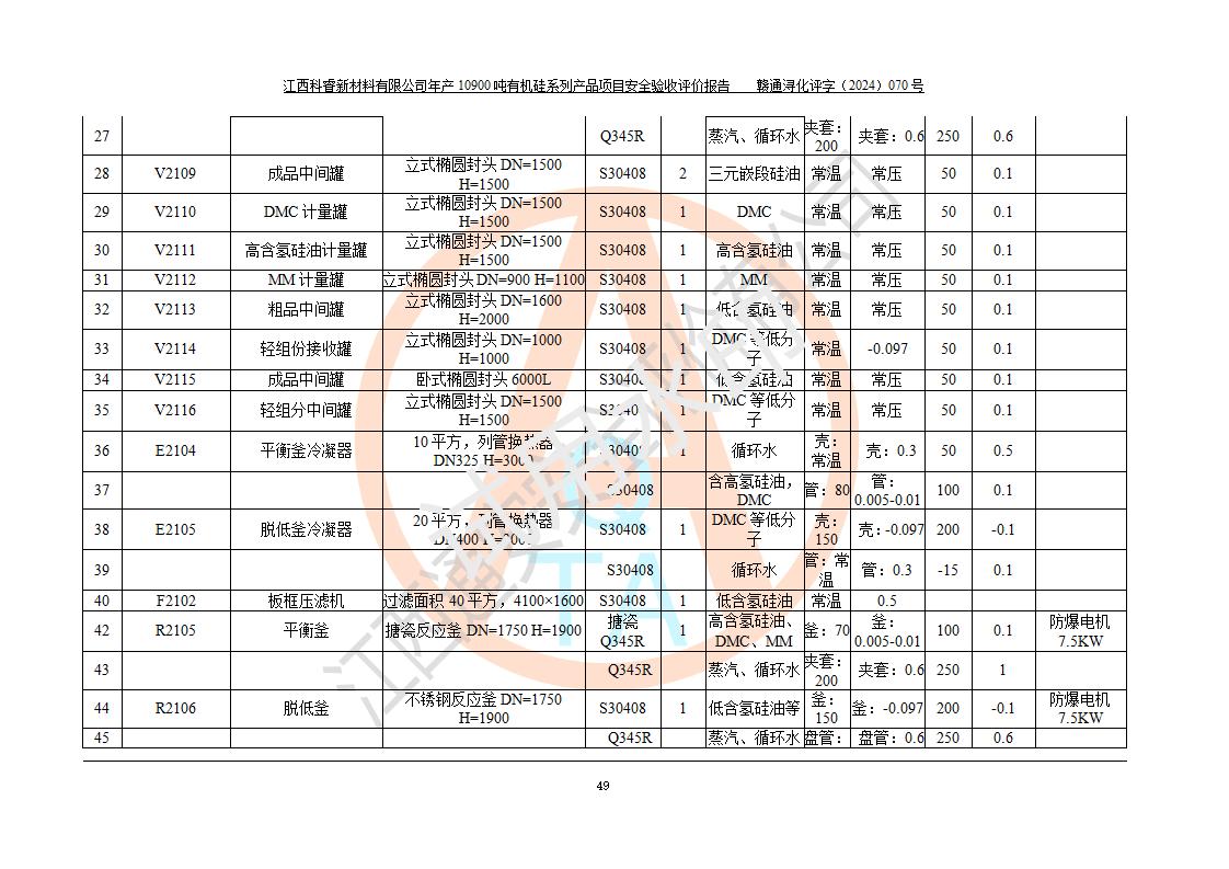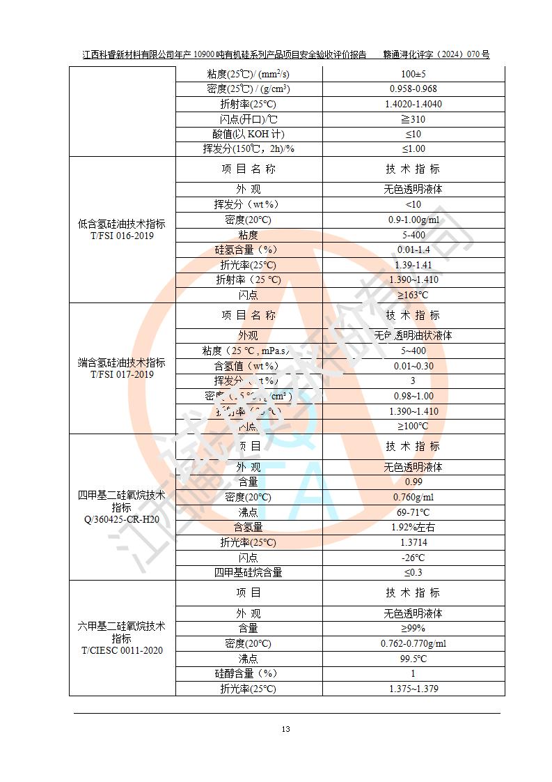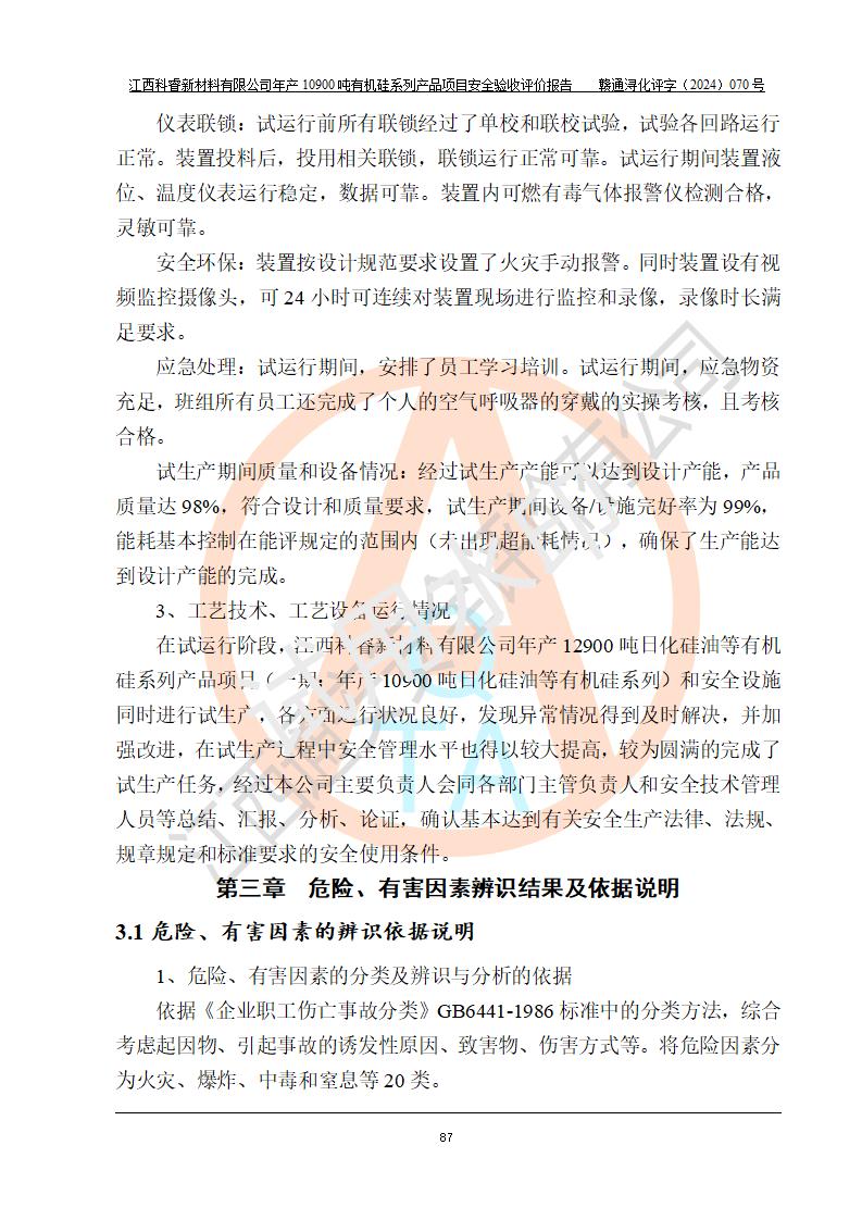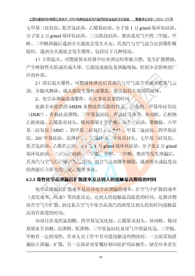 評價報告名稱 | 江西科睿新材料有限公司年產(chǎn)12900噸日化硅油等有機(jī)硅系列產(chǎn)品項(xiàng)目 (一期:年產(chǎn)10900噸日化硅油等有機(jī)硅系列)安全驗(yàn)收評價 | |||||