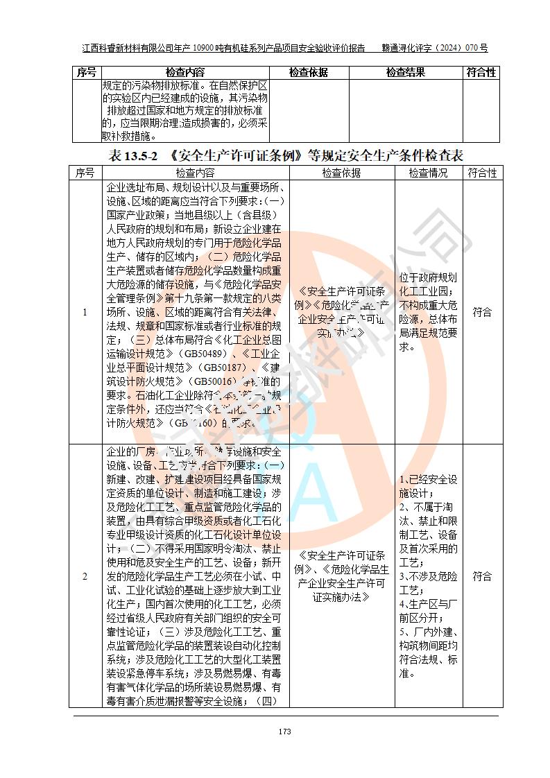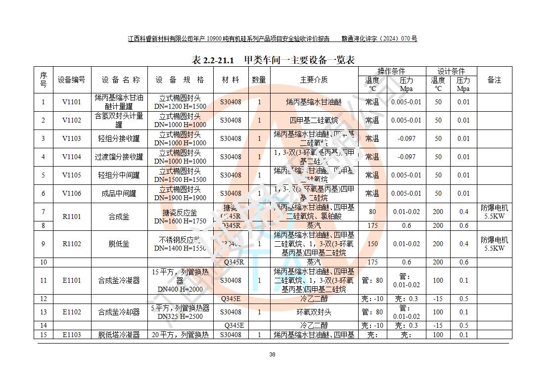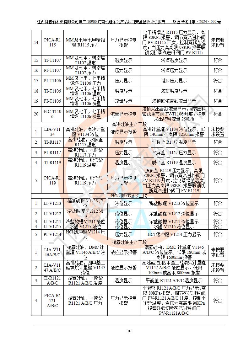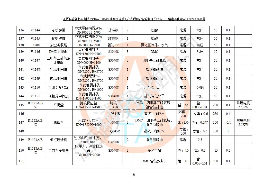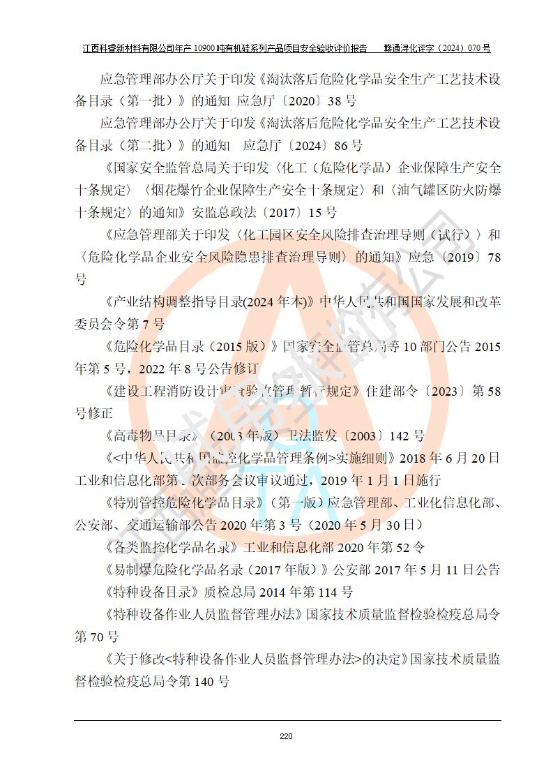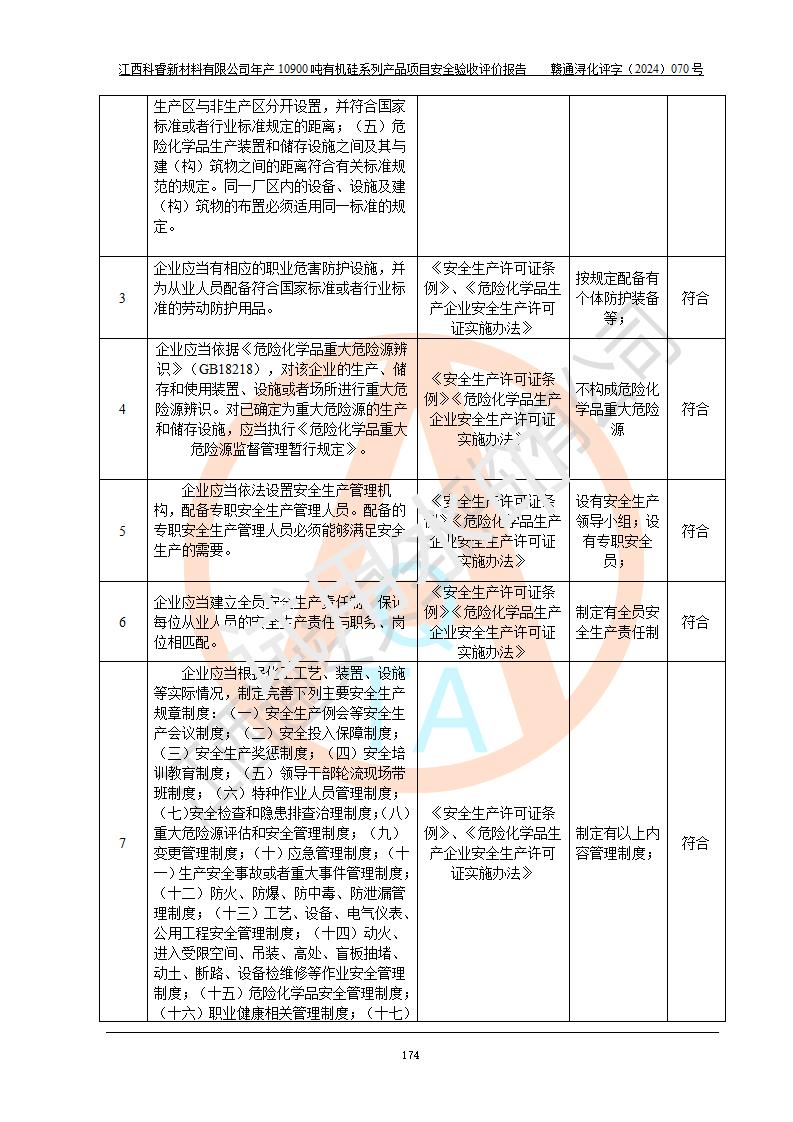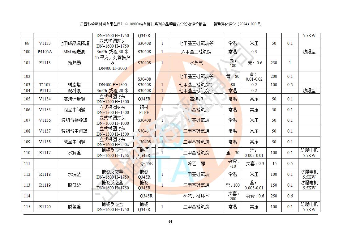 評價報告名稱 | 江西科睿新材料有限公司年產(chǎn)12900噸日化硅油等有機(jī)硅系列產(chǎn)品項(xiàng)目 (一期:年產(chǎn)10900噸日化硅油等有機(jī)硅系列)安全驗(yàn)收評價 | |||||
