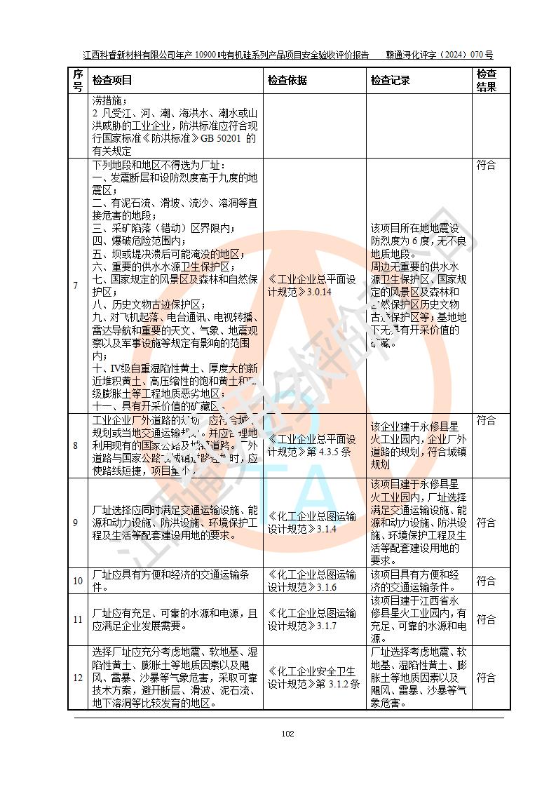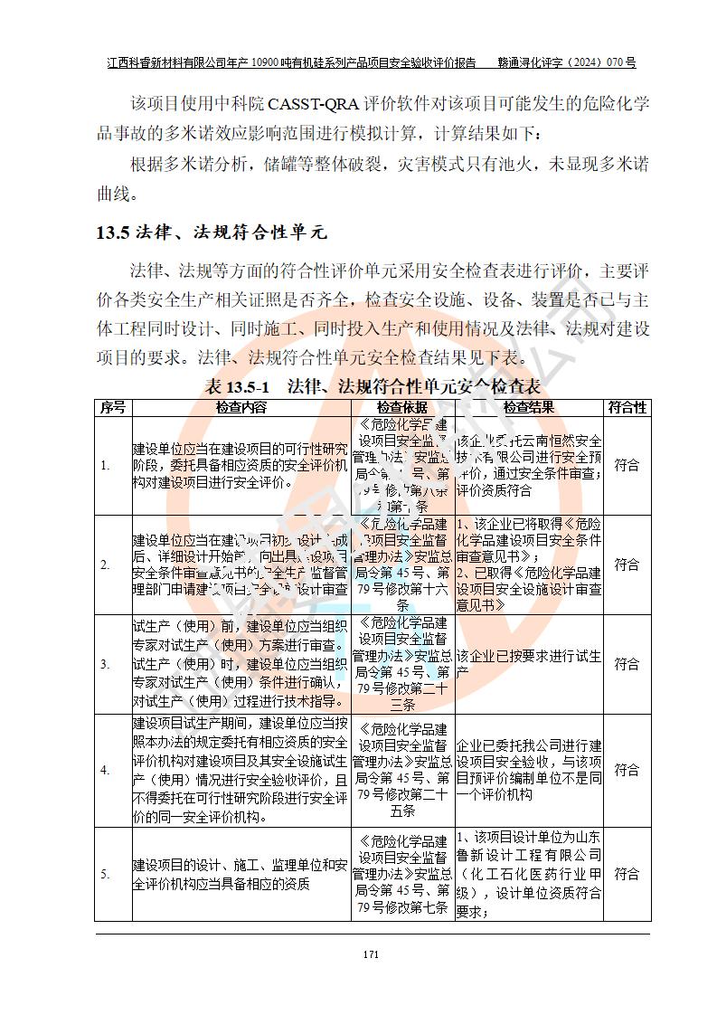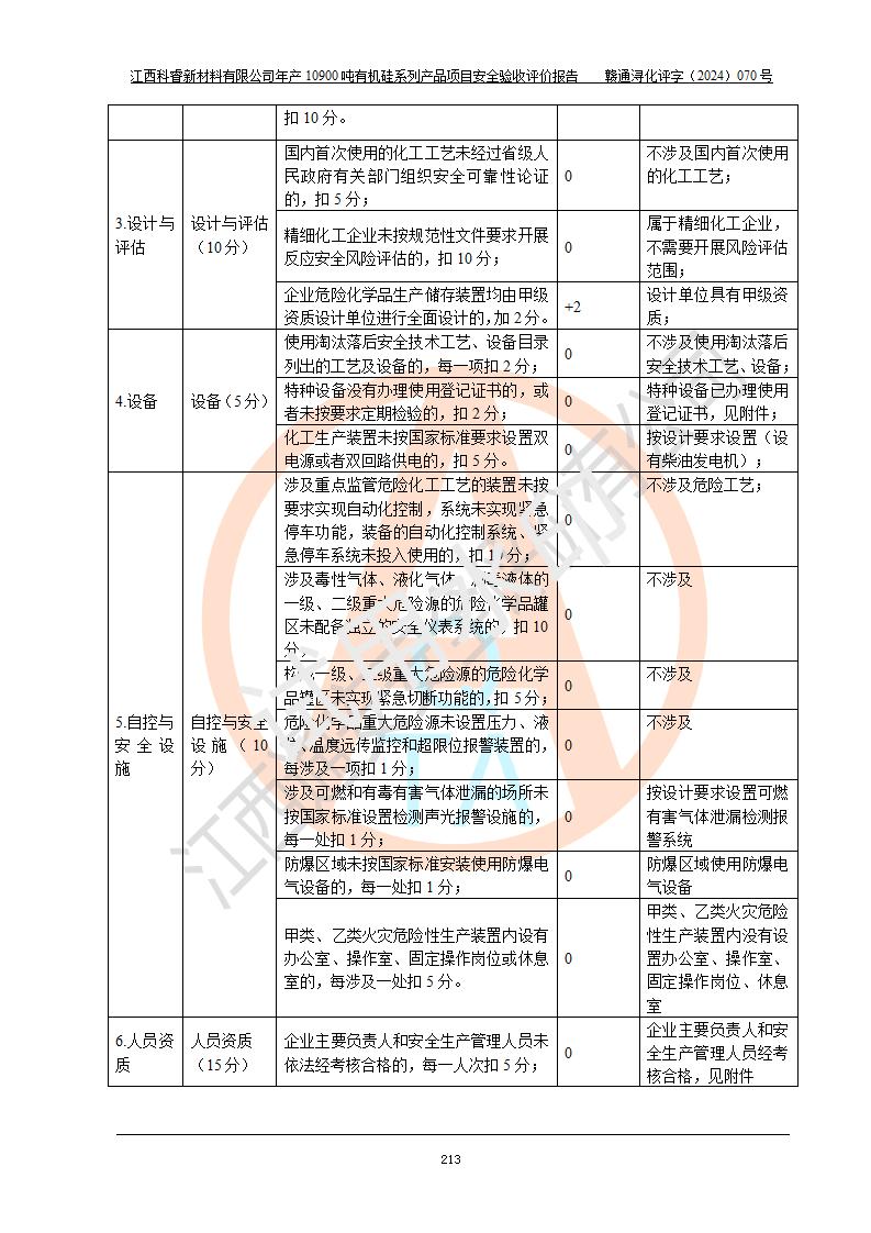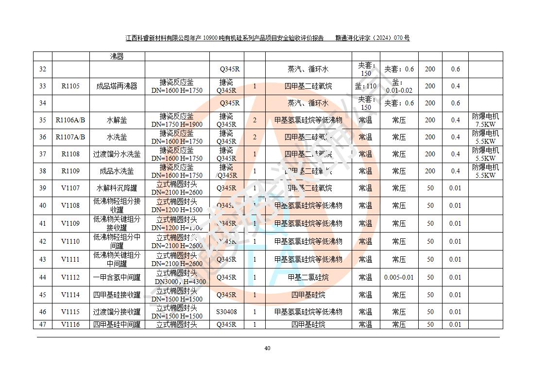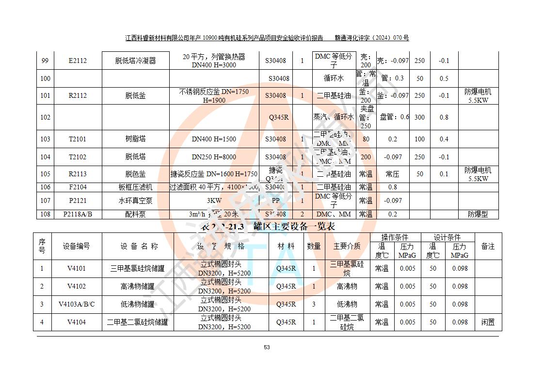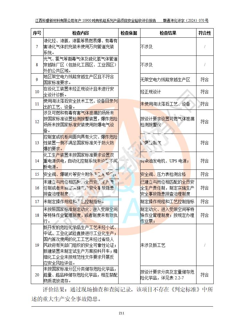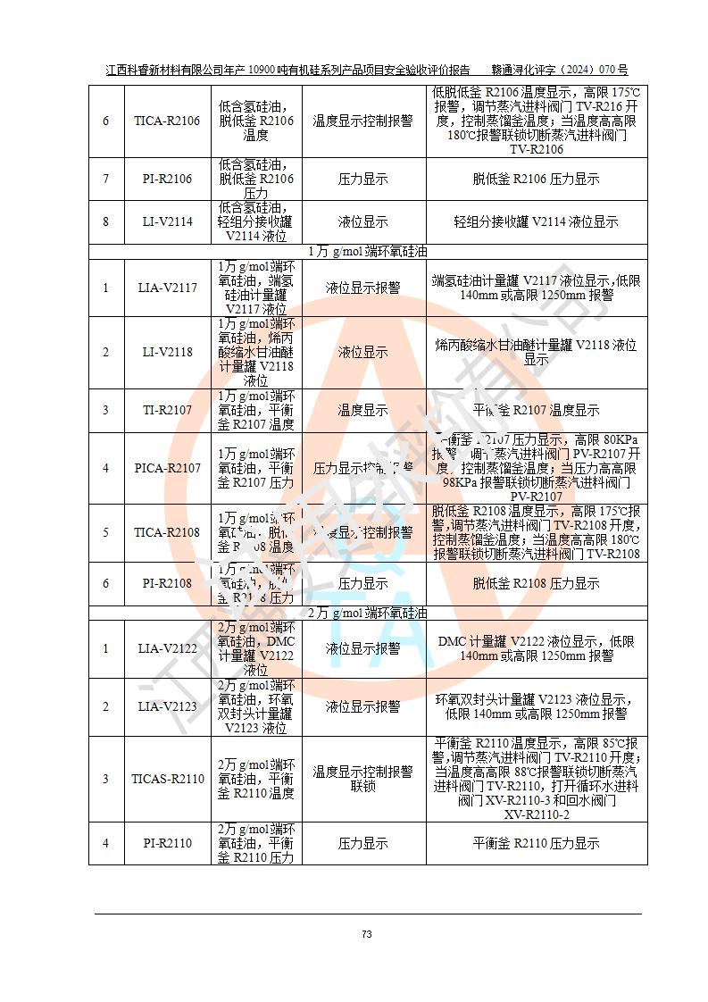 評價報告名稱 | 江西科睿新材料有限公司年產(chǎn)12900噸日化硅油等有機(jī)硅系列產(chǎn)品項(xiàng)目 (一期:年產(chǎn)10900噸日化硅油等有機(jī)硅系列)安全驗(yàn)收評價 | |||||
