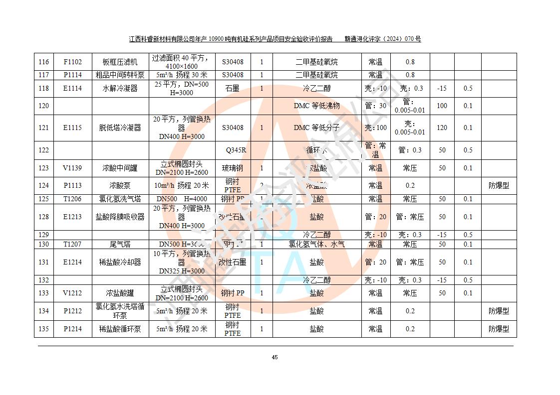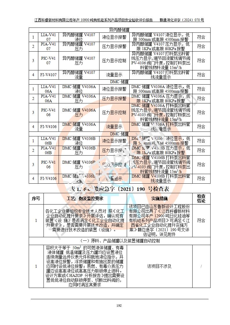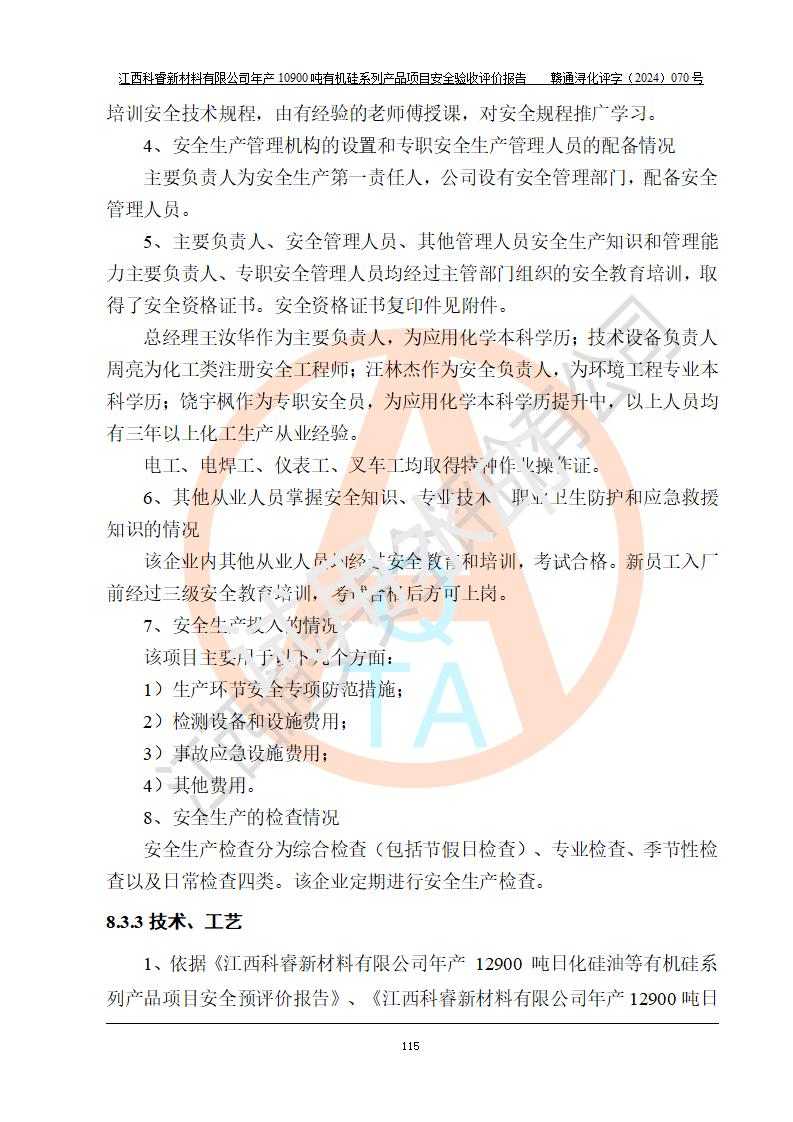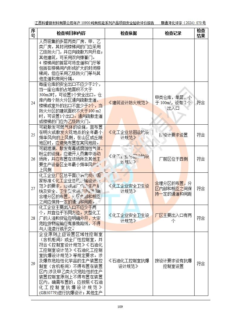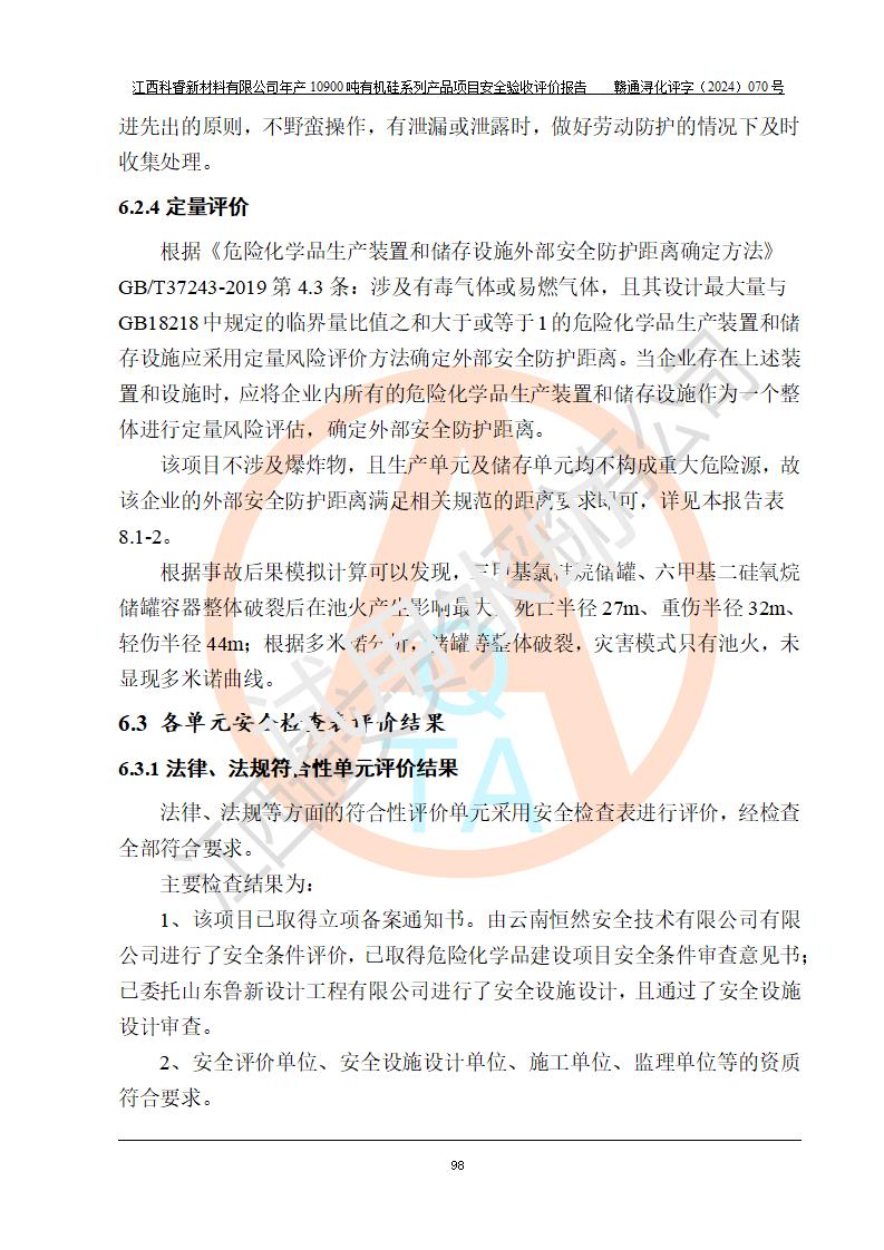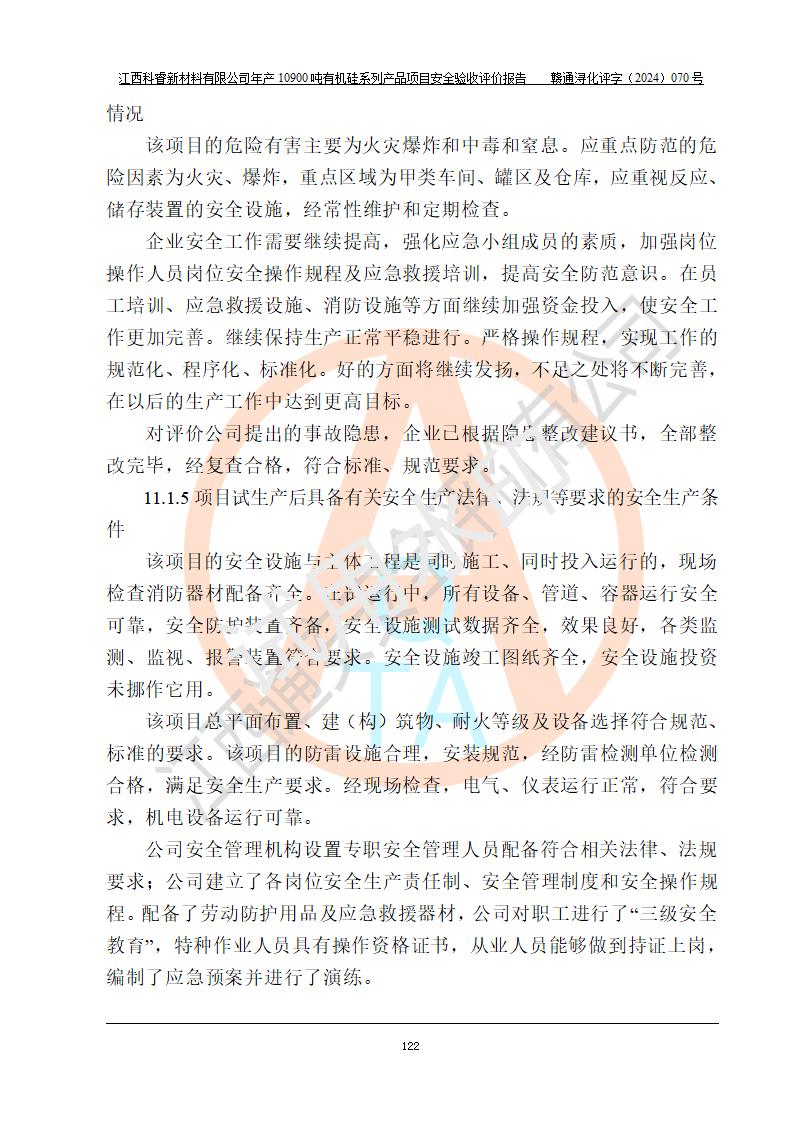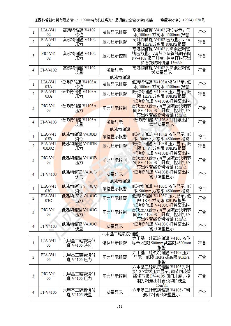 評價報告名稱 | 江西科睿新材料有限公司年產(chǎn)12900噸日化硅油等有機(jī)硅系列產(chǎn)品項(xiàng)目 (一期:年產(chǎn)10900噸日化硅油等有機(jī)硅系列)安全驗(yàn)收評價 | |||||