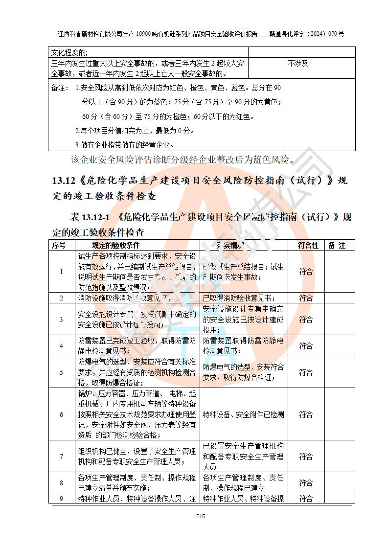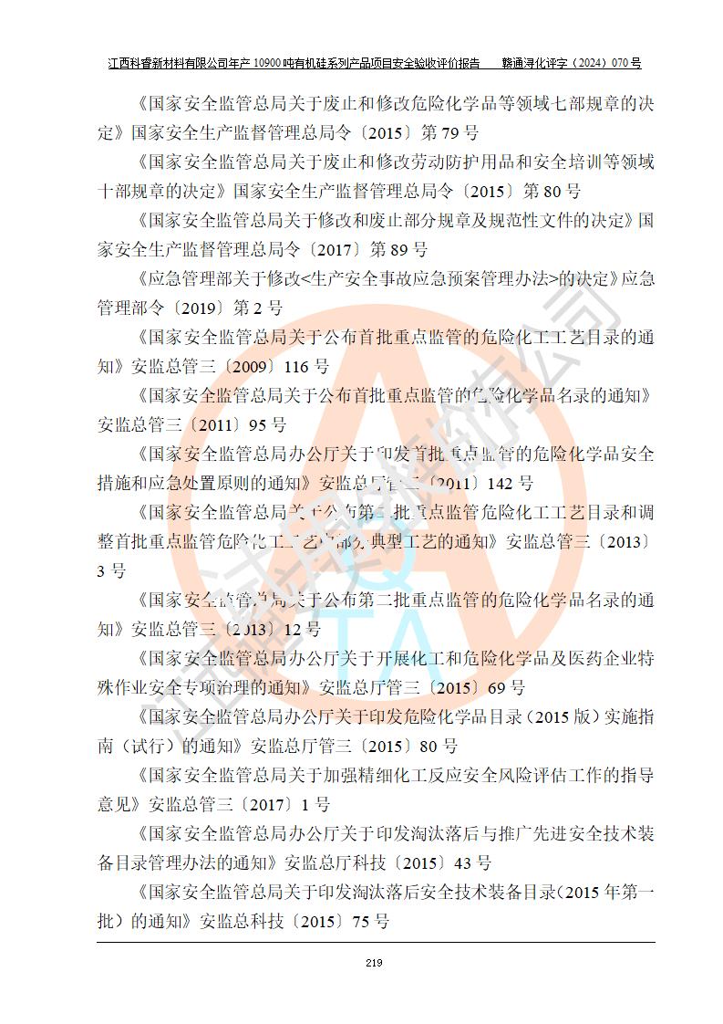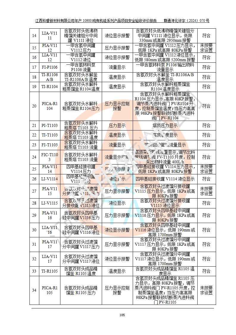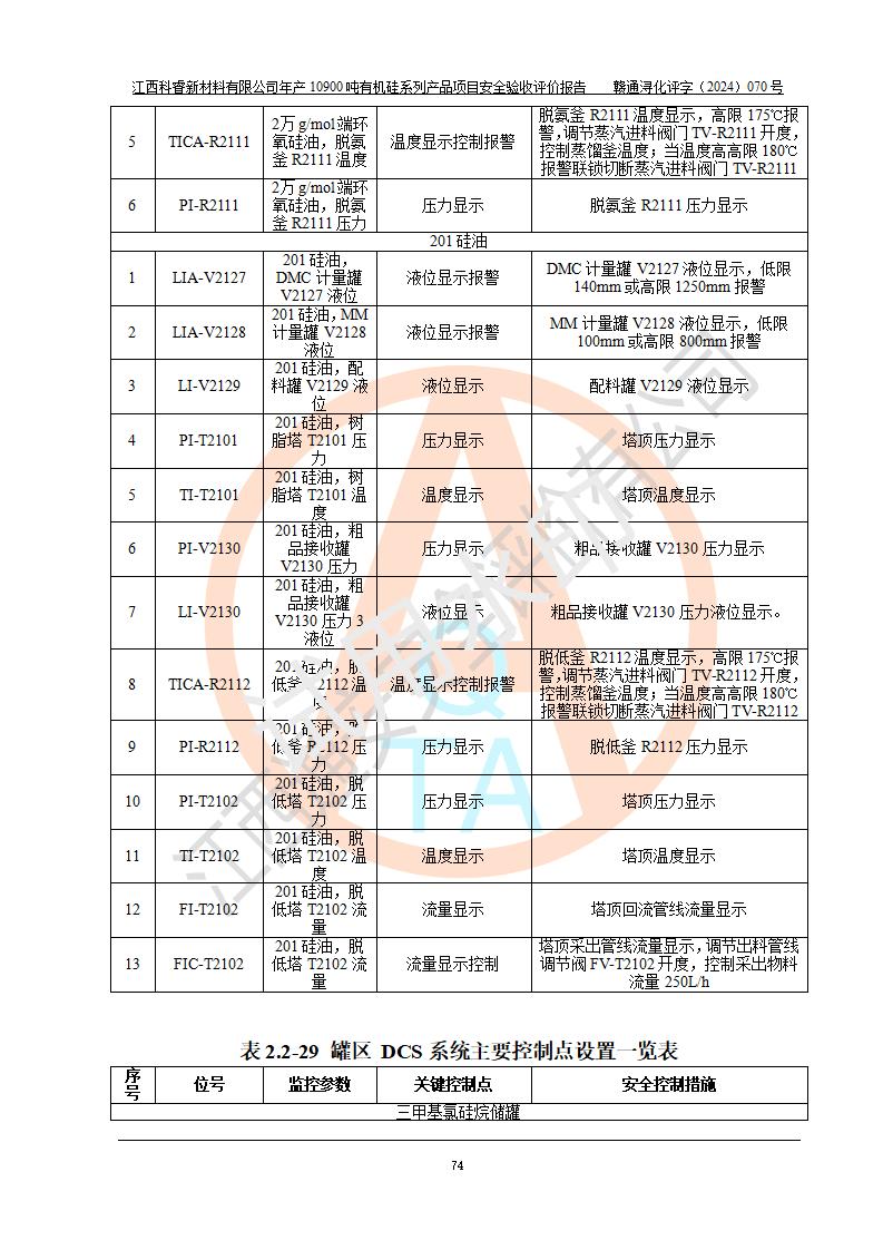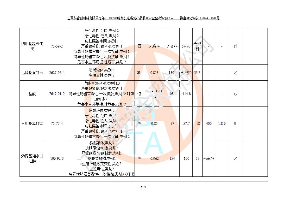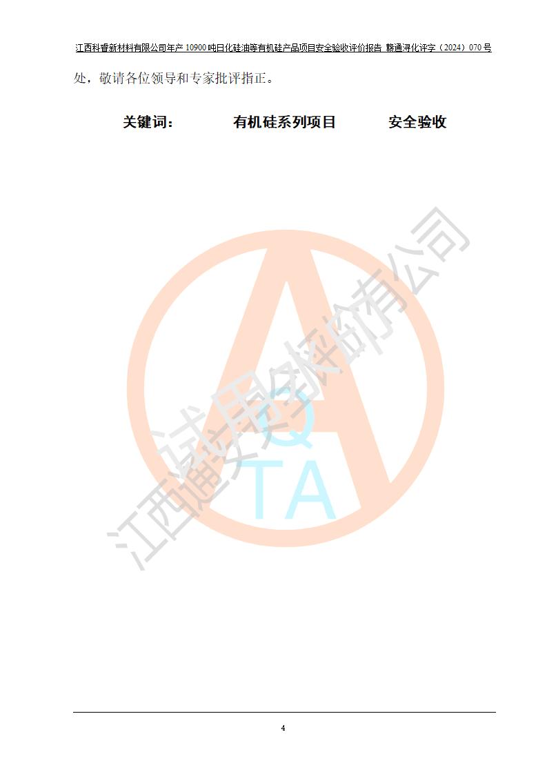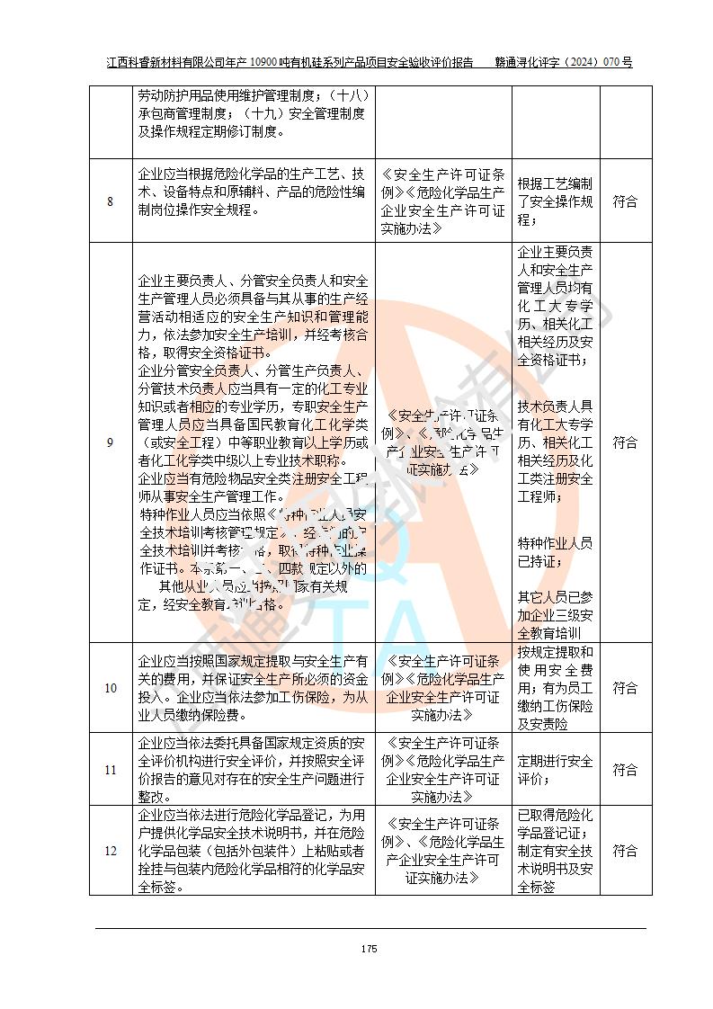 評價報告名稱 | 江西科睿新材料有限公司年產(chǎn)12900噸日化硅油等有機(jī)硅系列產(chǎn)品項(xiàng)目 (一期:年產(chǎn)10900噸日化硅油等有機(jī)硅系列)安全驗(yàn)收評價 | |||||