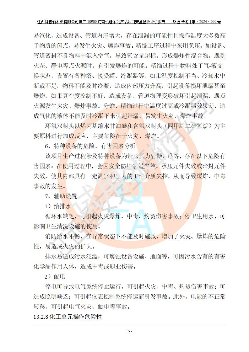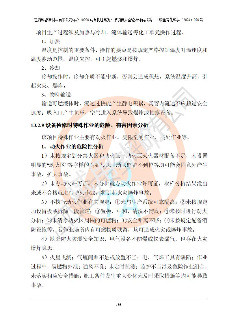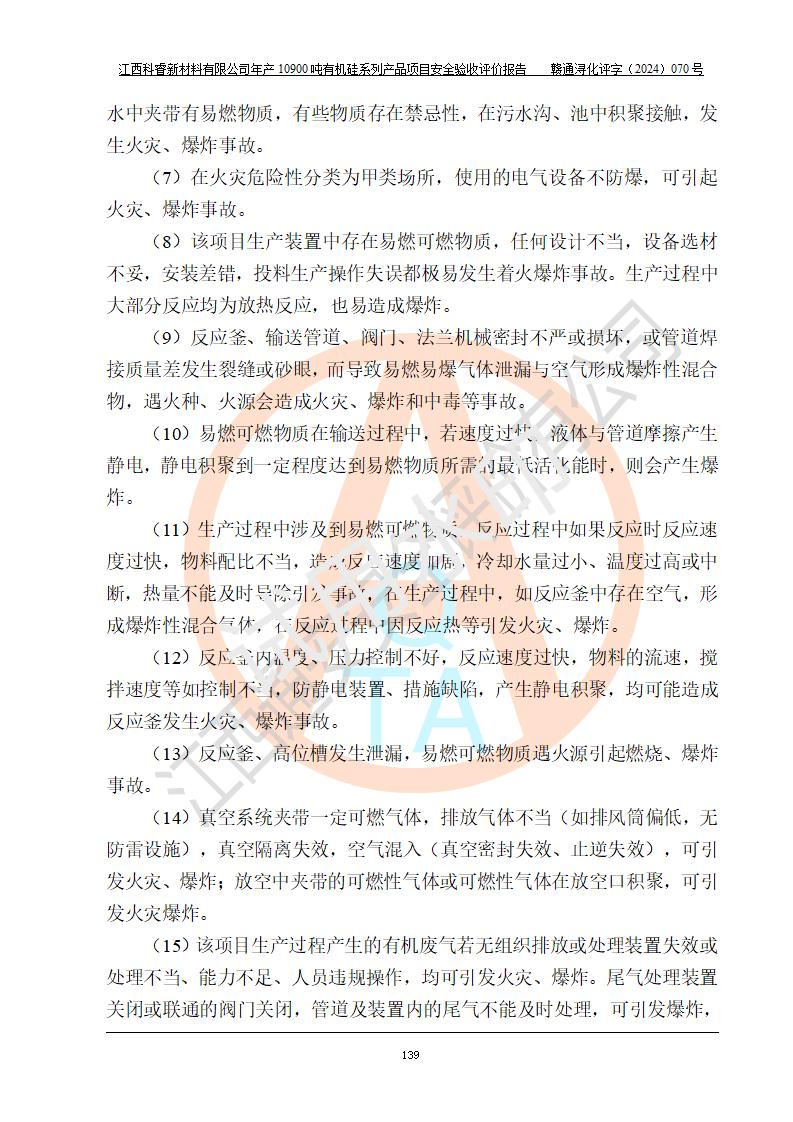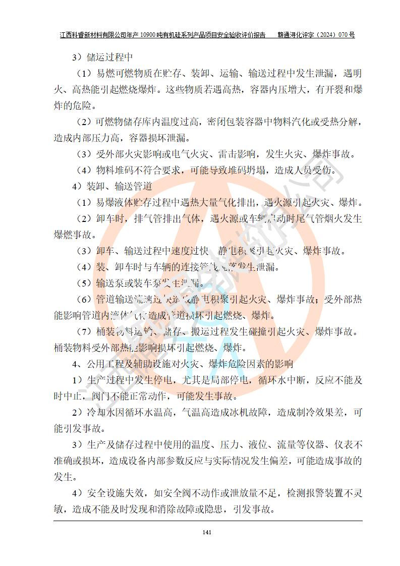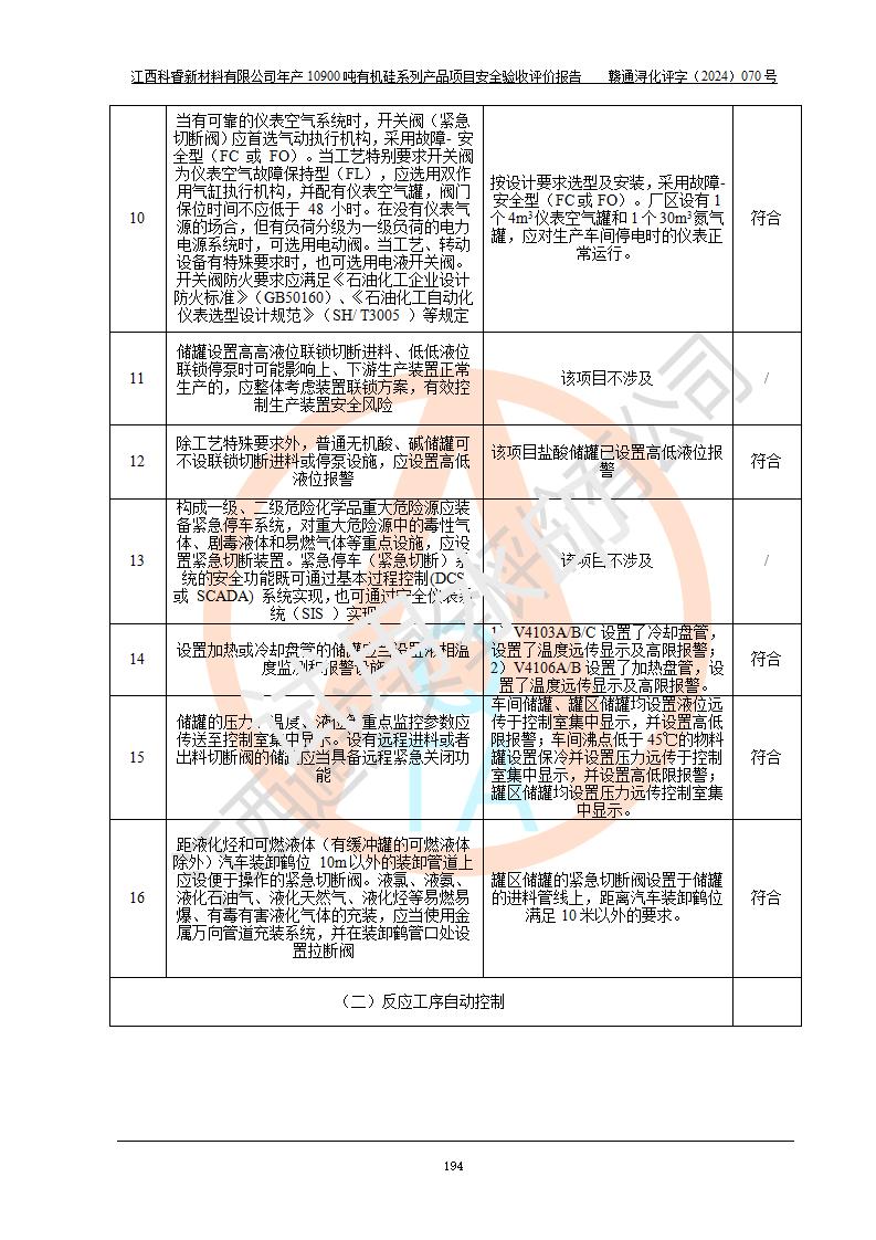 評價結(jié)論 | 經(jīng)評價組評價,江西科睿新材料有限公司年產(chǎn)12900噸日化硅油等有機(jī)硅系列產(chǎn)品項(xiàng)目(一期:年產(chǎn)10900噸日化硅油等有機(jī)硅系列)總平面布置、選擇的工藝、現(xiàn)場設(shè)備布置情況與安全設(shè)施設(shè)計(jì)一致,該項(xiàng)目尾氣中的甲醇、二甲醚(不涉及儲存)屬于重點(diǎn)監(jiān)管的危險化學(xué)品,不涉及重點(diǎn)監(jiān)管的危險工藝、重大危險源,已按設(shè)計(jì)要求設(shè)置有DCS系統(tǒng)、GDS系統(tǒng),符合《江西省應(yīng)急管理廳關(guān)于印發(fā)《江西省化工企業(yè)自動化提升實(shí)施方案》(試行)的通知 》,符合《危險化學(xué)品生產(chǎn)企業(yè)安全生產(chǎn)許可證實(shí)施辦法》、《危險化學(xué)品生產(chǎn)建設(shè)項(xiàng)目安全風(fēng)險防控指南(試行)》規(guī)定竣工驗(yàn)收的安全條件;企業(yè)主要負(fù)責(zé)人、安全管理部門負(fù)責(zé)人均為化學(xué)、化工相關(guān)專業(yè),且有3年以上化工行業(yè)從業(yè)經(jīng)歷,配備有化工類注冊安全工程師,企業(yè)主要負(fù)責(zé)人及安全管理人員已取得危險化學(xué)品企業(yè)主要負(fù)責(zé)人及安全管理人員考核合格證。 項(xiàng)目運(yùn)行后存在的主要危險、有害因素有:火災(zāi)、其他爆炸、中毒與窒息等;存在的主要有害因素有化學(xué)物質(zhì)危害、高溫等;針對存在的危險、有害因素,企業(yè)采取了**的安全技術(shù)措施及安全管理措施,符合**有關(guān)法規(guī)、標(biāo)準(zhǔn)、規(guī)范要求;項(xiàng)目風(fēng)險可控,其安全生產(chǎn)條件和安全管理方面具備竣工安全驗(yàn)收的條件。 | |||||