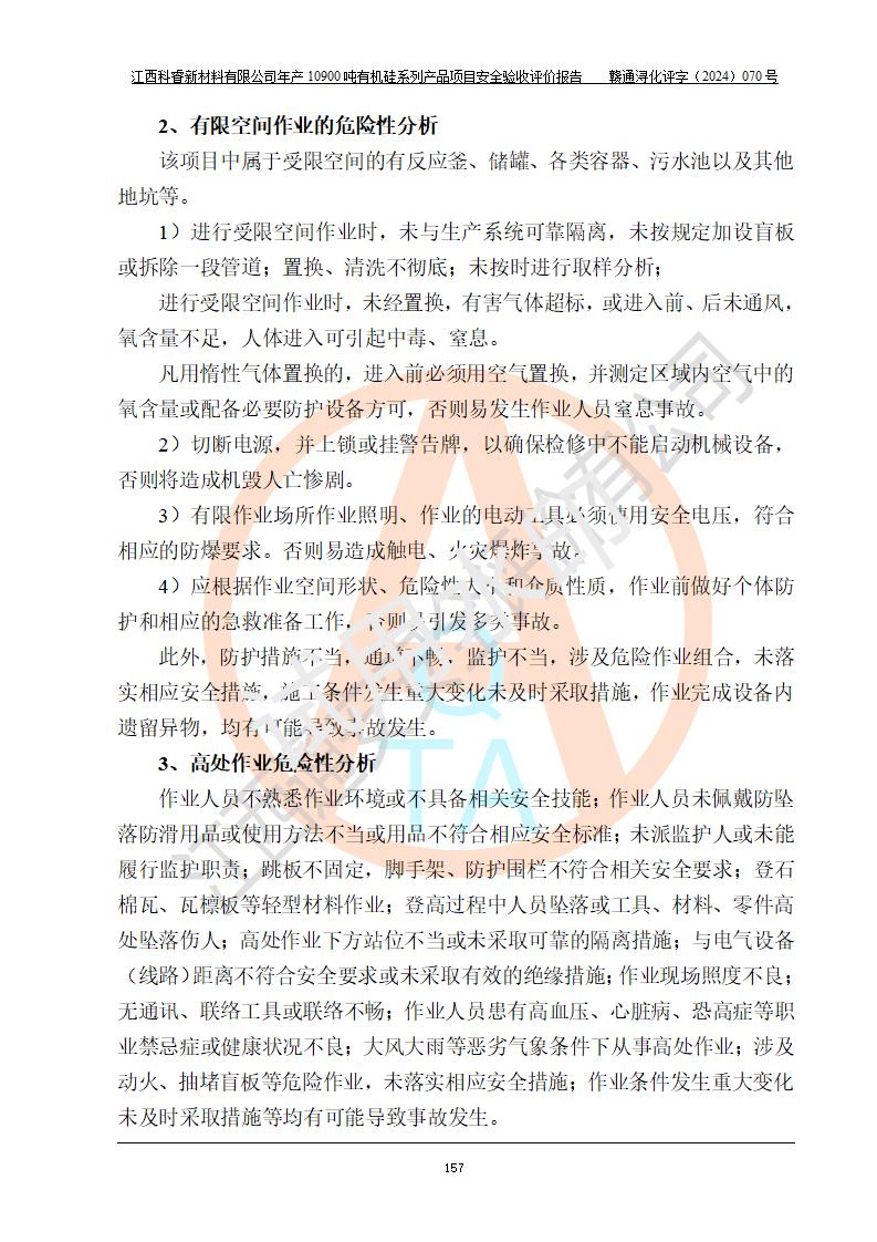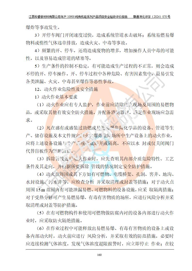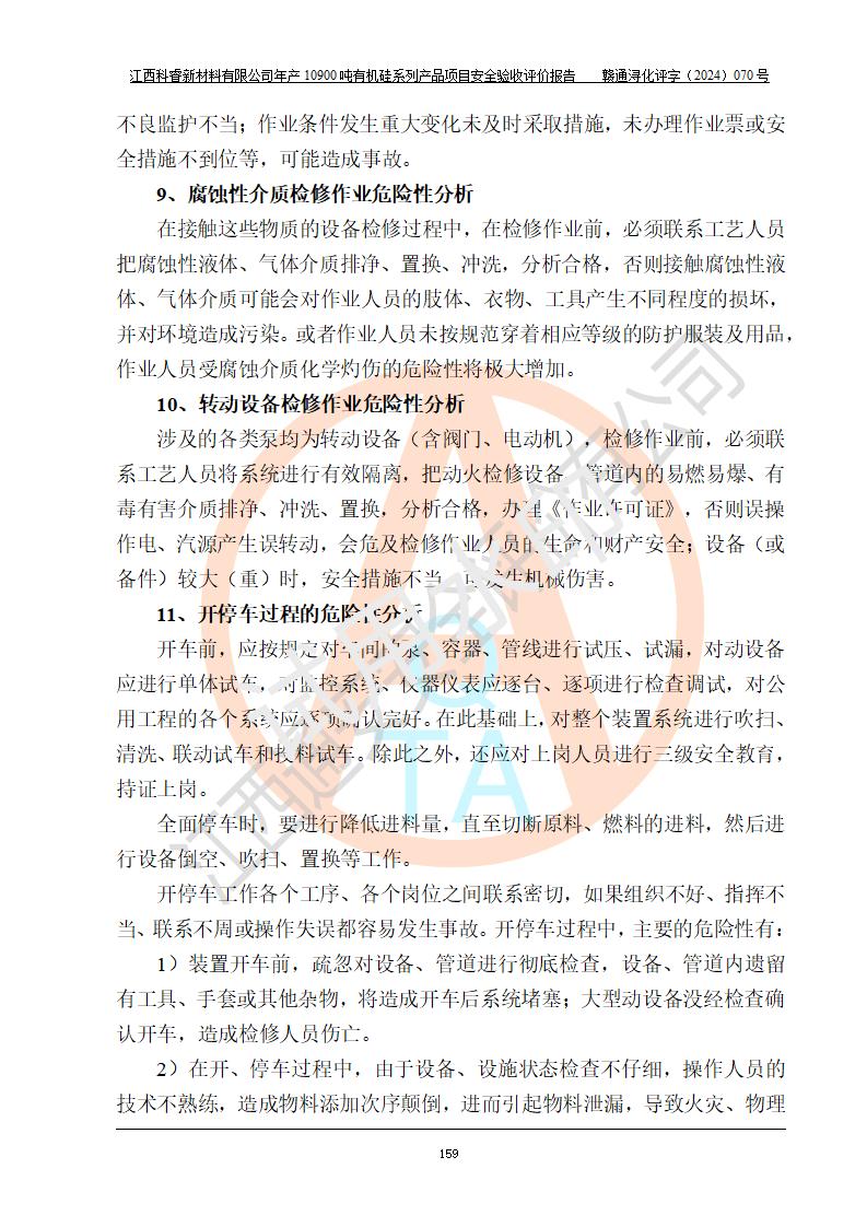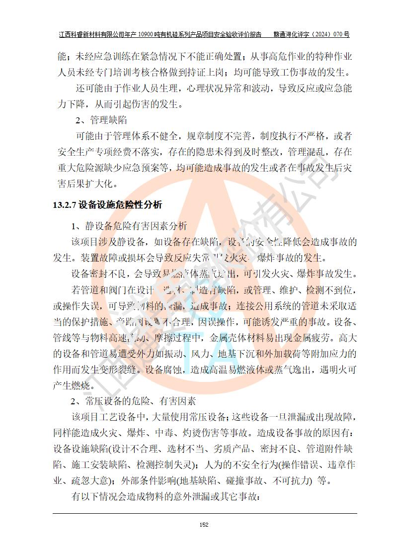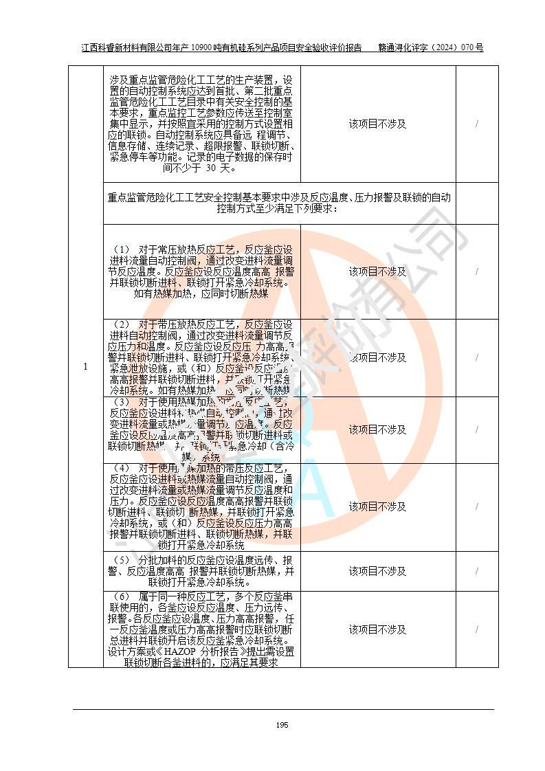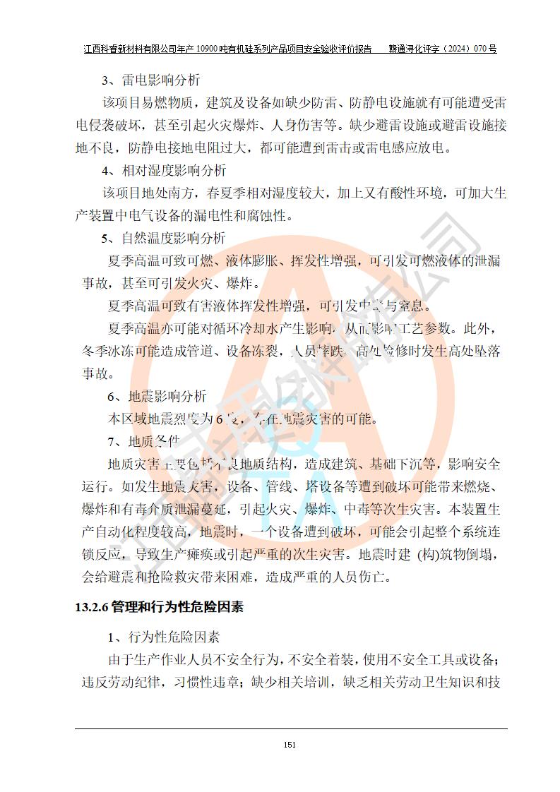 評價結(jié)論 | 經(jīng)評價組評價,江西科睿新材料有限公司年產(chǎn)12900噸日化硅油等有機(jī)硅系列產(chǎn)品項(xiàng)目(一期:年產(chǎn)10900噸日化硅油等有機(jī)硅系列)總平面布置、選擇的工藝、現(xiàn)場設(shè)備布置情況與安全設(shè)施設(shè)計(jì)一致,該項(xiàng)目尾氣中的甲醇、二甲醚(不涉及儲存)屬于重點(diǎn)監(jiān)管的危險化學(xué)品,不涉及重點(diǎn)監(jiān)管的危險工藝、重大危險源,已按設(shè)計(jì)要求設(shè)置有DCS系統(tǒng)、GDS系統(tǒng),符合《江西省應(yīng)急管理廳關(guān)于印發(fā)《江西省化工企業(yè)自動化提升實(shí)施方案》(試行)的通知 》,符合《危險化學(xué)品生產(chǎn)企業(yè)安全生產(chǎn)許可證實(shí)施辦法》、《危險化學(xué)品生產(chǎn)建設(shè)項(xiàng)目安全風(fēng)險防控指南(試行)》規(guī)定竣工驗(yàn)收的安全條件;企業(yè)主要負(fù)責(zé)人、安全管理部門負(fù)責(zé)人均為化學(xué)、化工相關(guān)專業(yè),且有3年以上化工行業(yè)從業(yè)經(jīng)歷,配備有化工類注冊安全工程師,企業(yè)主要負(fù)責(zé)人及安全管理人員已取得危險化學(xué)品企業(yè)主要負(fù)責(zé)人及安全管理人員考核合格證。 項(xiàng)目運(yùn)行后存在的主要危險、有害因素有:火災(zāi)、其他爆炸、中毒與窒息等;存在的主要有害因素有化學(xué)物質(zhì)危害、高溫等;針對存在的危險、有害因素,企業(yè)采取了**的安全技術(shù)措施及安全管理措施,符合**有關(guān)法規(guī)、標(biāo)準(zhǔn)、規(guī)范要求;項(xiàng)目風(fēng)險可控,其安全生產(chǎn)條件和安全管理方面具備竣工安全驗(yàn)收的條件。 | |||||