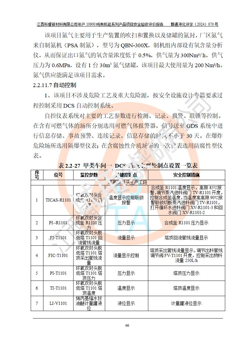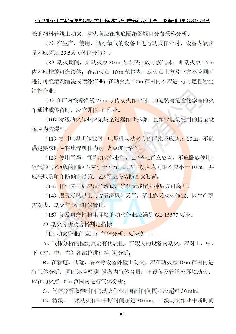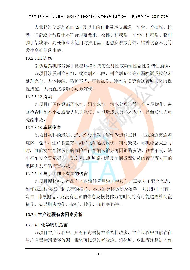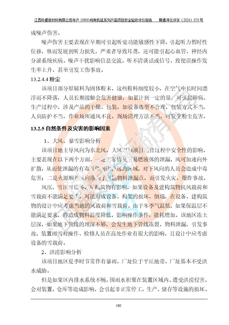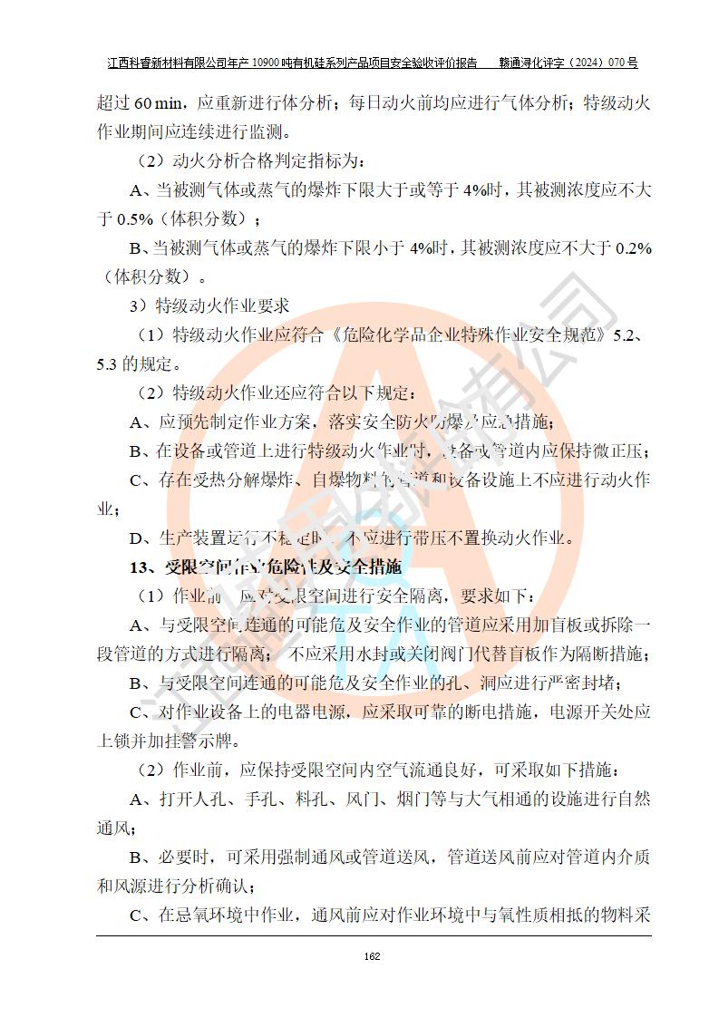 評價結(jié)論 | 經(jīng)評價組評價,江西科睿新材料有限公司年產(chǎn)12900噸日化硅油等有機(jī)硅系列產(chǎn)品項(xiàng)目(一期:年產(chǎn)10900噸日化硅油等有機(jī)硅系列)總平面布置、選擇的工藝、現(xiàn)場設(shè)備布置情況與安全設(shè)施設(shè)計(jì)一致,該項(xiàng)目尾氣中的甲醇、二甲醚(不涉及儲存)屬于重點(diǎn)監(jiān)管的危險化學(xué)品,不涉及重點(diǎn)監(jiān)管的危險工藝、重大危險源,已按設(shè)計(jì)要求設(shè)置有DCS系統(tǒng)、GDS系統(tǒng),符合《江西省應(yīng)急管理廳關(guān)于印發(fā)《江西省化工企業(yè)自動化提升實(shí)施方案》(試行)的通知 》,符合《危險化學(xué)品生產(chǎn)企業(yè)安全生產(chǎn)許可證實(shí)施辦法》、《危險化學(xué)品生產(chǎn)建設(shè)項(xiàng)目安全風(fēng)險防控指南(試行)》規(guī)定竣工驗(yàn)收的安全條件;企業(yè)主要負(fù)責(zé)人、安全管理部門負(fù)責(zé)人均為化學(xué)、化工相關(guān)專業(yè),且有3年以上化工行業(yè)從業(yè)經(jīng)歷,配備有化工類注冊安全工程師,企業(yè)主要負(fù)責(zé)人及安全管理人員已取得危險化學(xué)品企業(yè)主要負(fù)責(zé)人及安全管理人員考核合格證。 項(xiàng)目運(yùn)行后存在的主要危險、有害因素有:火災(zāi)、其他爆炸、中毒與窒息等;存在的主要有害因素有化學(xué)物質(zhì)危害、高溫等;針對存在的危險、有害因素,企業(yè)采取了**的安全技術(shù)措施及安全管理措施,符合**有關(guān)法規(guī)、標(biāo)準(zhǔn)、規(guī)范要求;項(xiàng)目風(fēng)險可控,其安全生產(chǎn)條件和安全管理方面具備竣工安全驗(yàn)收的條件。 | |||||