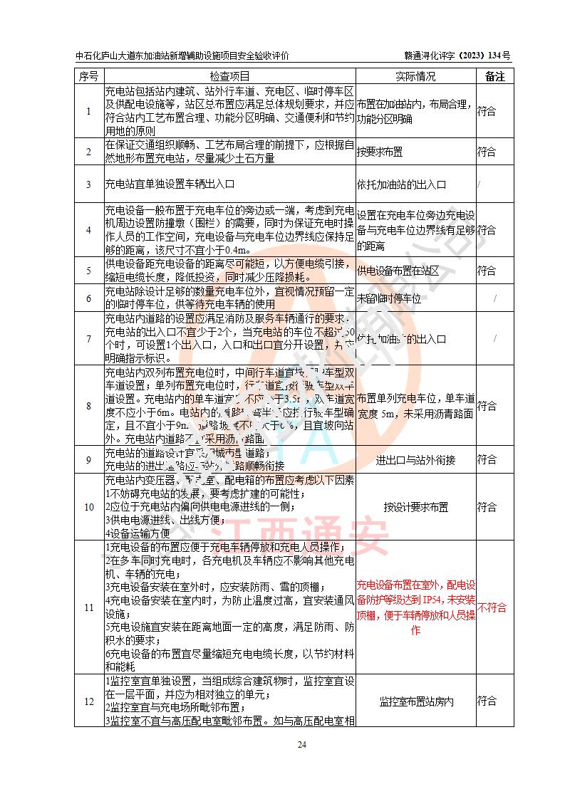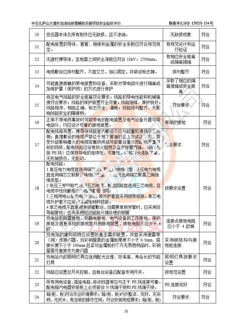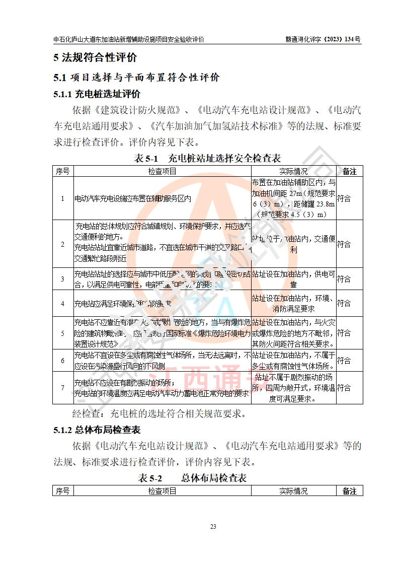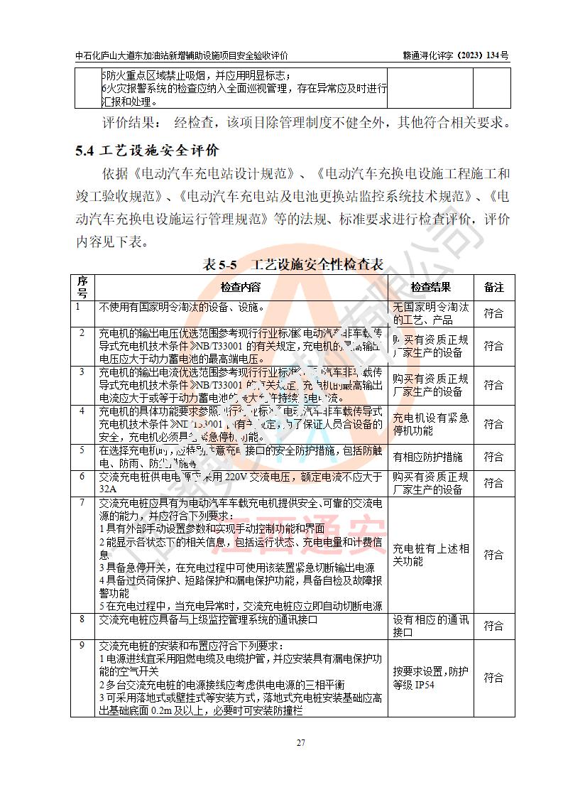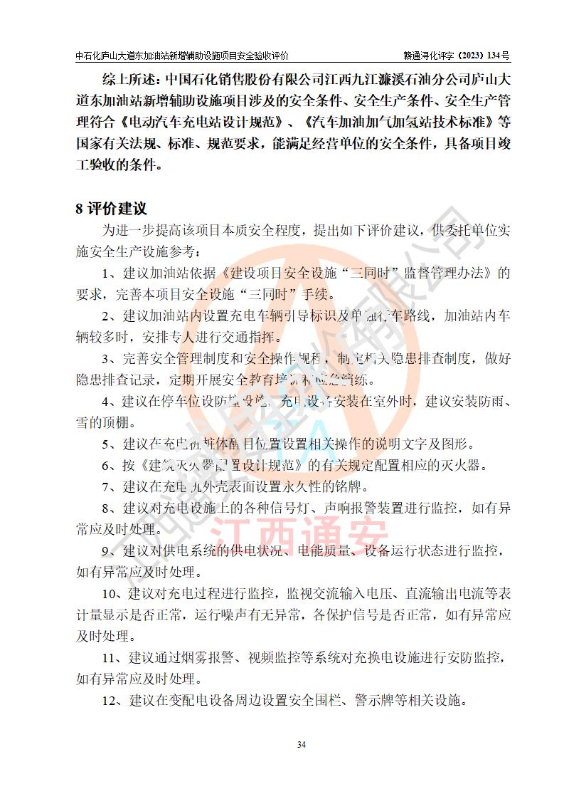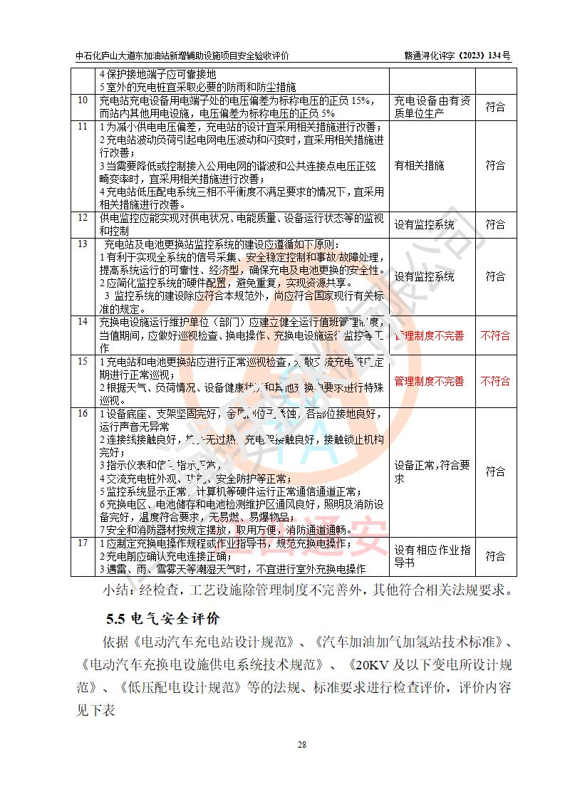 評(píng)價(jià)結(jié)論 | 中國石化銷售股份有限公司江西九江濂溪石油分公司廬山大道東加油站新增輔助設(shè)施項(xiàng)目涉及的安全條件、安全生產(chǎn)條件、安全生產(chǎn)管理符合《電動(dòng)汽車充電站設(shè)計(jì)規(guī)范》、《汽車加油加氣加氫站技術(shù)標(biāo)準(zhǔn)》等**有關(guān)法規(guī)、標(biāo)準(zhǔn)、規(guī)范要求,能滿足經(jīng)營(yíng)單位的安全條件,具備項(xiàng)目竣工驗(yàn)收的條件。 | |||