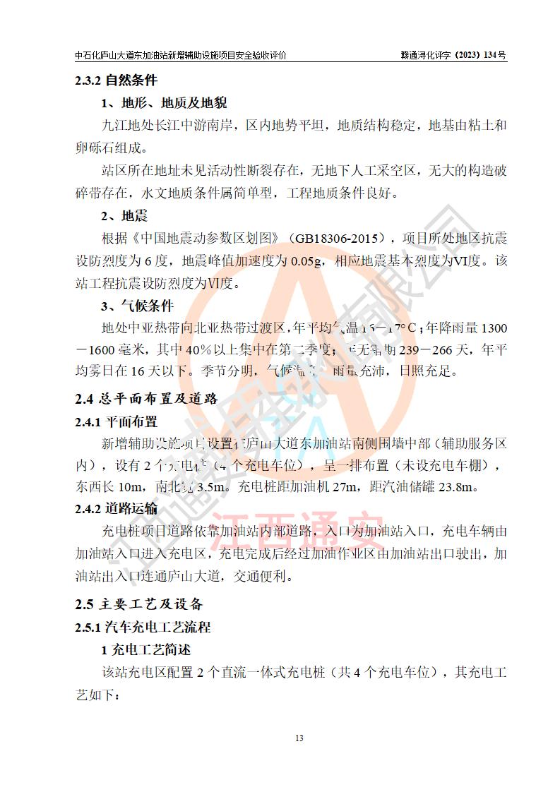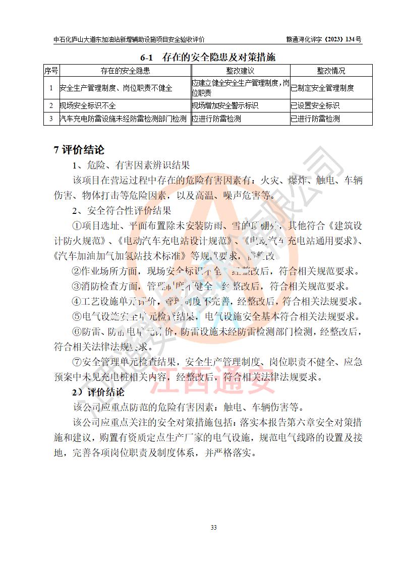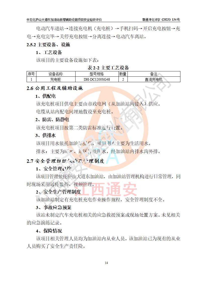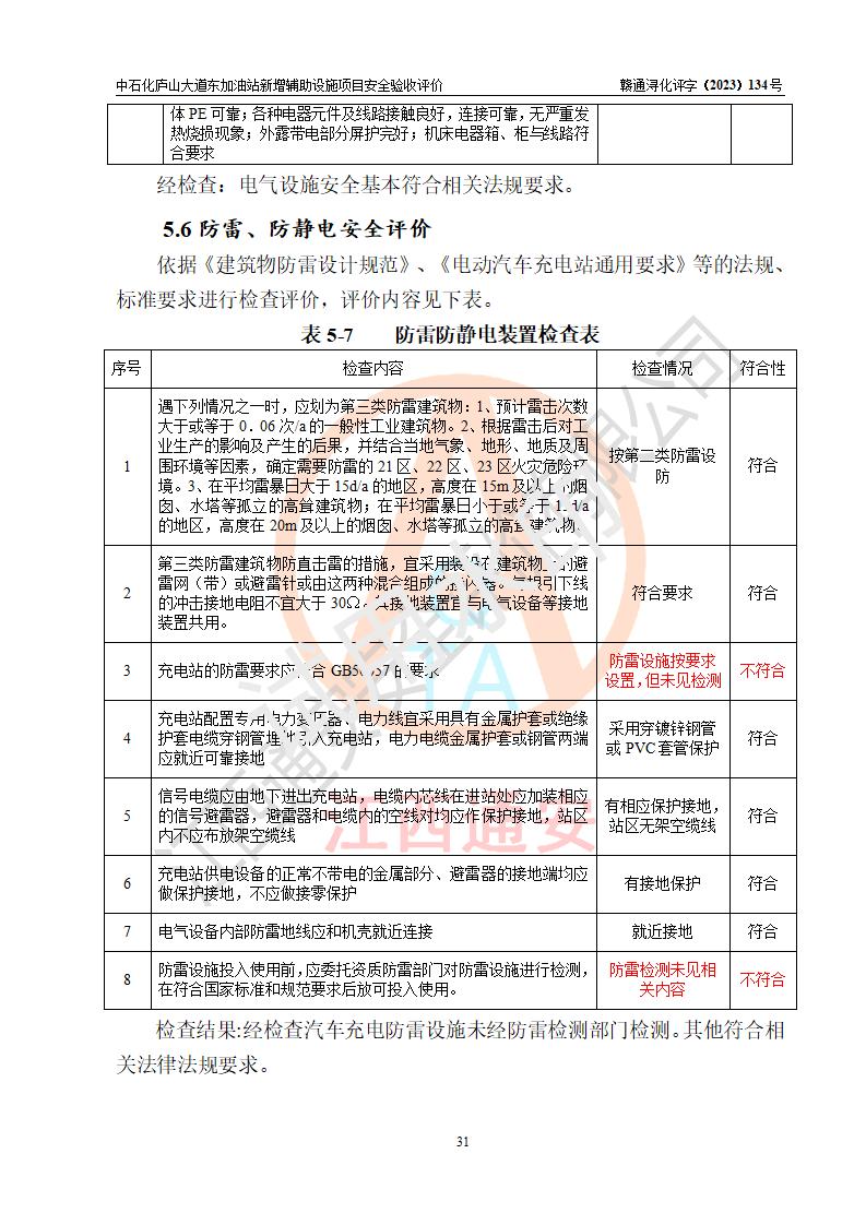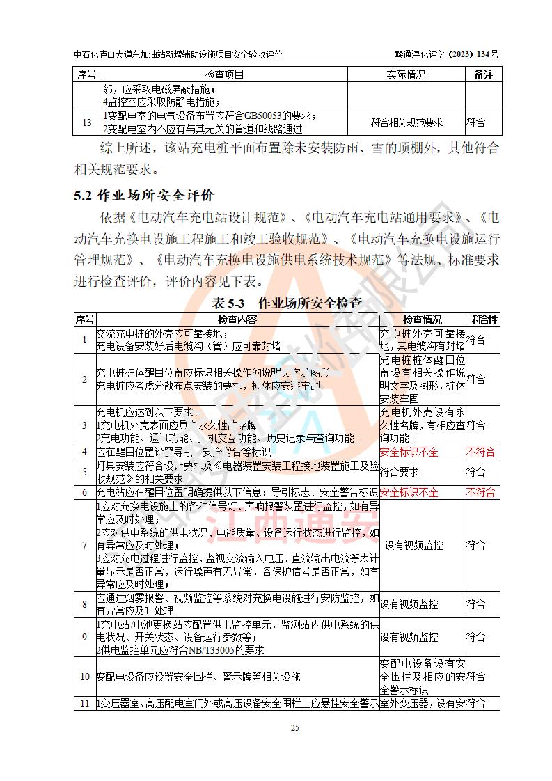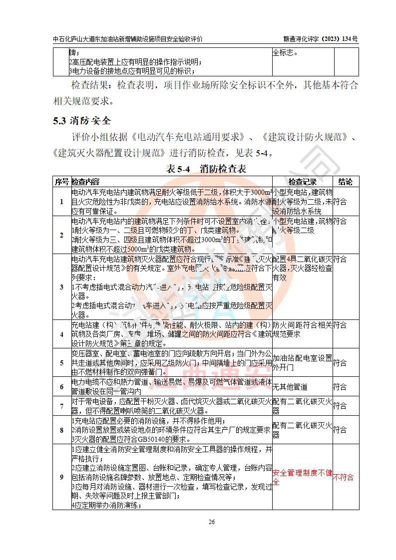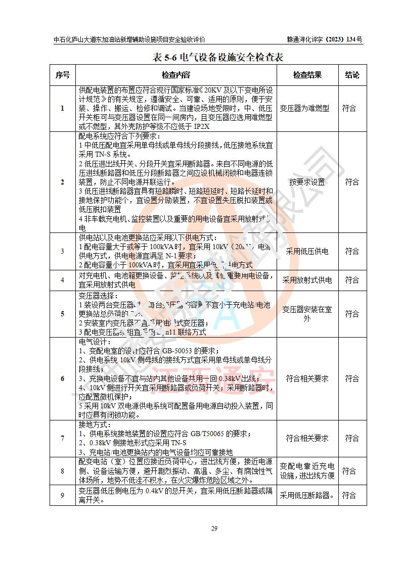 評(píng)價(jià)結(jié)論 | 中國石化銷售股份有限公司江西九江濂溪石油分公司廬山大道東加油站新增輔助設(shè)施項(xiàng)目涉及的安全條件、安全生產(chǎn)條件、安全生產(chǎn)管理符合《電動(dòng)汽車充電站設(shè)計(jì)規(guī)范》、《汽車加油加氣加氫站技術(shù)標(biāo)準(zhǔn)》等**有關(guān)法規(guī)、標(biāo)準(zhǔn)、規(guī)范要求,能滿足經(jīng)營(yíng)單位的安全條件,具備項(xiàng)目竣工驗(yàn)收的條件。 | |||
