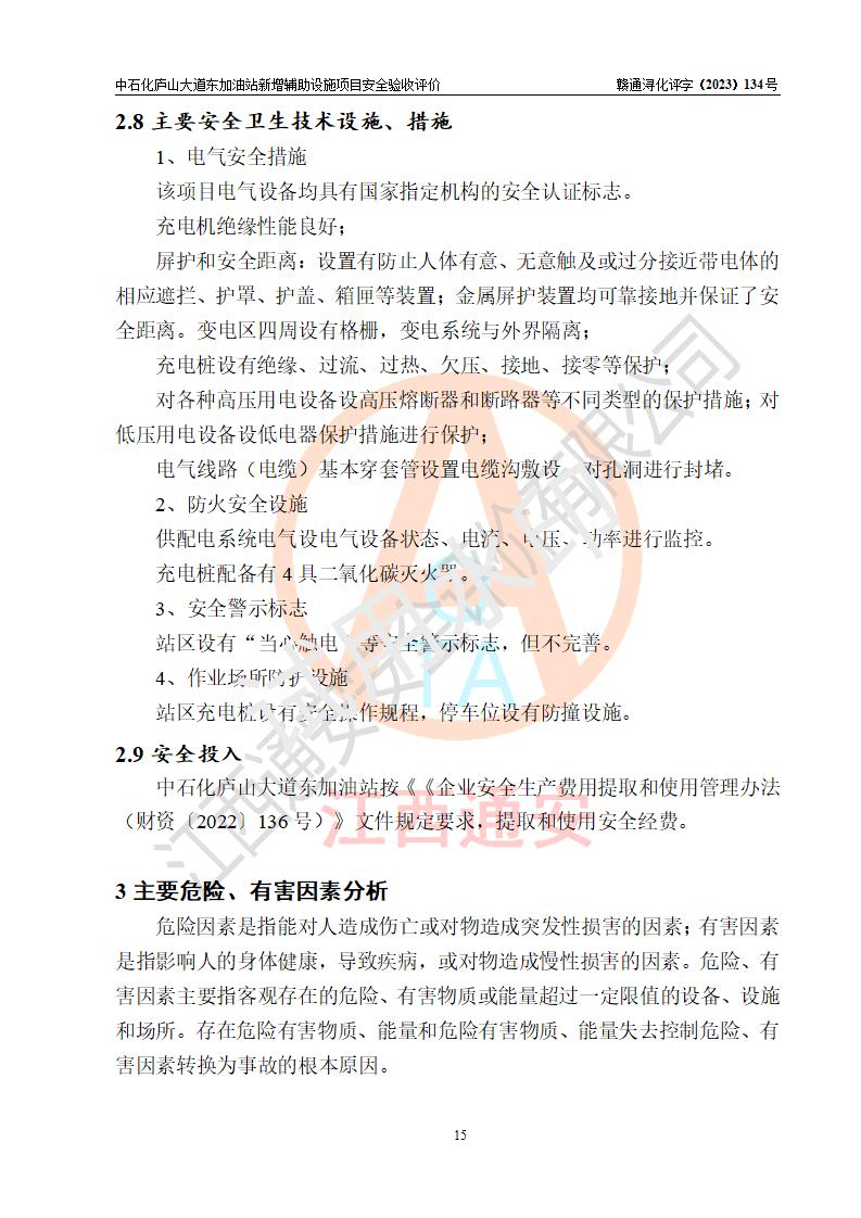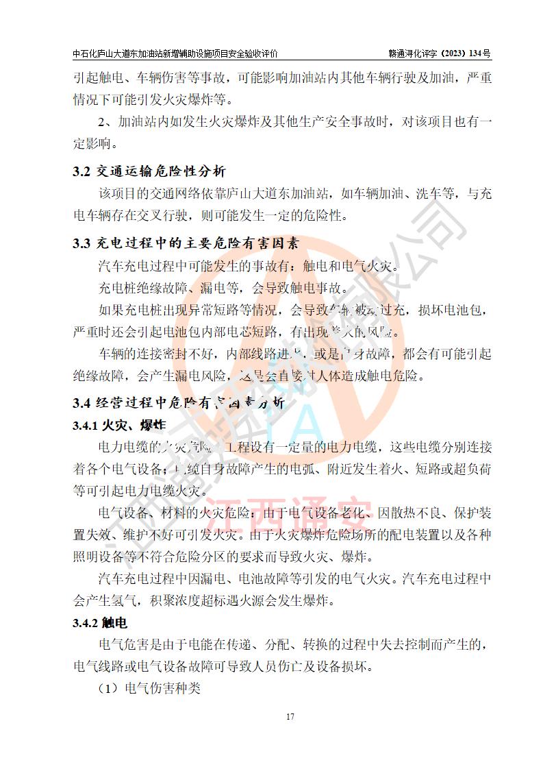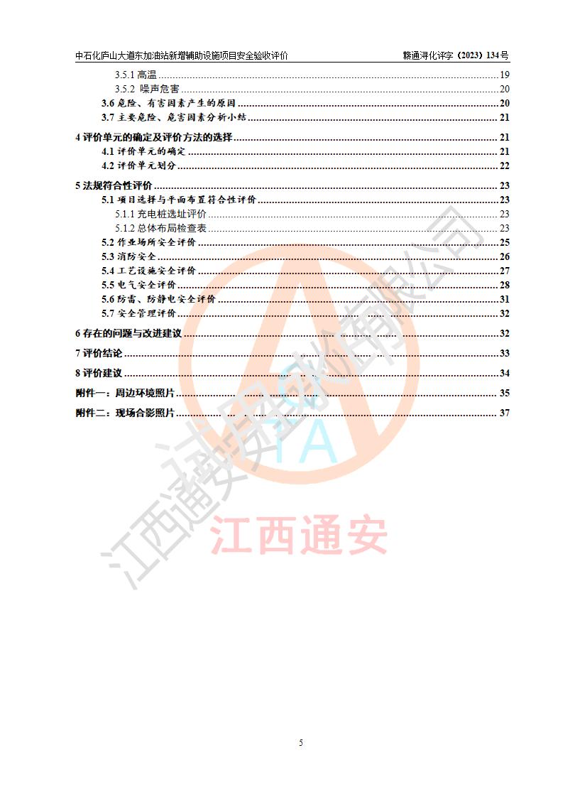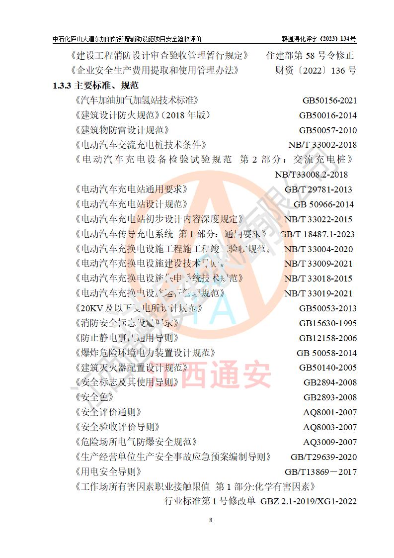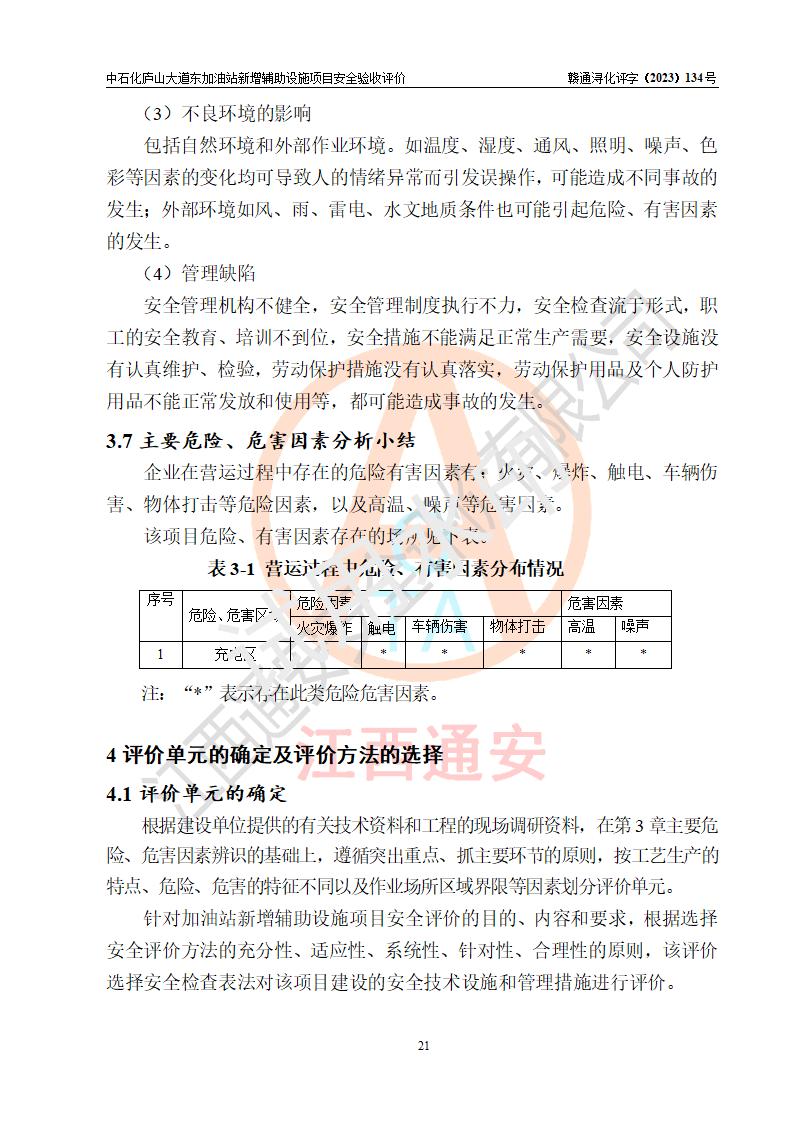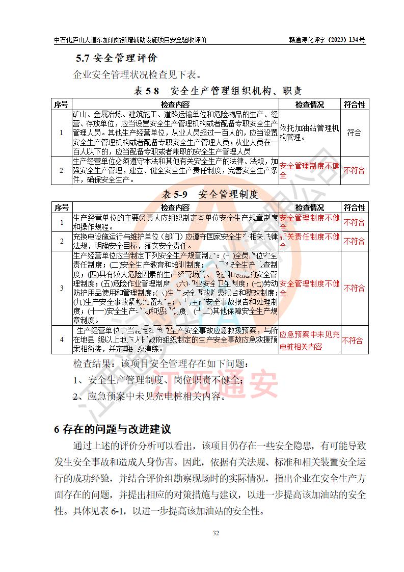 評(píng)價(jià)結(jié)論 | 中國石化銷售股份有限公司江西九江濂溪石油分公司廬山大道東加油站新增輔助設(shè)施項(xiàng)目涉及的安全條件、安全生產(chǎn)條件、安全生產(chǎn)管理符合《電動(dòng)汽車充電站設(shè)計(jì)規(guī)范》、《汽車加油加氣加氫站技術(shù)標(biāo)準(zhǔn)》等**有關(guān)法規(guī)、標(biāo)準(zhǔn)、規(guī)范要求,能滿足經(jīng)營(yíng)單位的安全條件,具備項(xiàng)目竣工驗(yàn)收的條件。 | |||