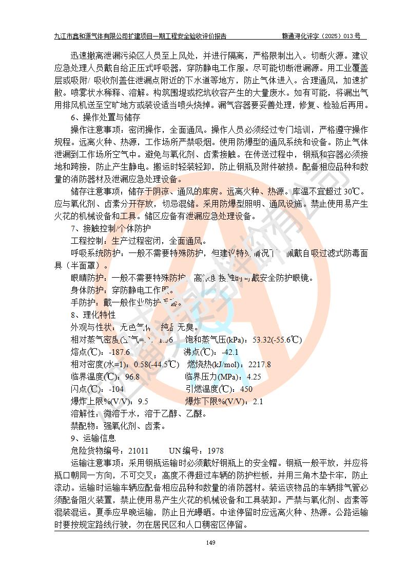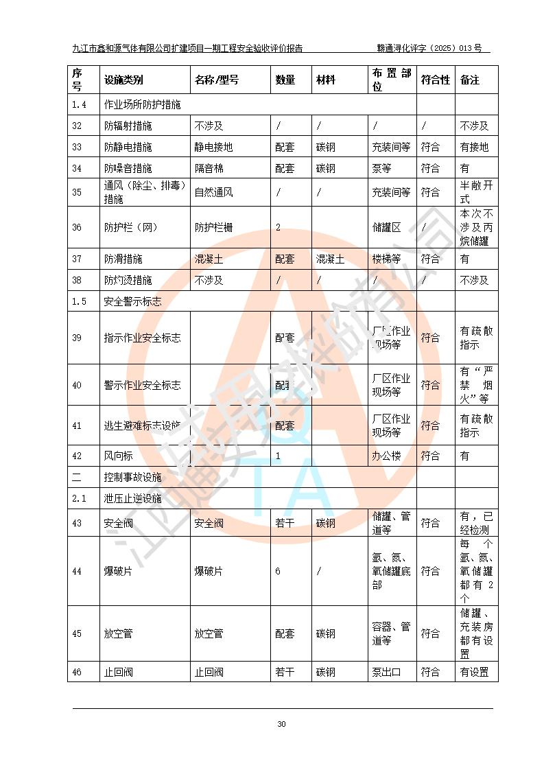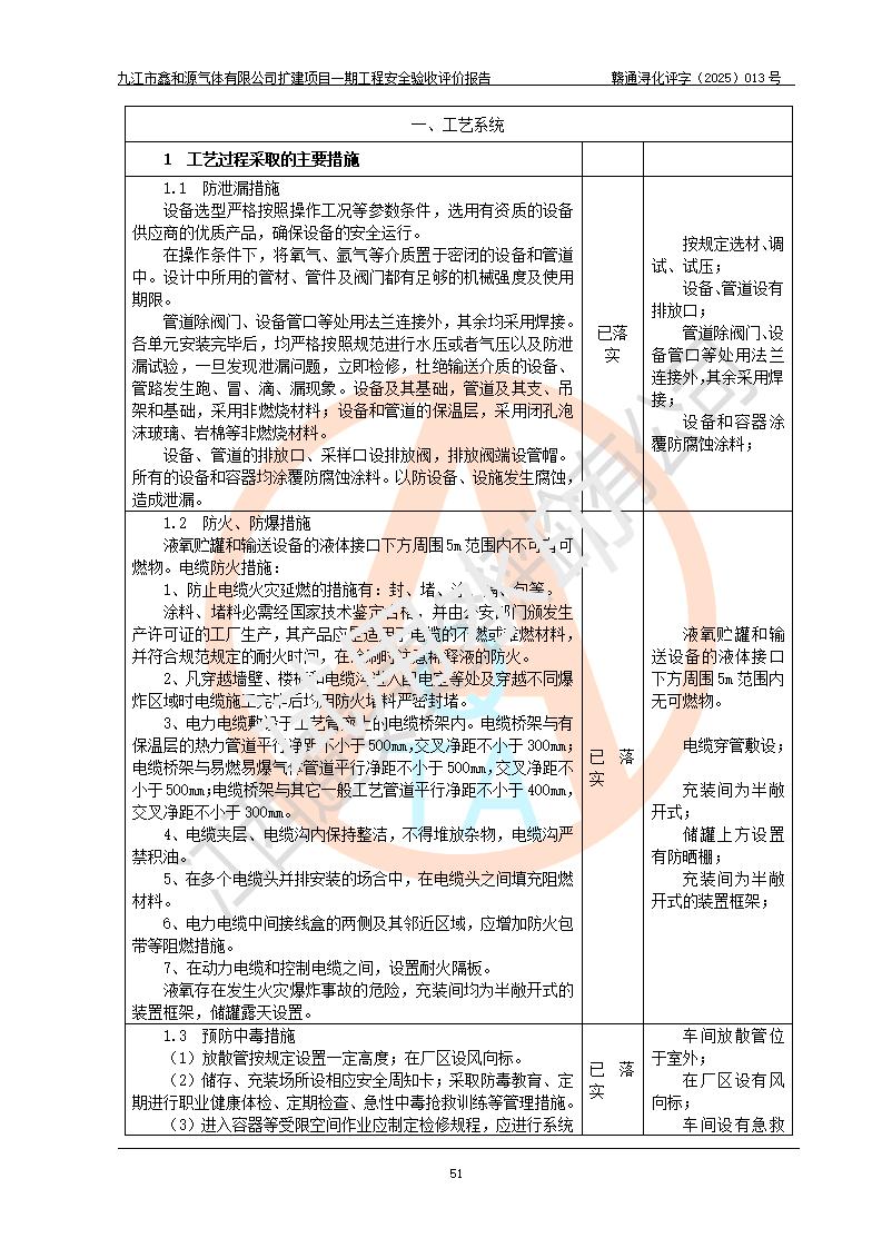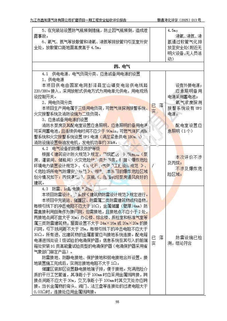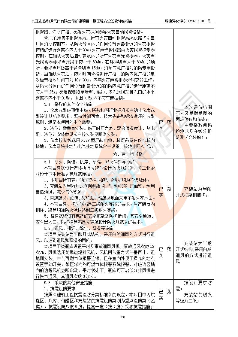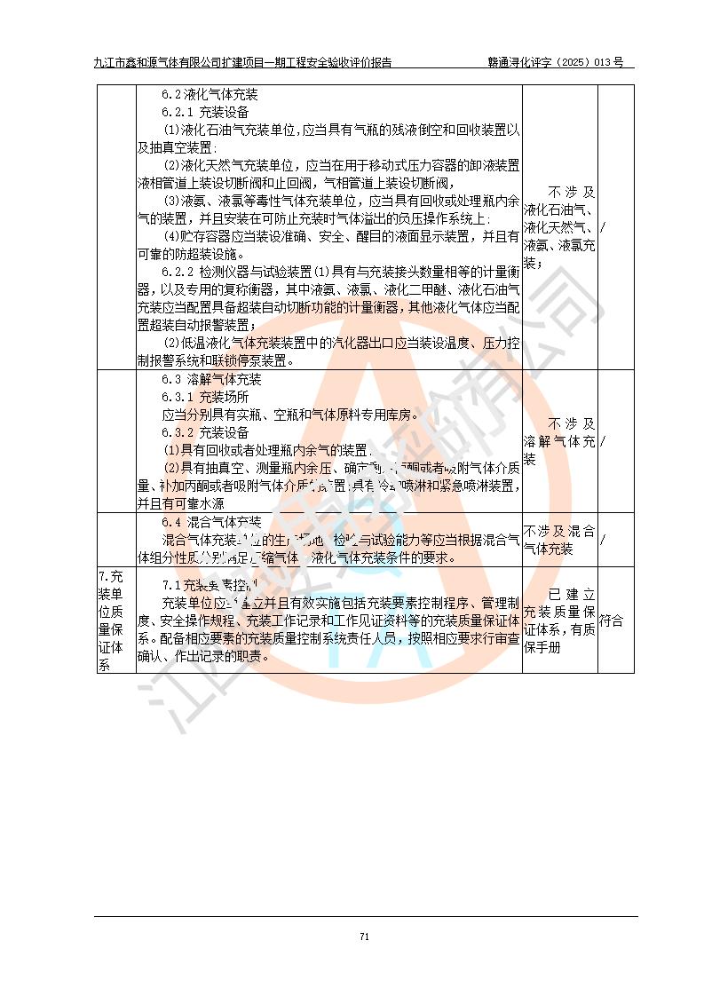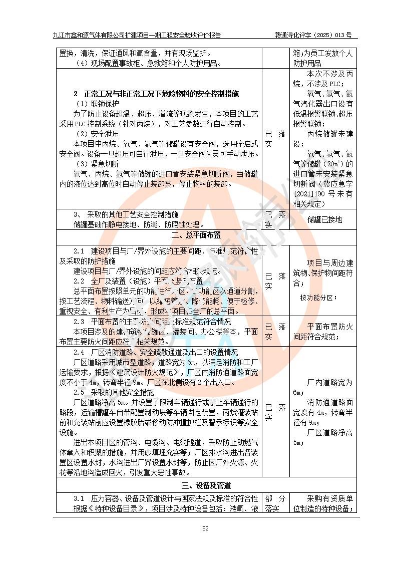 評價結(jié)論 | 經(jīng)評價組評價,九江市鑫和源氣體有限公司擴(kuò)建2×20m3液氬、3×20m3液氮、2×20m3液氧、2×20m3CO2、2×50m3丙烷儲存及充裝項目一期工程總體布局、設(shè)備布置情況與設(shè)計圖紙一致,本次項目(儲存、充裝)不涉及重點監(jiān)管的危險化學(xué)品、危險工藝、重大危險源,按設(shè)計要求施工、安裝;企業(yè)主要負(fù)責(zé)人及安全管理人員已取得危險化學(xué)品企業(yè)安全生產(chǎn)知識和管理能力考核合格證。項目選擇的工藝過程及設(shè)備設(shè)施的安全可靠性能達(dá)到**法規(guī)、標(biāo)準(zhǔn)規(guī)定要求。 項目運(yùn)行后存在的主要危險、有害因素有:火災(zāi)、其他爆炸、容器爆炸、凍傷等;存在的主要有害因素有噪聲等;針對存在的危險、有害因素,企業(yè)采取了**的安全技術(shù)措施及安全管理措施,項目風(fēng)險可控,其安全生產(chǎn)條件和安全管理方面具備竣工安全驗收的條件。 | |||||