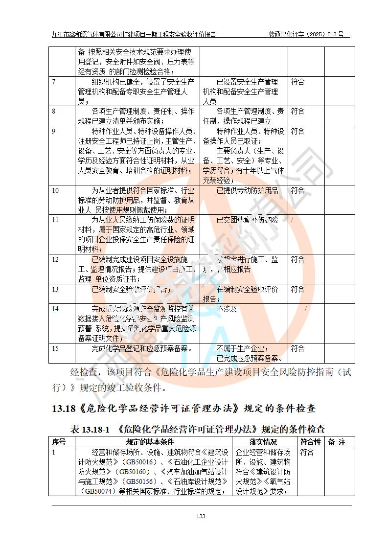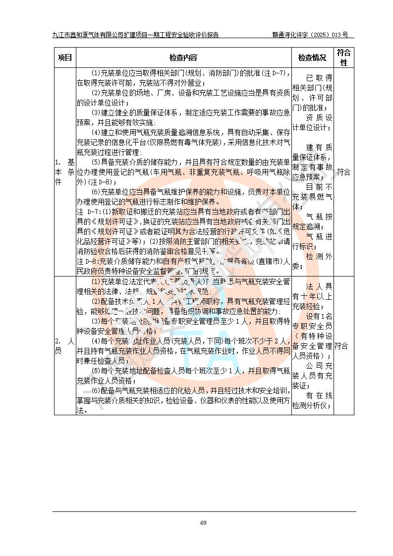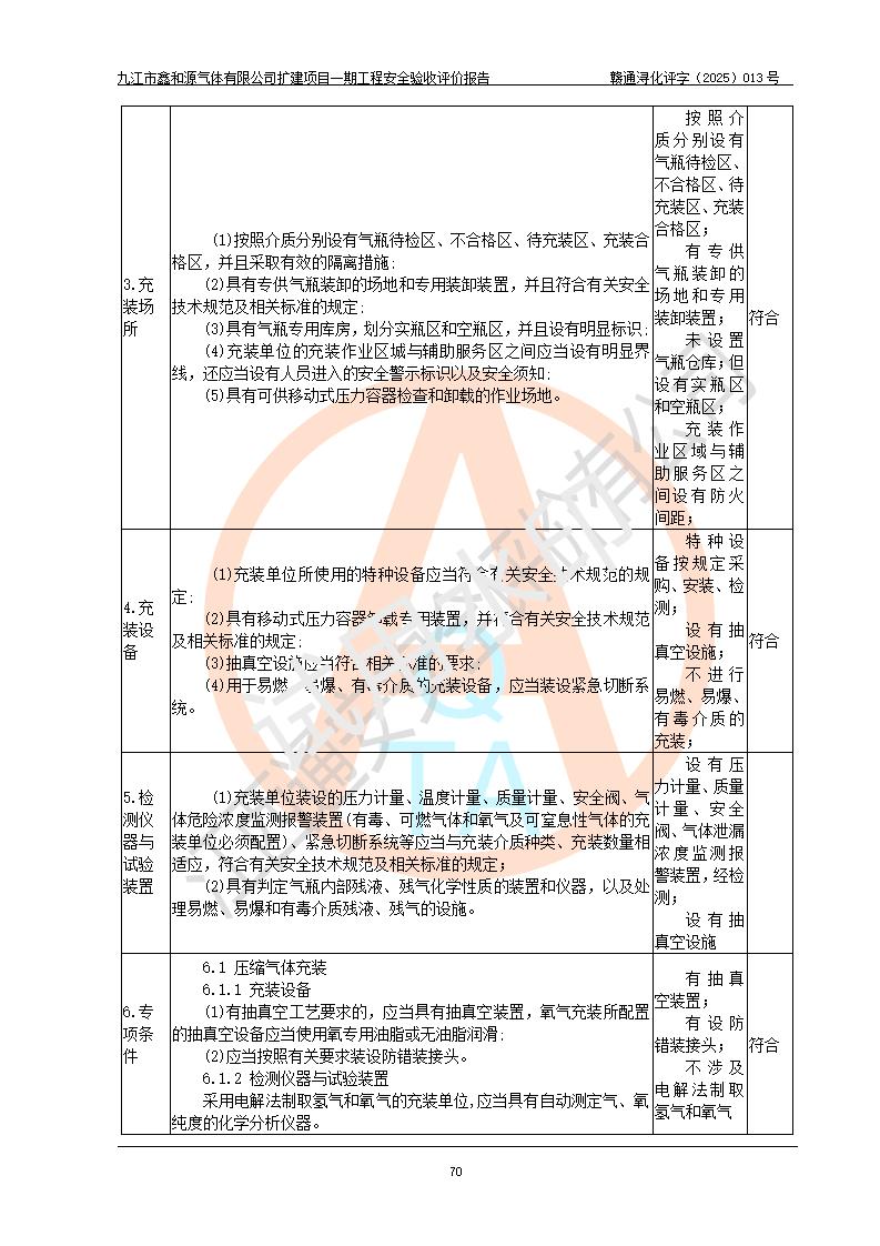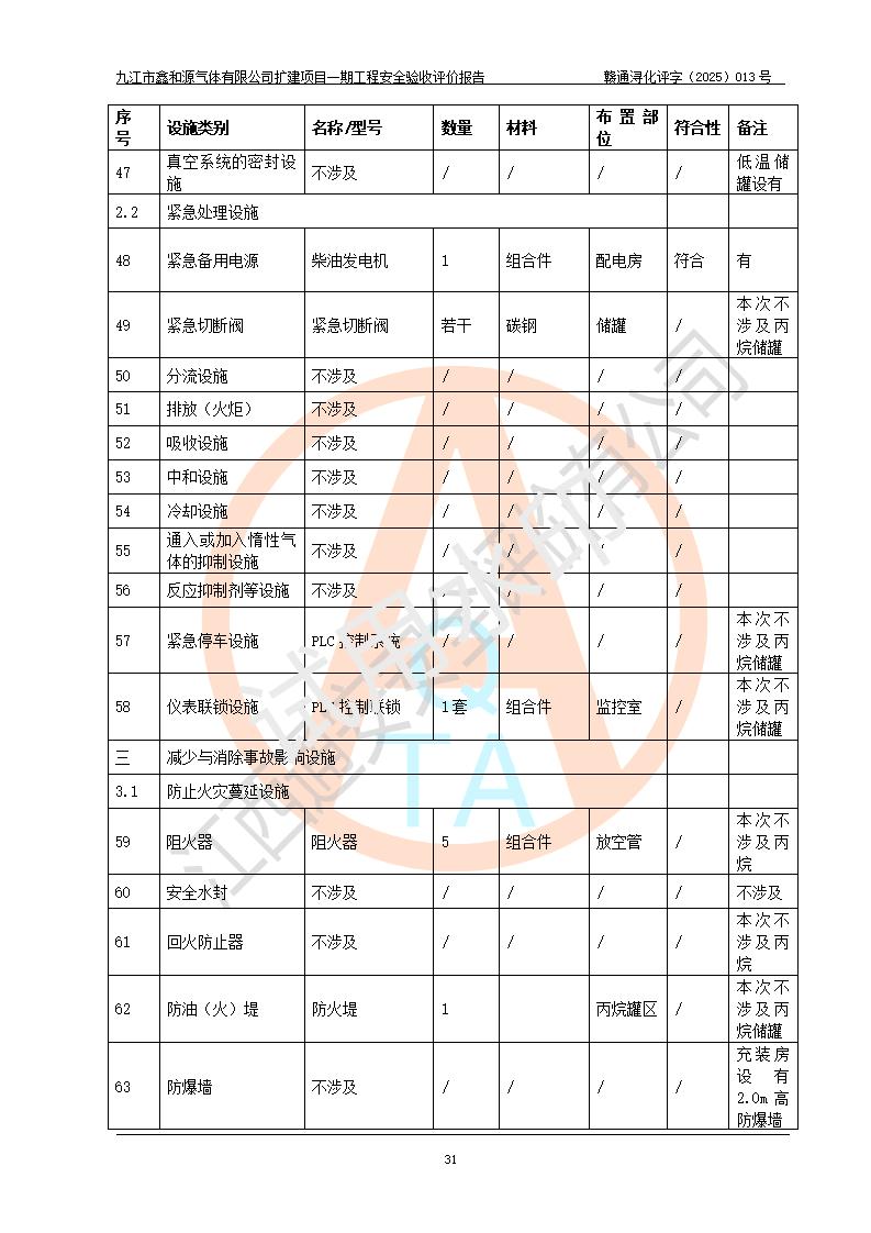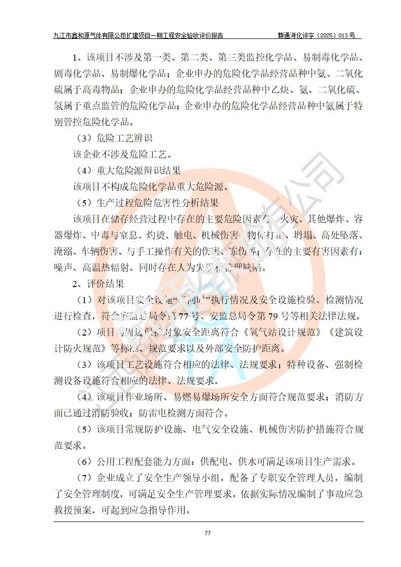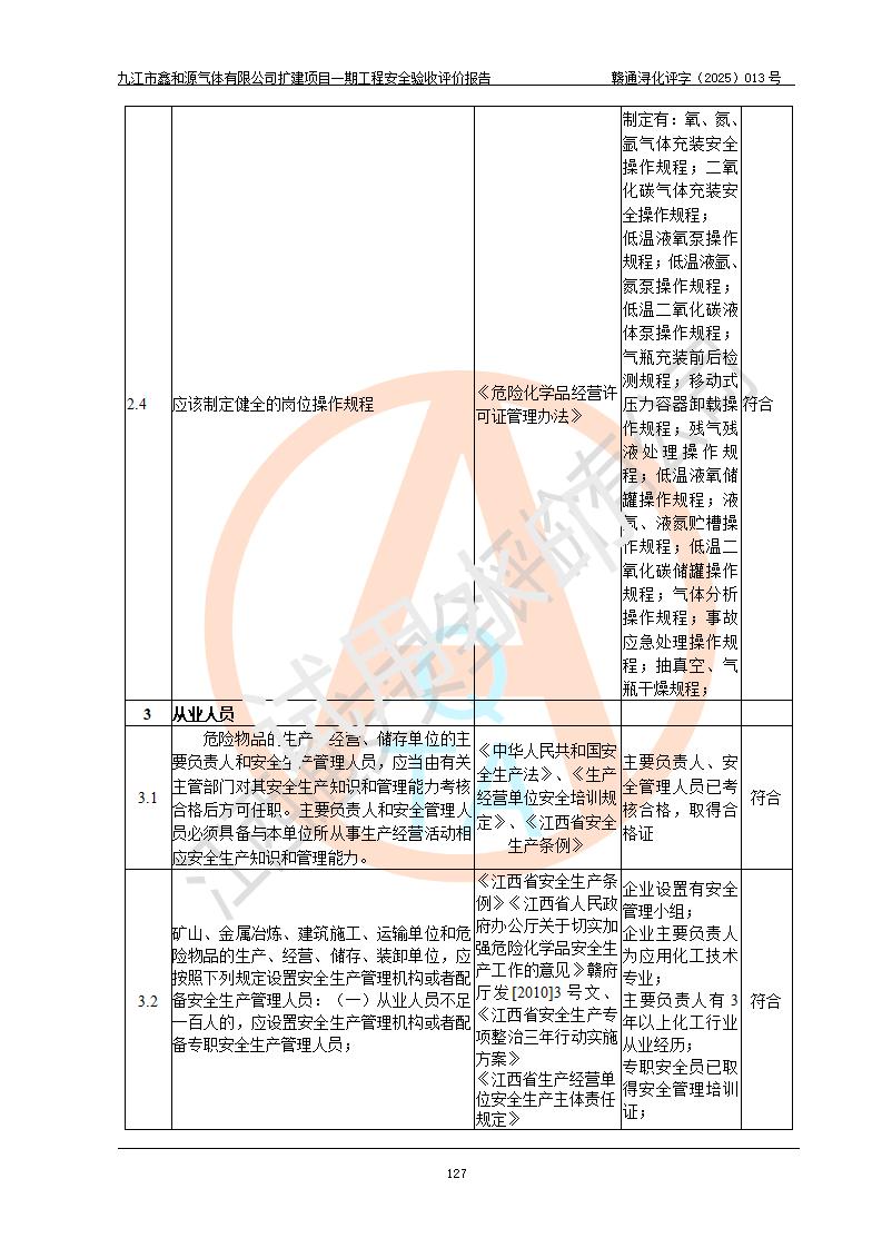 評價結(jié)論 | 經(jīng)評價組評價,九江市鑫和源氣體有限公司擴(kuò)建2×20m3液氬、3×20m3液氮、2×20m3液氧、2×20m3CO2、2×50m3丙烷儲存及充裝項目一期工程總體布局、設(shè)備布置情況與設(shè)計圖紙一致,本次項目(儲存、充裝)不涉及重點監(jiān)管的危險化學(xué)品、危險工藝、重大危險源,按設(shè)計要求施工、安裝;企業(yè)主要負(fù)責(zé)人及安全管理人員已取得危險化學(xué)品企業(yè)安全生產(chǎn)知識和管理能力考核合格證。項目選擇的工藝過程及設(shè)備設(shè)施的安全可靠性能達(dá)到**法規(guī)、標(biāo)準(zhǔn)規(guī)定要求。 項目運(yùn)行后存在的主要危險、有害因素有:火災(zāi)、其他爆炸、容器爆炸、凍傷等;存在的主要有害因素有噪聲等;針對存在的危險、有害因素,企業(yè)采取了**的安全技術(shù)措施及安全管理措施,項目風(fēng)險可控,其安全生產(chǎn)條件和安全管理方面具備竣工安全驗收的條件。 | |||||