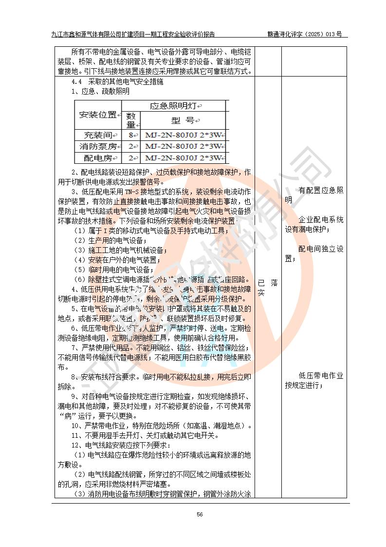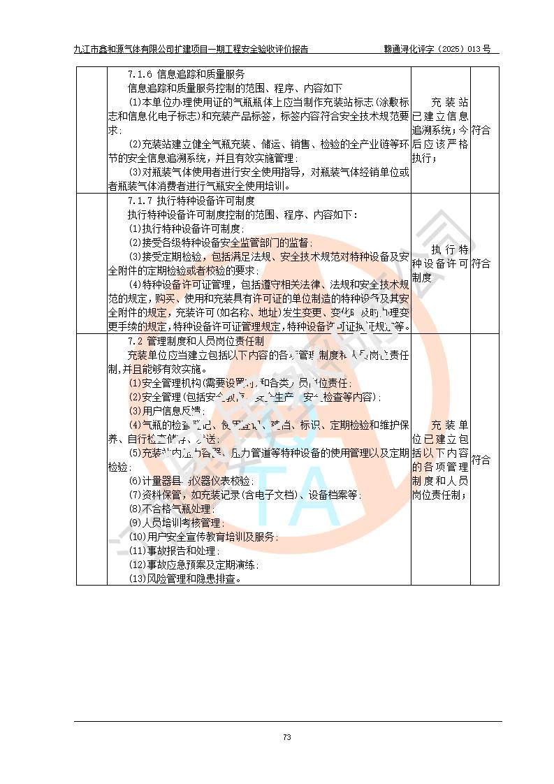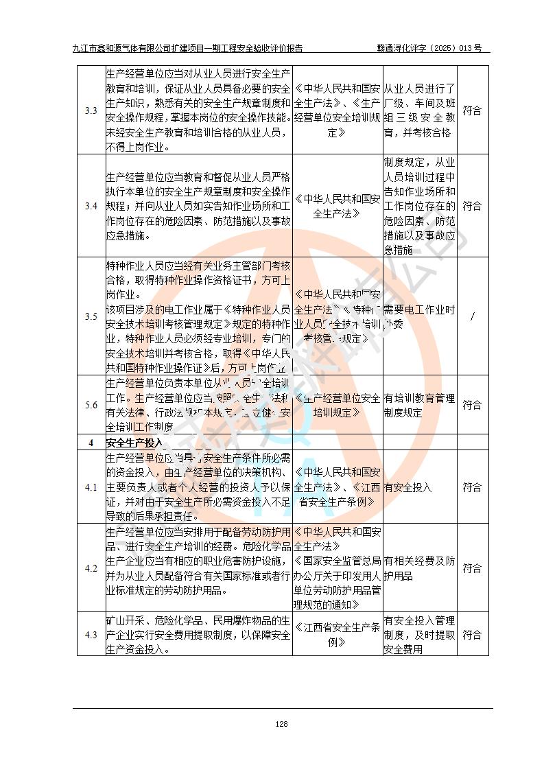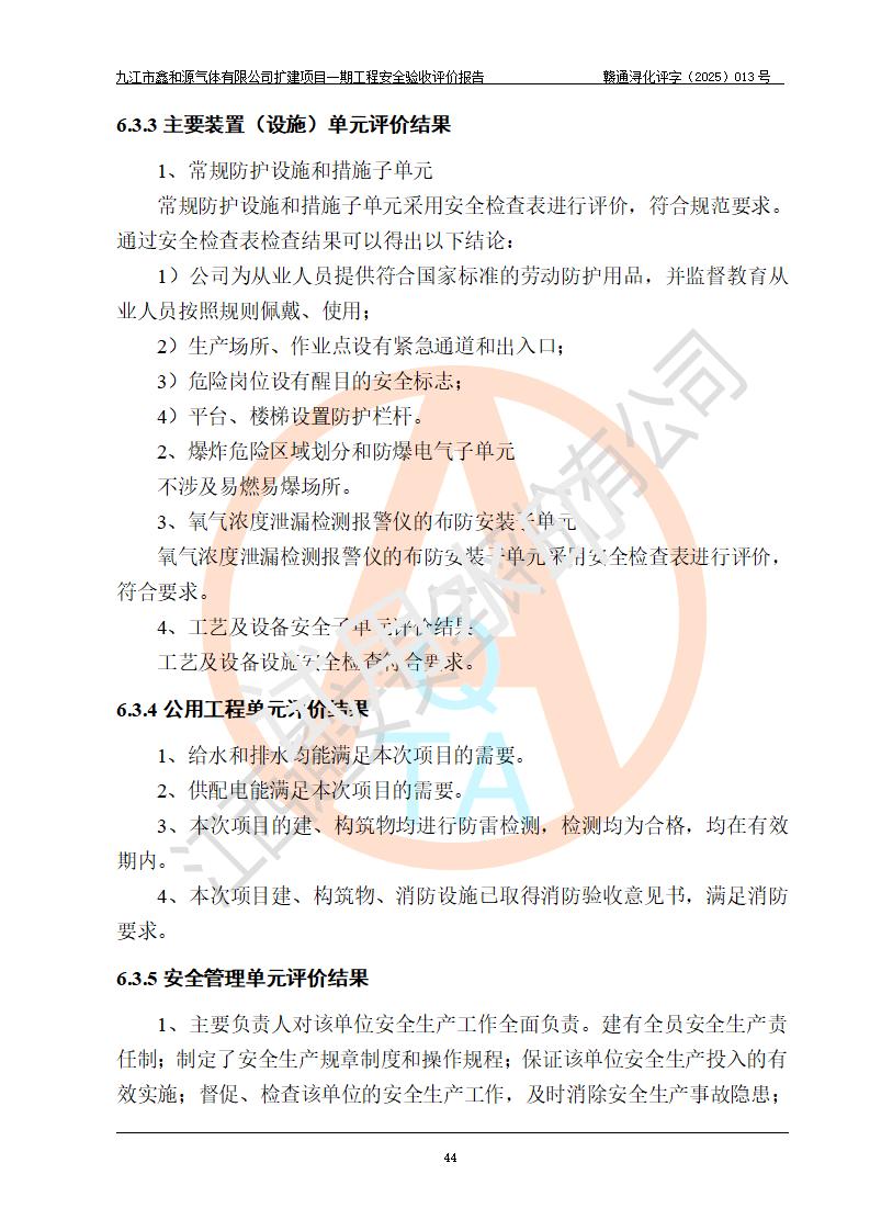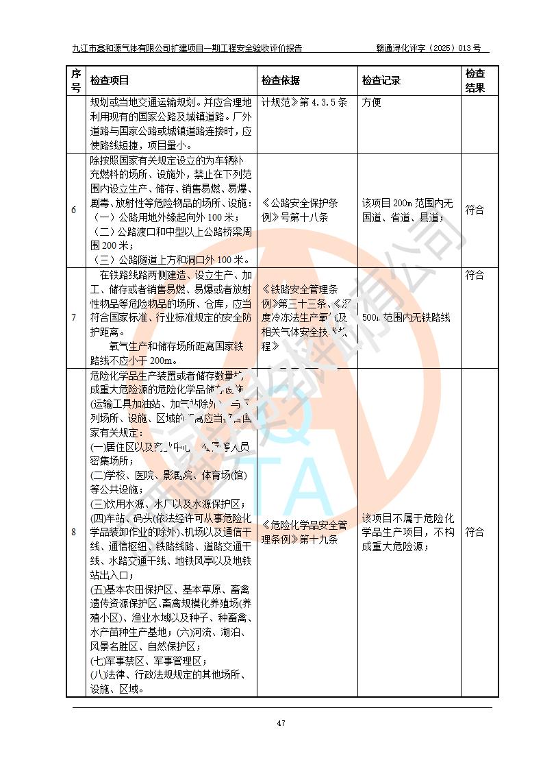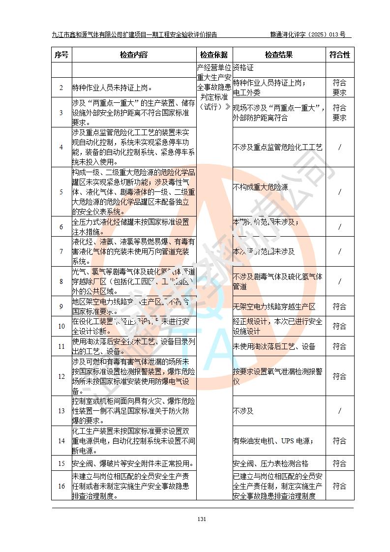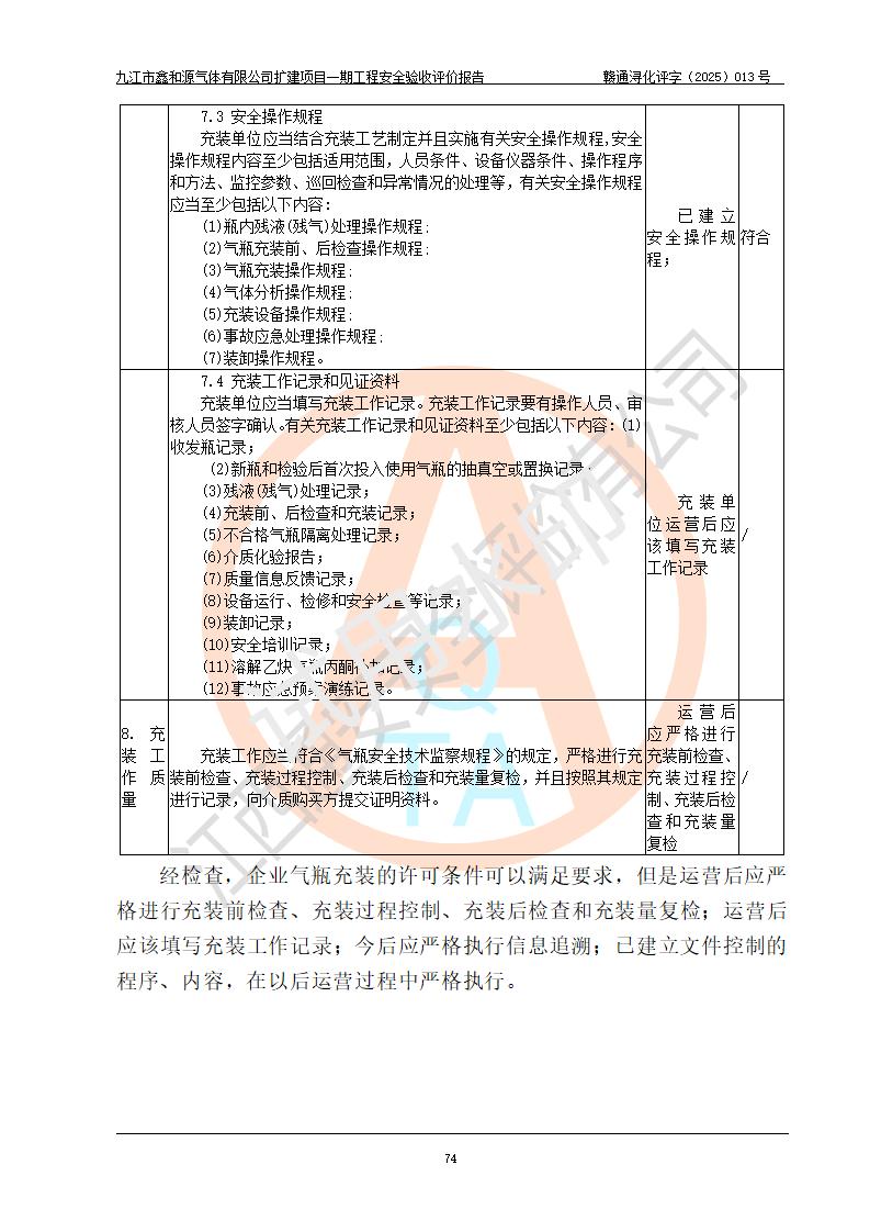 評價結(jié)論 | 經(jīng)評價組評價,九江市鑫和源氣體有限公司擴(kuò)建2×20m3液氬、3×20m3液氮、2×20m3液氧、2×20m3CO2、2×50m3丙烷儲存及充裝項目一期工程總體布局、設(shè)備布置情況與設(shè)計圖紙一致,本次項目(儲存、充裝)不涉及重點監(jiān)管的危險化學(xué)品、危險工藝、重大危險源,按設(shè)計要求施工、安裝;企業(yè)主要負(fù)責(zé)人及安全管理人員已取得危險化學(xué)品企業(yè)安全生產(chǎn)知識和管理能力考核合格證。項目選擇的工藝過程及設(shè)備設(shè)施的安全可靠性能達(dá)到**法規(guī)、標(biāo)準(zhǔn)規(guī)定要求。 項目運(yùn)行后存在的主要危險、有害因素有:火災(zāi)、其他爆炸、容器爆炸、凍傷等;存在的主要有害因素有噪聲等;針對存在的危險、有害因素,企業(yè)采取了**的安全技術(shù)措施及安全管理措施,項目風(fēng)險可控,其安全生產(chǎn)條件和安全管理方面具備竣工安全驗收的條件。 | |||||