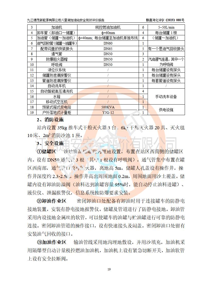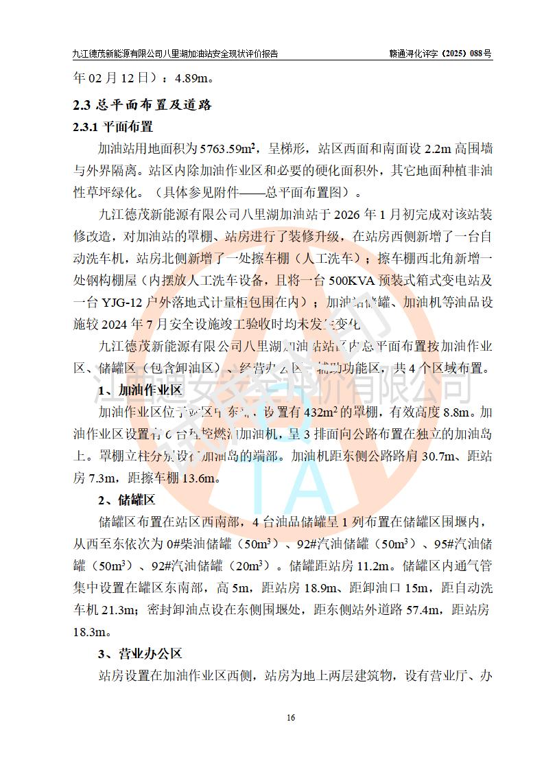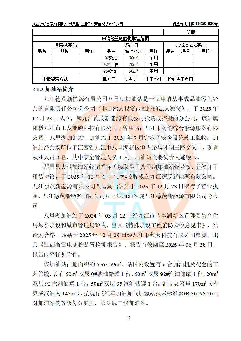 項(xiàng)目簡介 | 九江德茂新能源有限公司八里湖加油站是一家申請從事成品油零售經(jīng)營的有限責(zé)任公司分公司(非自然人投資或控股的法人獨(dú)資),于2025年12月23日成立,屬九江德茂新能源有限公司投資或控股的分公司,該站屬租賃九江市工發(fā)能碳科技有限公司(曾用名:九江市海韻綜合能源服務(wù)有限公司)八里湖加油站,加油站于2024年7月完成了安全設(shè)施竣工驗(yàn)收;加油站經(jīng)營場所位于江西省九江市八里湖新區(qū)恒水路與環(huán)湖三路交叉口,現(xiàn)有從業(yè)人員8名,其中安全管理人員1人,加油站主要負(fù)責(zé)人施順玉。 該加油站占地面積約5763.59m2,站區(qū)內(nèi)設(shè)置有6臺加油機(jī)及配套的工藝管線,設(shè)有50m3雙層0#柴油儲罐1臺,50m3雙層92#汽油儲罐1臺,20m3雙層92汽油儲罐1臺,50m3雙層95汽油儲罐1臺。油品總?cè)萘?/span>170m3(折算成汽油為145m3),按現(xiàn)行《汽車加油加氣加氫站技術(shù)標(biāo)準(zhǔn)》GB 50156-2021對加油站的等級劃分原則,該站屬二級加油站。 | |||
