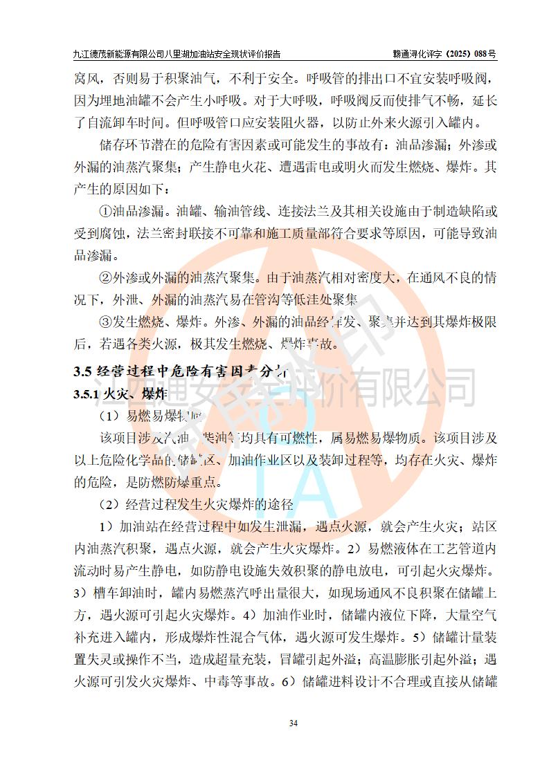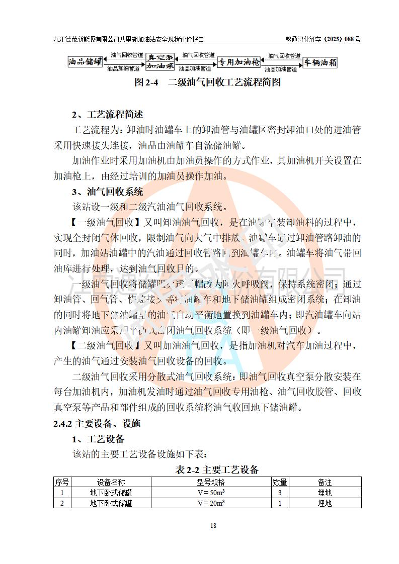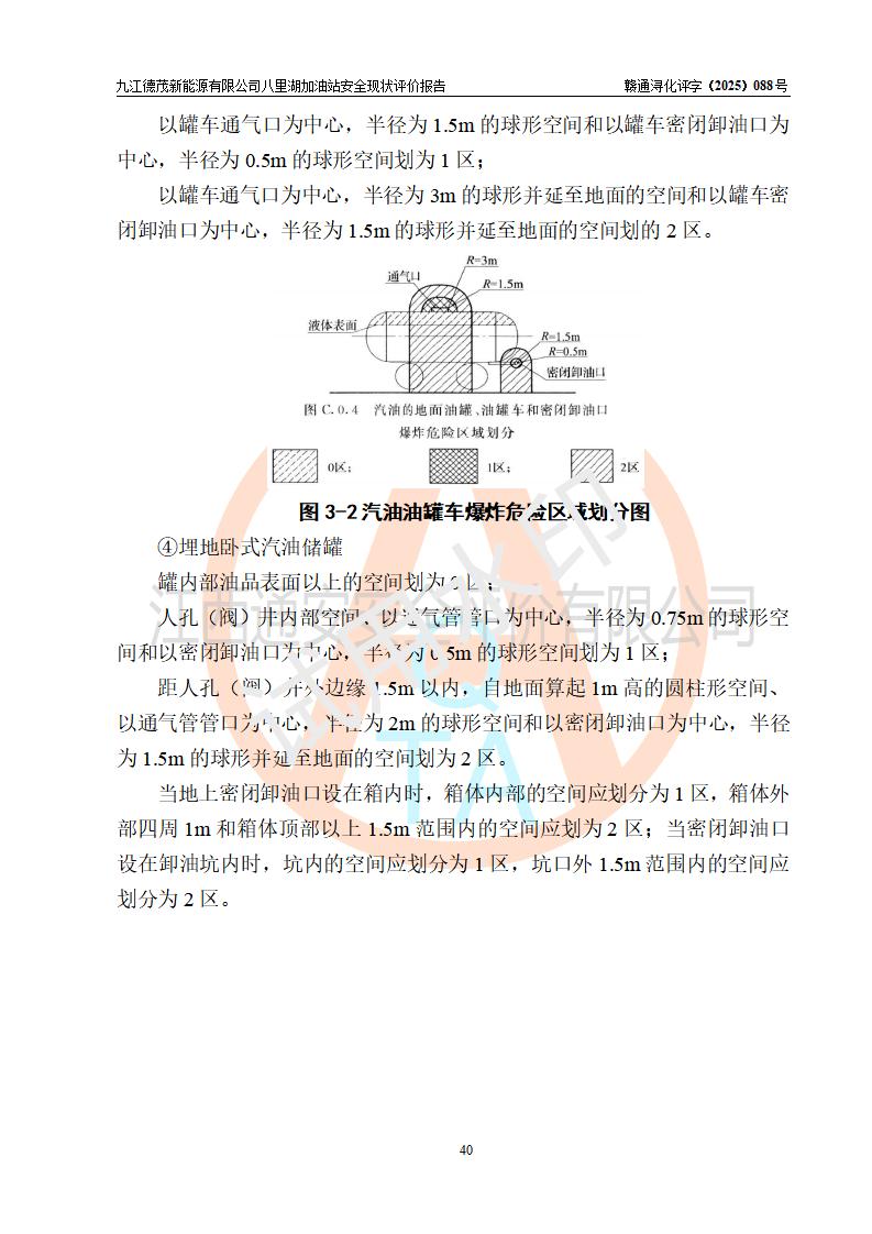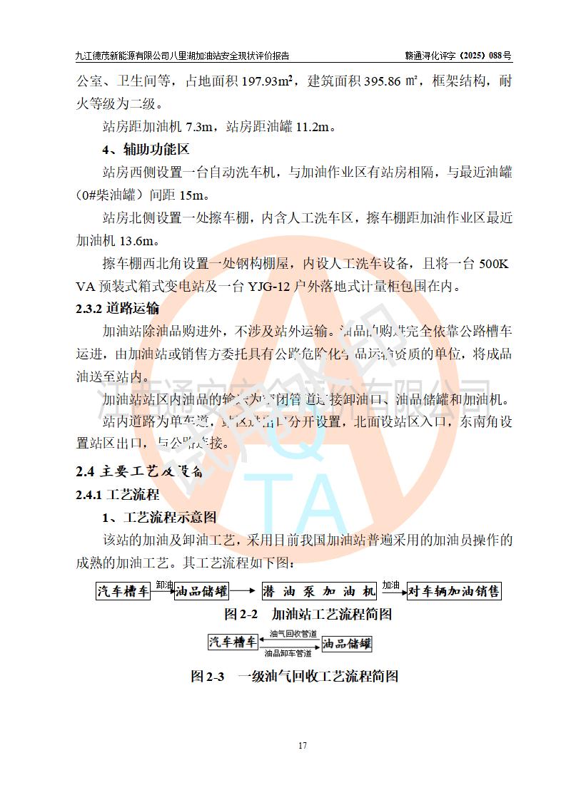 項(xiàng)目簡介 | 九江德茂新能源有限公司八里湖加油站是一家申請從事成品油零售經(jīng)營的有限責(zé)任公司分公司(非自然人投資或控股的法人獨(dú)資),于2025年12月23日成立,屬九江德茂新能源有限公司投資或控股的分公司,該站屬租賃九江市工發(fā)能碳科技有限公司(曾用名:九江市海韻綜合能源服務(wù)有限公司)八里湖加油站,加油站于2024年7月完成了安全設(shè)施竣工驗(yàn)收;加油站經(jīng)營場所位于江西省九江市八里湖新區(qū)恒水路與環(huán)湖三路交叉口,現(xiàn)有從業(yè)人員8名,其中安全管理人員1人,加油站主要負(fù)責(zé)人施順玉。 該加油站占地面積約5763.59m2,站區(qū)內(nèi)設(shè)置有6臺加油機(jī)及配套的工藝管線,設(shè)有50m3雙層0#柴油儲罐1臺,50m3雙層92#汽油儲罐1臺,20m3雙層92汽油儲罐1臺,50m3雙層95汽油儲罐1臺。油品總?cè)萘?/span>170m3(折算成汽油為145m3),按現(xiàn)行《汽車加油加氣加氫站技術(shù)標(biāo)準(zhǔn)》GB 50156-2021對加油站的等級劃分原則,該站屬二級加油站。 | |||
