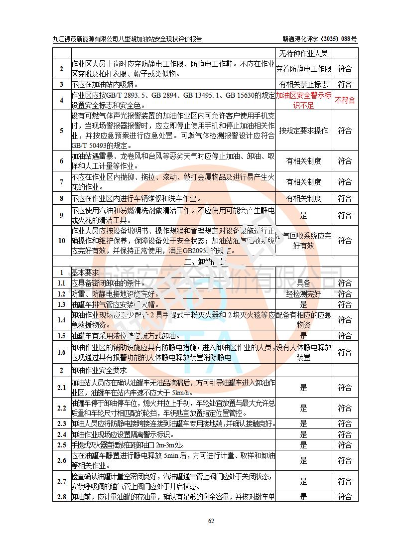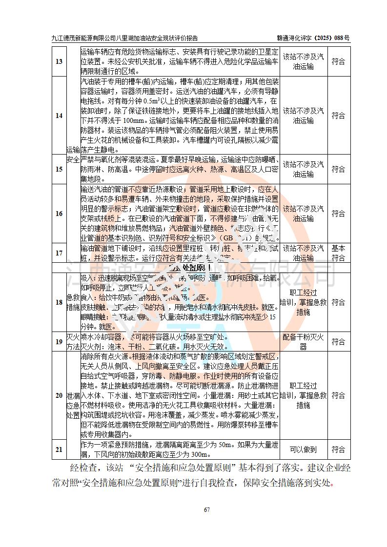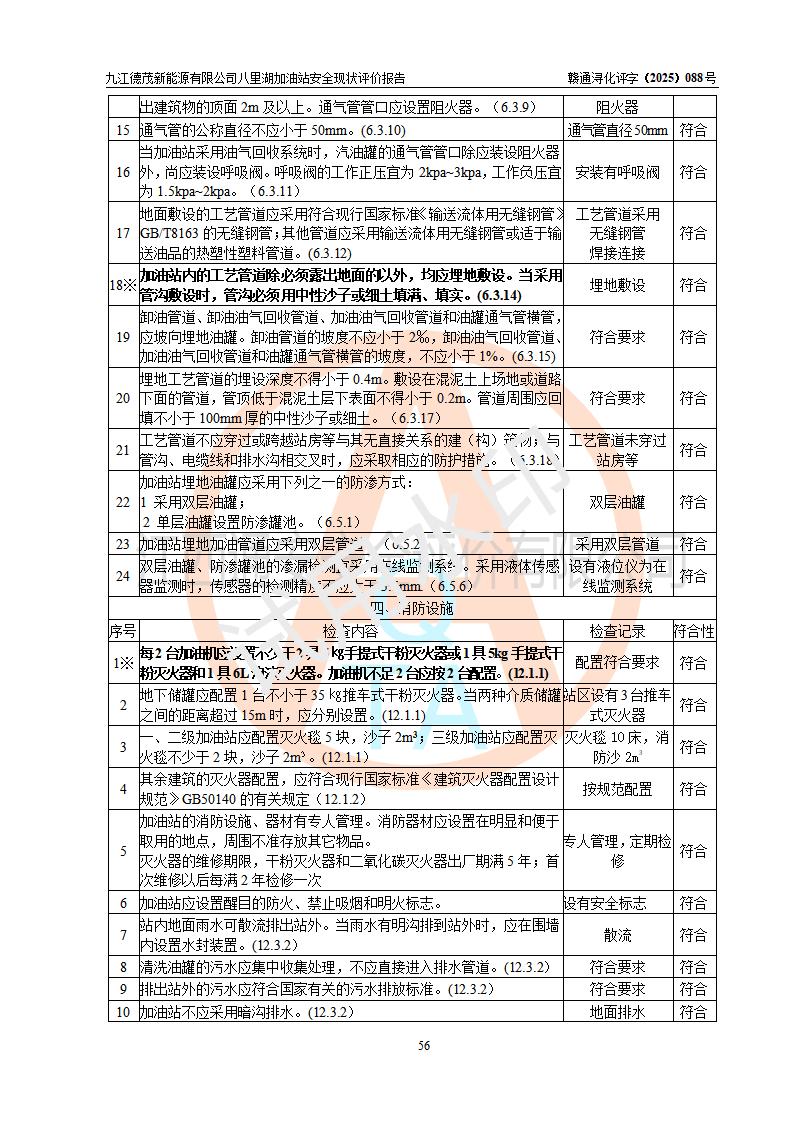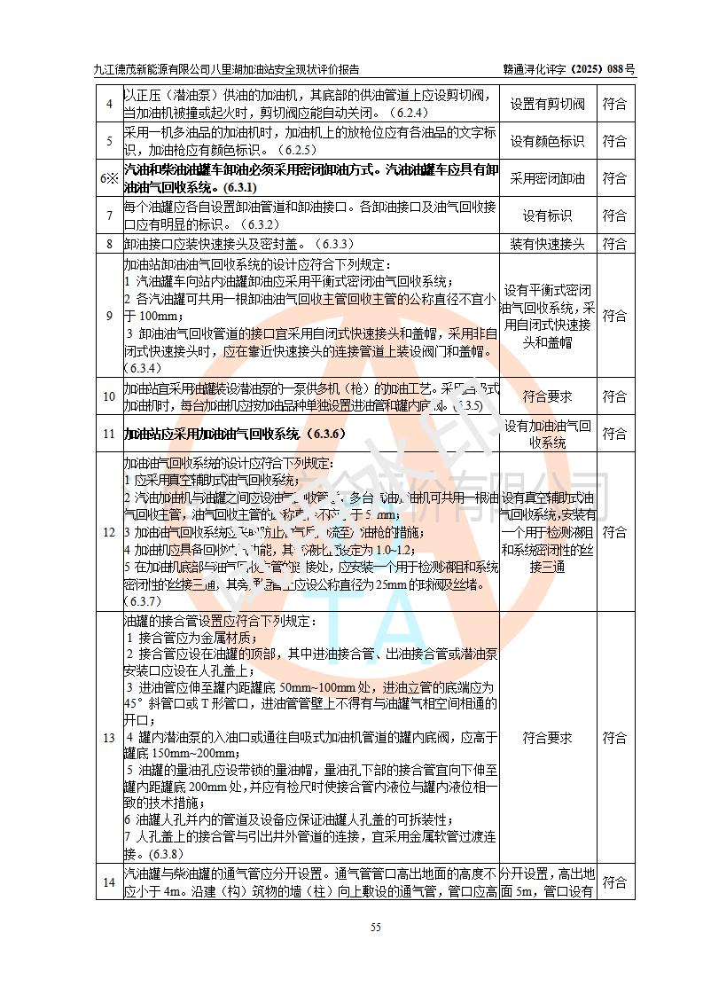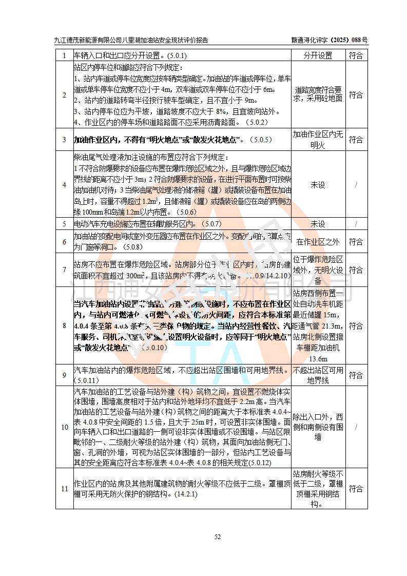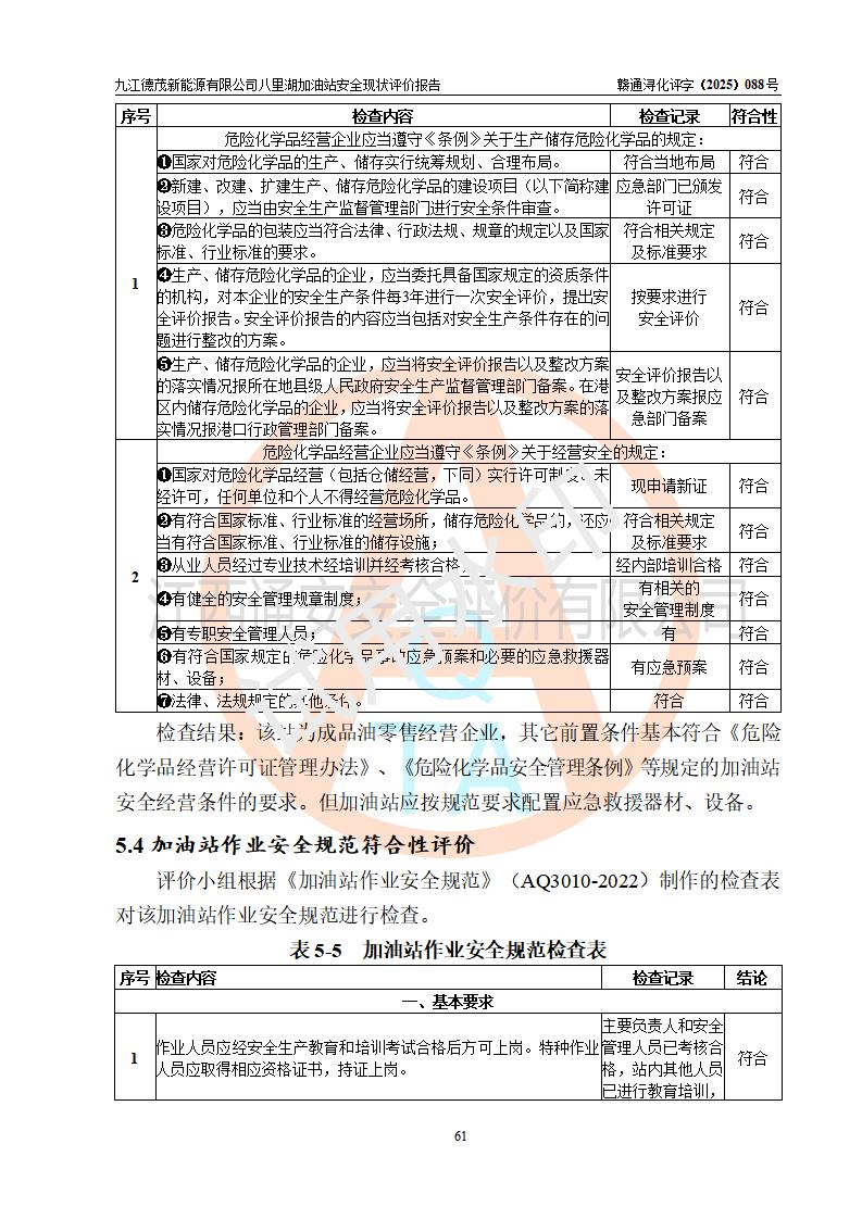 評價(jià)結(jié)論 | 九江德茂新能源有限公司八里湖加油站涉及的安全條件、安全經(jīng)營條件、安全生產(chǎn)管理符合《危險(xiǎn)化學(xué)品經(jīng)營許可證管理辦法》、《汽車加油加氣加氫站技術(shù)標(biāo)準(zhǔn)》等**有關(guān)法規(guī)、標(biāo)準(zhǔn)、規(guī)范要求,能滿足危險(xiǎn)化學(xué)品經(jīng)營安全條件。 | |||