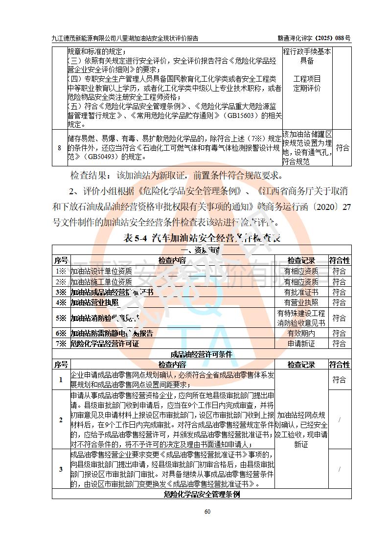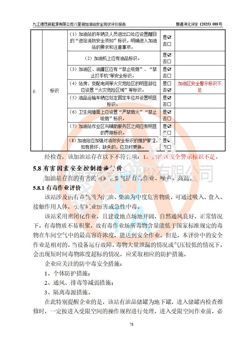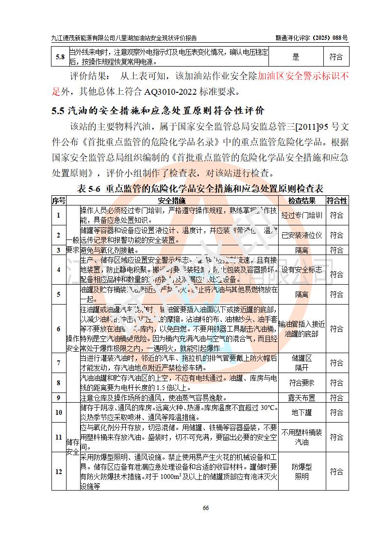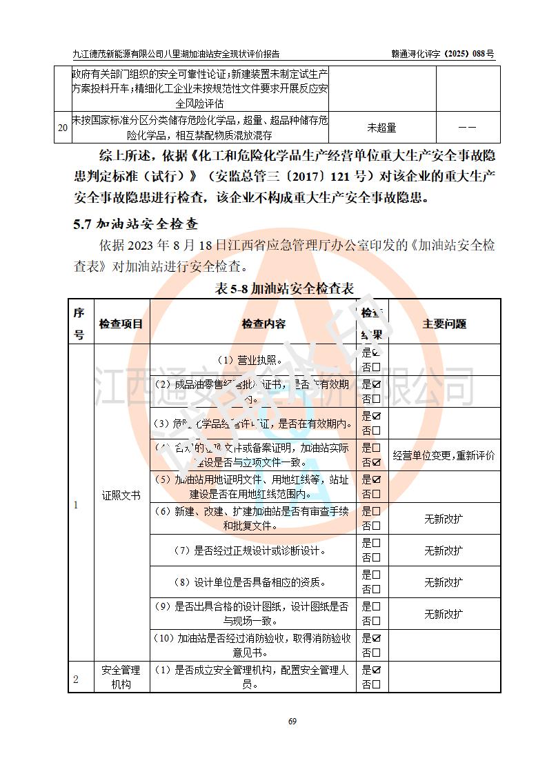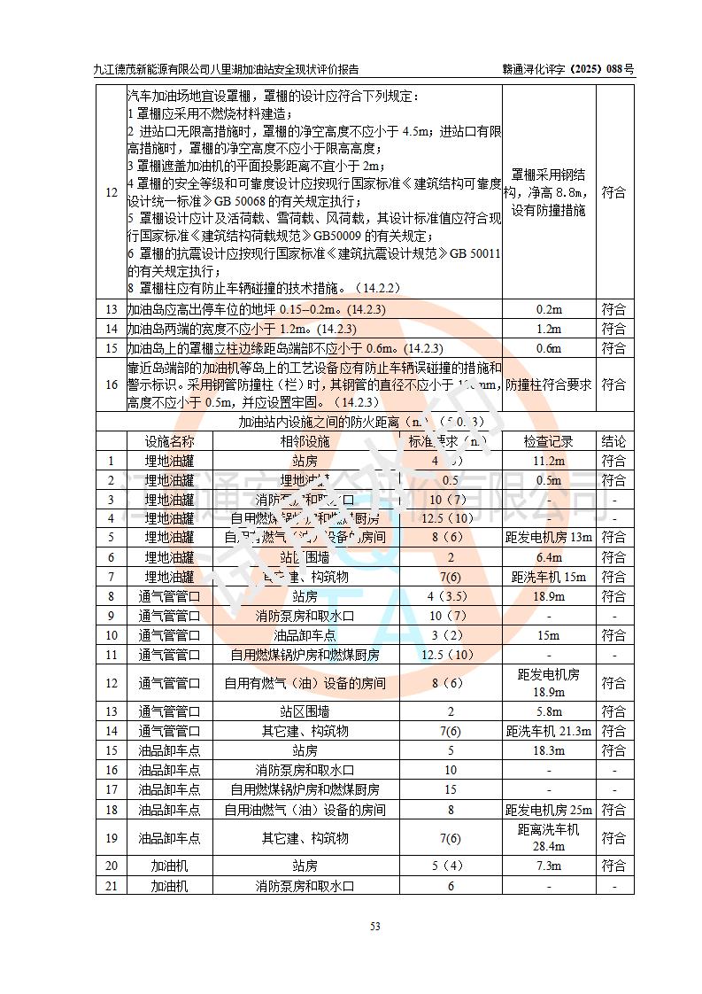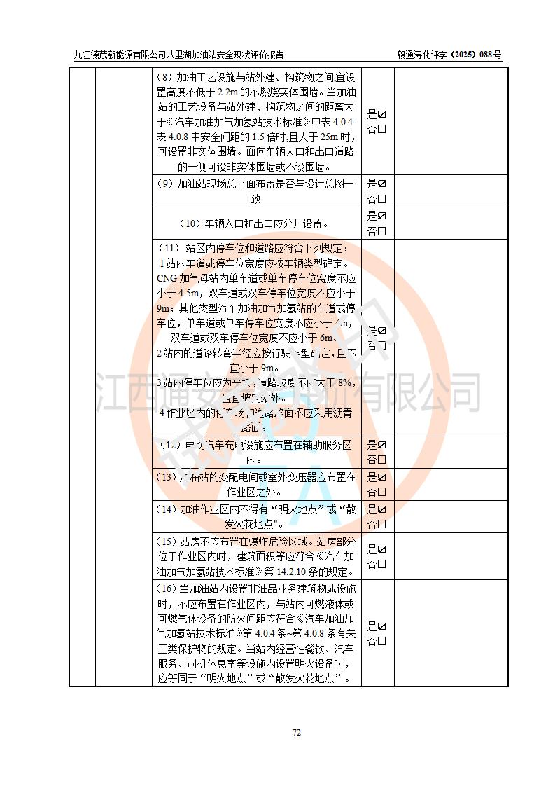 評價(jià)結(jié)論 | 九江德茂新能源有限公司八里湖加油站涉及的安全條件、安全經(jīng)營條件、安全生產(chǎn)管理符合《危險(xiǎn)化學(xué)品經(jīng)營許可證管理辦法》、《汽車加油加氣加氫站技術(shù)標(biāo)準(zhǔn)》等**有關(guān)法規(guī)、標(biāo)準(zhǔn)、規(guī)范要求,能滿足危險(xiǎn)化學(xué)品經(jīng)營安全條件。 | |||