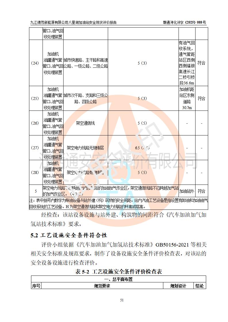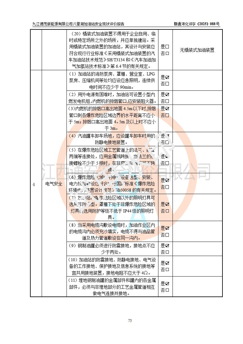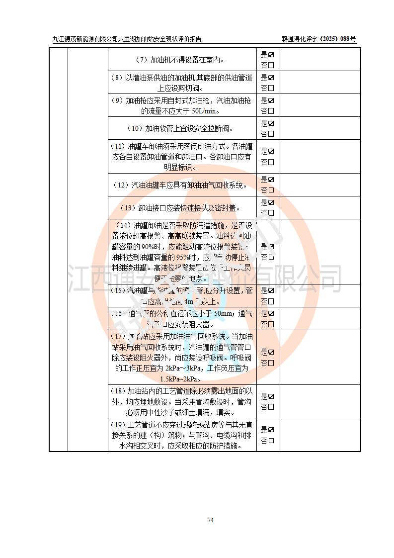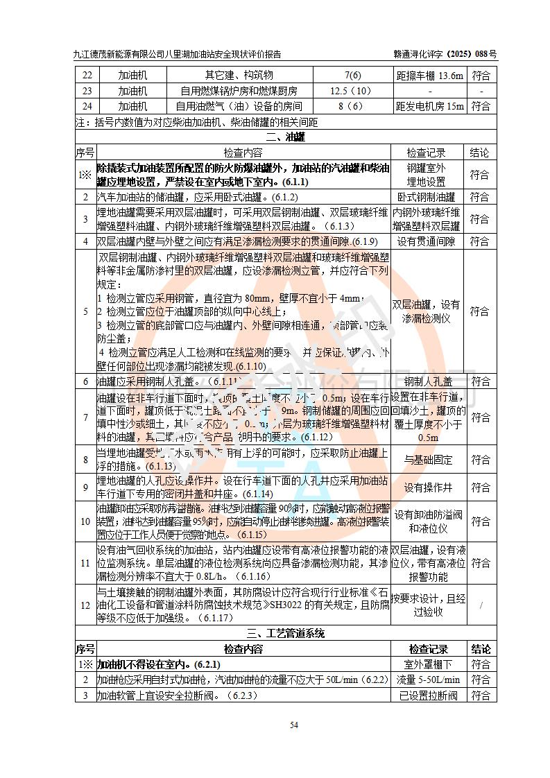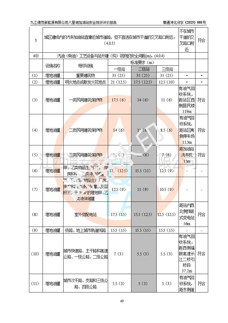 評價(jià)結(jié)論 | 九江德茂新能源有限公司八里湖加油站涉及的安全條件、安全經(jīng)營條件、安全生產(chǎn)管理符合《危險(xiǎn)化學(xué)品經(jīng)營許可證管理辦法》、《汽車加油加氣加氫站技術(shù)標(biāo)準(zhǔn)》等**有關(guān)法規(guī)、標(biāo)準(zhǔn)、規(guī)范要求,能滿足危險(xiǎn)化學(xué)品經(jīng)營安全條件。 | |||