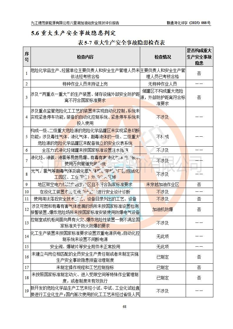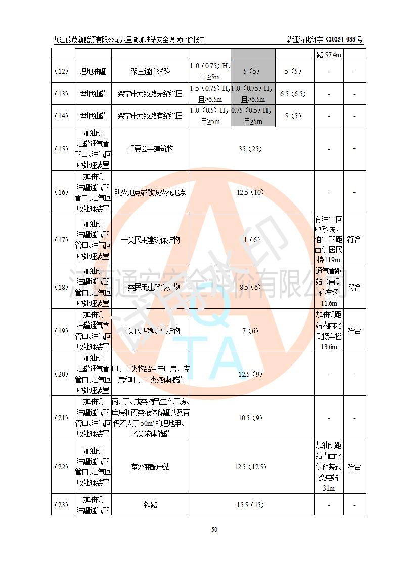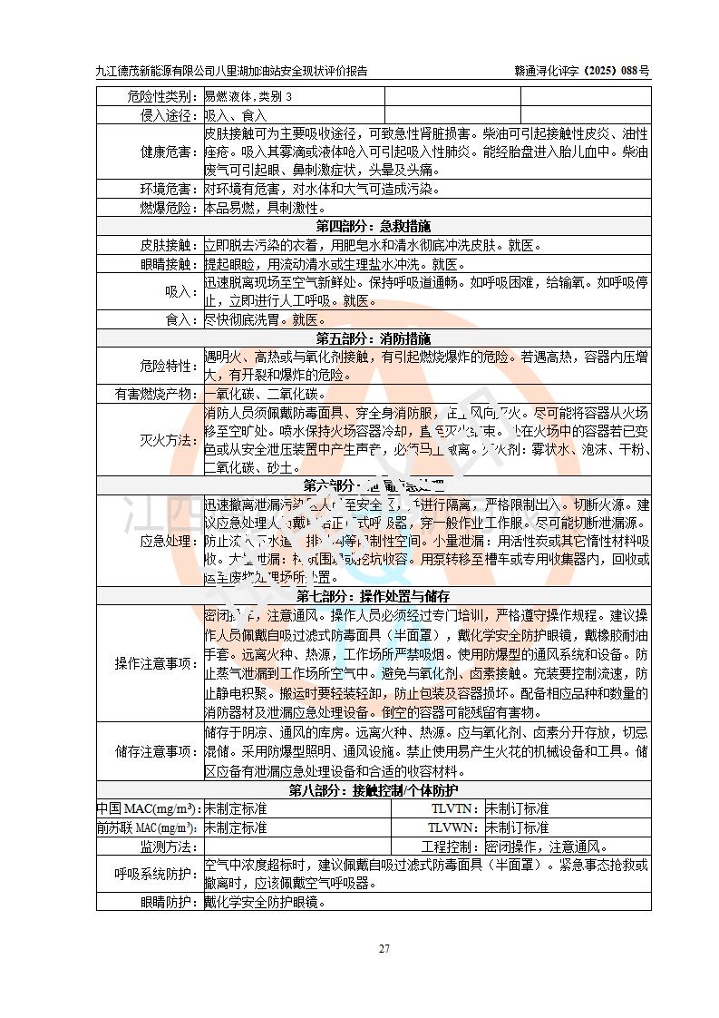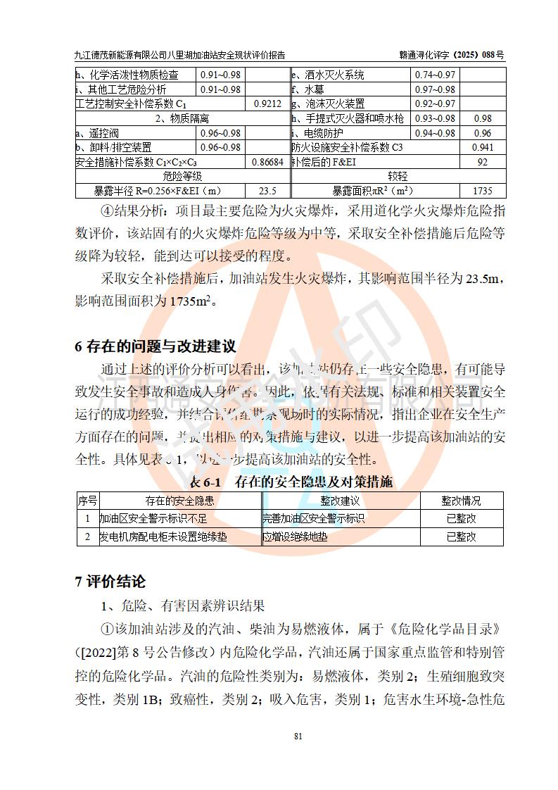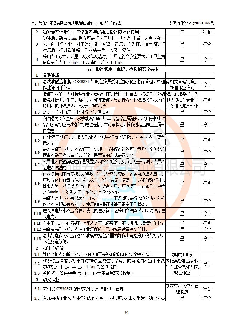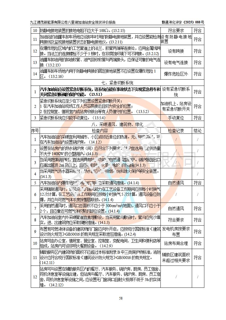 評價(jià)結(jié)論 | 九江德茂新能源有限公司八里湖加油站涉及的安全條件、安全經(jīng)營條件、安全生產(chǎn)管理符合《危險(xiǎn)化學(xué)品經(jīng)營許可證管理辦法》、《汽車加油加氣加氫站技術(shù)標(biāo)準(zhǔn)》等**有關(guān)法規(guī)、標(biāo)準(zhǔn)、規(guī)范要求,能滿足危險(xiǎn)化學(xué)品經(jīng)營安全條件。 | |||