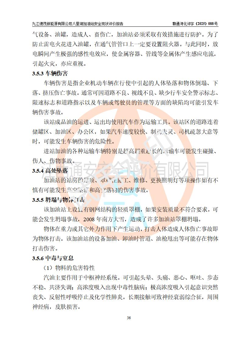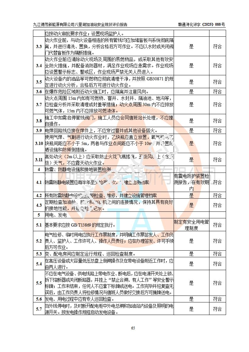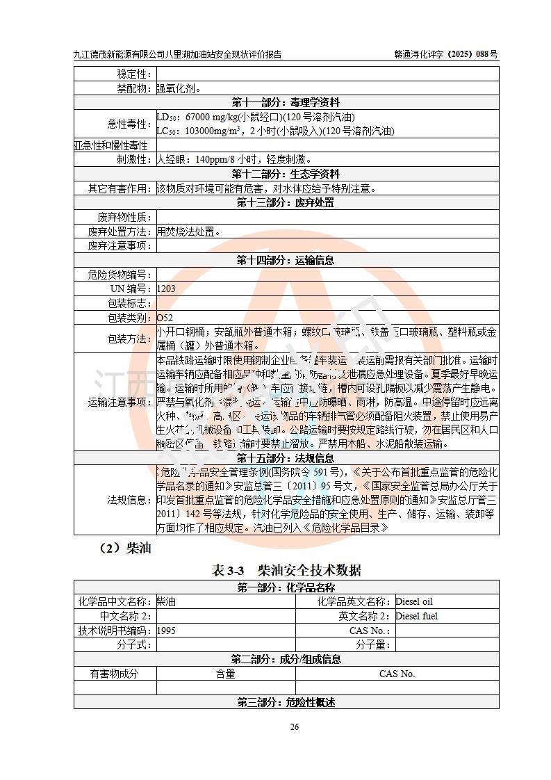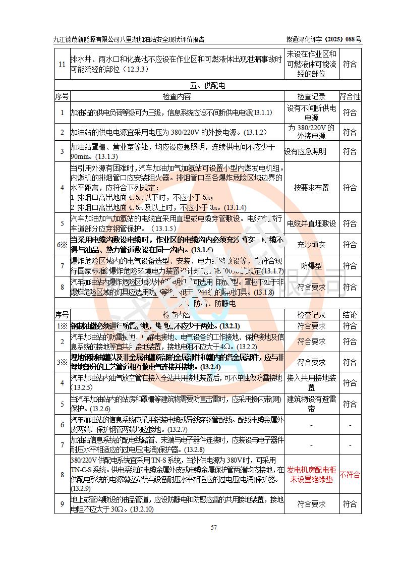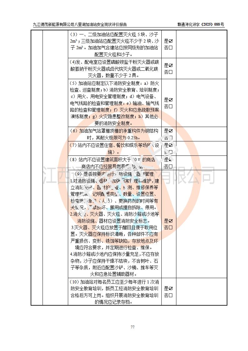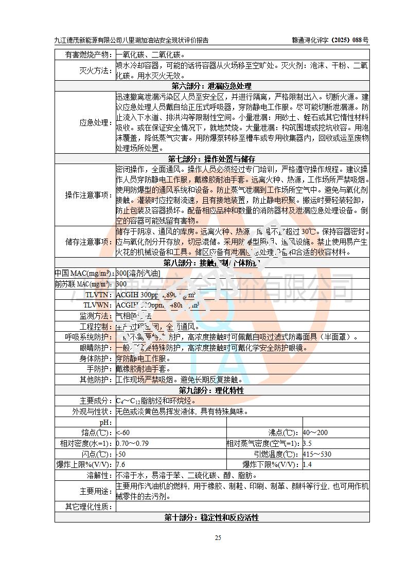 評價(jià)結(jié)論 | 九江德茂新能源有限公司八里湖加油站涉及的安全條件、安全經(jīng)營條件、安全生產(chǎn)管理符合《危險(xiǎn)化學(xué)品經(jīng)營許可證管理辦法》、《汽車加油加氣加氫站技術(shù)標(biāo)準(zhǔn)》等**有關(guān)法規(guī)、標(biāo)準(zhǔn)、規(guī)范要求,能滿足危險(xiǎn)化學(xué)品經(jīng)營安全條件。 | |||