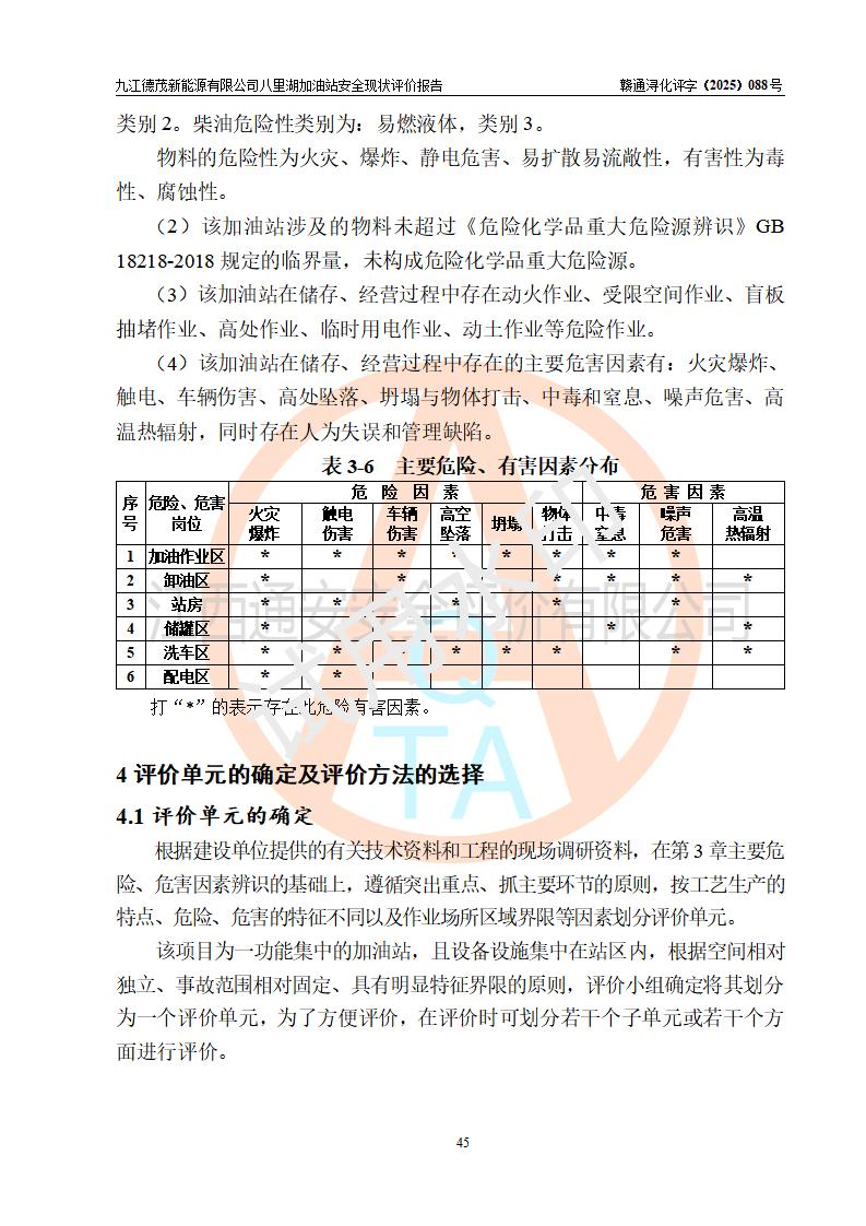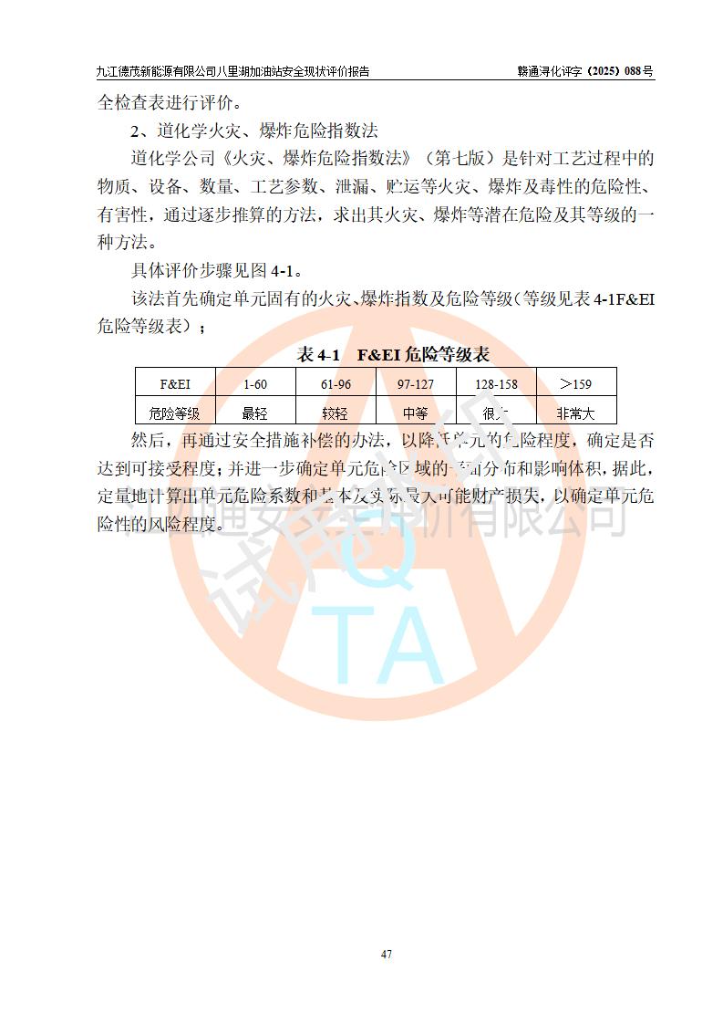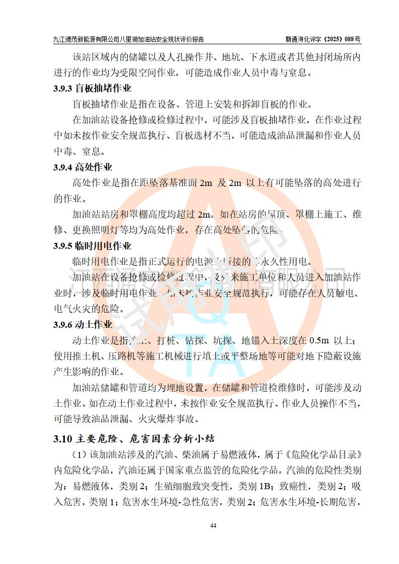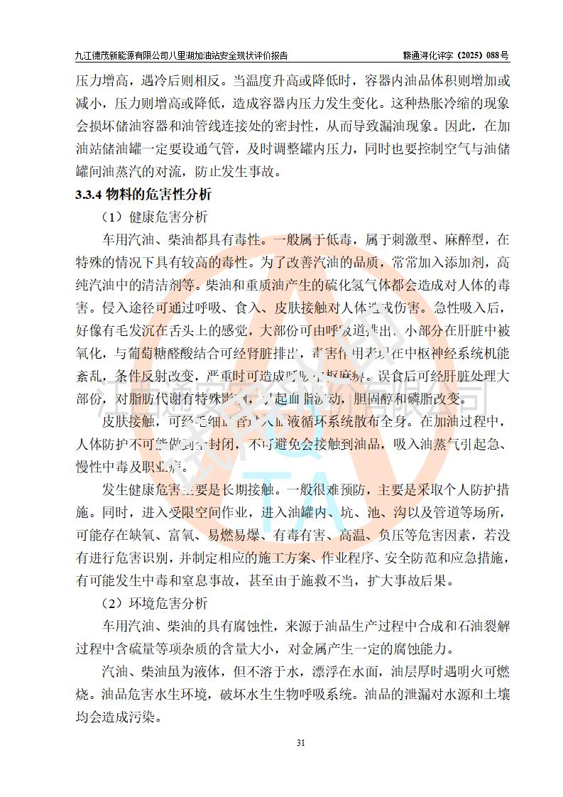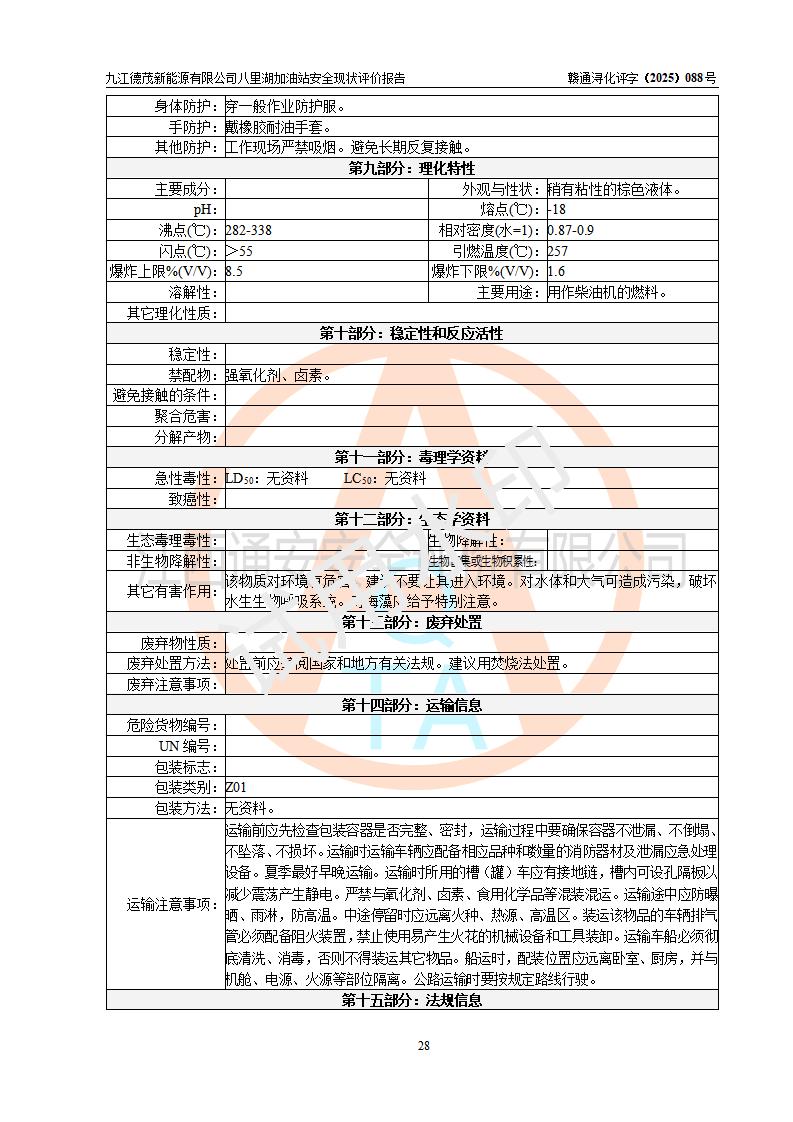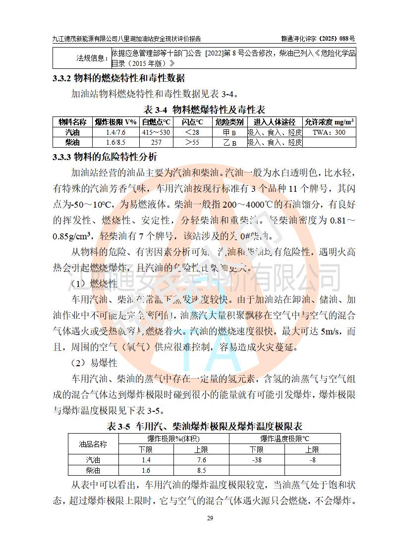 評價(jià)結(jié)論 | 九江德茂新能源有限公司八里湖加油站涉及的安全條件、安全經(jīng)營條件、安全生產(chǎn)管理符合《危險(xiǎn)化學(xué)品經(jīng)營許可證管理辦法》、《汽車加油加氣加氫站技術(shù)標(biāo)準(zhǔn)》等**有關(guān)法規(guī)、標(biāo)準(zhǔn)、規(guī)范要求,能滿足危險(xiǎn)化學(xué)品經(jīng)營安全條件。 | |||