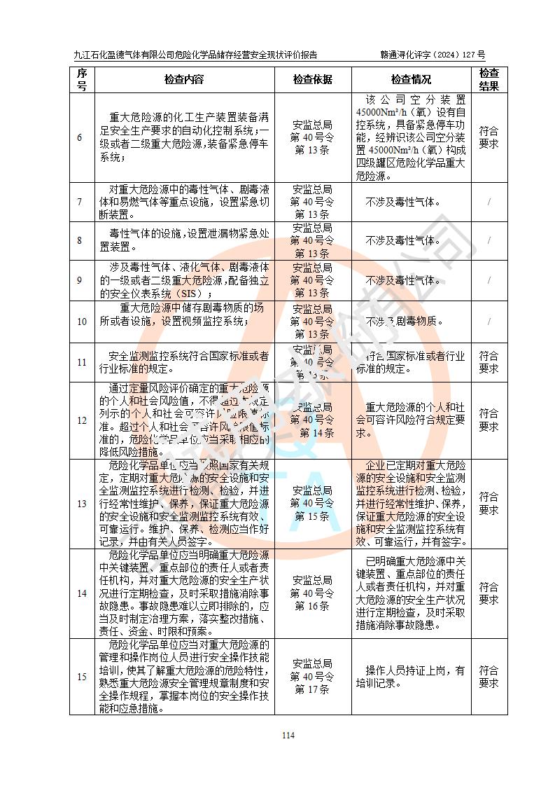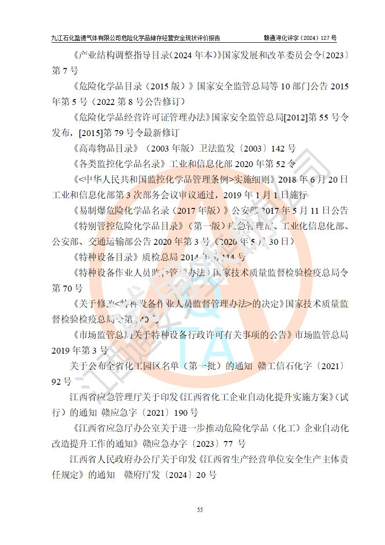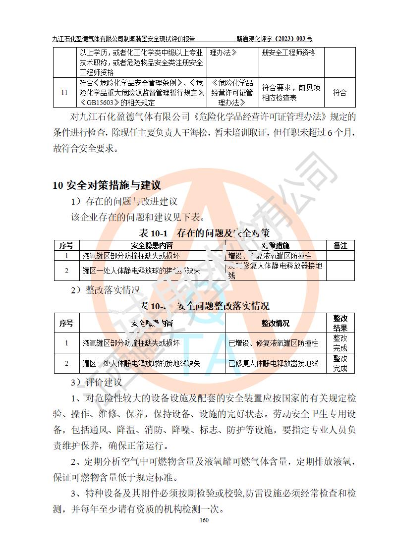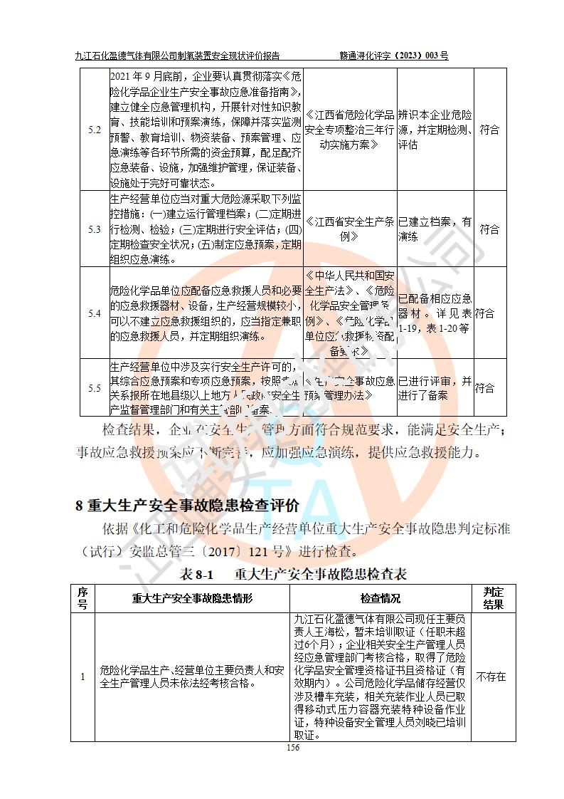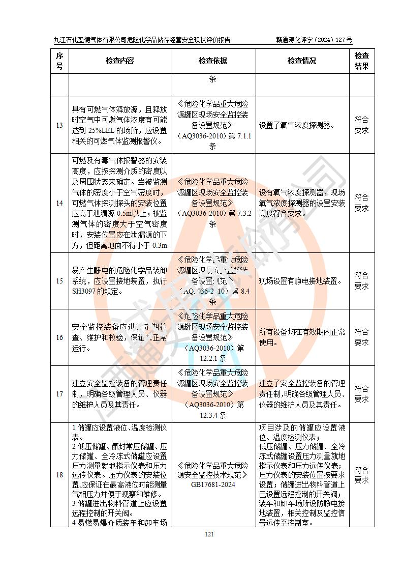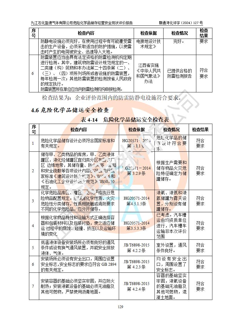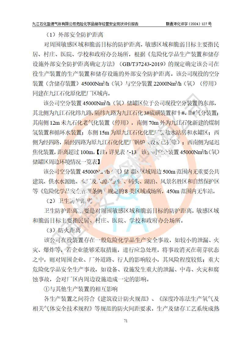 評價結(jié)論 | 九江石化盈德氣體有限公司危險化學品儲存經(jīng)營涉及的儲存裝置符合**產(chǎn)業(yè)政策,主要安全生產(chǎn)經(jīng)營相關(guān)證照齊全。該公司的安全設(shè)施符合**現(xiàn)行法律、法規(guī)和技術(shù)標準、規(guī)范要求。企業(yè)有健全的安全生產(chǎn)管理組織機構(gòu),建立了較為完善的安全生產(chǎn)管理規(guī)章制度,安全管理基本有章可循。評價時儲存裝置和現(xiàn)有安全設(shè)施運行正常、**?,F(xiàn)場儲存裝置與設(shè)計圖紙一致。DCS、TICC等自動化控制系統(tǒng)符合設(shè)計要求并**運行;公司主要負責人、安全管理人員、特殊作業(yè)人員等符合《江西省危險化學品安全專項整治三年行動實施方案》專業(yè)、學歷要求。 綜上所述,該公司危險化學品儲存經(jīng)營涉及的相關(guān)裝置及配套設(shè)施現(xiàn)狀具備了符合**標準規(guī)范要求的安全基本條件,該企業(yè)針對現(xiàn)場提出的安全隱患部分整改到位、企業(yè)采取了相應的安全防范措施和加強了安全管理,該公司危險化學品儲存經(jīng)營風險屬可接受范圍,此次評價范圍內(nèi)的安全現(xiàn)狀符合《危險化學品經(jīng)營許可證管理辦法》規(guī)定的危險化學品儲存經(jīng)營條件,在役儲存裝置風險可控,可滿足危險化學品儲存經(jīng)營條件。 | |||