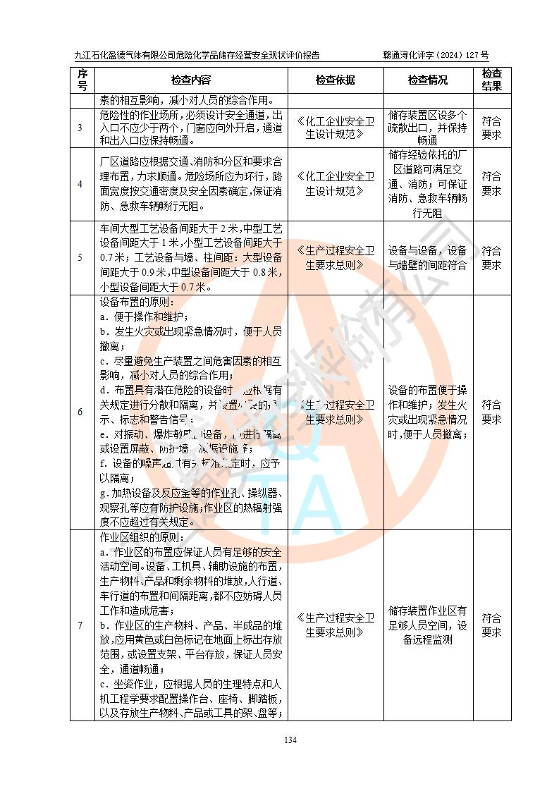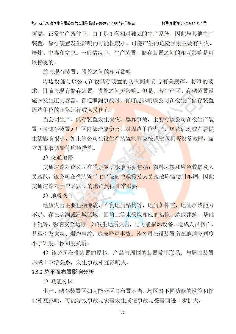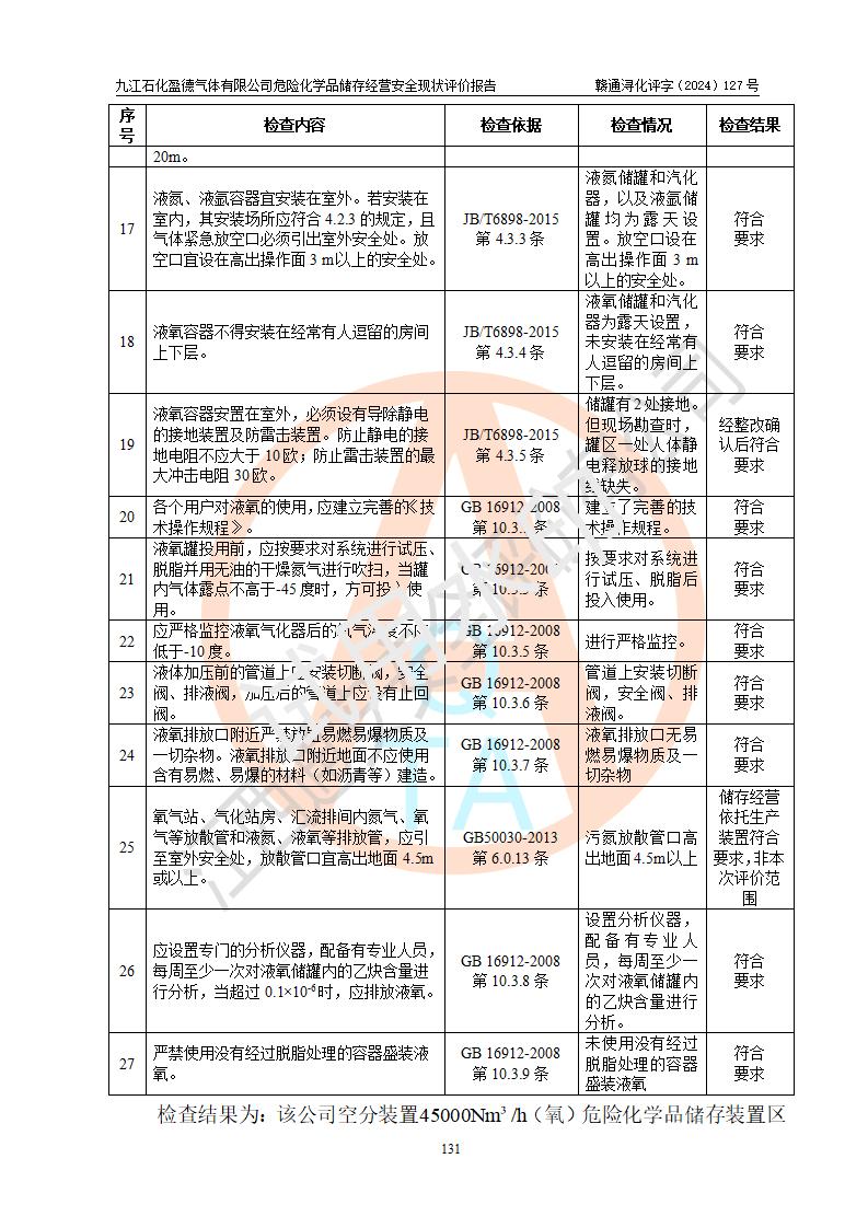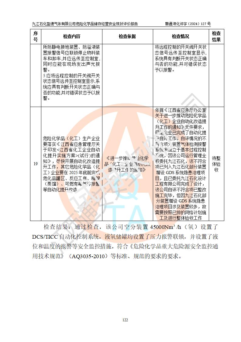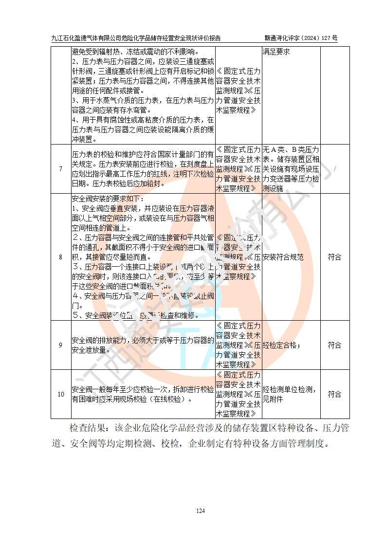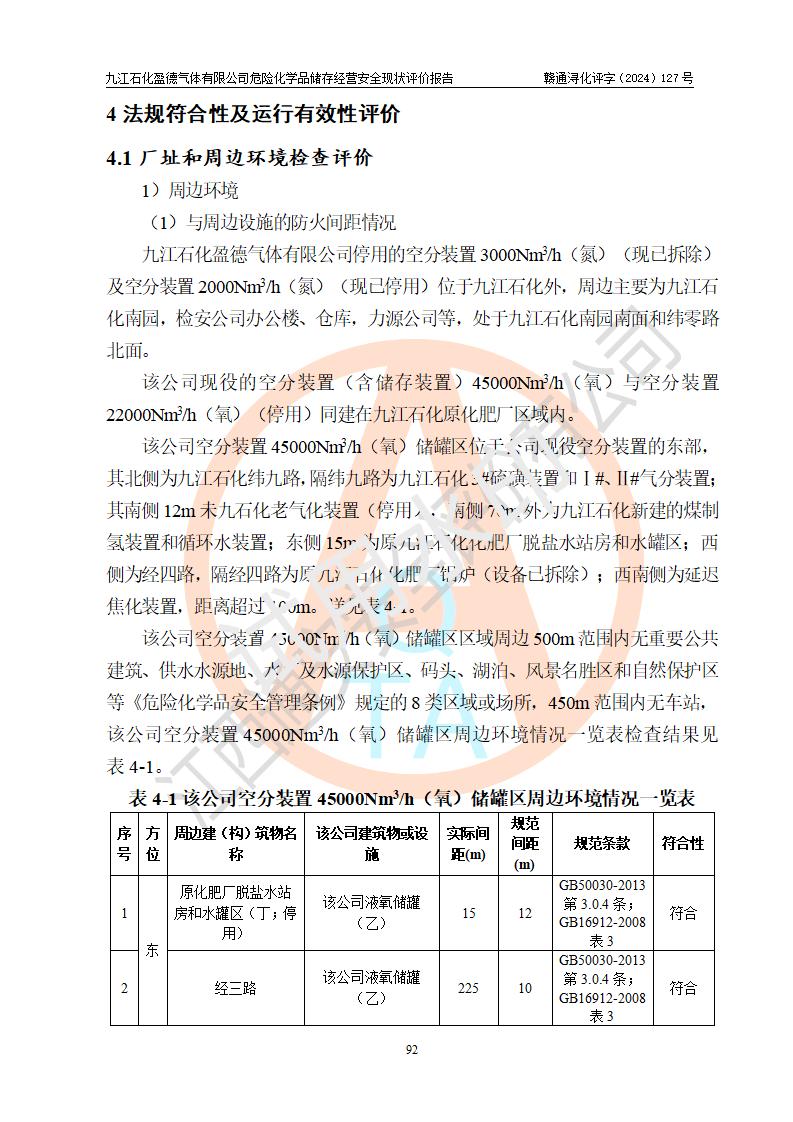 評價結(jié)論 | 九江石化盈德氣體有限公司危險化學品儲存經(jīng)營涉及的儲存裝置符合**產(chǎn)業(yè)政策,主要安全生產(chǎn)經(jīng)營相關(guān)證照齊全。該公司的安全設(shè)施符合**現(xiàn)行法律、法規(guī)和技術(shù)標準、規(guī)范要求。企業(yè)有健全的安全生產(chǎn)管理組織機構(gòu),建立了較為完善的安全生產(chǎn)管理規(guī)章制度,安全管理基本有章可循。評價時儲存裝置和現(xiàn)有安全設(shè)施運行正常、**?,F(xiàn)場儲存裝置與設(shè)計圖紙一致。DCS、TICC等自動化控制系統(tǒng)符合設(shè)計要求并**運行;公司主要負責人、安全管理人員、特殊作業(yè)人員等符合《江西省危險化學品安全專項整治三年行動實施方案》專業(yè)、學歷要求。 綜上所述,該公司危險化學品儲存經(jīng)營涉及的相關(guān)裝置及配套設(shè)施現(xiàn)狀具備了符合**標準規(guī)范要求的安全基本條件,該企業(yè)針對現(xiàn)場提出的安全隱患部分整改到位、企業(yè)采取了相應的安全防范措施和加強了安全管理,該公司危險化學品儲存經(jīng)營風險屬可接受范圍,此次評價范圍內(nèi)的安全現(xiàn)狀符合《危險化學品經(jīng)營許可證管理辦法》規(guī)定的危險化學品儲存經(jīng)營條件,在役儲存裝置風險可控,可滿足危險化學品儲存經(jīng)營條件。 | |||