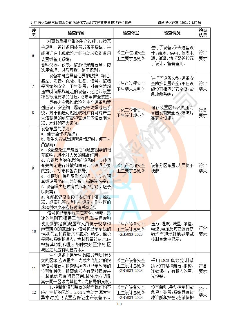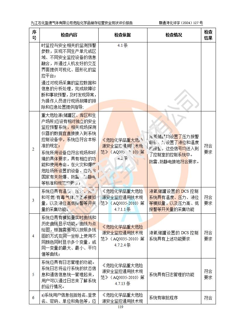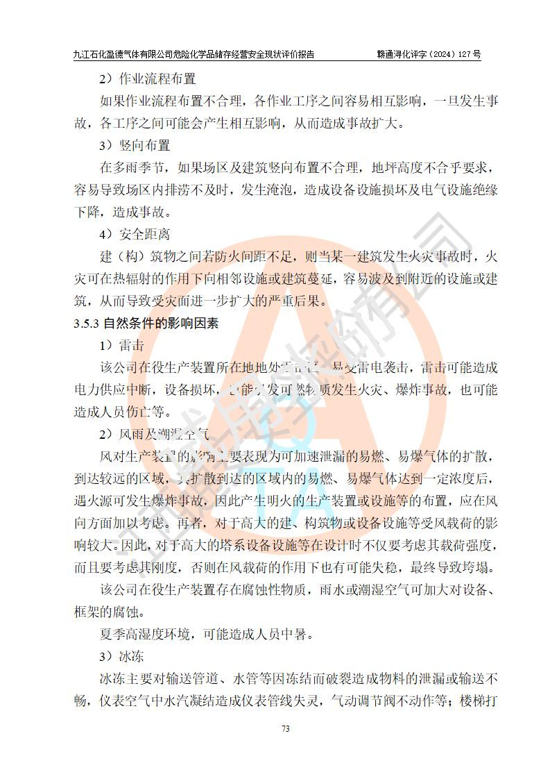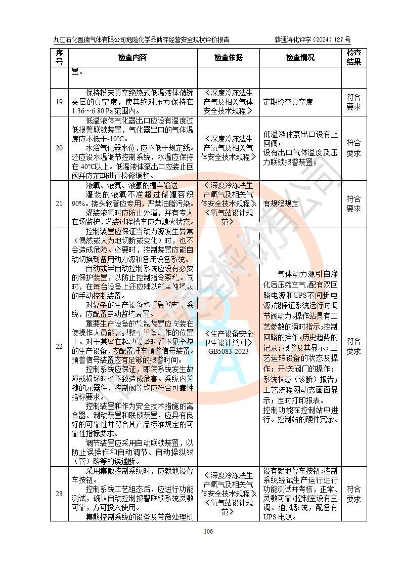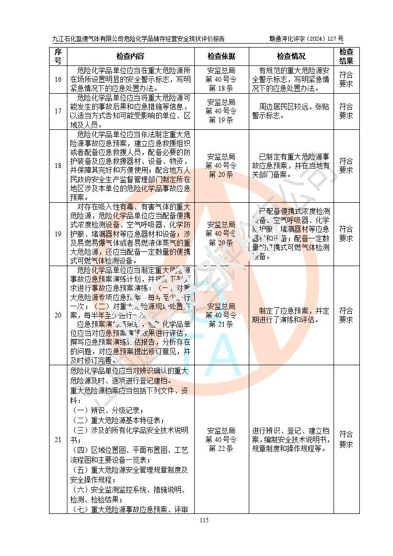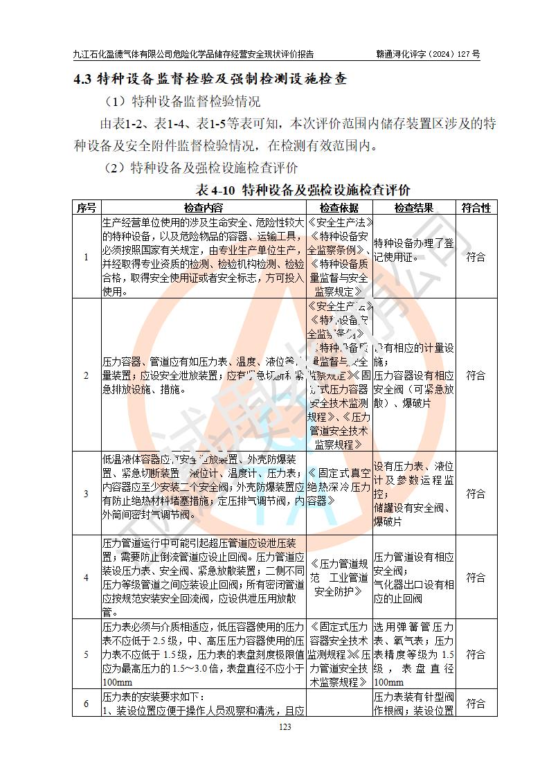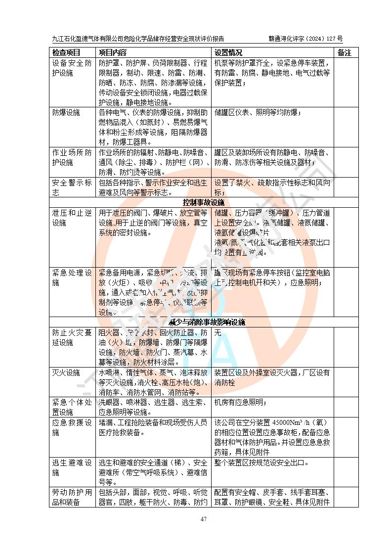 評價結(jié)論 | 九江石化盈德氣體有限公司危險化學品儲存經(jīng)營涉及的儲存裝置符合**產(chǎn)業(yè)政策,主要安全生產(chǎn)經(jīng)營相關(guān)證照齊全。該公司的安全設(shè)施符合**現(xiàn)行法律、法規(guī)和技術(shù)標準、規(guī)范要求。企業(yè)有健全的安全生產(chǎn)管理組織機構(gòu),建立了較為完善的安全生產(chǎn)管理規(guī)章制度,安全管理基本有章可循。評價時儲存裝置和現(xiàn)有安全設(shè)施運行正常、**?,F(xiàn)場儲存裝置與設(shè)計圖紙一致。DCS、TICC等自動化控制系統(tǒng)符合設(shè)計要求并**運行;公司主要負責人、安全管理人員、特殊作業(yè)人員等符合《江西省危險化學品安全專項整治三年行動實施方案》專業(yè)、學歷要求。 綜上所述,該公司危險化學品儲存經(jīng)營涉及的相關(guān)裝置及配套設(shè)施現(xiàn)狀具備了符合**標準規(guī)范要求的安全基本條件,該企業(yè)針對現(xiàn)場提出的安全隱患部分整改到位、企業(yè)采取了相應的安全防范措施和加強了安全管理,該公司危險化學品儲存經(jīng)營風險屬可接受范圍,此次評價范圍內(nèi)的安全現(xiàn)狀符合《危險化學品經(jīng)營許可證管理辦法》規(guī)定的危險化學品儲存經(jīng)營條件,在役儲存裝置風險可控,可滿足危險化學品儲存經(jīng)營條件。 | |||