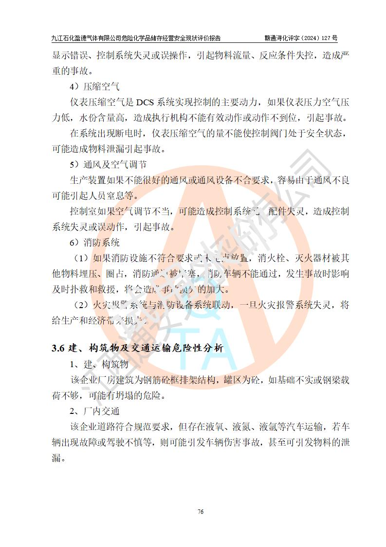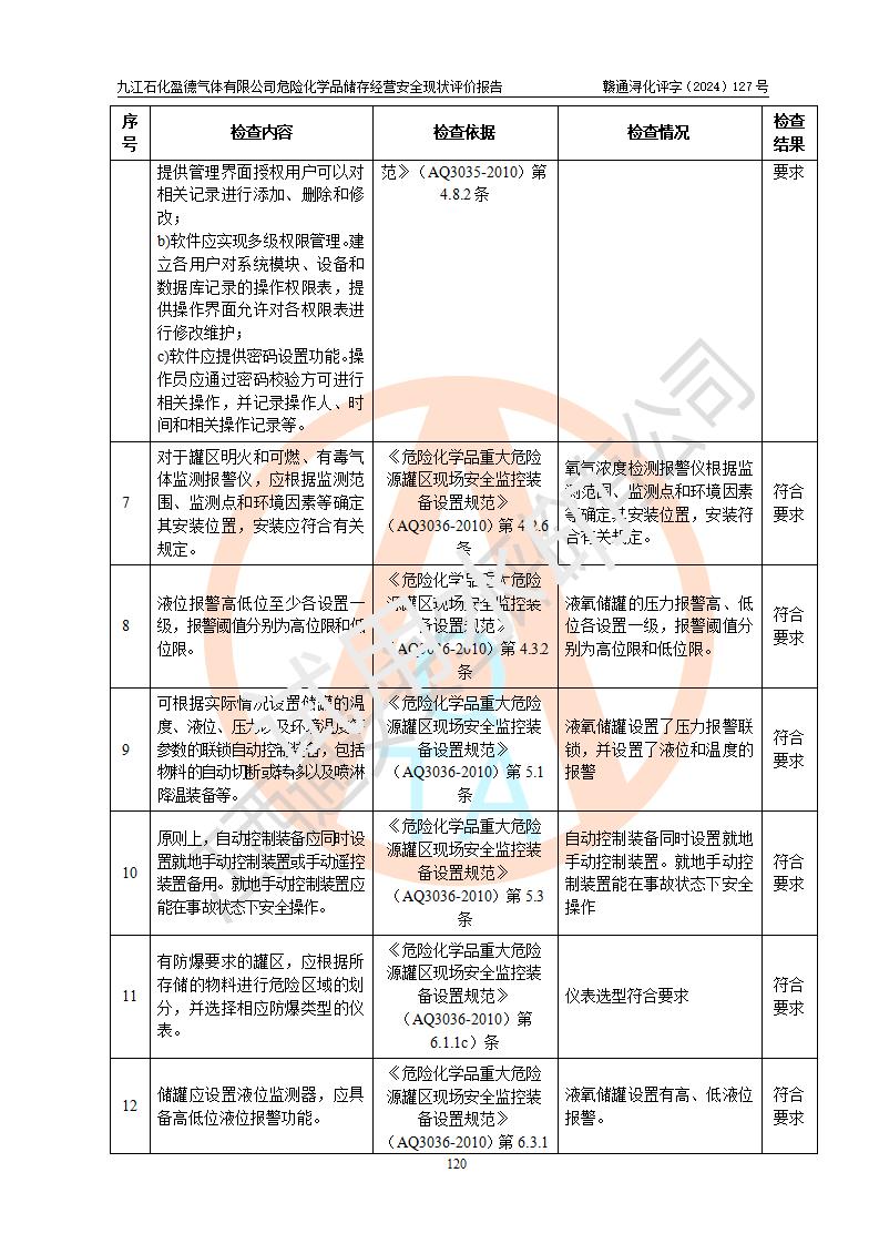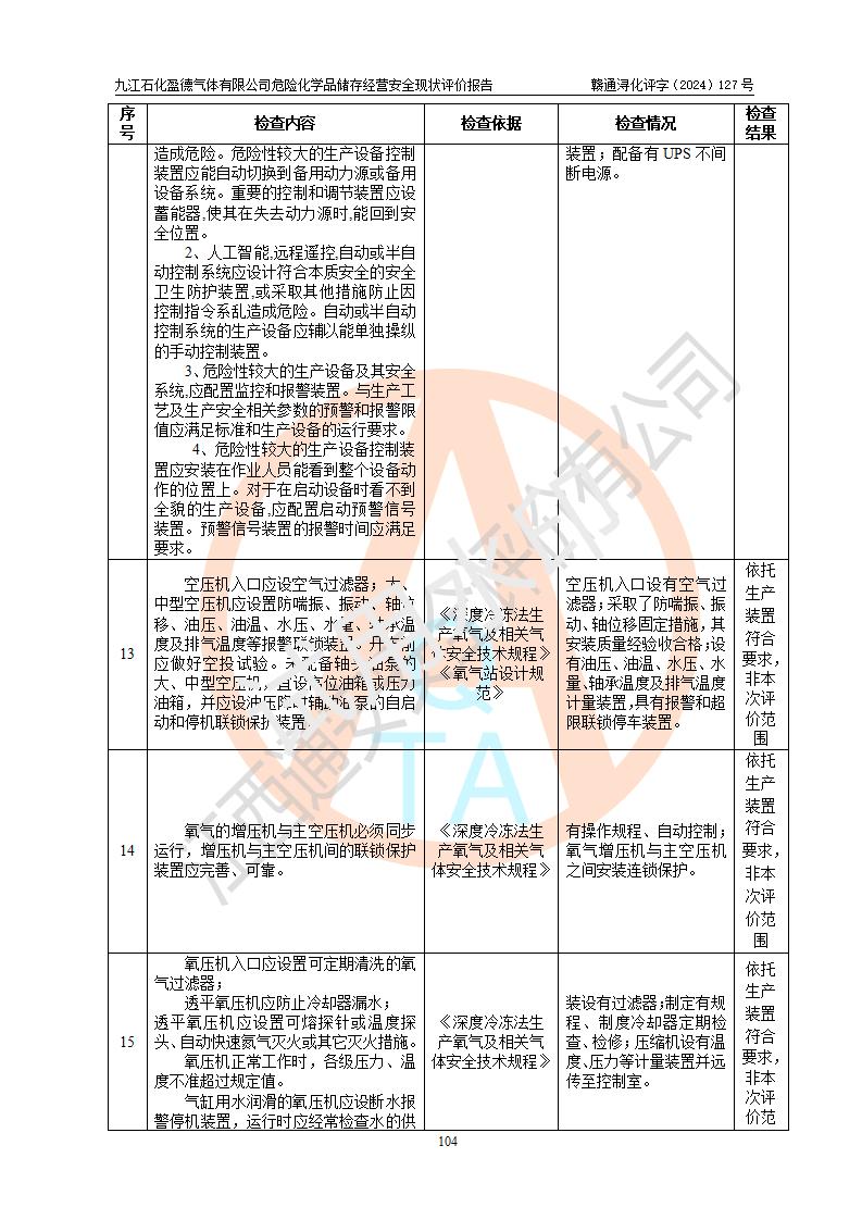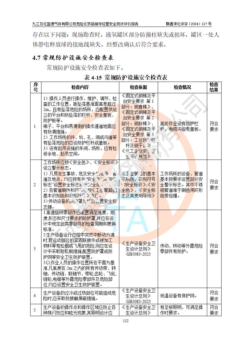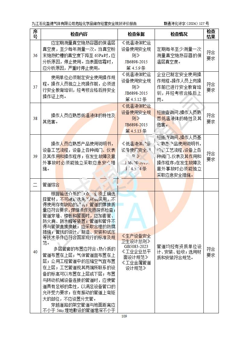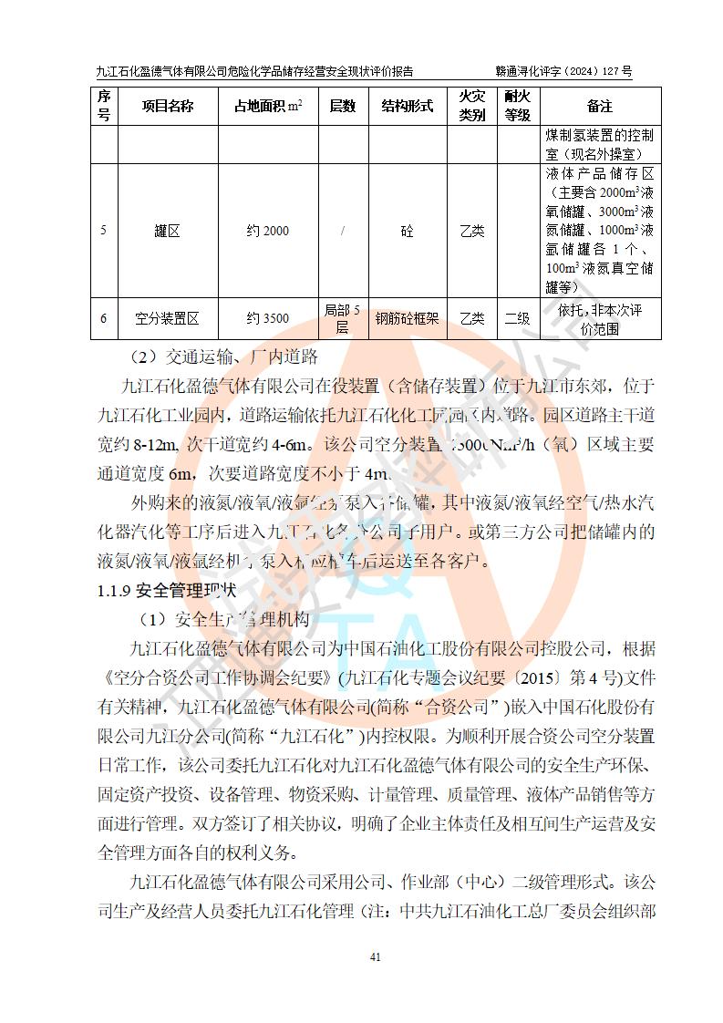 評價結(jié)論 | 九江石化盈德氣體有限公司危險化學品儲存經(jīng)營涉及的儲存裝置符合**產(chǎn)業(yè)政策,主要安全生產(chǎn)經(jīng)營相關(guān)證照齊全。該公司的安全設(shè)施符合**現(xiàn)行法律、法規(guī)和技術(shù)標準、規(guī)范要求。企業(yè)有健全的安全生產(chǎn)管理組織機構(gòu),建立了較為完善的安全生產(chǎn)管理規(guī)章制度,安全管理基本有章可循。評價時儲存裝置和現(xiàn)有安全設(shè)施運行正常、**?,F(xiàn)場儲存裝置與設(shè)計圖紙一致。DCS、TICC等自動化控制系統(tǒng)符合設(shè)計要求并**運行;公司主要負責人、安全管理人員、特殊作業(yè)人員等符合《江西省危險化學品安全專項整治三年行動實施方案》專業(yè)、學歷要求。 綜上所述,該公司危險化學品儲存經(jīng)營涉及的相關(guān)裝置及配套設(shè)施現(xiàn)狀具備了符合**標準規(guī)范要求的安全基本條件,該企業(yè)針對現(xiàn)場提出的安全隱患部分整改到位、企業(yè)采取了相應的安全防范措施和加強了安全管理,該公司危險化學品儲存經(jīng)營風險屬可接受范圍,此次評價范圍內(nèi)的安全現(xiàn)狀符合《危險化學品經(jīng)營許可證管理辦法》規(guī)定的危險化學品儲存經(jīng)營條件,在役儲存裝置風險可控,可滿足危險化學品儲存經(jīng)營條件。 | |||