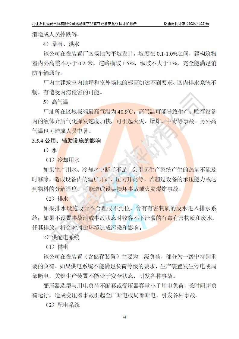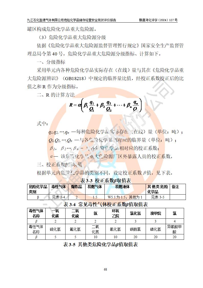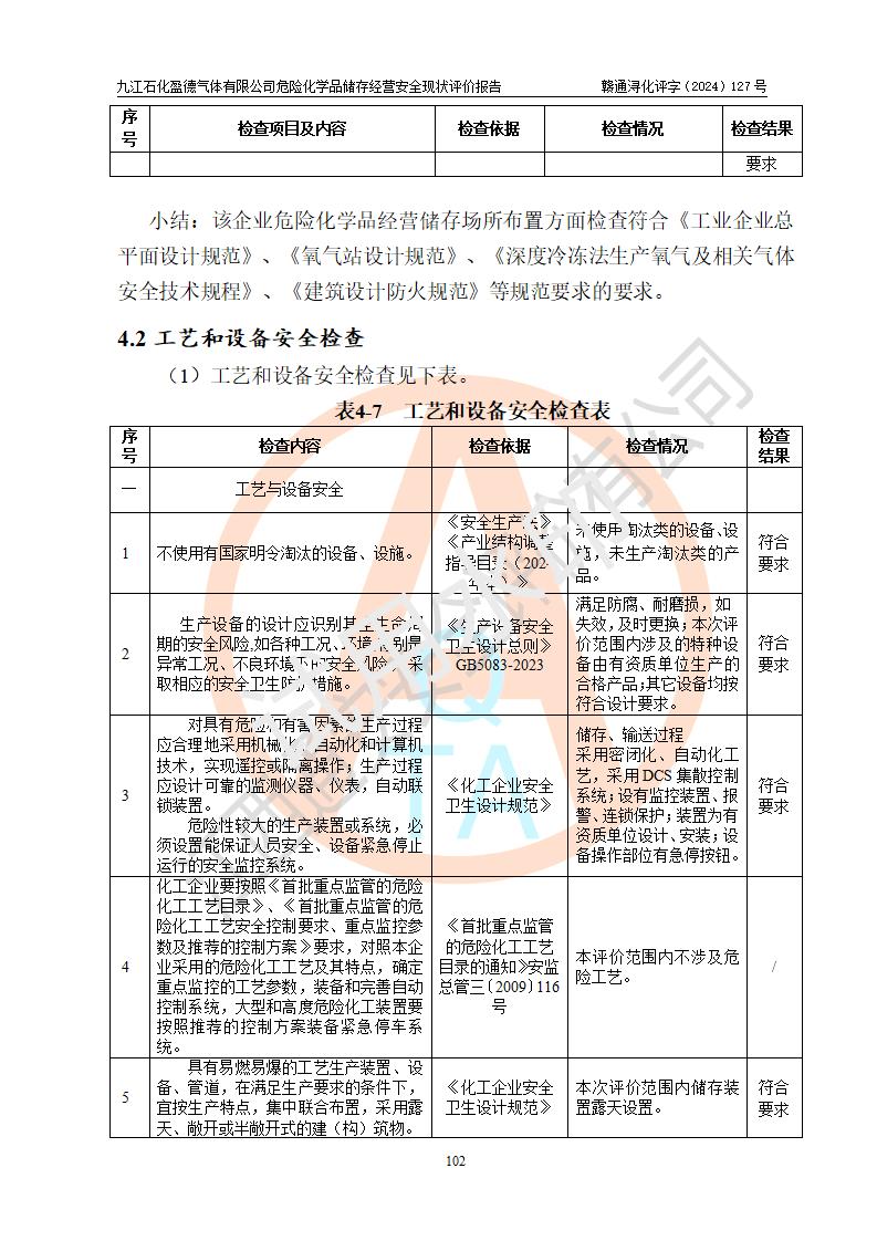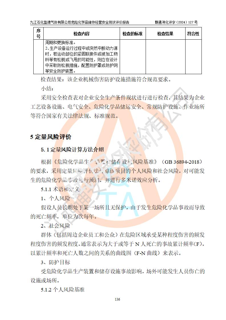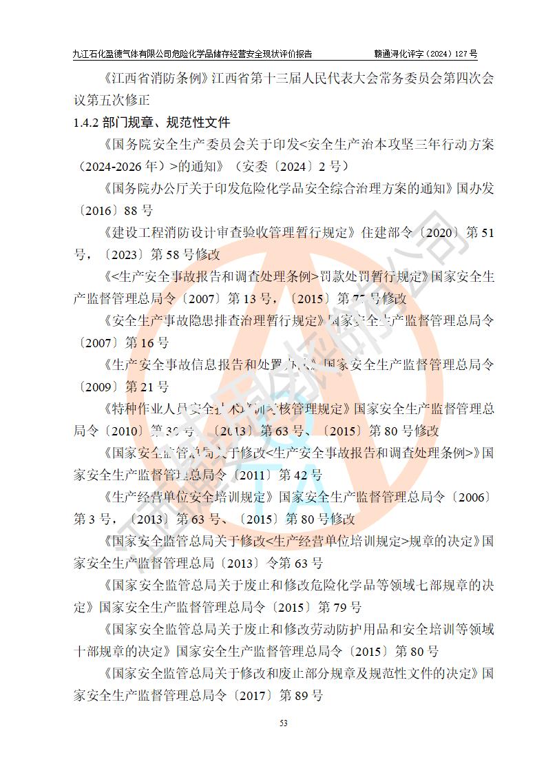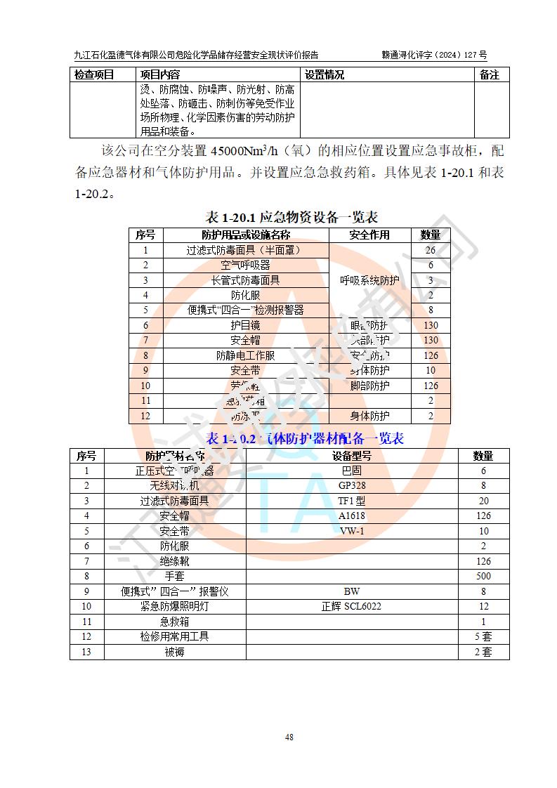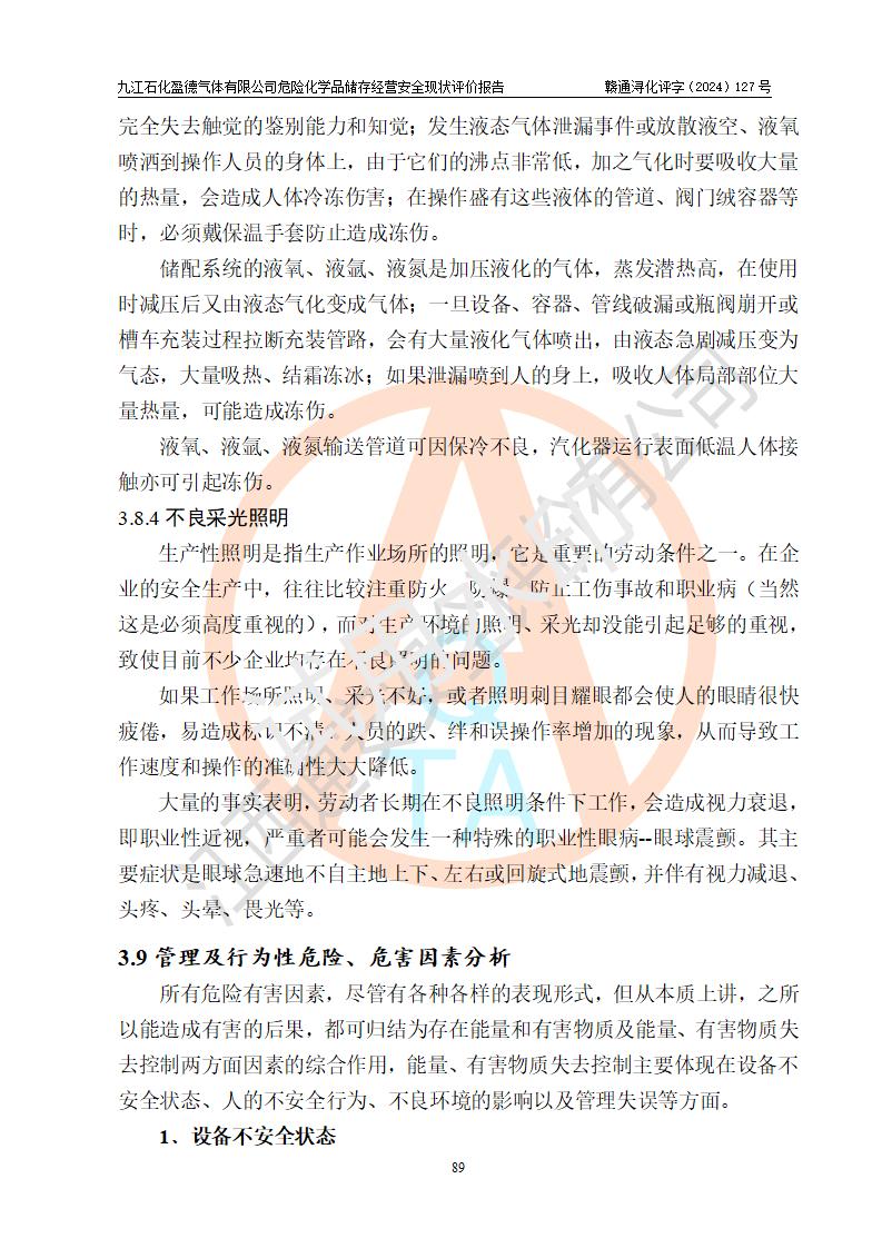 評價結(jié)論 | 九江石化盈德氣體有限公司危險化學品儲存經(jīng)營涉及的儲存裝置符合**產(chǎn)業(yè)政策,主要安全生產(chǎn)經(jīng)營相關(guān)證照齊全。該公司的安全設(shè)施符合**現(xiàn)行法律、法規(guī)和技術(shù)標準、規(guī)范要求。企業(yè)有健全的安全生產(chǎn)管理組織機構(gòu),建立了較為完善的安全生產(chǎn)管理規(guī)章制度,安全管理基本有章可循。評價時儲存裝置和現(xiàn)有安全設(shè)施運行正常、**?,F(xiàn)場儲存裝置與設(shè)計圖紙一致。DCS、TICC等自動化控制系統(tǒng)符合設(shè)計要求并**運行;公司主要負責人、安全管理人員、特殊作業(yè)人員等符合《江西省危險化學品安全專項整治三年行動實施方案》專業(yè)、學歷要求。 綜上所述,該公司危險化學品儲存經(jīng)營涉及的相關(guān)裝置及配套設(shè)施現(xiàn)狀具備了符合**標準規(guī)范要求的安全基本條件,該企業(yè)針對現(xiàn)場提出的安全隱患部分整改到位、企業(yè)采取了相應的安全防范措施和加強了安全管理,該公司危險化學品儲存經(jīng)營風險屬可接受范圍,此次評價范圍內(nèi)的安全現(xiàn)狀符合《危險化學品經(jīng)營許可證管理辦法》規(guī)定的危險化學品儲存經(jīng)營條件,在役儲存裝置風險可控,可滿足危險化學品儲存經(jīng)營條件。 | |||