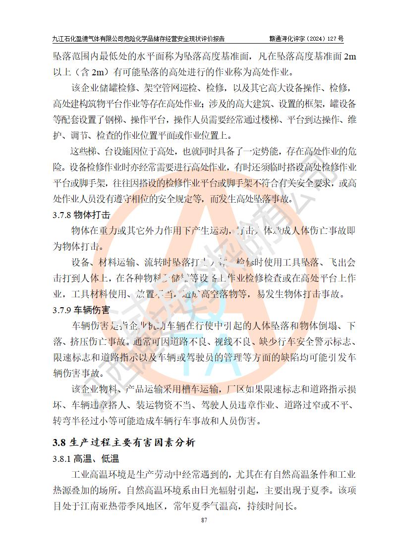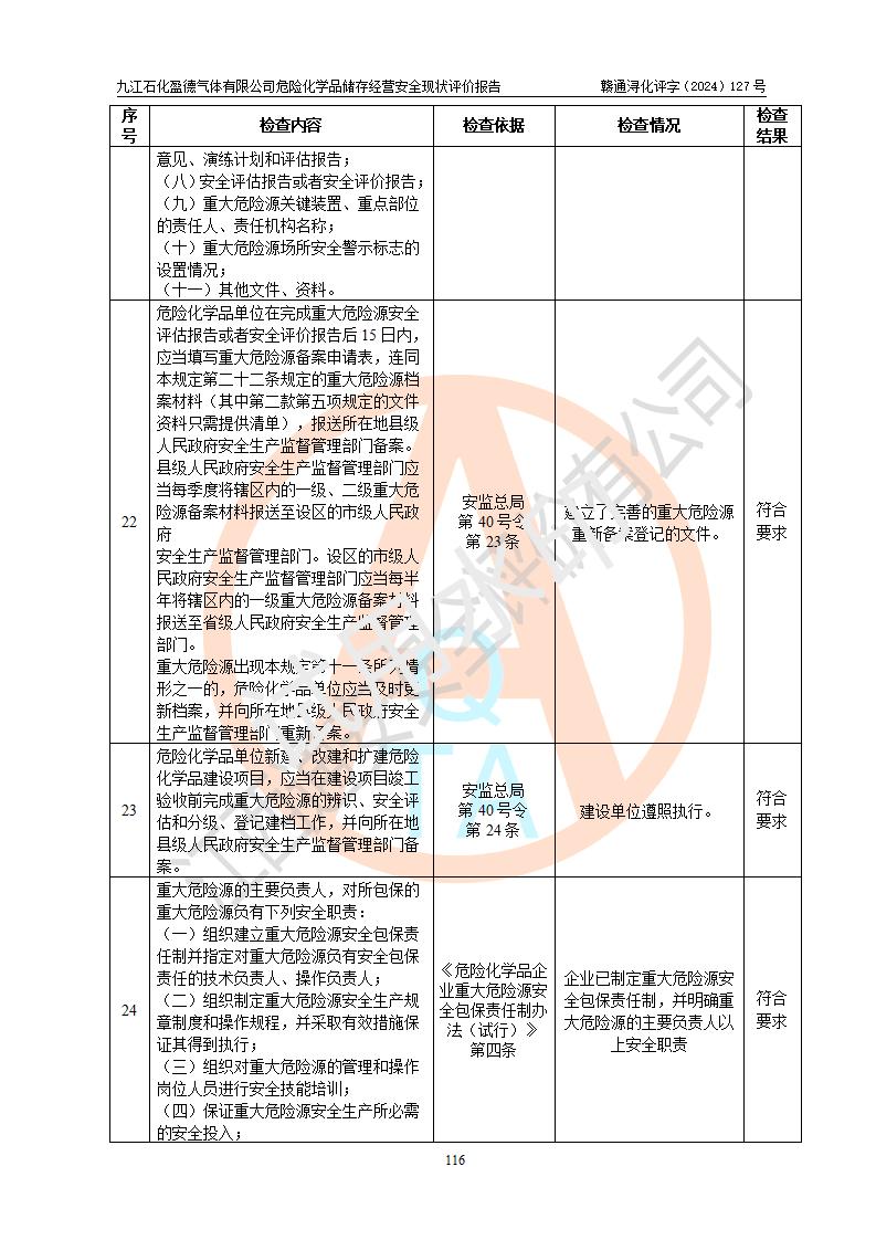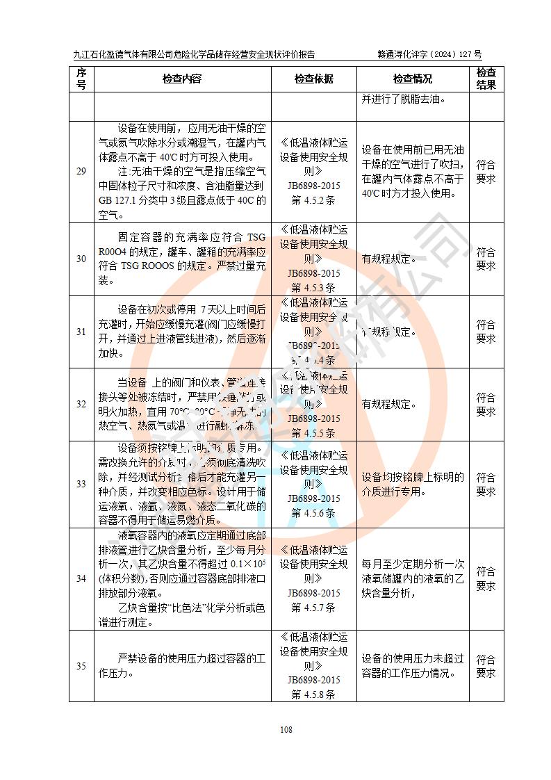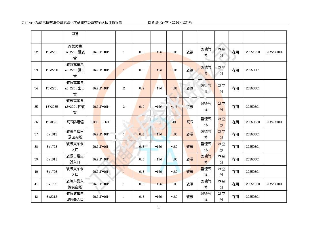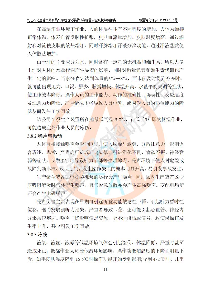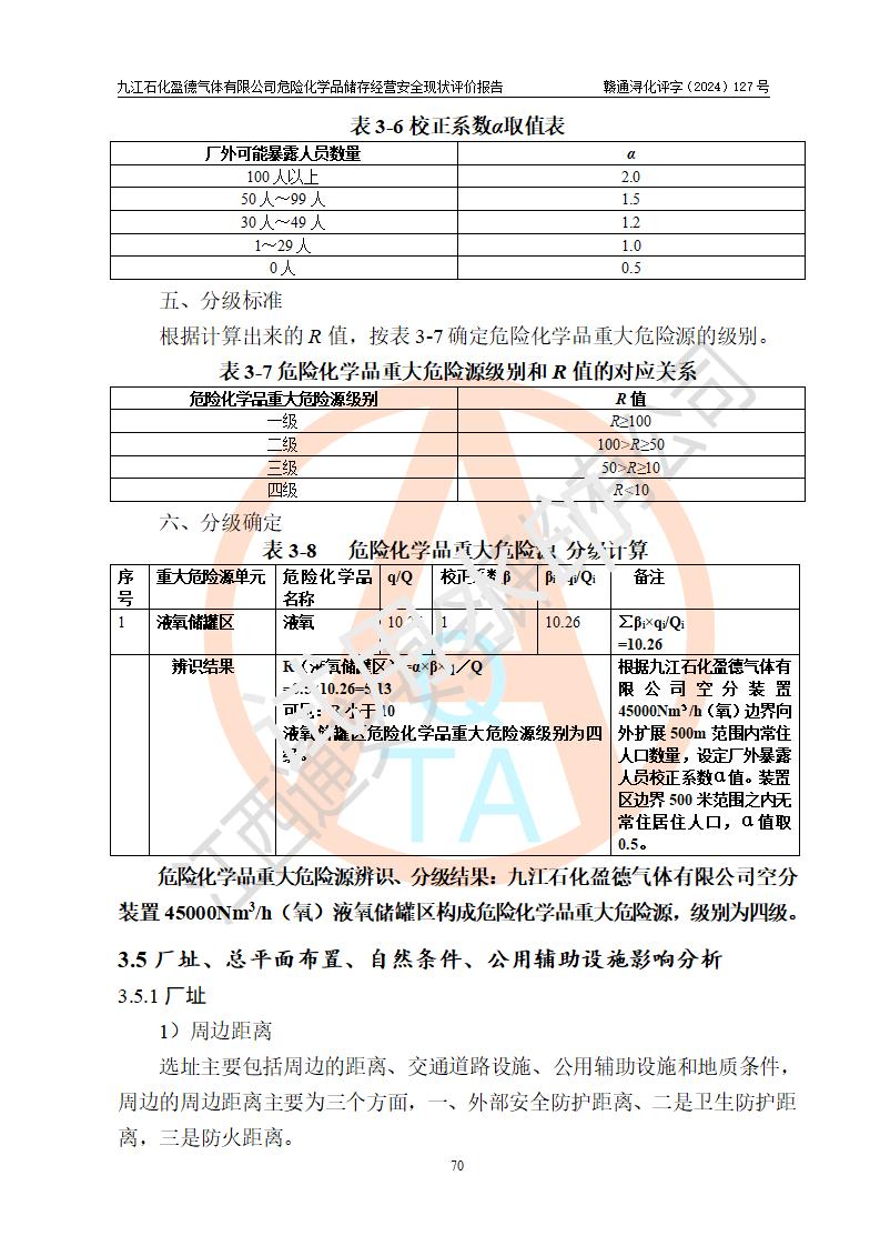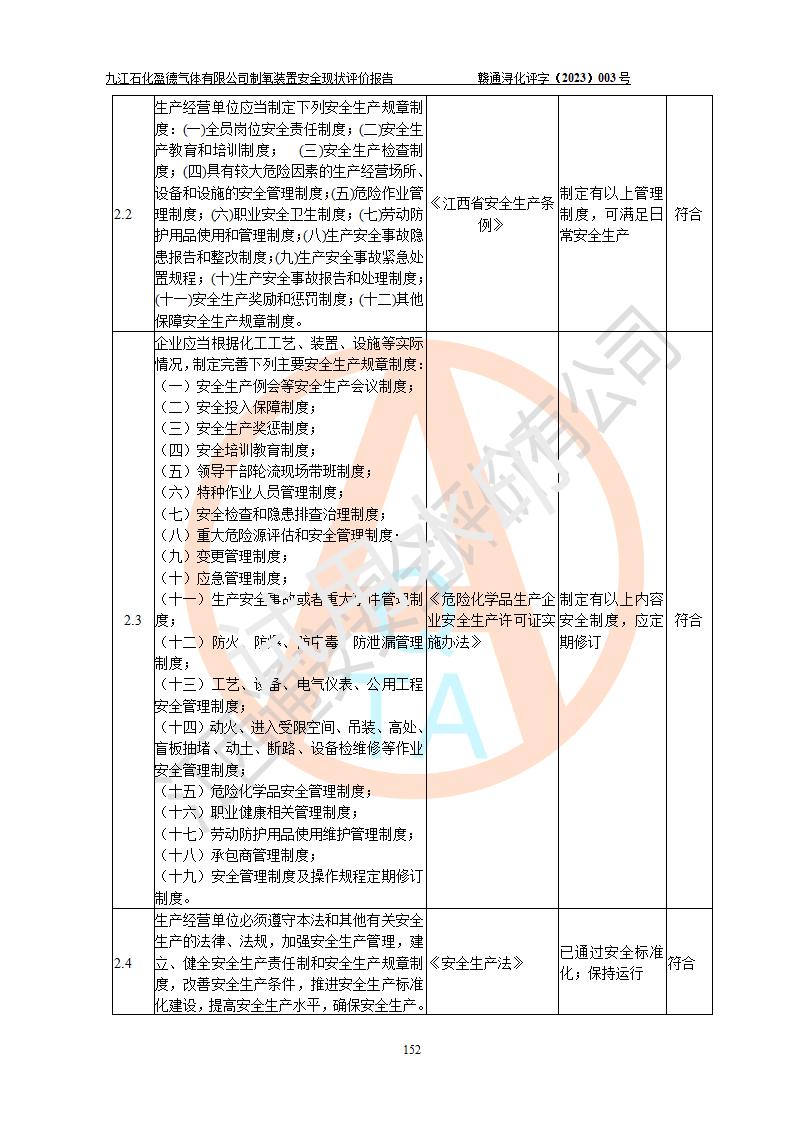 評價結(jié)論 | 九江石化盈德氣體有限公司危險化學品儲存經(jīng)營涉及的儲存裝置符合**產(chǎn)業(yè)政策,主要安全生產(chǎn)經(jīng)營相關(guān)證照齊全。該公司的安全設(shè)施符合**現(xiàn)行法律、法規(guī)和技術(shù)標準、規(guī)范要求。企業(yè)有健全的安全生產(chǎn)管理組織機構(gòu),建立了較為完善的安全生產(chǎn)管理規(guī)章制度,安全管理基本有章可循。評價時儲存裝置和現(xiàn)有安全設(shè)施運行正常、**?,F(xiàn)場儲存裝置與設(shè)計圖紙一致。DCS、TICC等自動化控制系統(tǒng)符合設(shè)計要求并**運行;公司主要負責人、安全管理人員、特殊作業(yè)人員等符合《江西省危險化學品安全專項整治三年行動實施方案》專業(yè)、學歷要求。 綜上所述,該公司危險化學品儲存經(jīng)營涉及的相關(guān)裝置及配套設(shè)施現(xiàn)狀具備了符合**標準規(guī)范要求的安全基本條件,該企業(yè)針對現(xiàn)場提出的安全隱患部分整改到位、企業(yè)采取了相應的安全防范措施和加強了安全管理,該公司危險化學品儲存經(jīng)營風險屬可接受范圍,此次評價范圍內(nèi)的安全現(xiàn)狀符合《危險化學品經(jīng)營許可證管理辦法》規(guī)定的危險化學品儲存經(jīng)營條件,在役儲存裝置風險可控,可滿足危險化學品儲存經(jīng)營條件。 | |||