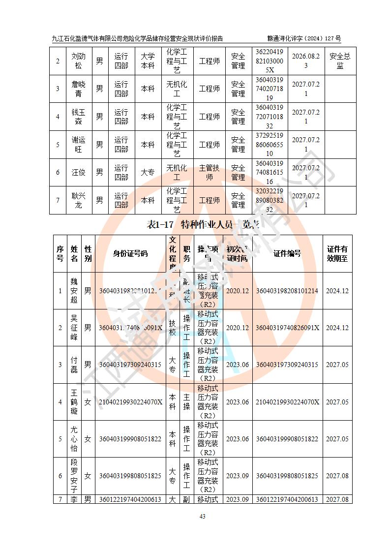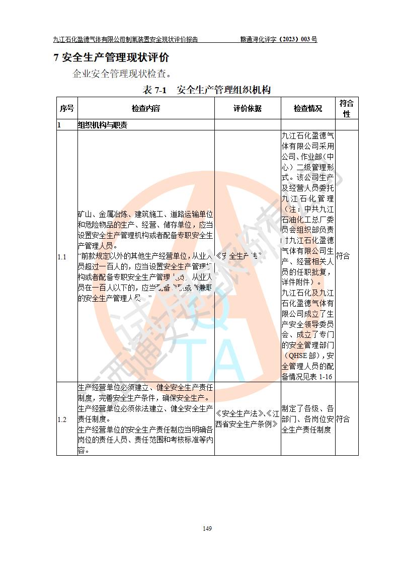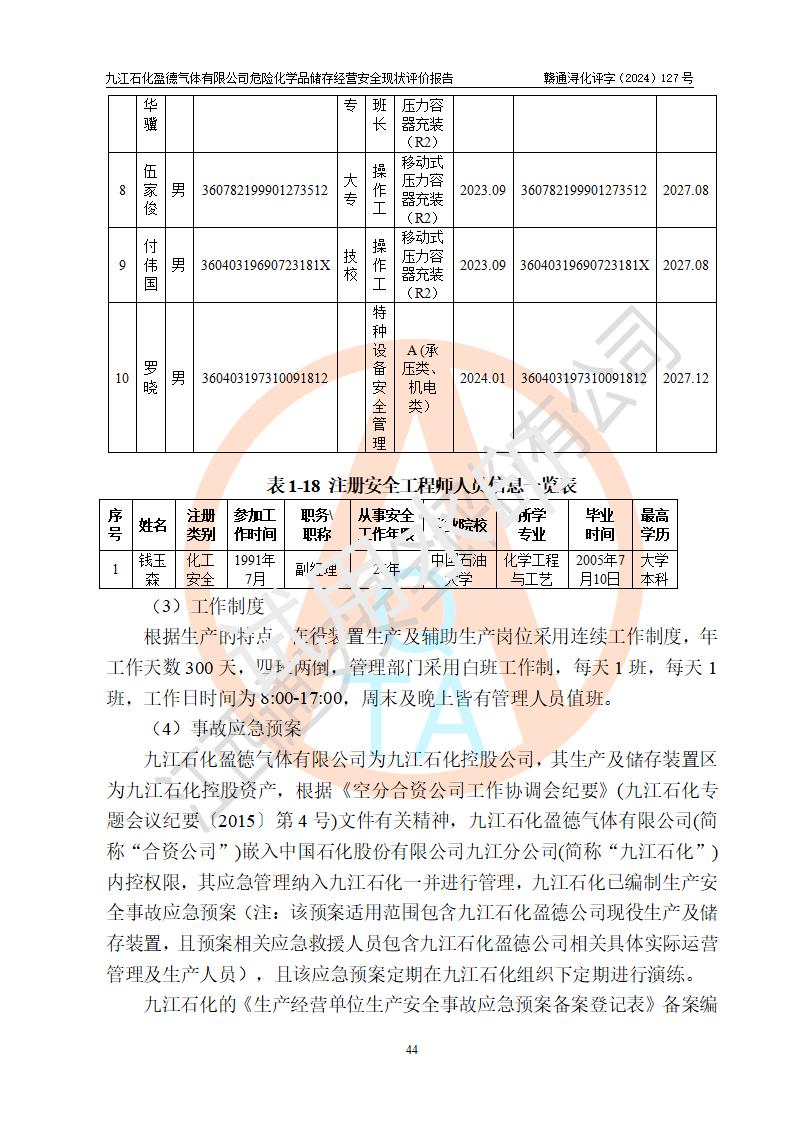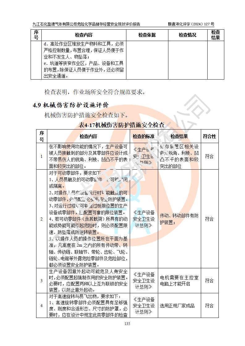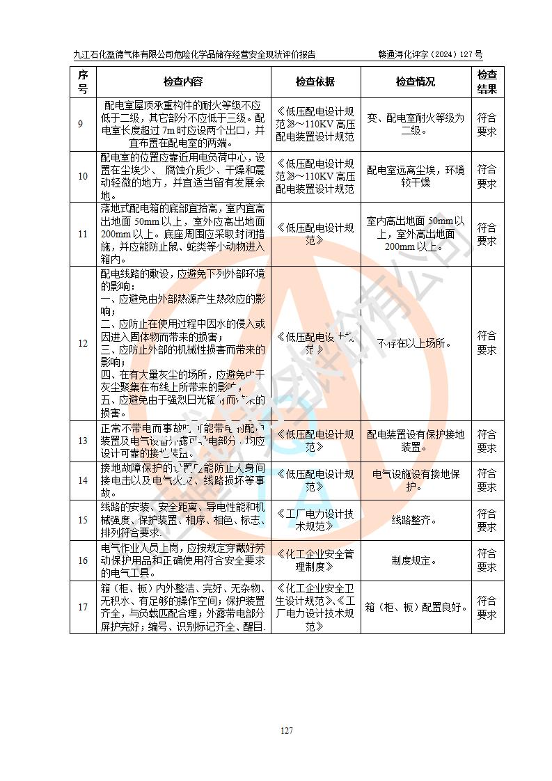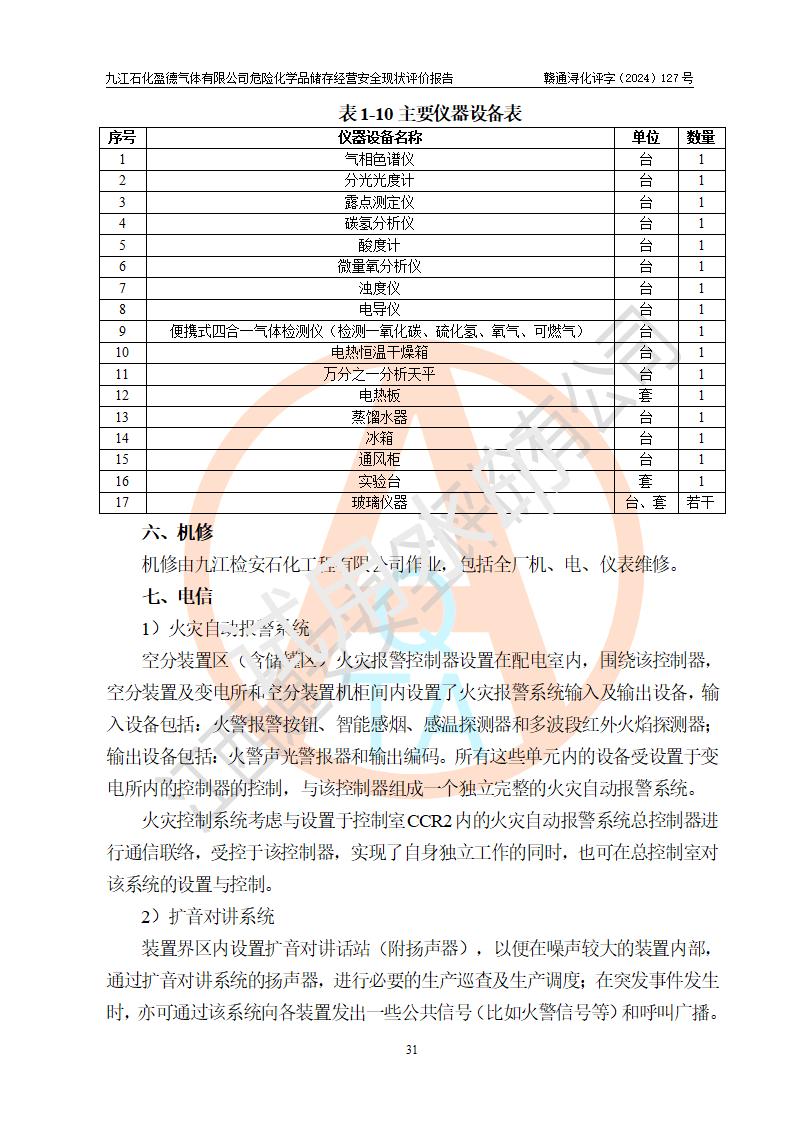 評價結(jié)論 | 九江石化盈德氣體有限公司危險化學品儲存經(jīng)營涉及的儲存裝置符合**產(chǎn)業(yè)政策,主要安全生產(chǎn)經(jīng)營相關(guān)證照齊全。該公司的安全設(shè)施符合**現(xiàn)行法律、法規(guī)和技術(shù)標準、規(guī)范要求。企業(yè)有健全的安全生產(chǎn)管理組織機構(gòu),建立了較為完善的安全生產(chǎn)管理規(guī)章制度,安全管理基本有章可循。評價時儲存裝置和現(xiàn)有安全設(shè)施運行正常、**?,F(xiàn)場儲存裝置與設(shè)計圖紙一致。DCS、TICC等自動化控制系統(tǒng)符合設(shè)計要求并**運行;公司主要負責人、安全管理人員、特殊作業(yè)人員等符合《江西省危險化學品安全專項整治三年行動實施方案》專業(yè)、學歷要求。 綜上所述,該公司危險化學品儲存經(jīng)營涉及的相關(guān)裝置及配套設(shè)施現(xiàn)狀具備了符合**標準規(guī)范要求的安全基本條件,該企業(yè)針對現(xiàn)場提出的安全隱患部分整改到位、企業(yè)采取了相應的安全防范措施和加強了安全管理,該公司危險化學品儲存經(jīng)營風險屬可接受范圍,此次評價范圍內(nèi)的安全現(xiàn)狀符合《危險化學品經(jīng)營許可證管理辦法》規(guī)定的危險化學品儲存經(jīng)營條件,在役儲存裝置風險可控,可滿足危險化學品儲存經(jīng)營條件。 | |||