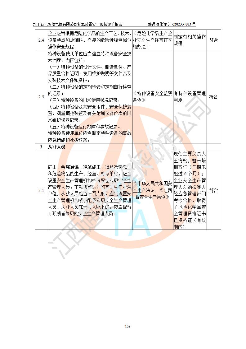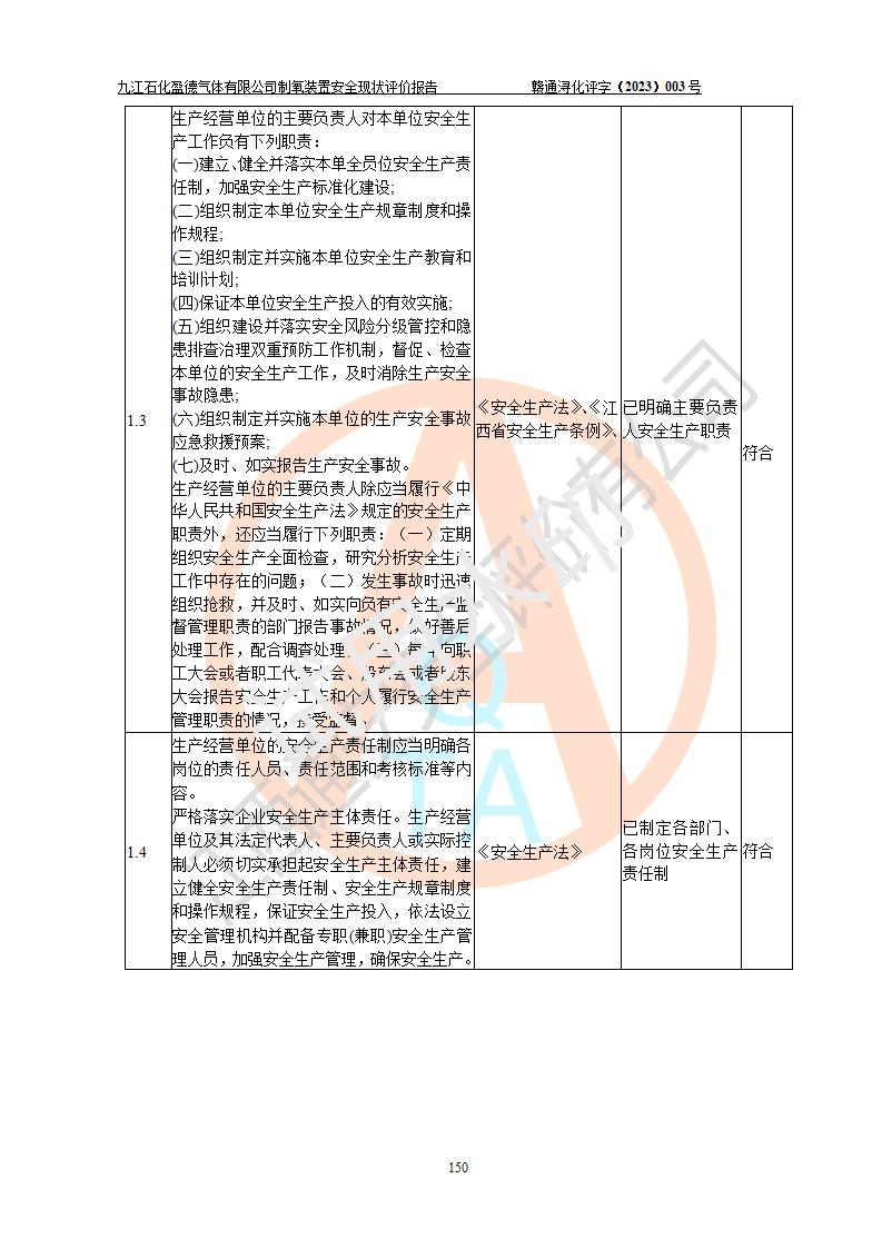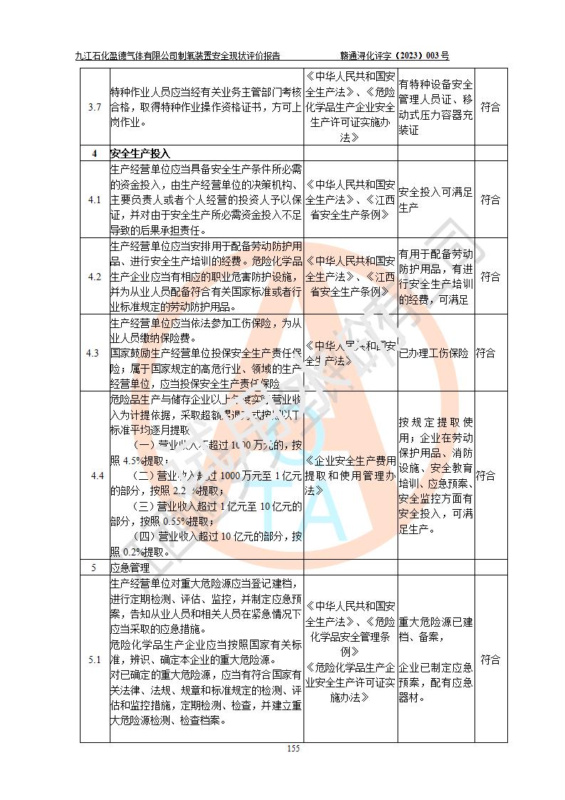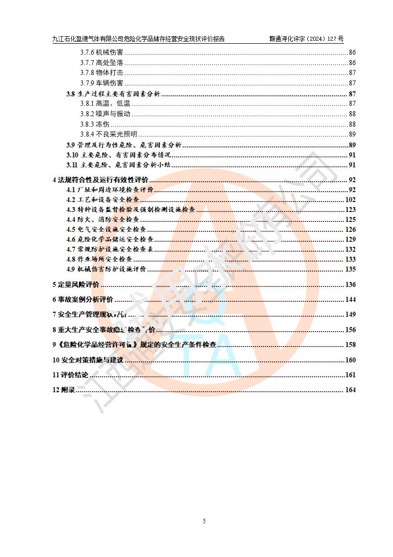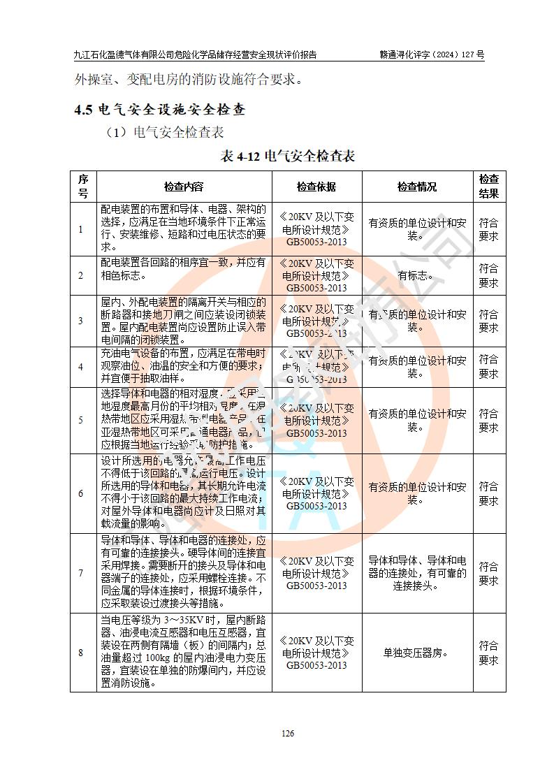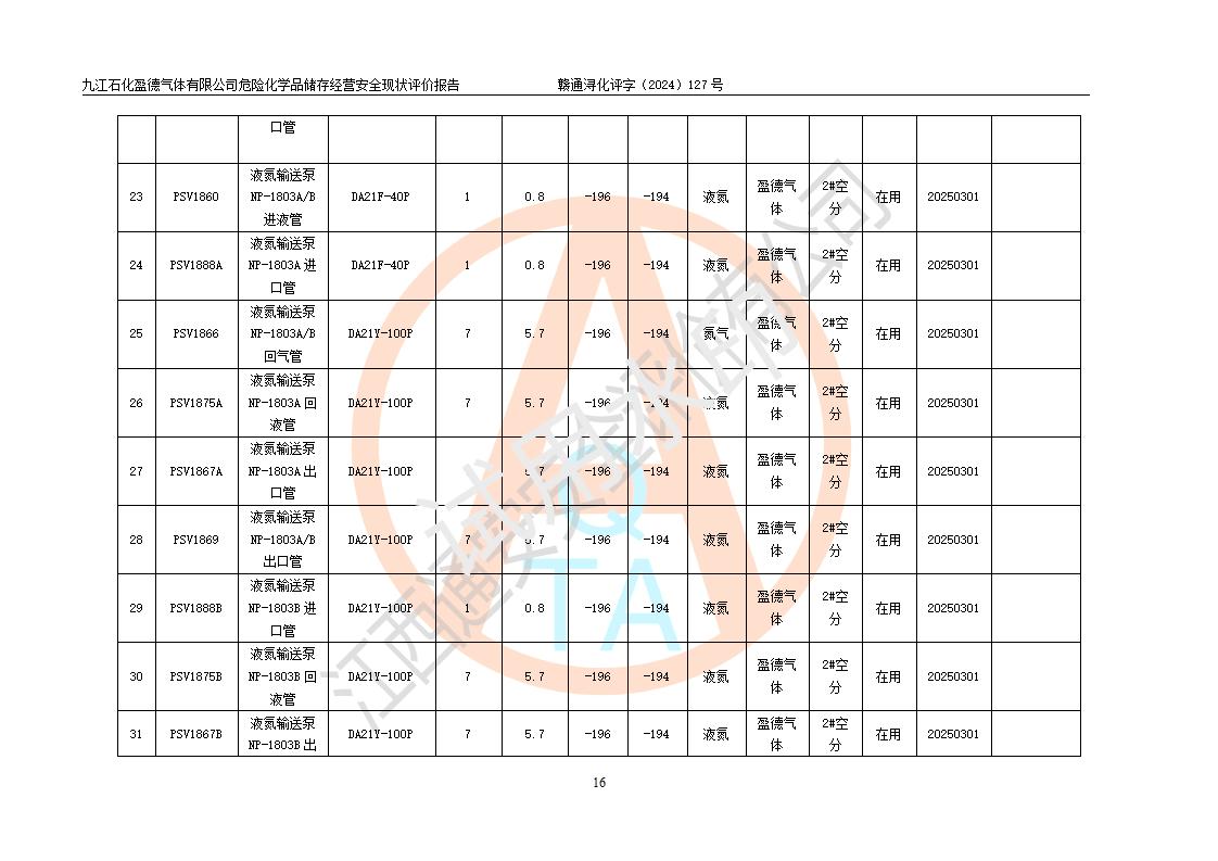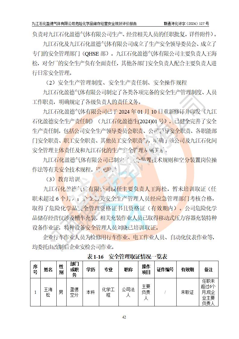 評價結(jié)論 | 九江石化盈德氣體有限公司危險化學品儲存經(jīng)營涉及的儲存裝置符合**產(chǎn)業(yè)政策,主要安全生產(chǎn)經(jīng)營相關(guān)證照齊全。該公司的安全設(shè)施符合**現(xiàn)行法律、法規(guī)和技術(shù)標準、規(guī)范要求。企業(yè)有健全的安全生產(chǎn)管理組織機構(gòu),建立了較為完善的安全生產(chǎn)管理規(guī)章制度,安全管理基本有章可循。評價時儲存裝置和現(xiàn)有安全設(shè)施運行正常、**?,F(xiàn)場儲存裝置與設(shè)計圖紙一致。DCS、TICC等自動化控制系統(tǒng)符合設(shè)計要求并**運行;公司主要負責人、安全管理人員、特殊作業(yè)人員等符合《江西省危險化學品安全專項整治三年行動實施方案》專業(yè)、學歷要求。 綜上所述,該公司危險化學品儲存經(jīng)營涉及的相關(guān)裝置及配套設(shè)施現(xiàn)狀具備了符合**標準規(guī)范要求的安全基本條件,該企業(yè)針對現(xiàn)場提出的安全隱患部分整改到位、企業(yè)采取了相應的安全防范措施和加強了安全管理,該公司危險化學品儲存經(jīng)營風險屬可接受范圍,此次評價范圍內(nèi)的安全現(xiàn)狀符合《危險化學品經(jīng)營許可證管理辦法》規(guī)定的危險化學品儲存經(jīng)營條件,在役儲存裝置風險可控,可滿足危險化學品儲存經(jīng)營條件。 | |||