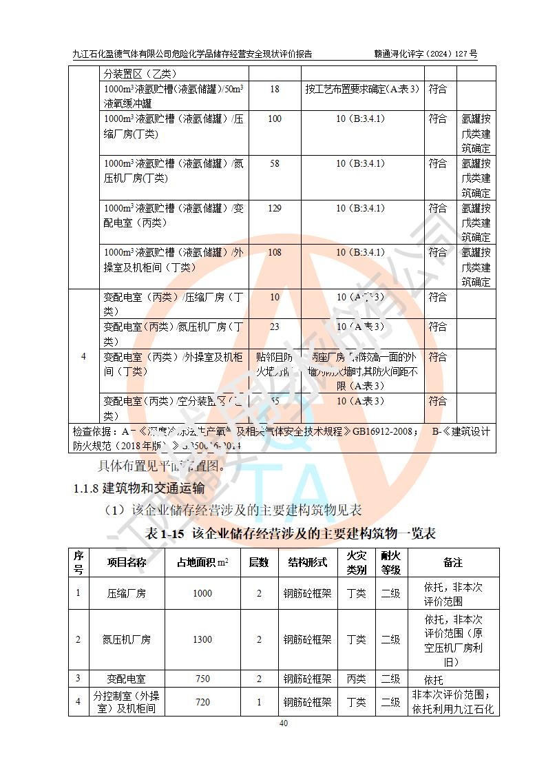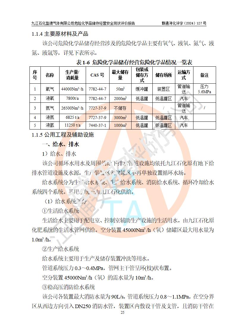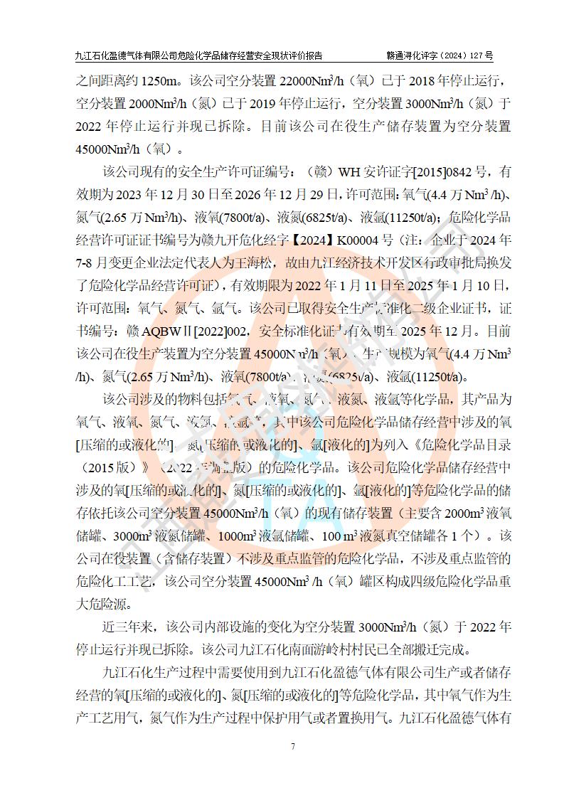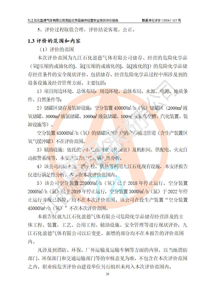 項目簡介 | 九江石化盈德氣體有限公司(以下簡稱“九江石化盈德”),成立于2014年08月15日,位于江西省九江市潯陽區(qū)石化工業(yè)園濱江東路228號。公司類型: 其他有限責任公司,經(jīng)營范圍:制造和銷售氧氣、氮氣、氬氣等;氣體設(shè)備銷售和租賃;氣體產(chǎn)品技術(shù)開發(fā)、咨詢服務(wù)(依法須經(jīng)批準的項目,經(jīng)相關(guān)部門批準后方可開展經(jīng)營活動)**。該公司涉及的物料包括氧氣、液氧、氮氣、液氮、液氬等化學品,其產(chǎn)品為氧氣、液氧、氮氣、液氮、液氬等,其中該公司危險化學品儲存經(jīng)營中涉及的氧[壓縮的或液化的]、氮[壓縮的或液化的]、氬[液化的]為列入《危險化學品目錄(2015版)》(2022年調(diào)整版)的危險化學品。該公司危險化學品儲存經(jīng)營中涉及的氧[壓縮的或液化的]、氮[壓縮的或液化的]、氬[液化的]等危險化學品的儲存依托該公司空分裝置45000Nm3/h(氧)的現(xiàn)有儲存裝置(主要含2000m3液氧儲罐、3000m3液氮儲罐、1000m3液氬儲罐、100 m3液氮真空儲罐各1個)。根據(jù)《中華人民共和國安全生產(chǎn)法》、《危險化學品經(jīng)營許可證管理辦法》和《危險化學品安全管理條例》等法律法規(guī)的有關(guān)要求,九江石化盈德氣體有限公司的危險化學品經(jīng)營許可證**期將屆滿,因需要延期換證而進行安全現(xiàn)狀評價。 | |||