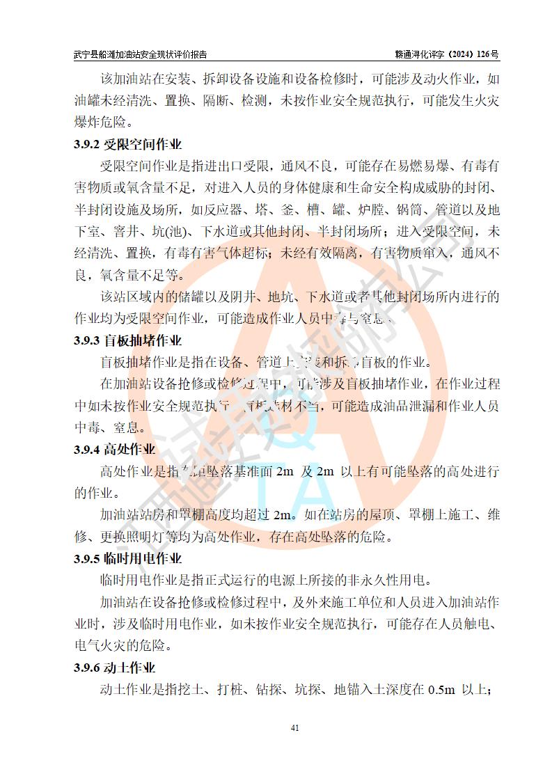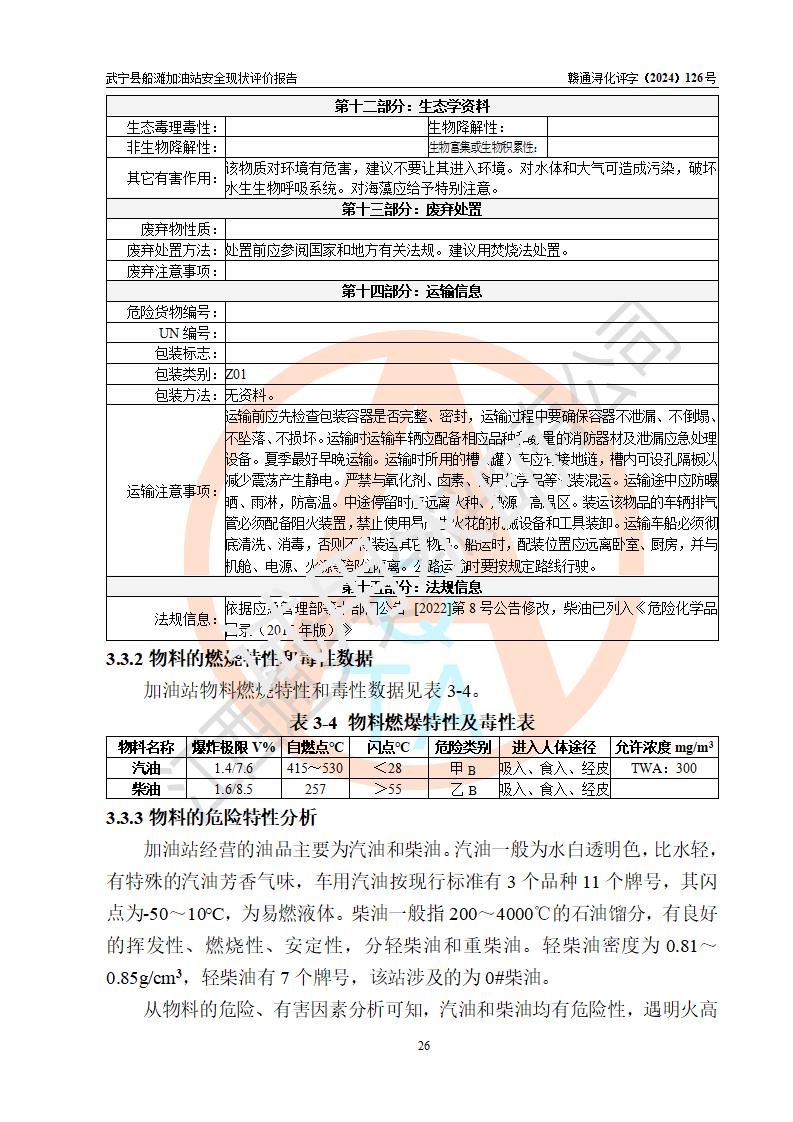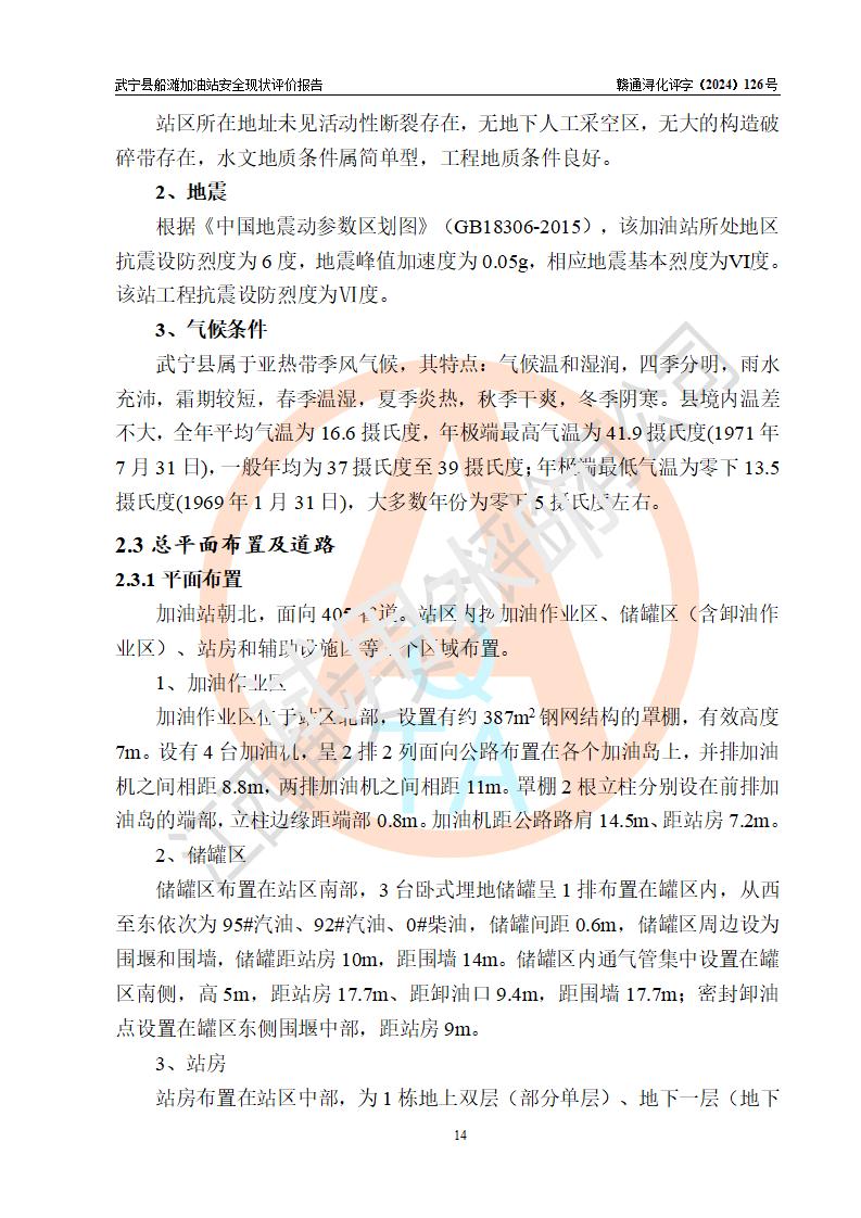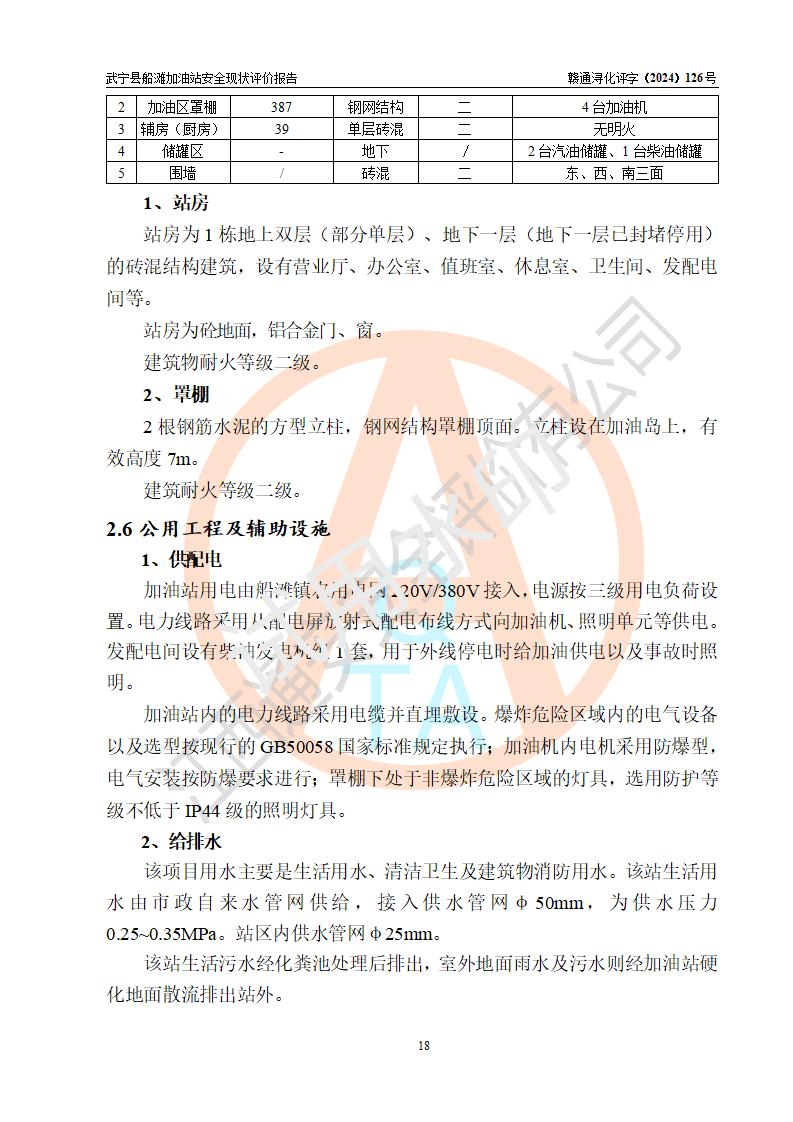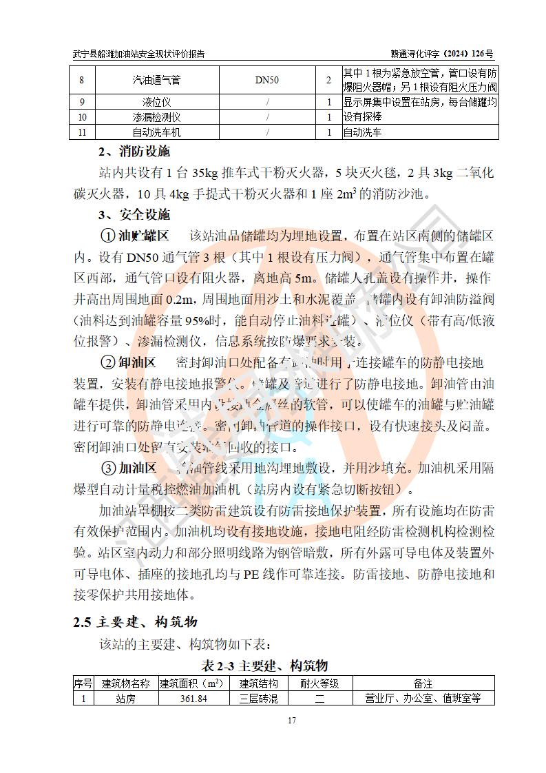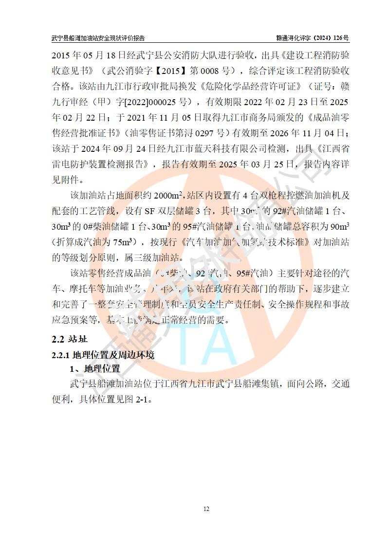 項(xiàng)目簡(jiǎn)介 | 武寧縣船灘加油站是一家專門從事成品油零售經(jīng)營(yíng)的個(gè)體工商戶,經(jīng)營(yíng)場(chǎng)所位于江西省九江市武寧縣船灘集鎮(zhèn)?,F(xiàn)有從業(yè)人員7名,其中安全管理人員1人,加油站負(fù)責(zé)人華瑞。 該加油站占地面積約2000m2,站區(qū)內(nèi)設(shè)置有4臺(tái)雙槍程控燃油加油機(jī)及配套的工藝管線,設(shè)有SF雙層儲(chǔ)罐3臺(tái),其中30m3的92#汽油儲(chǔ)罐1臺(tái)、30m3的0#柴油儲(chǔ)罐1臺(tái)、30m3的95#汽油儲(chǔ)罐1臺(tái),油品儲(chǔ)罐總?cè)莘e為90m3(折算成汽油為75m3),按現(xiàn)行《汽車加油加氣加氫站技術(shù)標(biāo)準(zhǔn)》對(duì)加油站的等級(jí)劃分原則,屬三級(jí)加油站。 該站由九江市行政審批局換發(fā)《危險(xiǎn)化學(xué)品經(jīng)營(yíng)許可證》(證號(hào):贛九行審經(jīng)(甲)字[2022]000025號(hào)),**期限2022年02月23日至2025年02月22日。 | |||