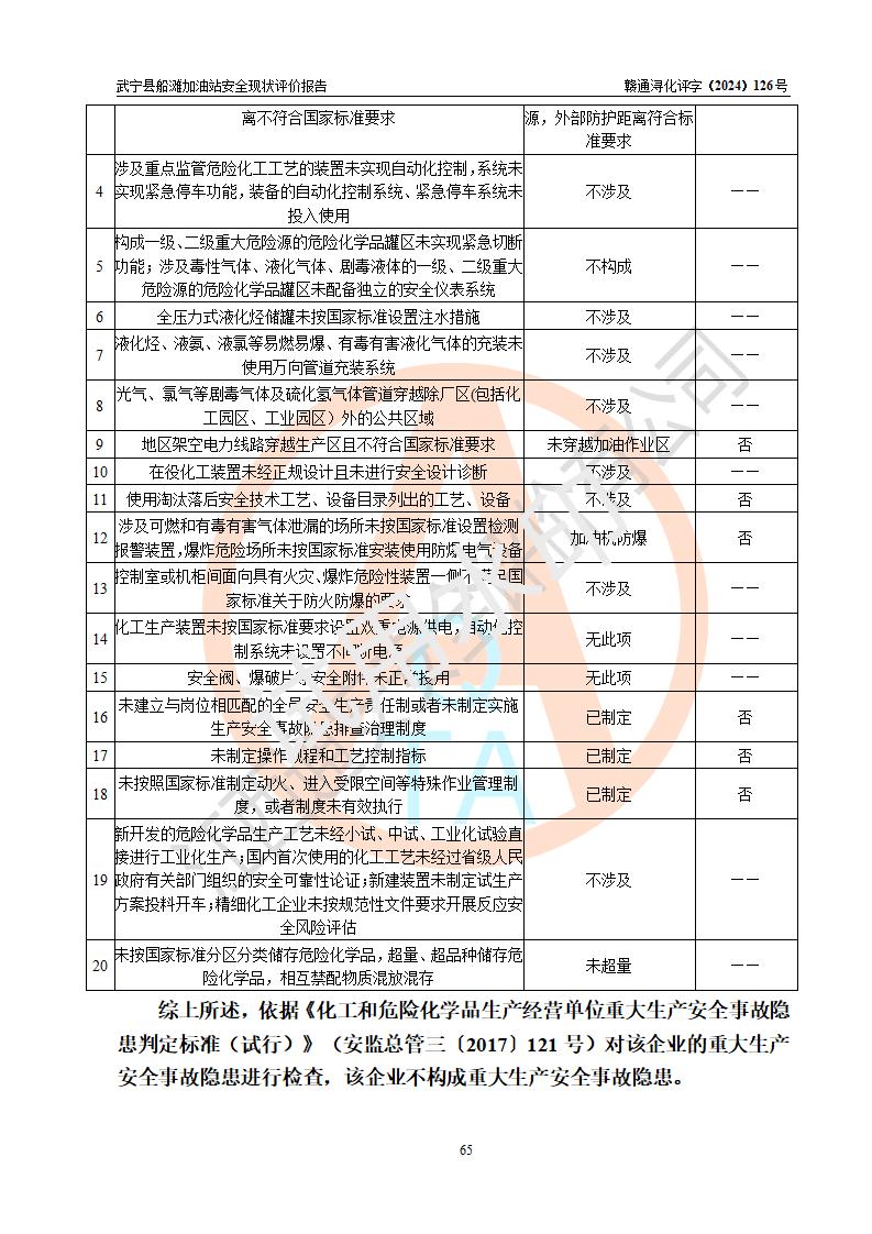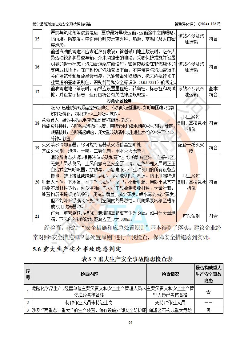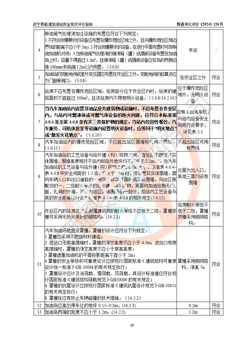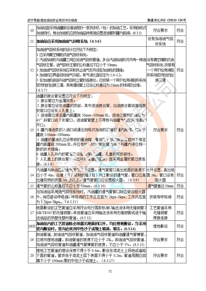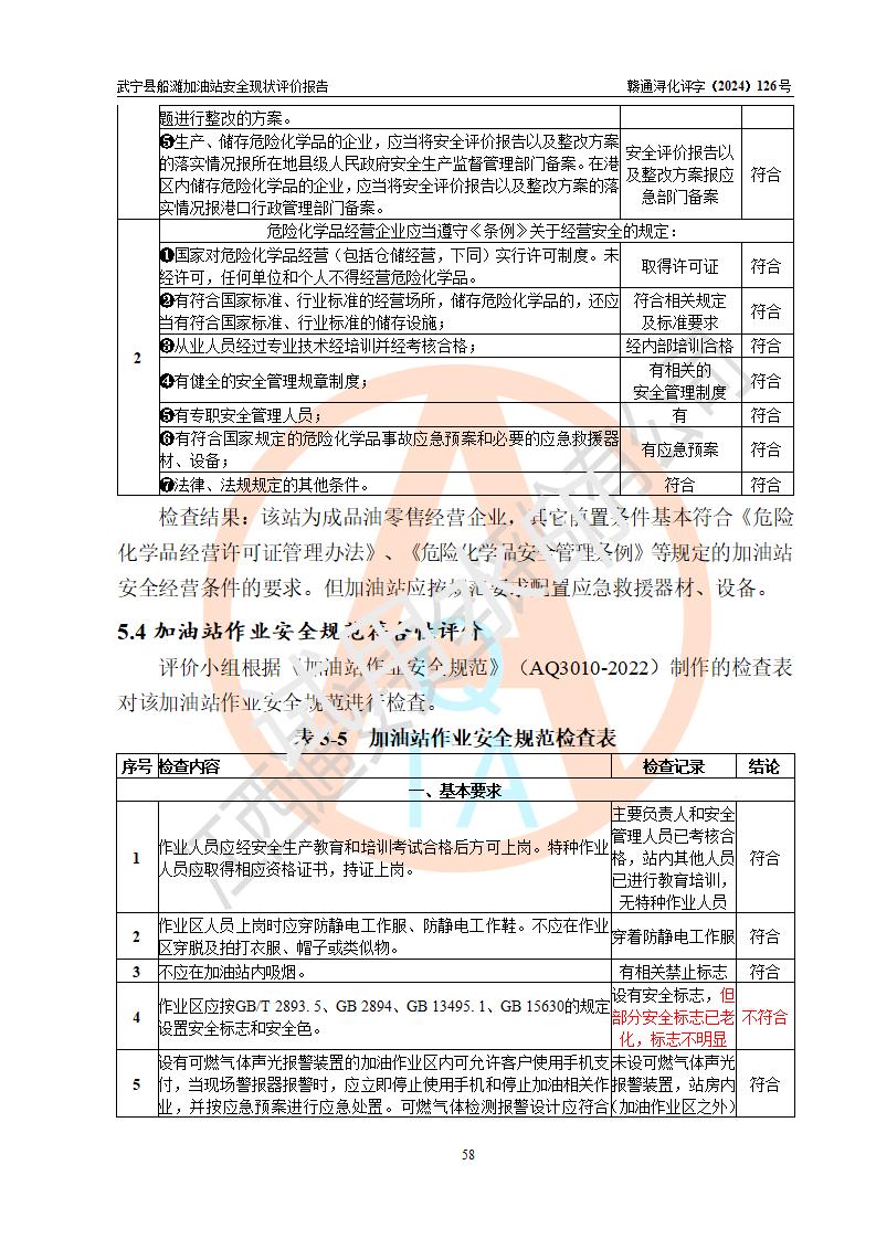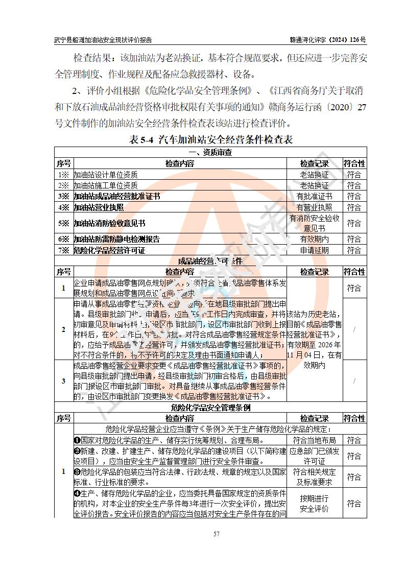 評(píng)價(jià)結(jié)論 | 武寧縣船灘加油站涉及的安全條件、安全經(jīng)營(yíng)條件、安全生產(chǎn)管理符合《危險(xiǎn)化學(xué)品經(jīng)營(yíng)許可證管理辦法》、《汽車加油加氣加氫站技術(shù)標(biāo)準(zhǔn)》等**有關(guān)法規(guī)、標(biāo)準(zhǔn)、規(guī)范要求,能滿足危險(xiǎn)化學(xué)品經(jīng)營(yíng)安全條件。 | |||