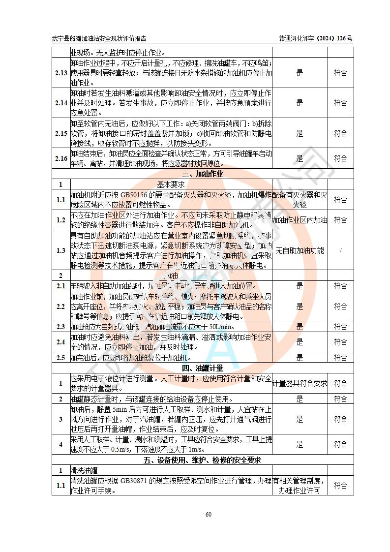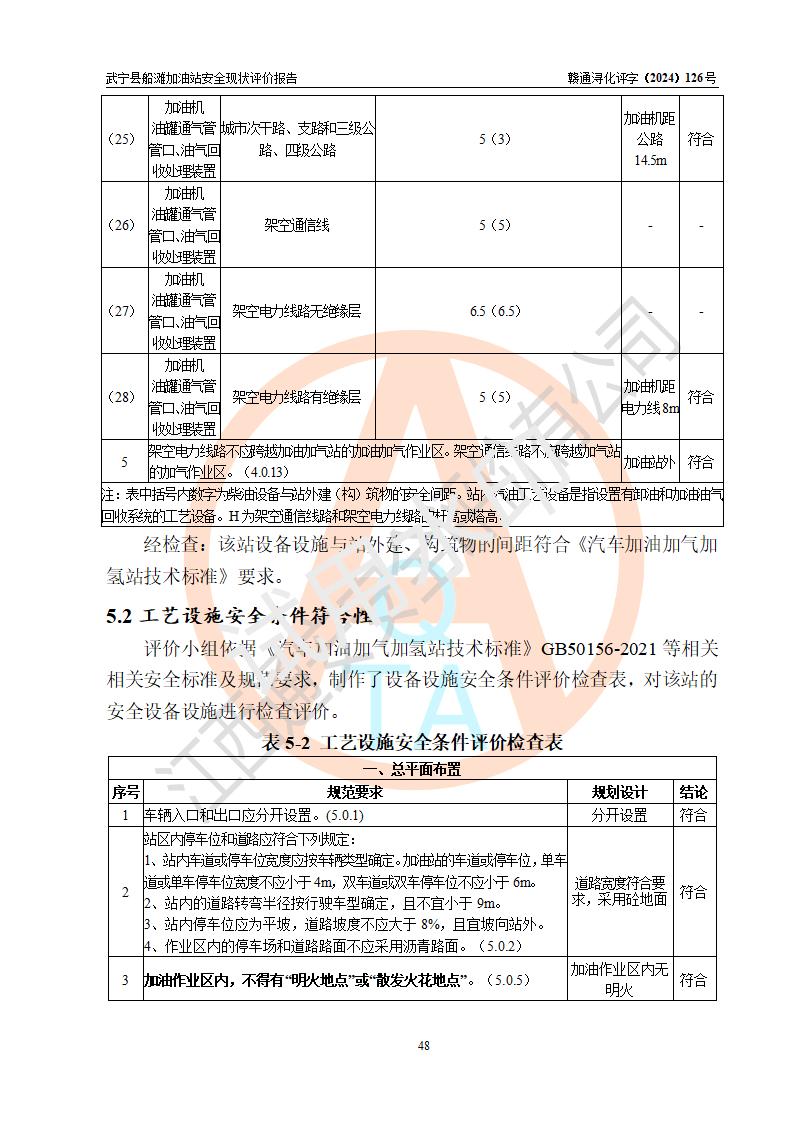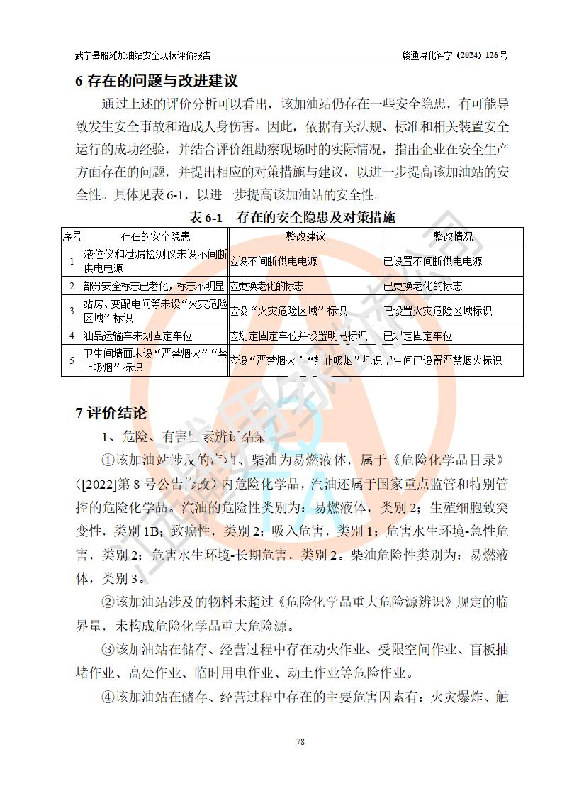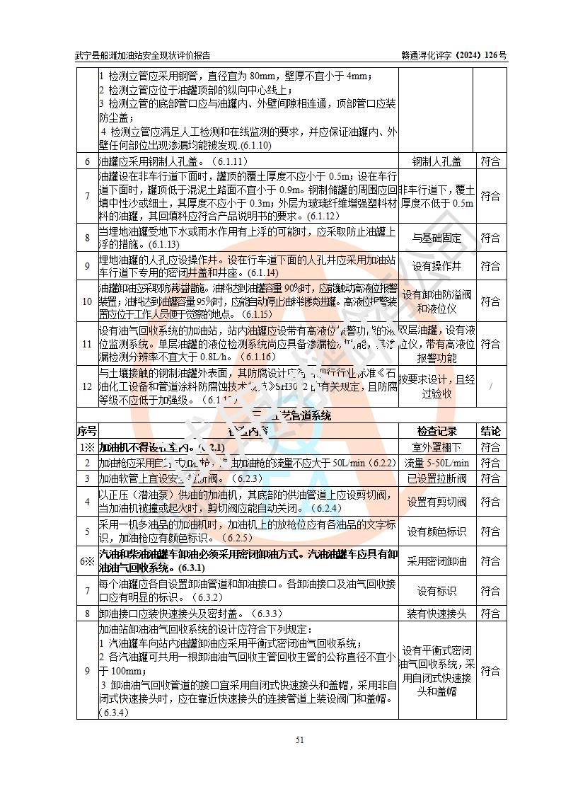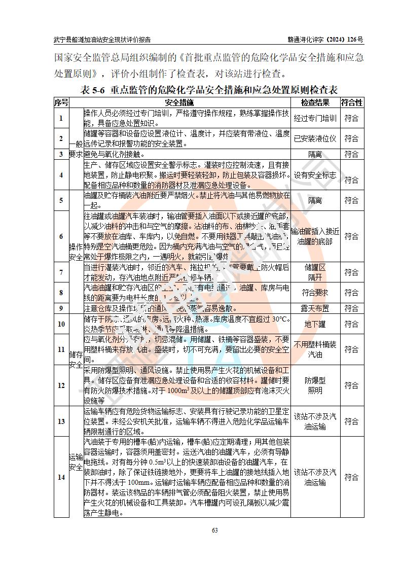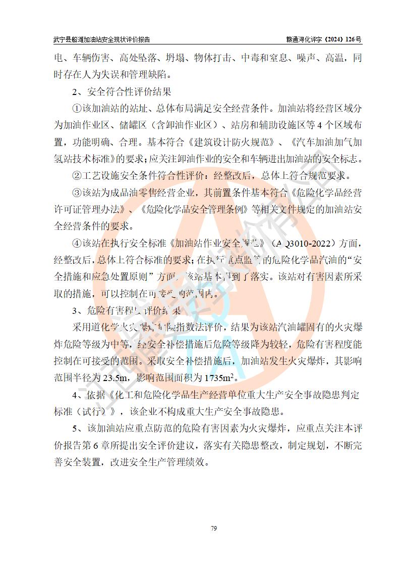 評(píng)價(jià)結(jié)論 | 武寧縣船灘加油站涉及的安全條件、安全經(jīng)營(yíng)條件、安全生產(chǎn)管理符合《危險(xiǎn)化學(xué)品經(jīng)營(yíng)許可證管理辦法》、《汽車加油加氣加氫站技術(shù)標(biāo)準(zhǔn)》等**有關(guān)法規(guī)、標(biāo)準(zhǔn)、規(guī)范要求,能滿足危險(xiǎn)化學(xué)品經(jīng)營(yíng)安全條件。 | |||