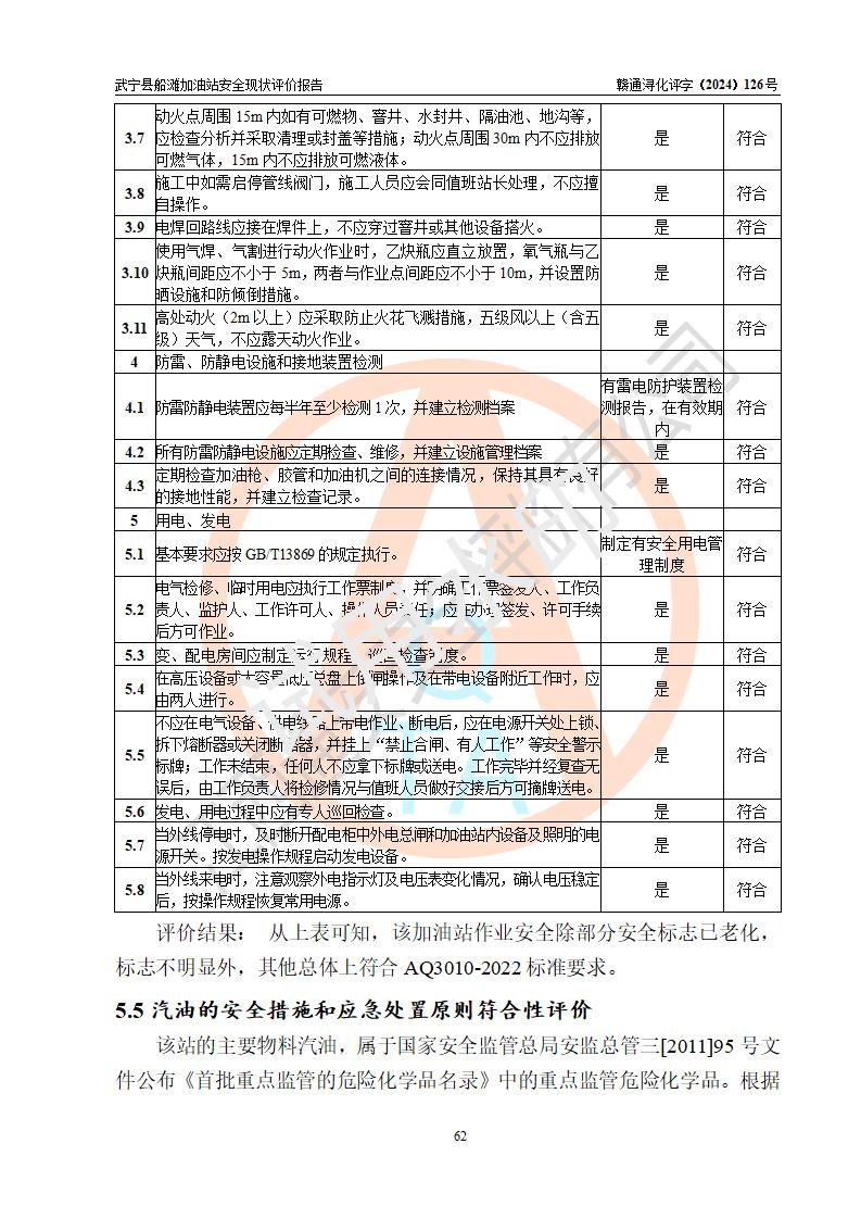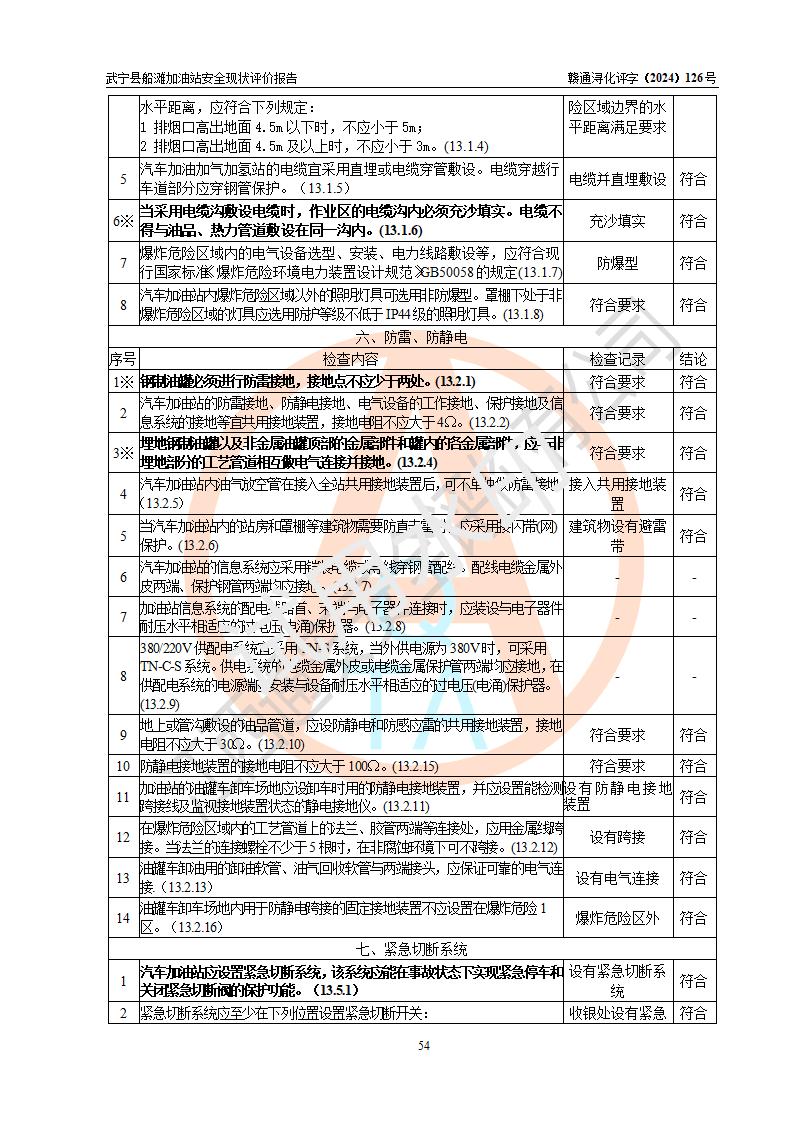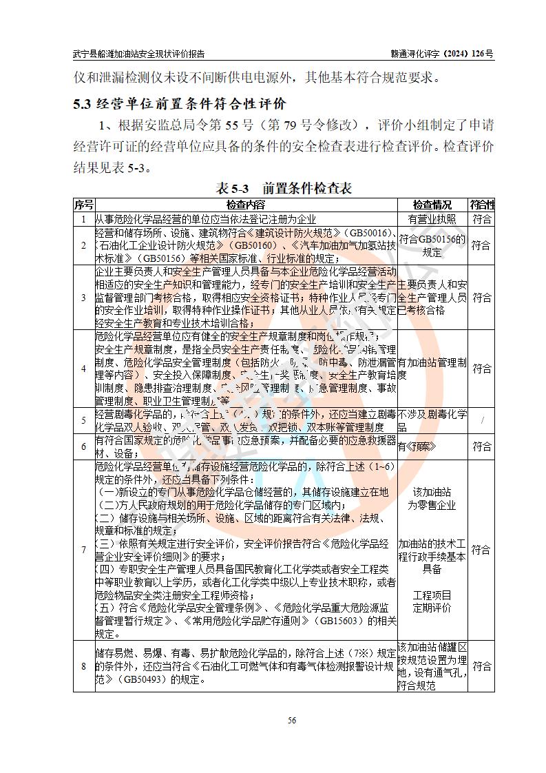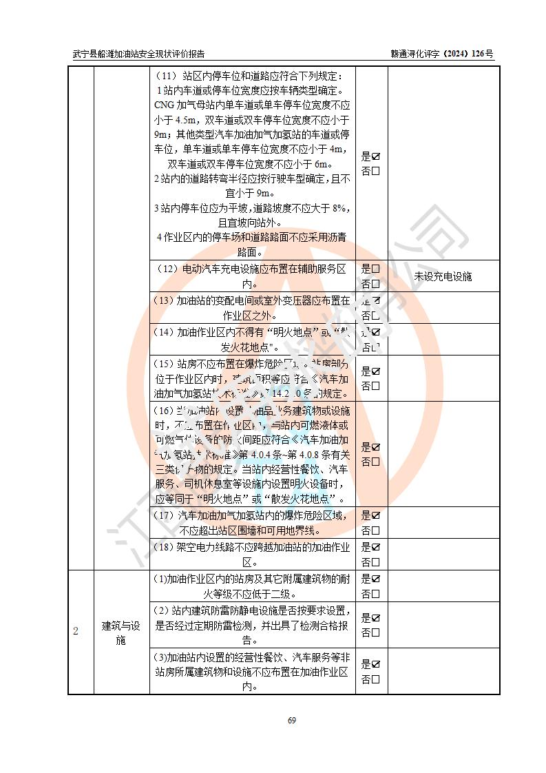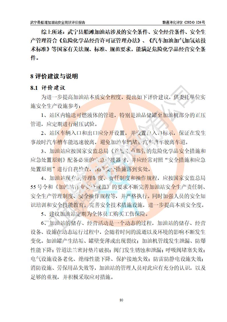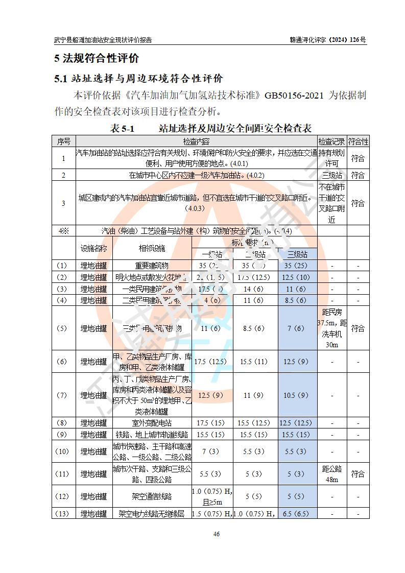 評(píng)價(jià)結(jié)論 | 武寧縣船灘加油站涉及的安全條件、安全經(jīng)營(yíng)條件、安全生產(chǎn)管理符合《危險(xiǎn)化學(xué)品經(jīng)營(yíng)許可證管理辦法》、《汽車加油加氣加氫站技術(shù)標(biāo)準(zhǔn)》等**有關(guān)法規(guī)、標(biāo)準(zhǔn)、規(guī)范要求,能滿足危險(xiǎn)化學(xué)品經(jīng)營(yíng)安全條件。 | |||