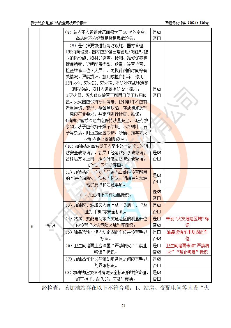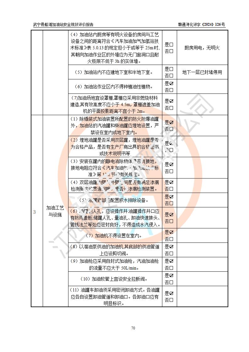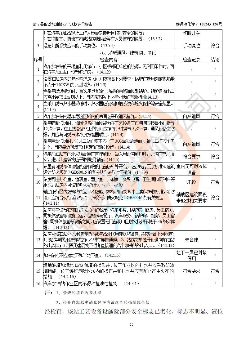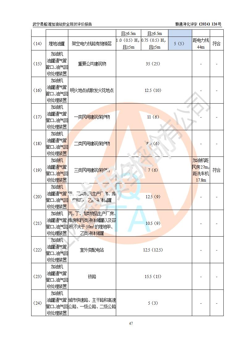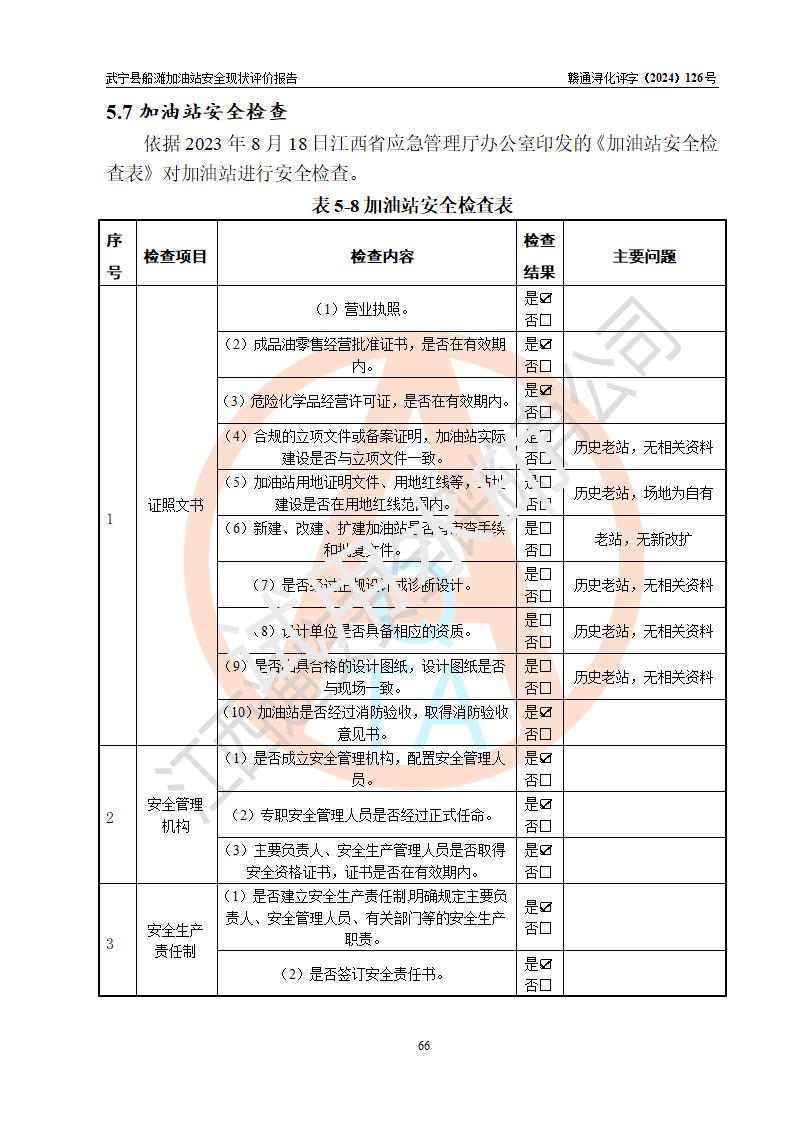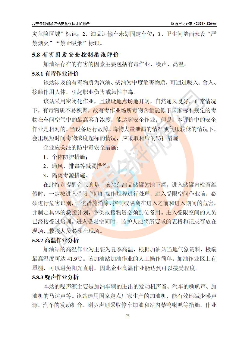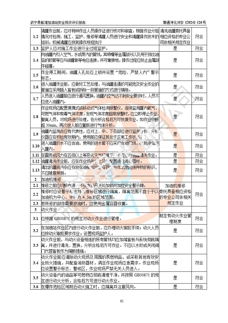 評(píng)價(jià)結(jié)論 | 武寧縣船灘加油站涉及的安全條件、安全經(jīng)營(yíng)條件、安全生產(chǎn)管理符合《危險(xiǎn)化學(xué)品經(jīng)營(yíng)許可證管理辦法》、《汽車加油加氣加氫站技術(shù)標(biāo)準(zhǔn)》等**有關(guān)法規(guī)、標(biāo)準(zhǔn)、規(guī)范要求,能滿足危險(xiǎn)化學(xué)品經(jīng)營(yíng)安全條件。 | |||