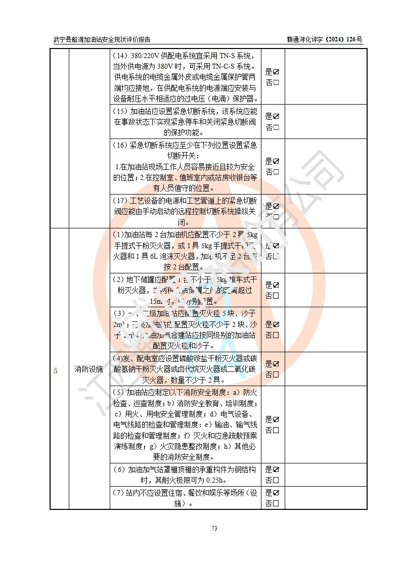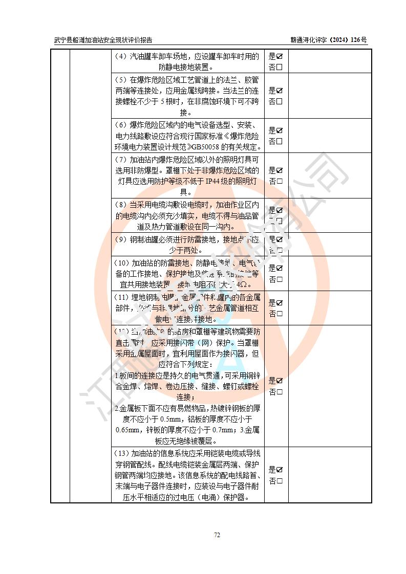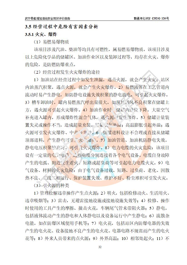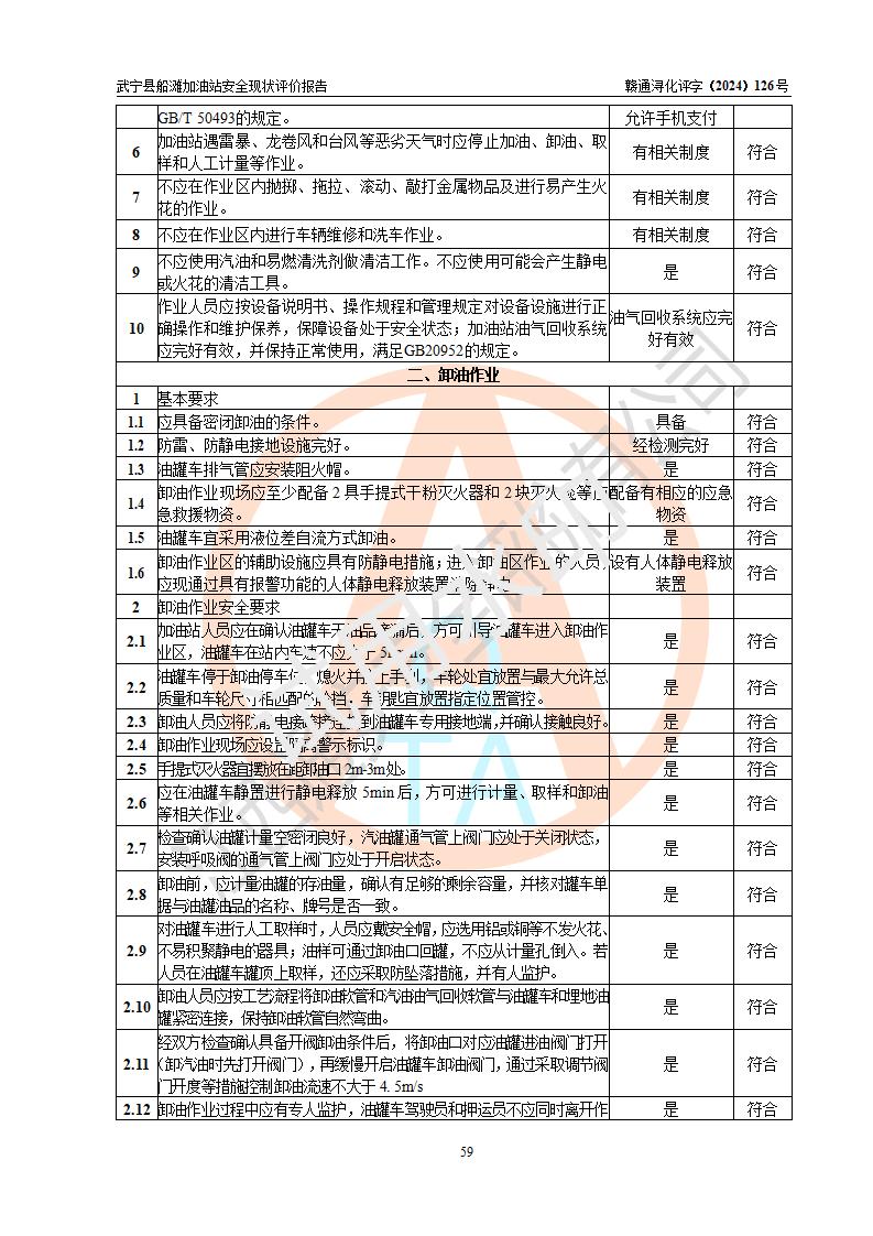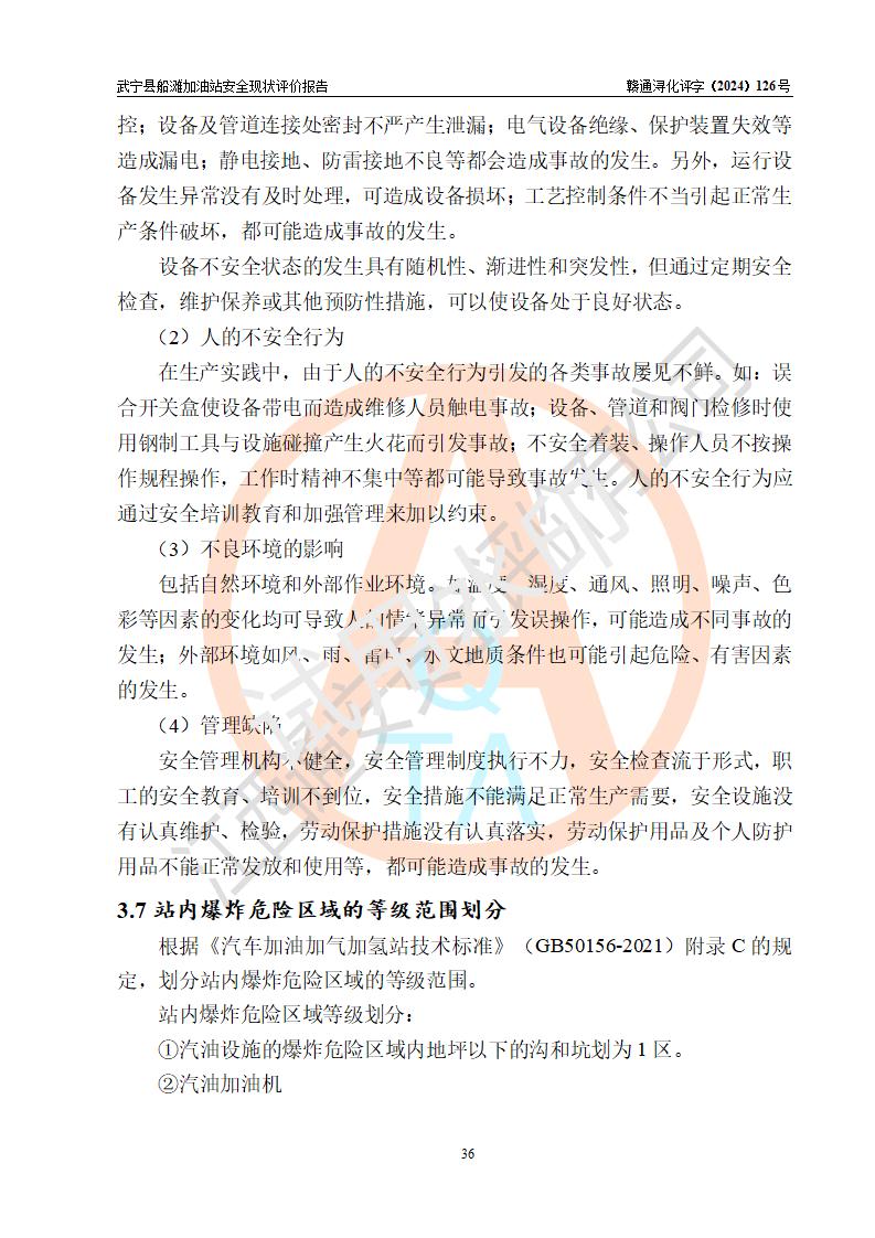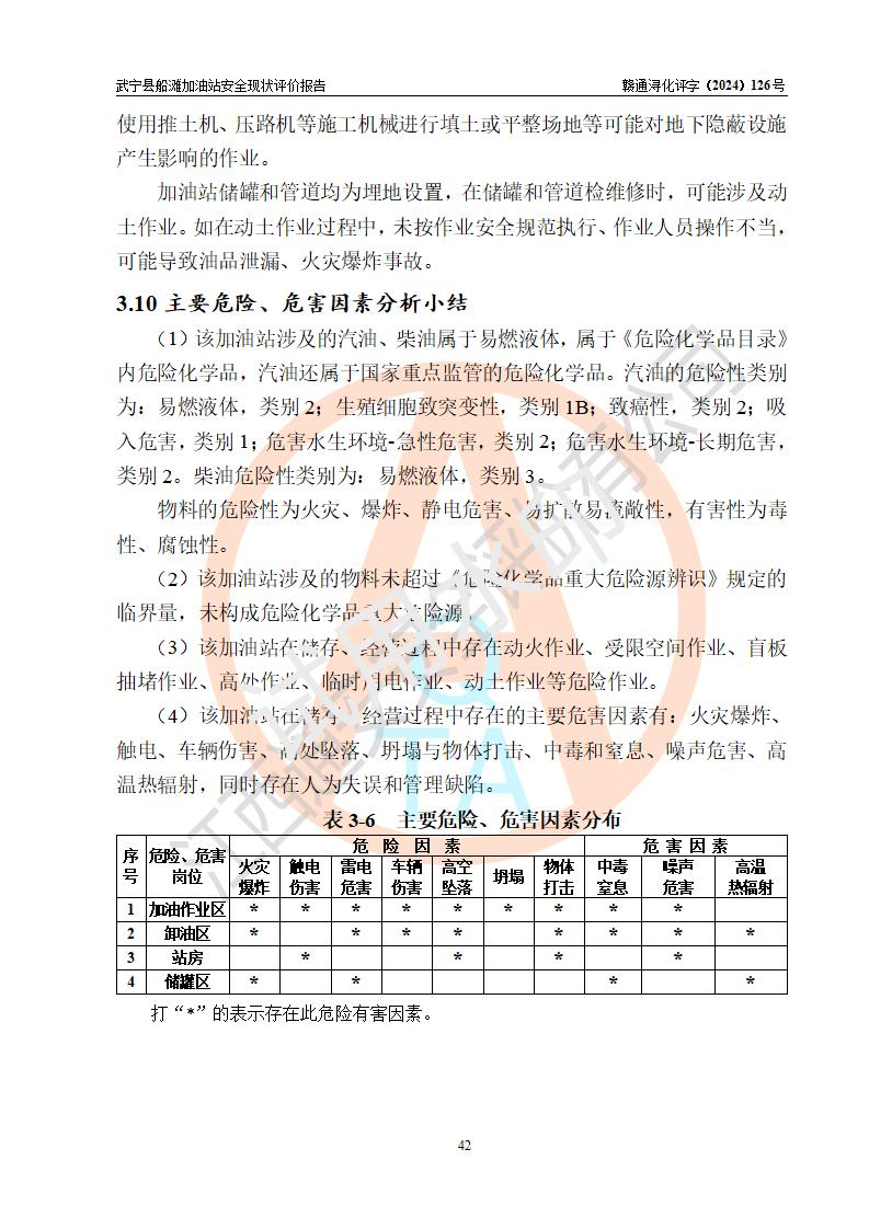 評(píng)價(jià)結(jié)論 | 武寧縣船灘加油站涉及的安全條件、安全經(jīng)營(yíng)條件、安全生產(chǎn)管理符合《危險(xiǎn)化學(xué)品經(jīng)營(yíng)許可證管理辦法》、《汽車加油加氣加氫站技術(shù)標(biāo)準(zhǔn)》等**有關(guān)法規(guī)、標(biāo)準(zhǔn)、規(guī)范要求,能滿足危險(xiǎn)化學(xué)品經(jīng)營(yíng)安全條件。 | |||