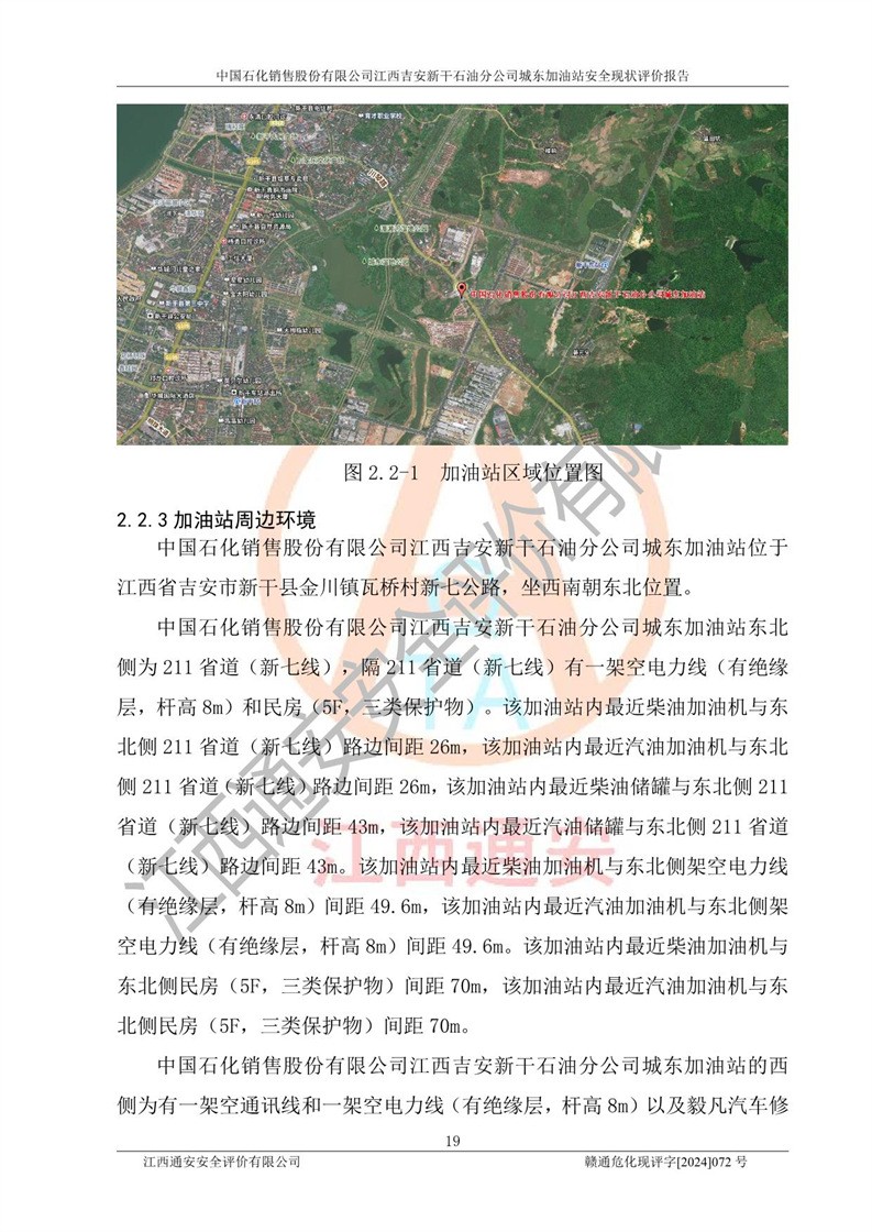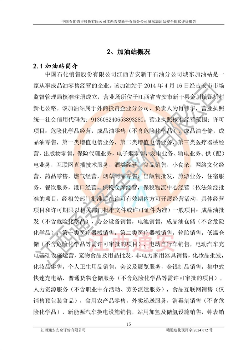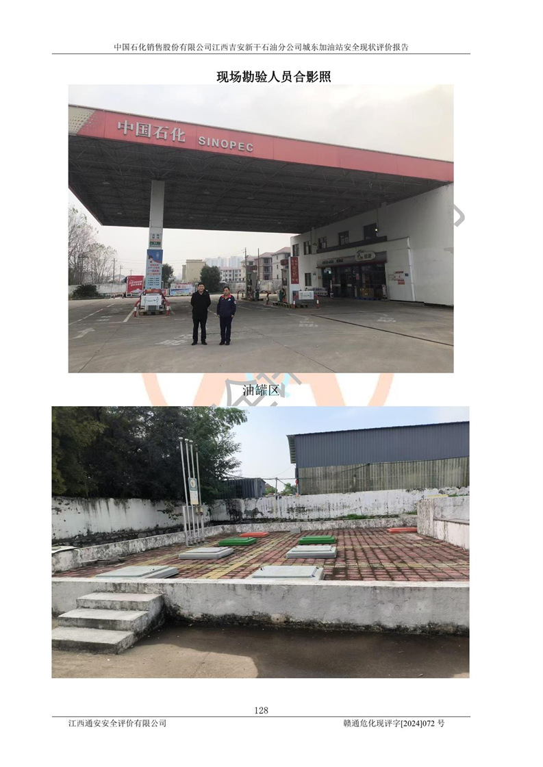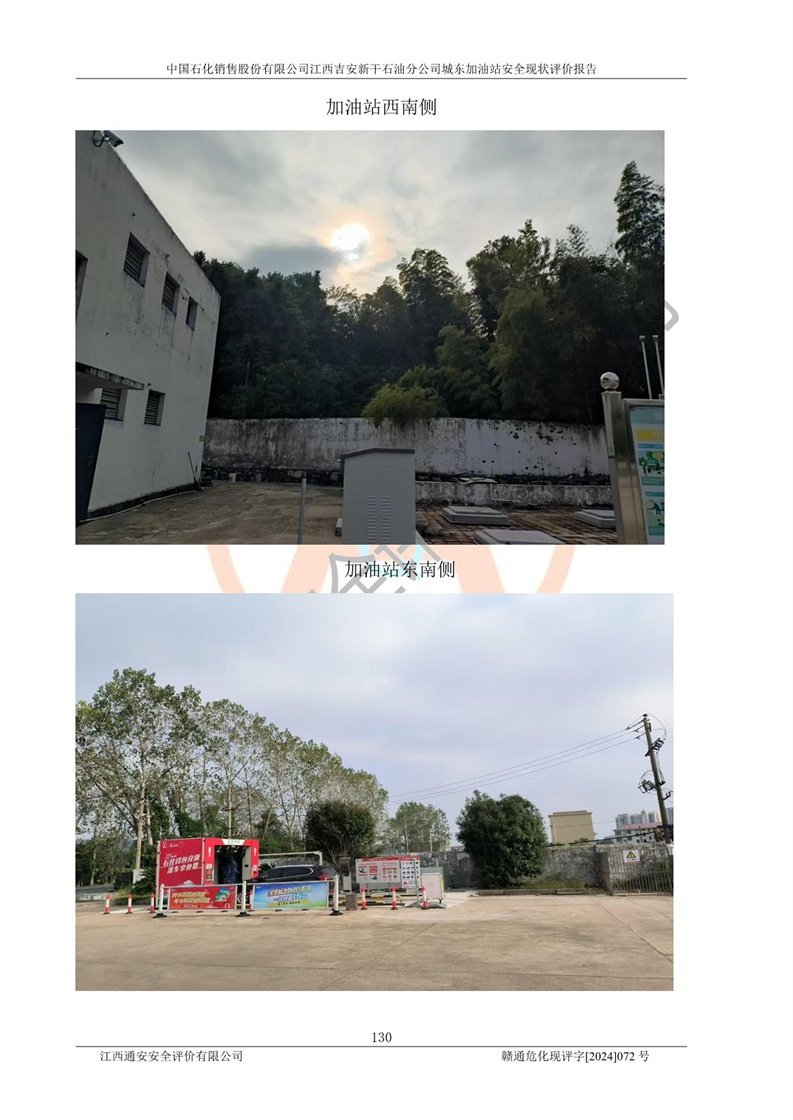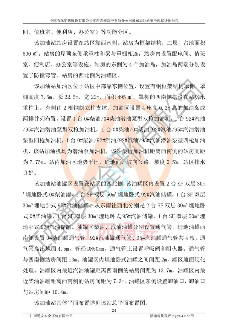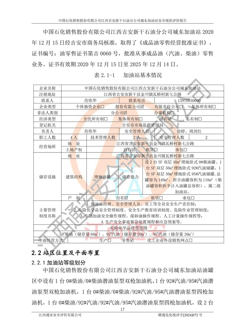 項(xiàng)目簡(jiǎn)介 | 中國(guó)石化銷售股份有限公司江西吉安新干石油分公司城東加油站是一家從事成品油零售經(jīng)營(yíng)的企業(yè)。該加油站于2014年4月16日經(jīng)吉安市市場(chǎng)監(jiān)督管理局核準(zhǔn)注冊(cè)成立,營(yíng)業(yè)場(chǎng)所位于江西省吉安市新干縣金川鎮(zhèn)瓦橋村新七公路。該加油站屬于外商投資企業(yè)分公司,負(fù)責(zé)人為肖偉華,營(yíng)業(yè)執(zhí)照統(tǒng)一社會(huì)信用代碼為:91360824065389328G。營(yíng)業(yè)執(zhí)照核準(zhǔn)經(jīng)營(yíng)范圍:許可項(xiàng)目:危險(xiǎn)化學(xué)品經(jīng)營(yíng),成品油零售(不含危險(xiǎn)化學(xué)品),成品油倉(cāng)儲(chǔ),成品油零售,**類增值電信業(yè)務(wù),第二類增值電信業(yè)務(wù),第三類醫(yī)療器械經(jīng)營(yíng),出版物零售,**代理業(yè)務(wù),***零售,發(fā)電業(yè)務(wù)、輸電業(yè)務(wù)、供(配)電業(yè)務(wù),互聯(lián)網(wǎng)直播技術(shù)服務(wù),酒類經(jīng)營(yíng),食品銷售,小食雜,網(wǎng)絡(luò)文化經(jīng)營(yíng),藥品零售,燃?xì)饨?jīng)營(yíng),煙草制品零售,出版物批發(fā),旅游業(yè)務(wù),住宿服務(wù),餐飲服務(wù),港口經(jīng)營(yíng),保稅倉(cāng)庫(kù)經(jīng)營(yíng),保稅物流中心經(jīng)營(yíng)(依法須經(jīng)批準(zhǔn)的項(xiàng)目,經(jīng)相關(guān)部門批準(zhǔn)后在許可**期內(nèi)方可開展經(jīng)營(yíng)活動(dòng),具體經(jīng)營(yíng)項(xiàng)目和許可期限以相關(guān)部門批準(zhǔn)文件或許可證件為準(zhǔn))一般項(xiàng)目:成品油批發(fā)(不含危險(xiǎn)化學(xué)品),辦公設(shè)備銷售,電池銷售,成品油倉(cāng)儲(chǔ)(不含危險(xiǎn)化學(xué)品),**類醫(yī)療器械銷售,第二類醫(yī)療器械銷售,輪胎銷售,低溫倉(cāng)儲(chǔ)(不含危險(xiǎn)化學(xué)品等需許可審批的項(xiàng)目),電動(dòng)自行車銷售,電動(dòng)汽車充電基礎(chǔ)設(shè)施運(yùn)營(yíng),寵物食品及用品批發(fā),非電力家用器具銷售,化妝品批發(fā),化妝品零售,個(gè)人衛(wèi)生用品銷售,會(huì)議及展覽服務(wù),金銀制品銷售,集中式**充電站,普通貨物倉(cāng)儲(chǔ)服務(wù)(不含危險(xiǎn)化學(xué)品等需許可審批的項(xiàng)目),人力資源服務(wù)(不含職業(yè)中介活動(dòng)、勞務(wù)派遣服務(wù)),食品互聯(lián)網(wǎng)銷售(僅銷售預(yù)包裝食品),食用農(nóng)產(chǎn)品零售,外賣遞送服務(wù),消毒劑銷售(不含危險(xiǎn)化學(xué)品),新能源汽車換電設(shè)施銷售,站用加氫及儲(chǔ)氫設(shè)施銷售,鐘表銷售,**化學(xué)產(chǎn)品銷售(不含危險(xiǎn)化學(xué)品),保健食品(預(yù)包裝)銷售,針紡織品銷售,服裝服飾零售,日用品銷售,五金產(chǎn)品零售,家用電器銷售,單用途商業(yè)預(yù)付卡代理銷售,電子產(chǎn)品銷售,潤(rùn)滑油銷售,石油制品銷售(不含危險(xiǎn)化學(xué)品),戶外用品銷售,汽車銷售,摩托車及零配件批發(fā),摩托車及零配件零售,農(nóng)副產(chǎn)品銷售,化肥銷售,農(nóng)用薄膜銷售,安防設(shè)備銷售,禮品花卉銷售,計(jì)算機(jī)軟硬件及輔助設(shè)備零售,橡膠制品銷售,機(jī)械設(shè)備銷售,珠寶首飾零售,珠寶首飾批發(fā),玩具銷售,樂(lè)器批發(fā),樂(lè)器零售,家具銷售,建筑材料銷售,機(jī)動(dòng)車充電銷售,技術(shù)服務(wù)、技術(shù)開發(fā)、技術(shù)咨詢、技術(shù)交流、技術(shù)**、技術(shù)推廣,機(jī)動(dòng)車修理和維護(hù),物業(yè)管理,停車場(chǎng)服務(wù),居民日常生活服務(wù),票務(wù)代理服務(wù),廣告發(fā)布,廣告制作,廣告設(shè)計(jì)、代理,洗車服務(wù),信息咨詢服務(wù)(不含許可類信息咨詢服務(wù)),軟件開發(fā),貨物進(jìn)出口,食品進(jìn)出口,技術(shù)進(jìn)出口,進(jìn)出口代理,汽車裝飾用品銷售,租賃服務(wù)(不含許可類租賃服務(wù)),小微型客車租賃經(jīng)營(yíng)服務(wù)(除依法須經(jīng)批準(zhǔn)的項(xiàng)目外,憑營(yíng)業(yè)執(zhí)照依法自主開展經(jīng)營(yíng)活動(dòng)) 中國(guó)石化銷售股份有限公司江西吉安新干石油分公司城東加油站占地面積1373.13㎡,加油站中設(shè)有1臺(tái)0#柴油/0#柴油潛油泵型雙槍加油機(jī),1臺(tái)92#汽油/95#汽油潛油泵型雙槍加油機(jī),1臺(tái)0#柴油/0#柴油/92#汽油/95#汽油潛油泵型四槍加油機(jī),1臺(tái)0#柴油/92#汽油/92#汽油/95#汽油潛油泵型四槍加油機(jī),設(shè)2臺(tái)SF雙層30m3埋地臥式0#柴油罐、1臺(tái)SF雙層50m3埋地臥式92#汽油儲(chǔ)罐,1臺(tái)SF雙層30m3埋地臥式95#汽油儲(chǔ)罐,總罐容為140m3,折合油罐容積為110m3(柴油罐容積折半計(jì)入油罐總?cè)莘e),屬二級(jí)加油站,汽油卸油、加油設(shè)置了油氣回收系統(tǒng)。 中國(guó)石化銷售股份有限公司江西吉安新干石油分公司城東加油站于2022年1月27日經(jīng)吉安市應(yīng)急管理局核準(zhǔn),取得了《危險(xiǎn)化學(xué)品經(jīng)營(yíng)許可證》,證書編號(hào):贛吉?;?jīng)字[2022]360800000009,許可經(jīng)營(yíng)范圍:成品油。**期2022年3月04日2025年03月03日。 中國(guó)石化銷售股份有限公司江西吉安新干石油分公司城東加油站2020年12月15日經(jīng)吉安市商務(wù)局核準(zhǔn),取得了《成品油零售經(jīng)營(yíng)批準(zhǔn)證書》,證書編號(hào):油零售證書第吉0060號(hào),批準(zhǔn)從事