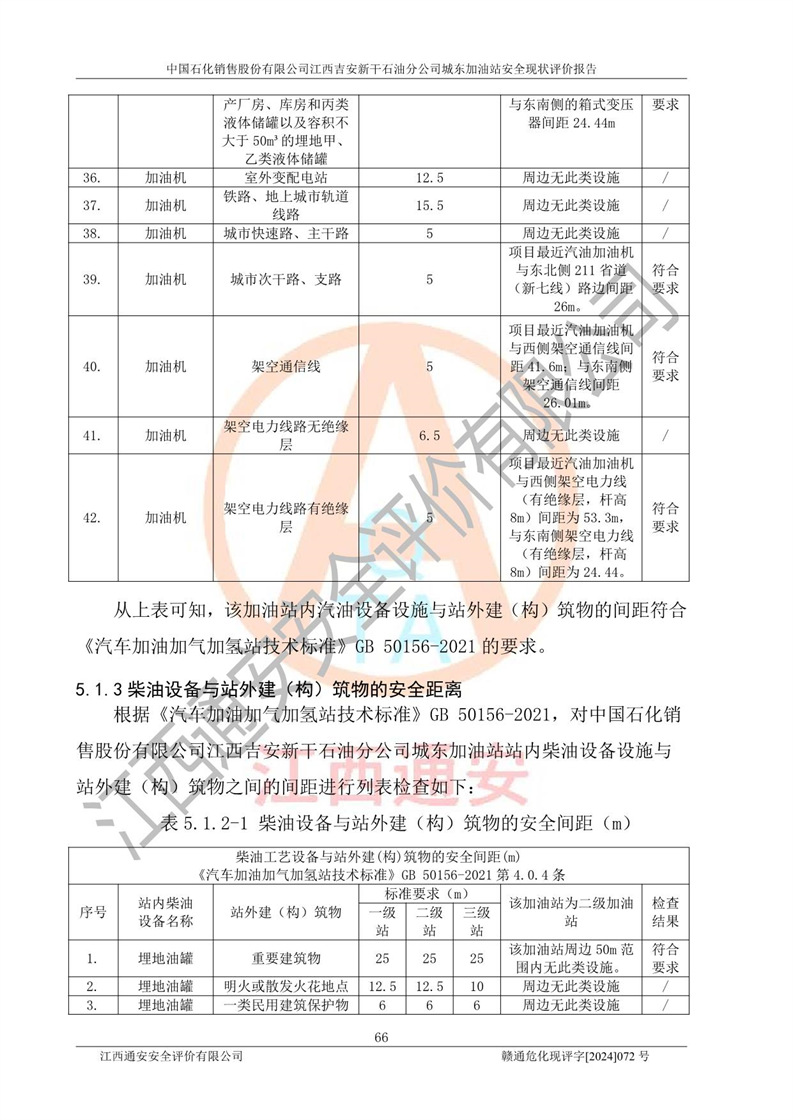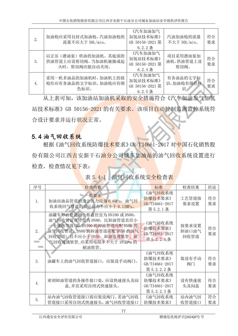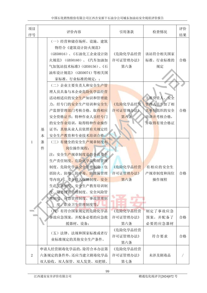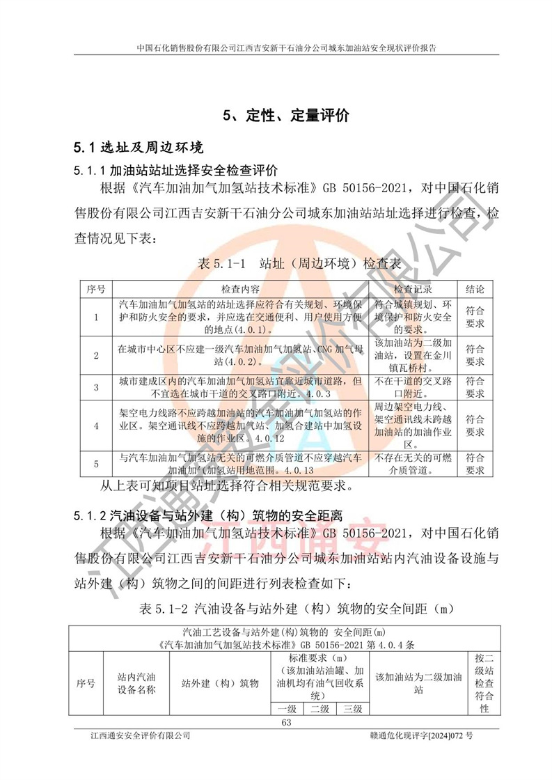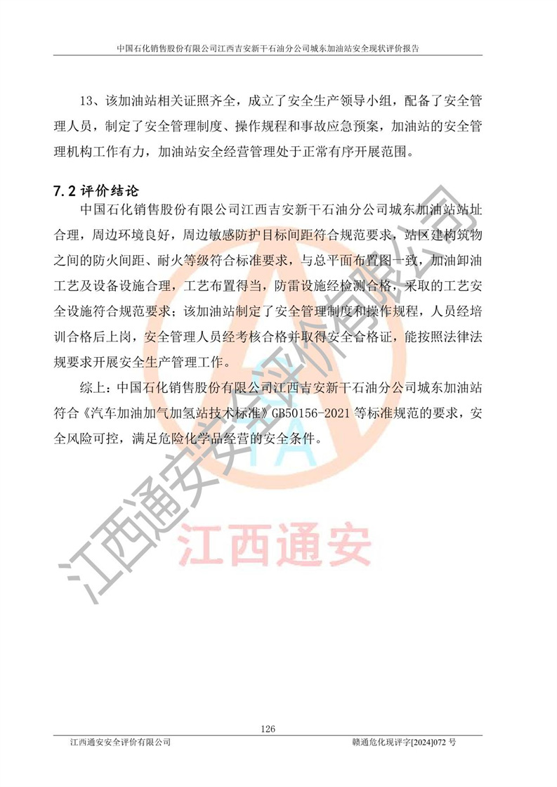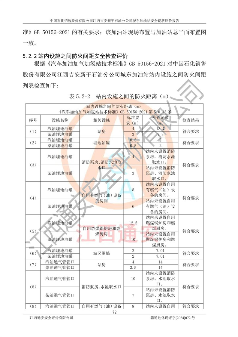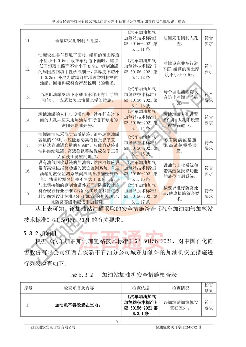 評(píng)價(jià)結(jié)論 | 中國(guó)石化銷售股份有限公司江西吉安新干石油分公司城東加油站符合《汽車加油加氣加氫站技術(shù)標(biāo)準(zhǔn)》GB50156-2021等標(biāo)準(zhǔn)規(guī)范的要求,安全風(fēng)險(xiǎn)可控,滿足危險(xiǎn)化學(xué)品經(jīng)營(yíng)的安全條件。 | |||
