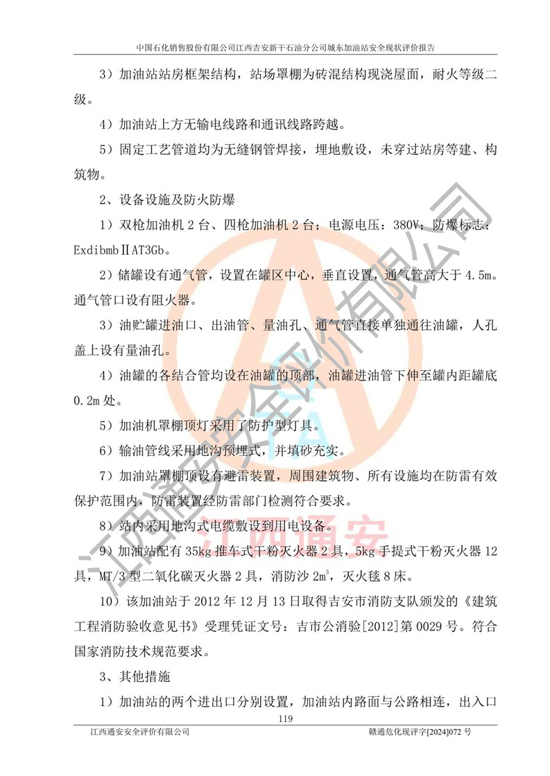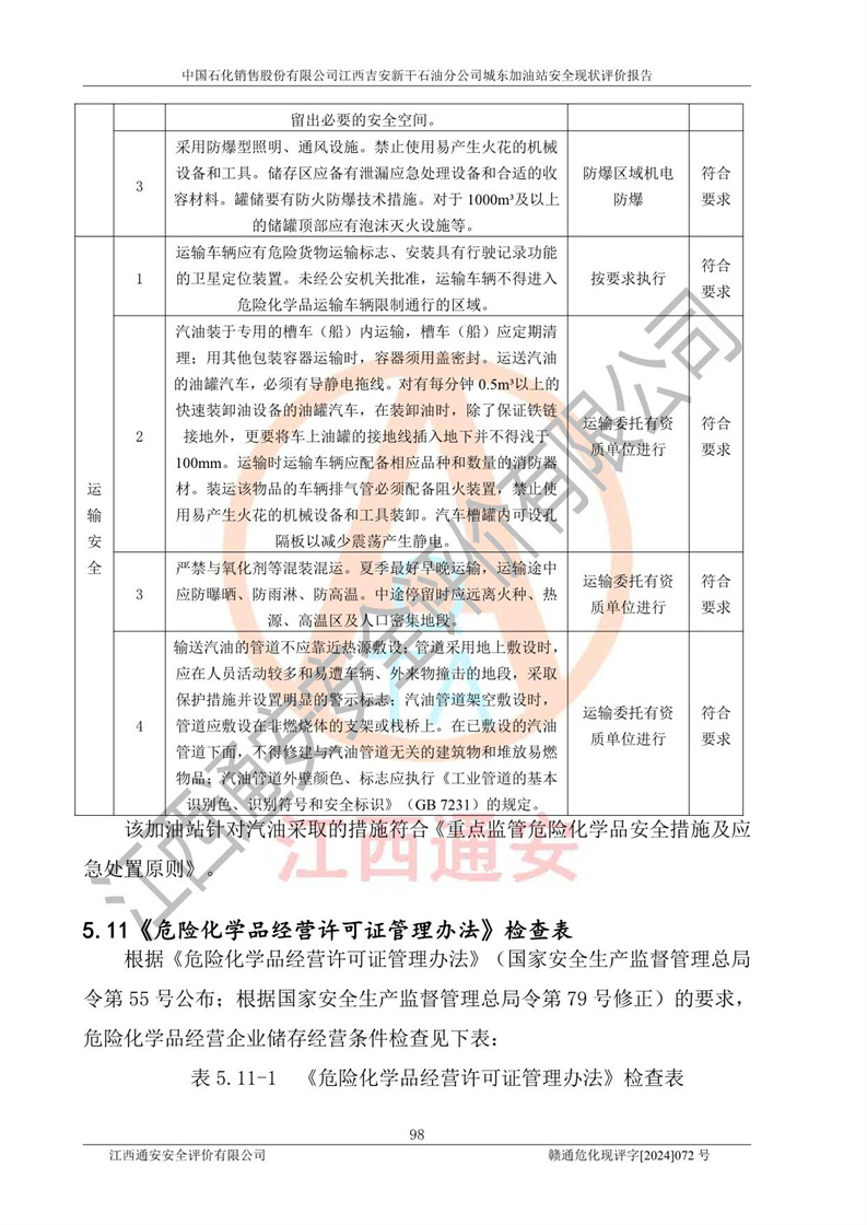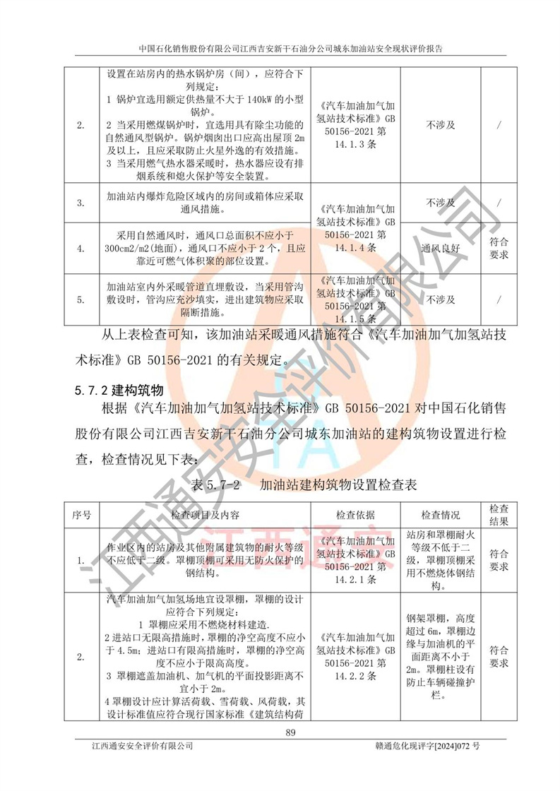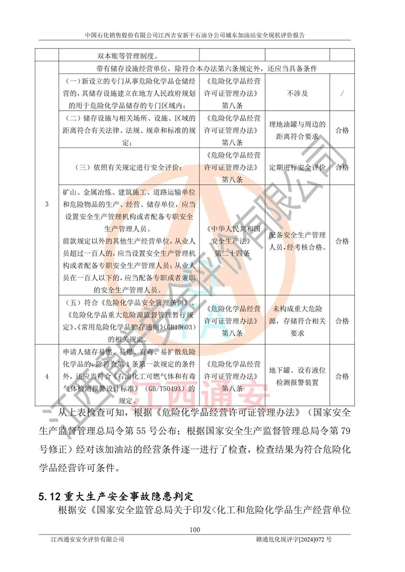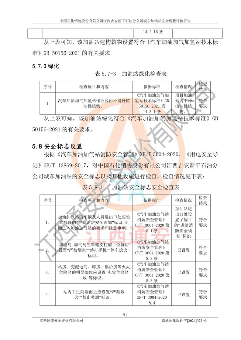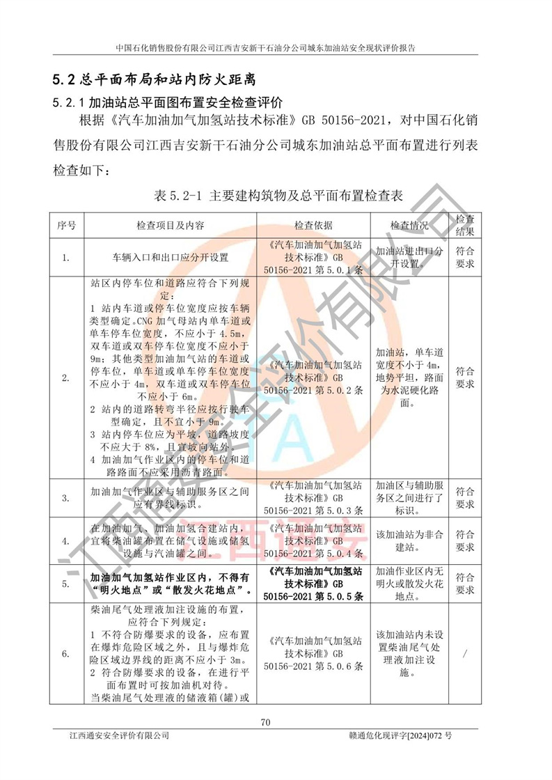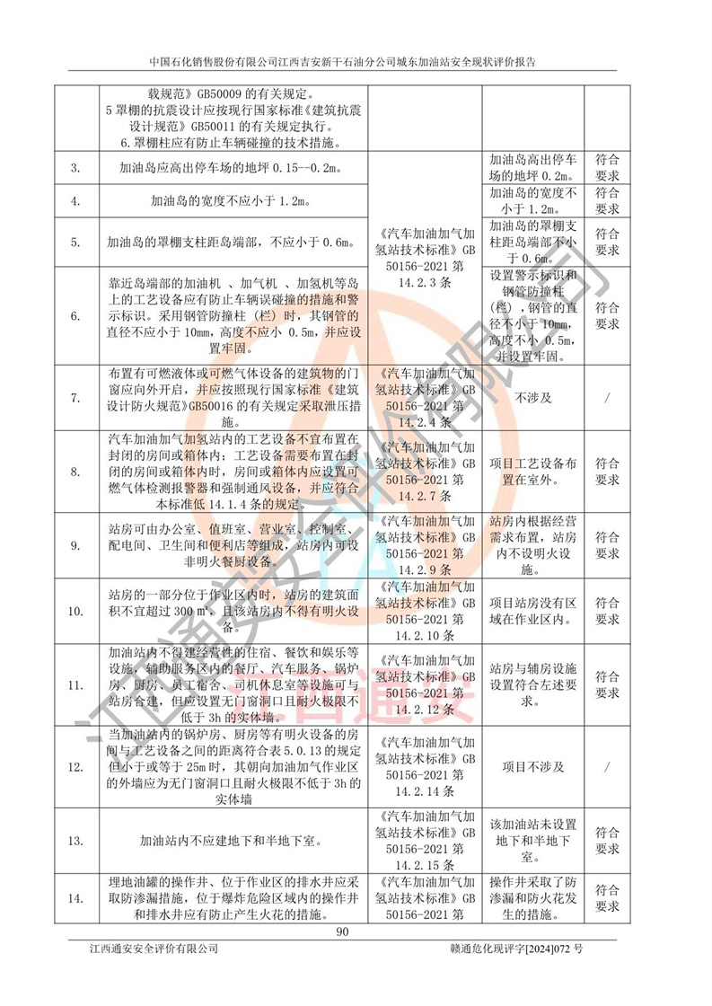 評(píng)價(jià)結(jié)論 | 中國(guó)石化銷售股份有限公司江西吉安新干石油分公司城東加油站符合《汽車加油加氣加氫站技術(shù)標(biāo)準(zhǔn)》GB50156-2021等標(biāo)準(zhǔn)規(guī)范的要求,安全風(fēng)險(xiǎn)可控,滿足危險(xiǎn)化學(xué)品經(jīng)營(yíng)的安全條件。 | |||