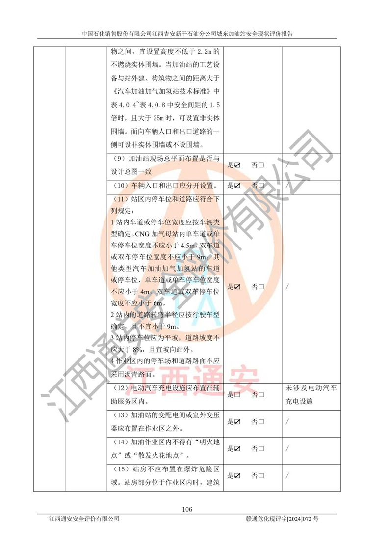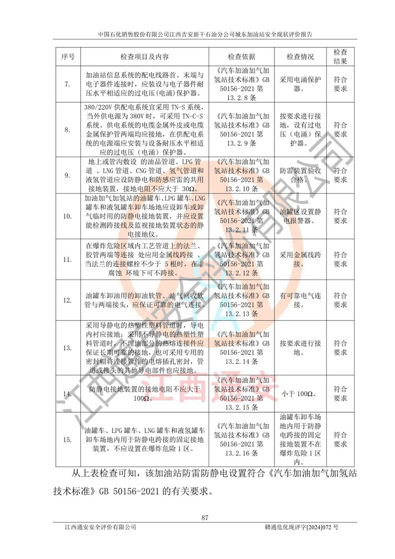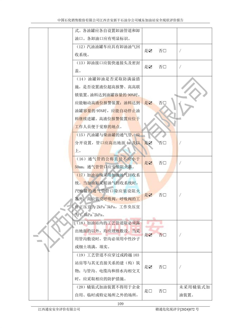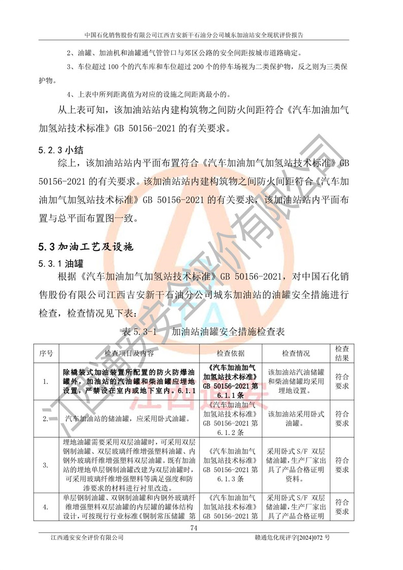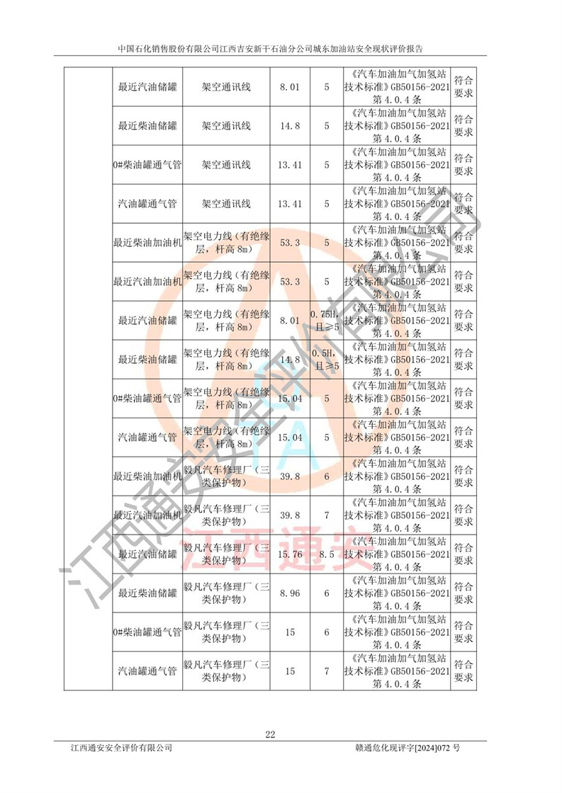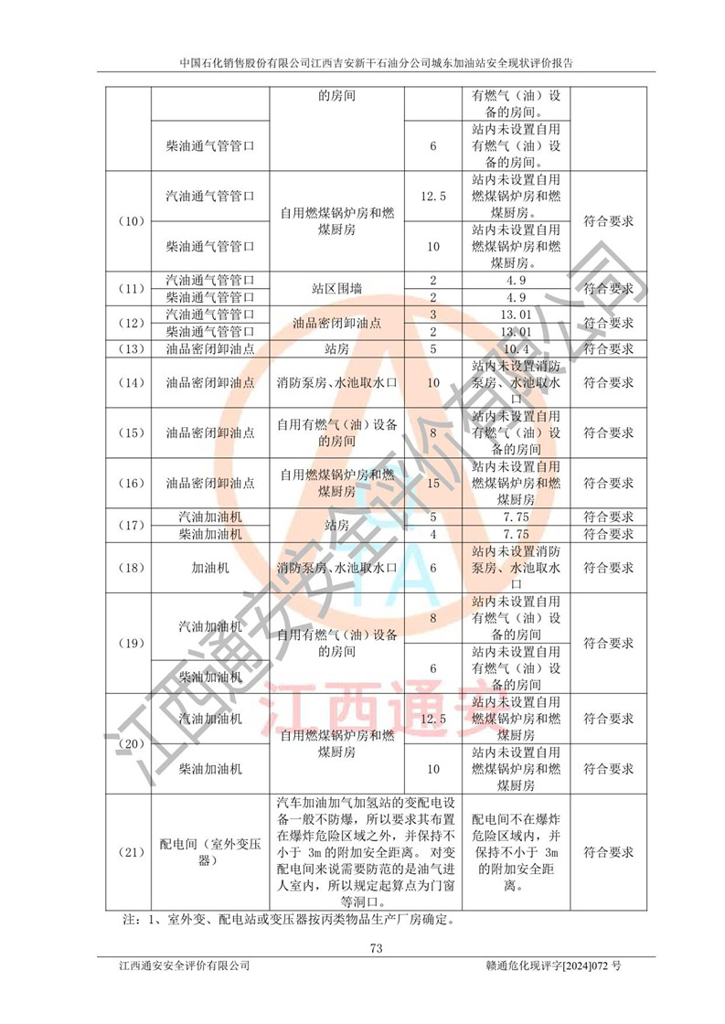 評(píng)價(jià)結(jié)論 | 中國(guó)石化銷售股份有限公司江西吉安新干石油分公司城東加油站符合《汽車加油加氣加氫站技術(shù)標(biāo)準(zhǔn)》GB50156-2021等標(biāo)準(zhǔn)規(guī)范的要求,安全風(fēng)險(xiǎn)可控,滿足危險(xiǎn)化學(xué)品經(jīng)營(yíng)的安全條件。 | |||